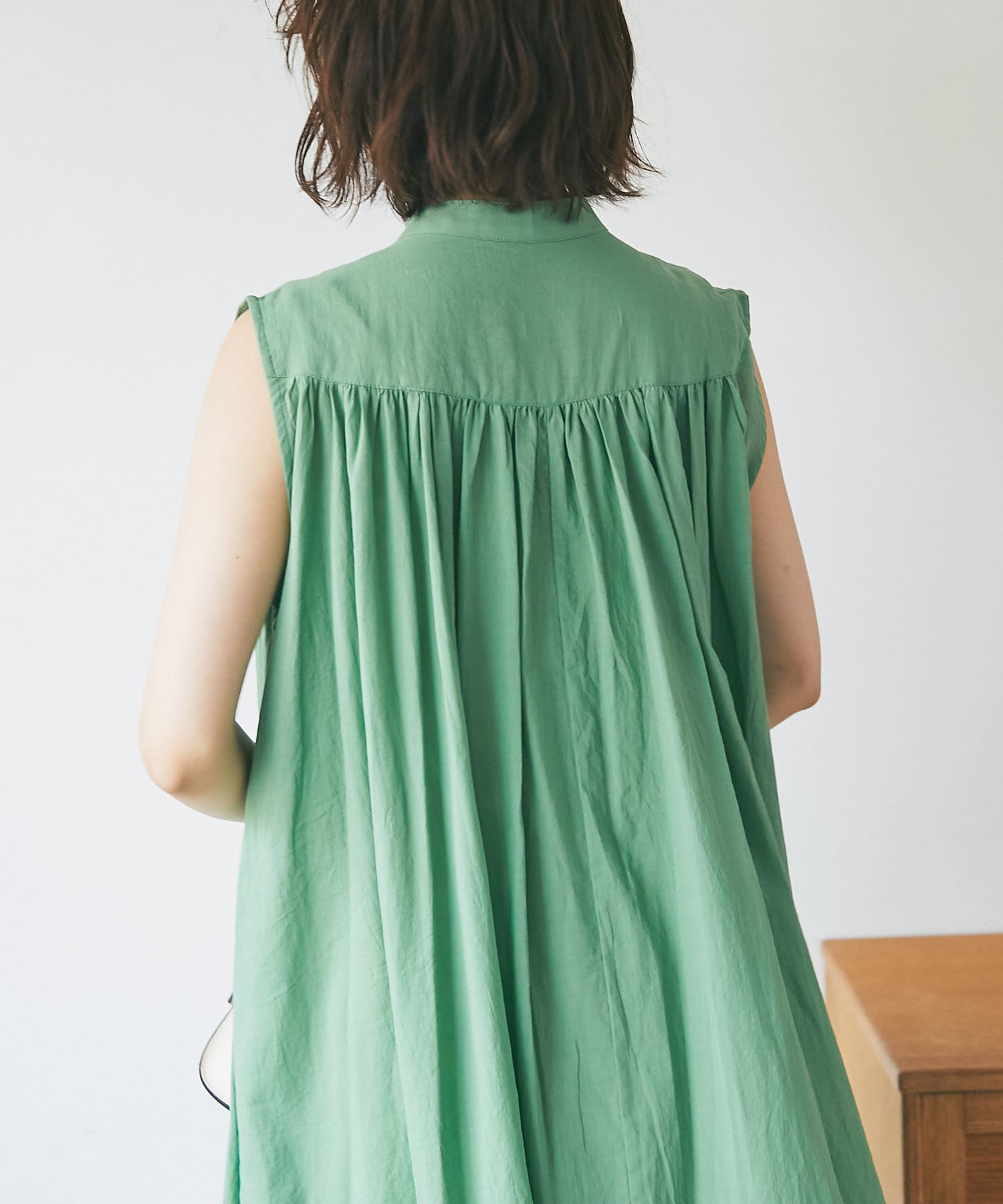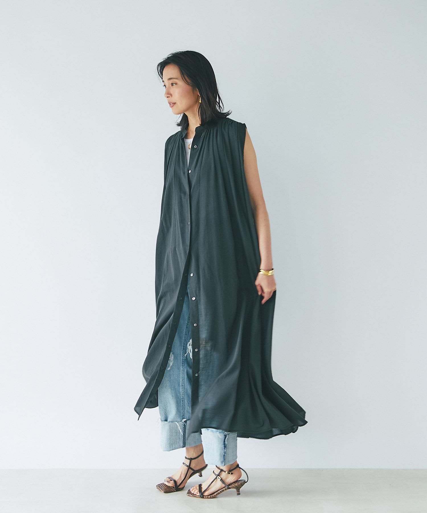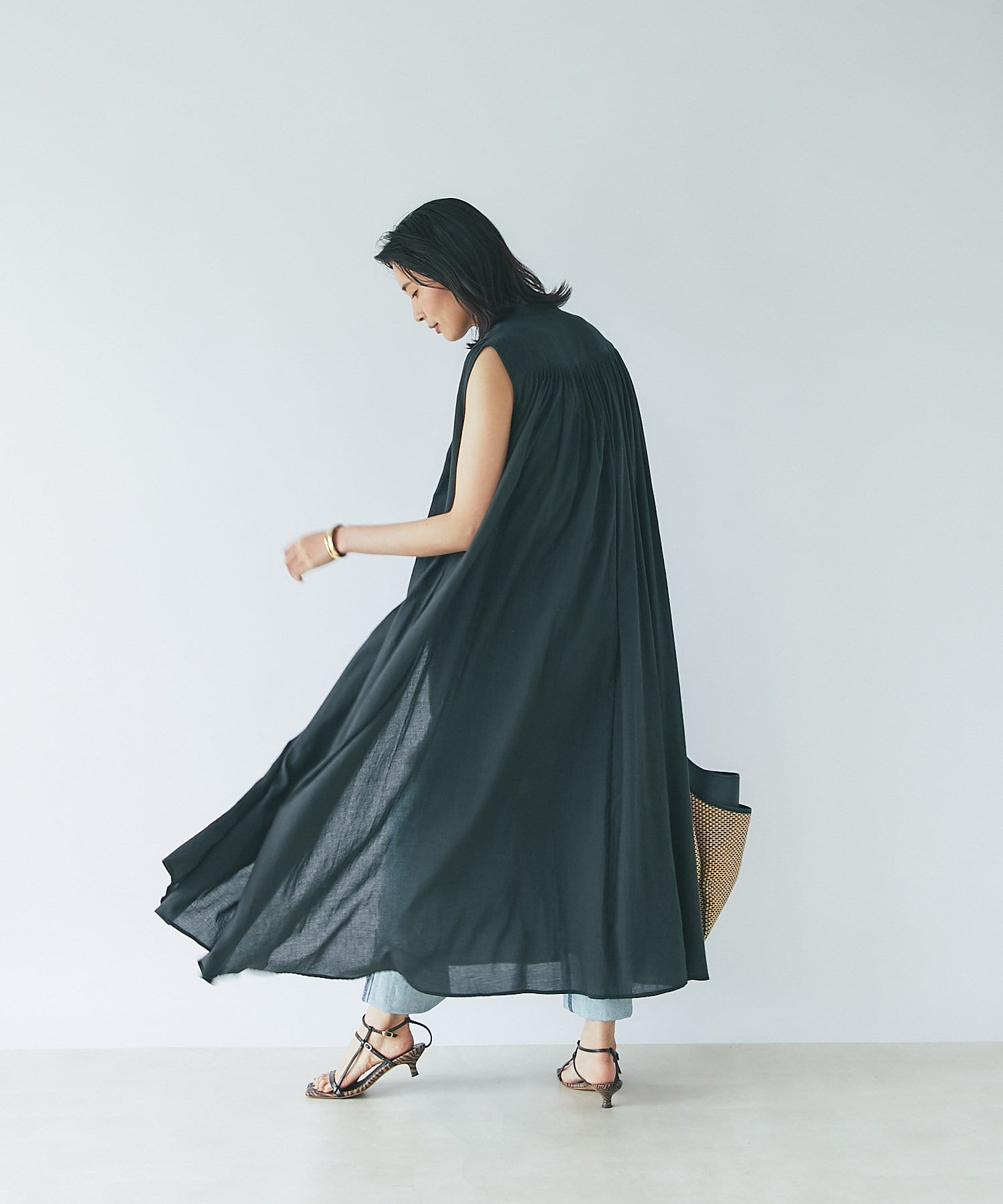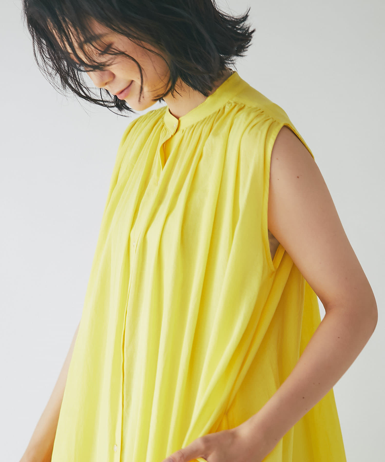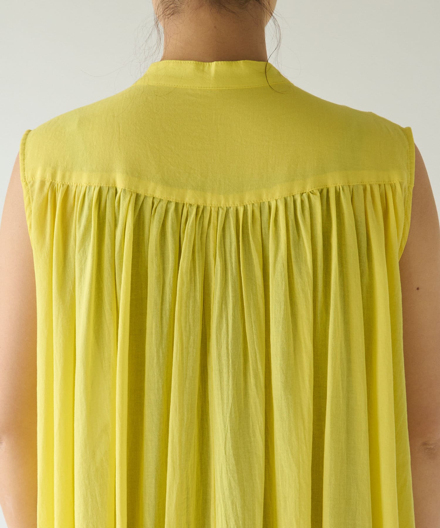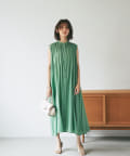 上半身はミニマルなノースリーブで、カーデやジャケットを着たときも、もたつかないデザイン。
