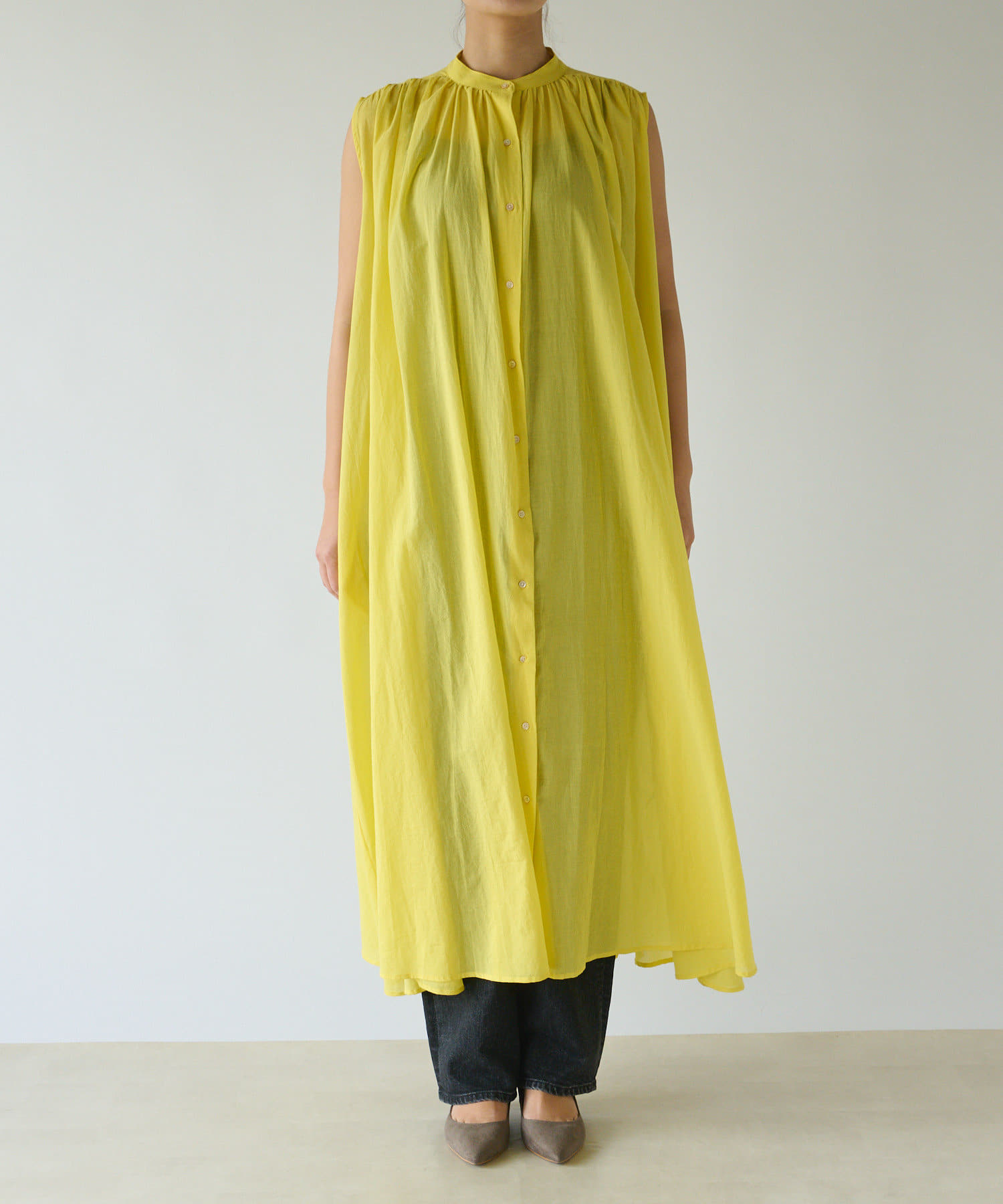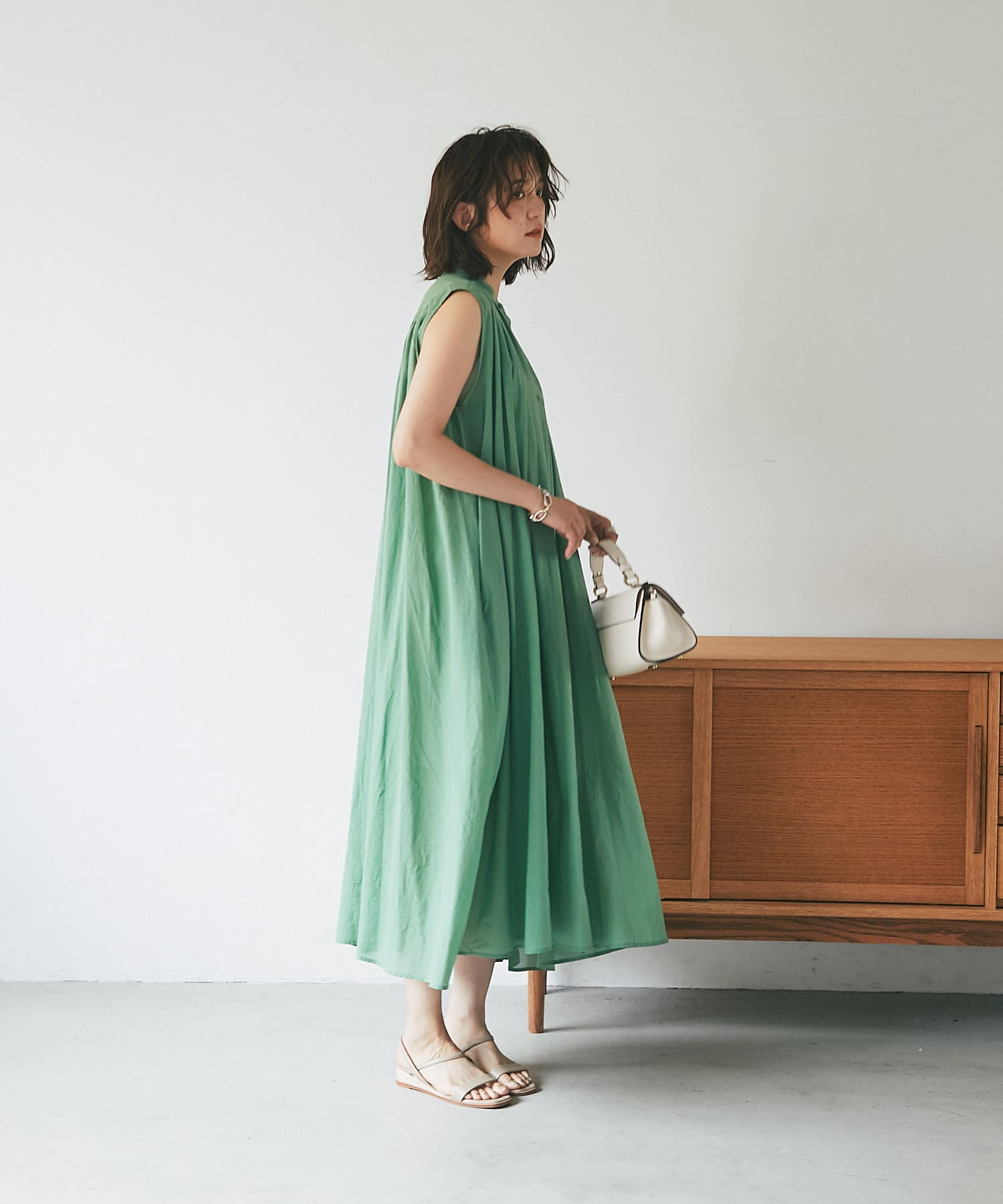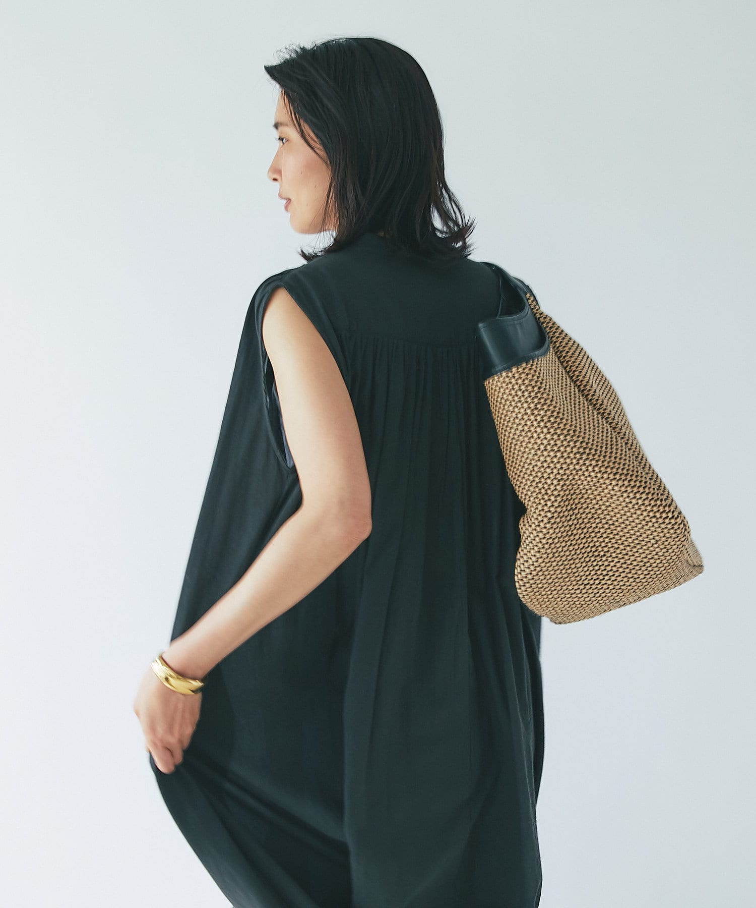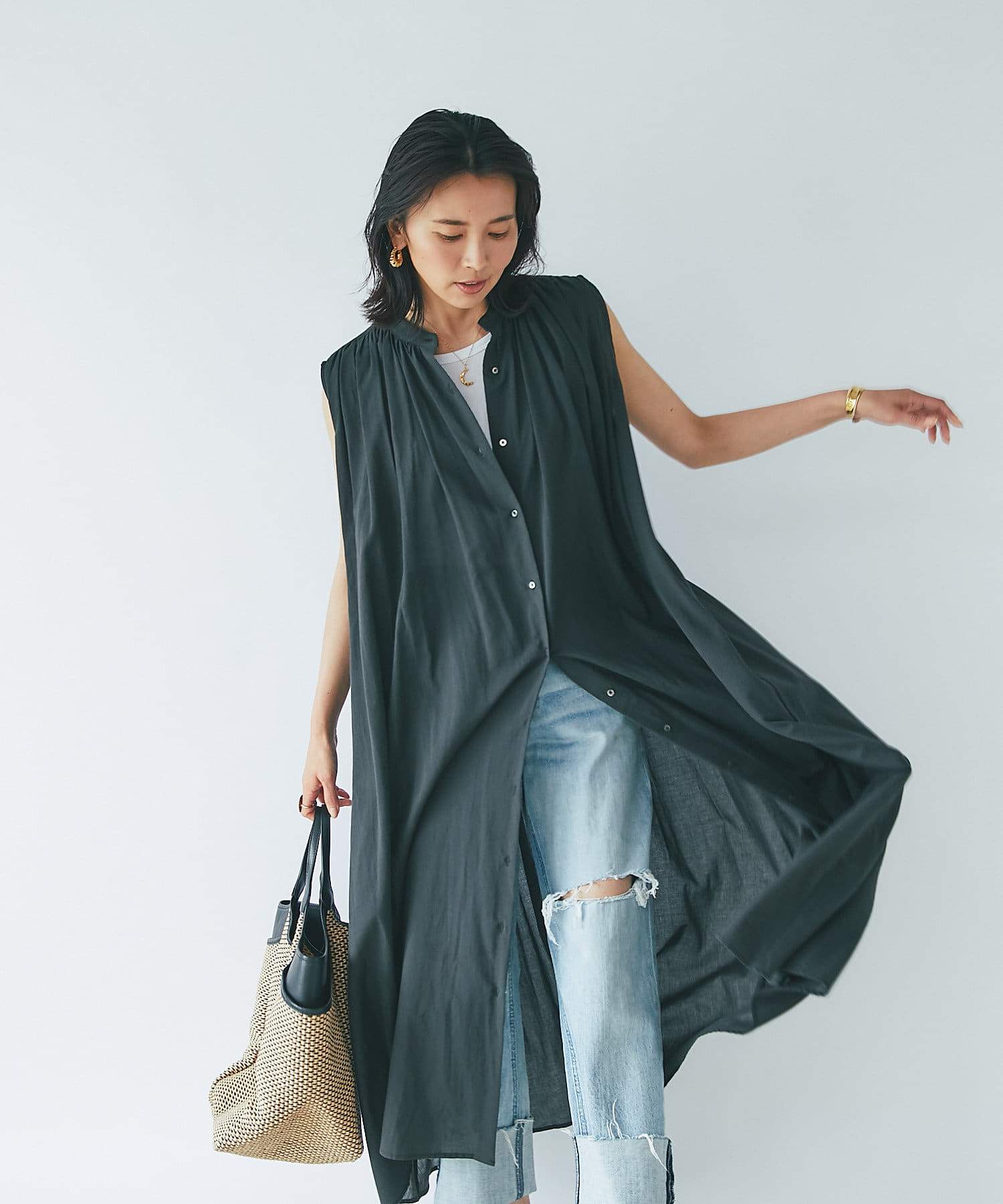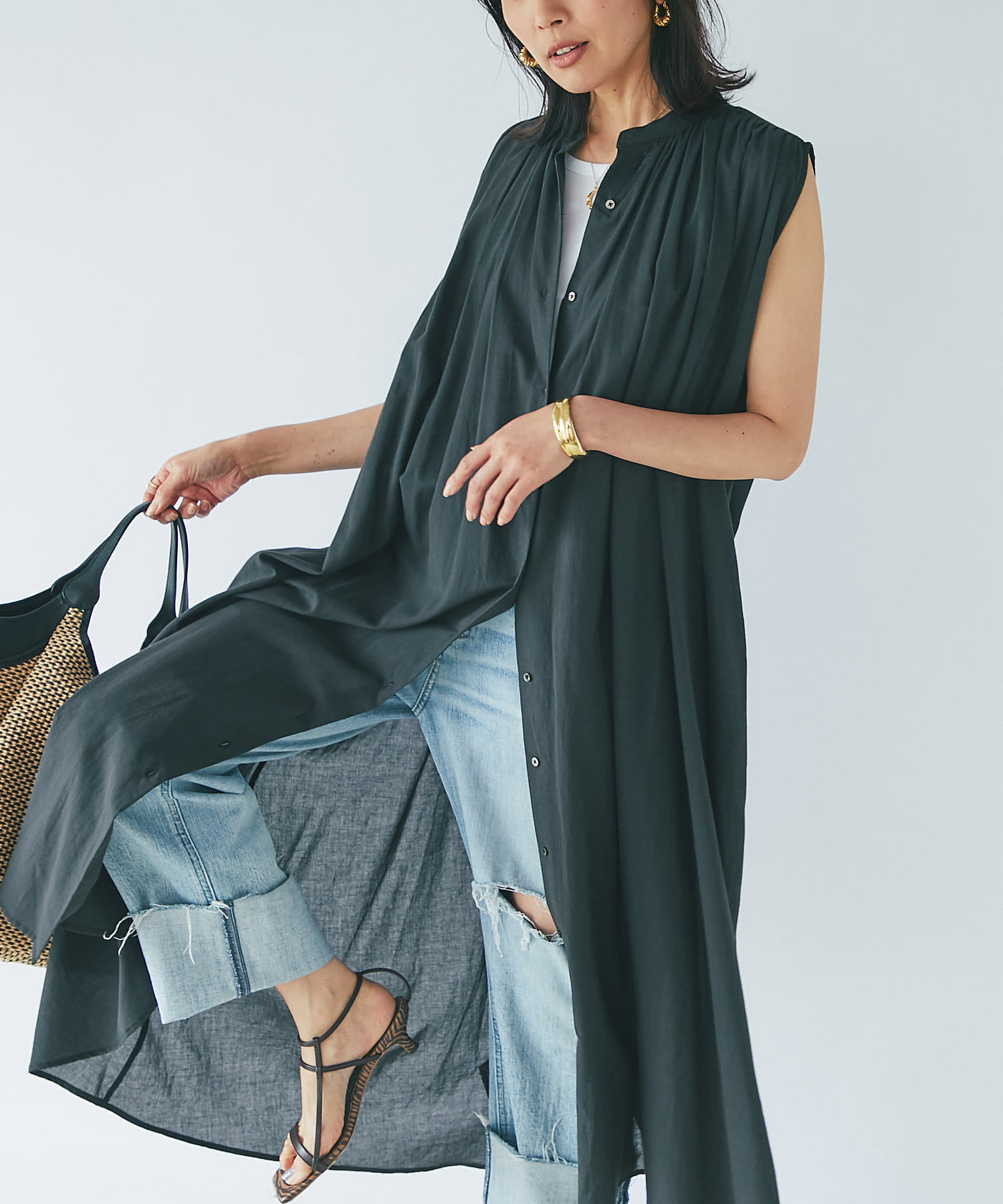 上半身はミニマルなノースリーブで、カーデやジャケットを着たときも、もたつかないデザイン。