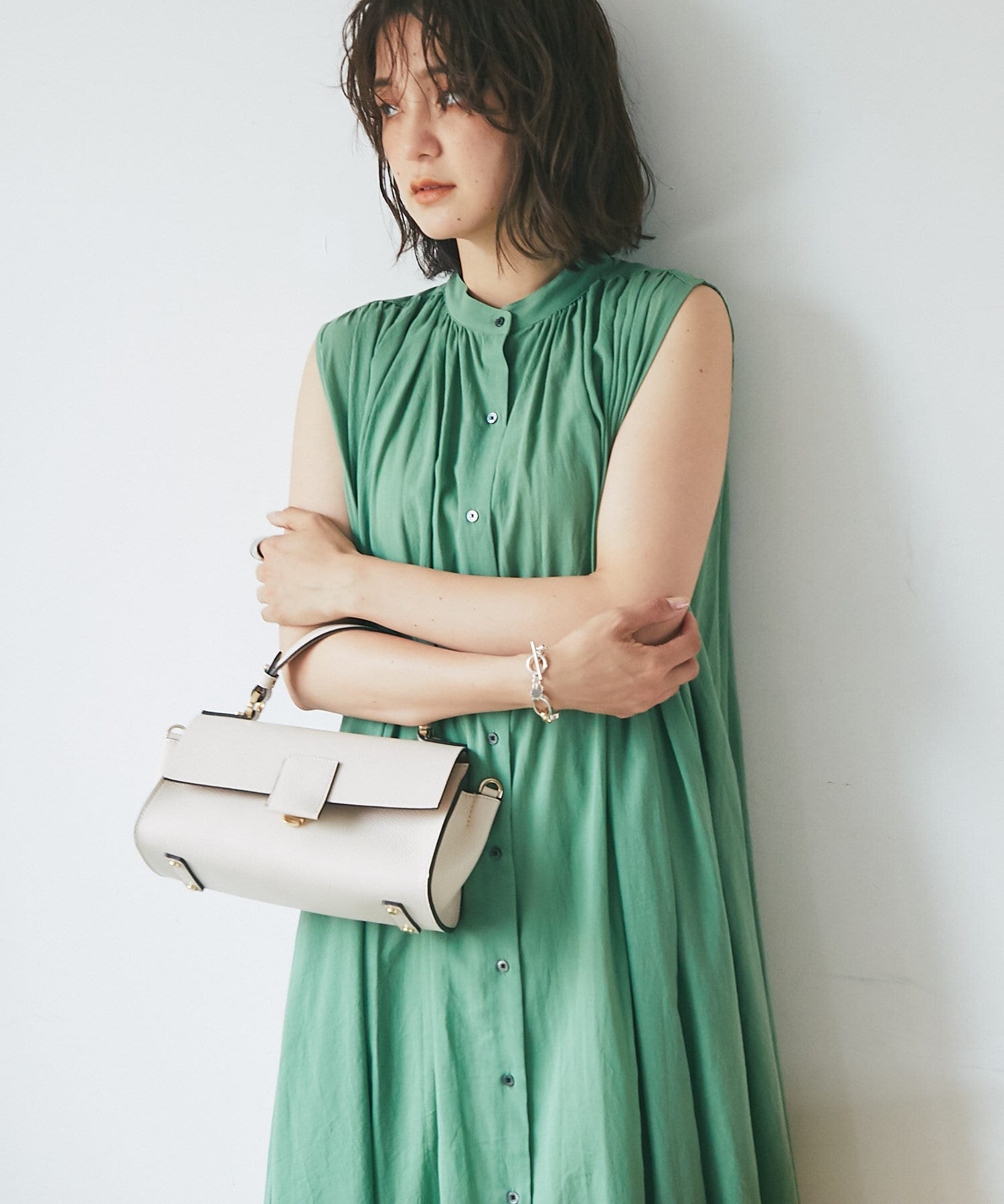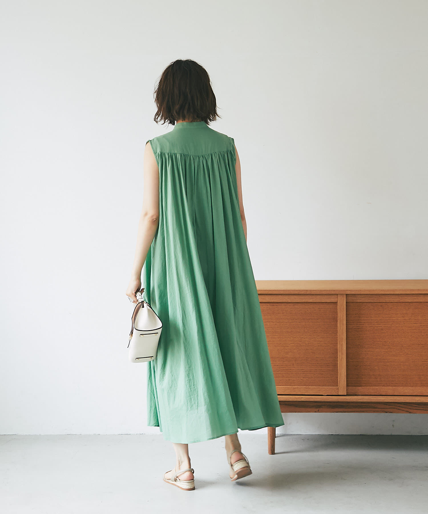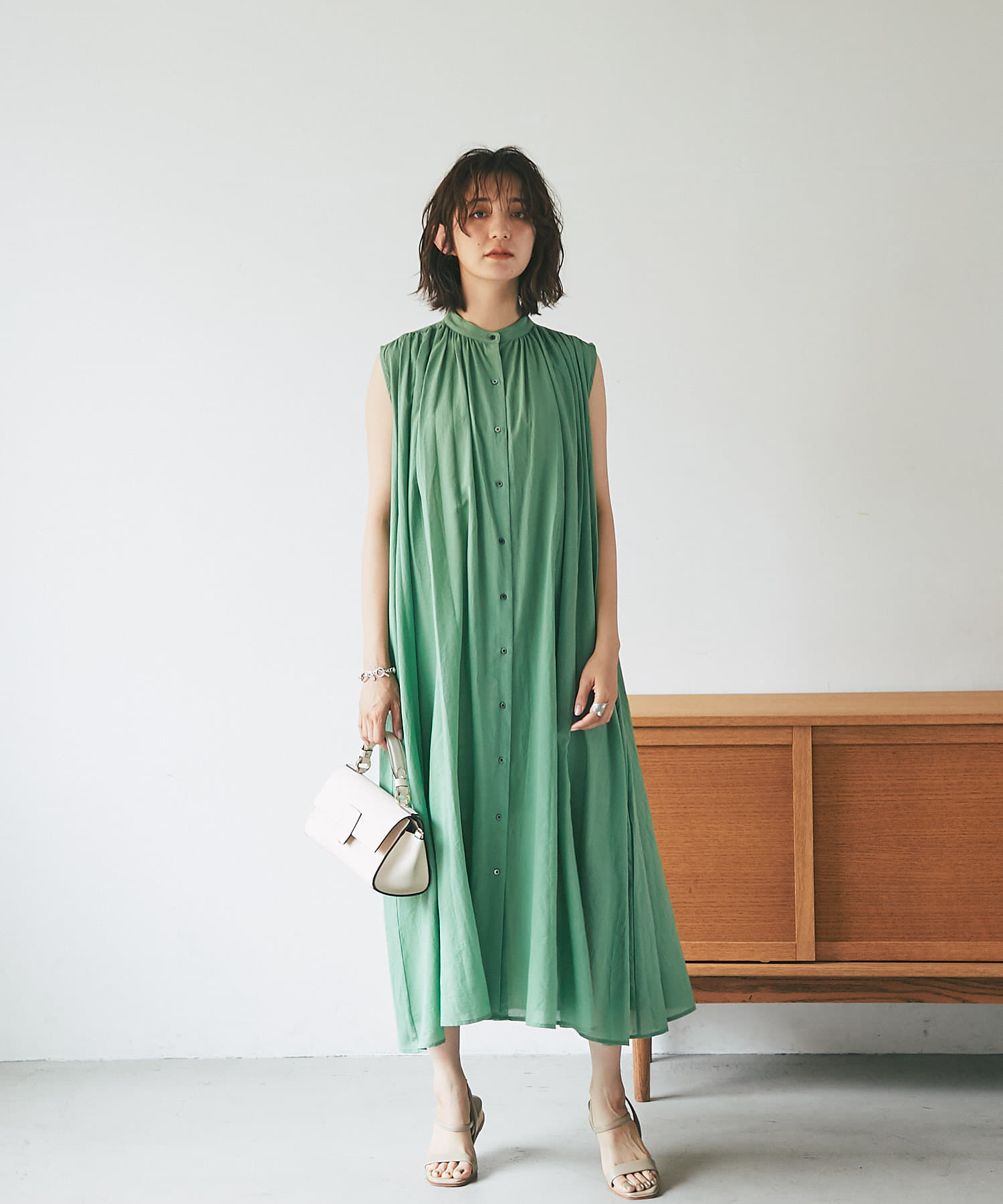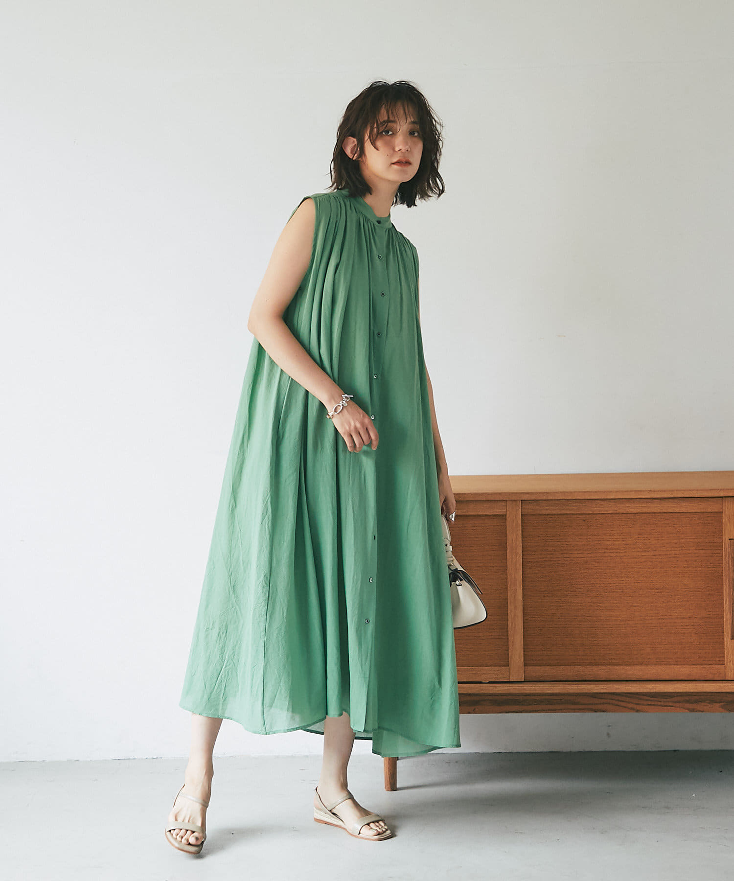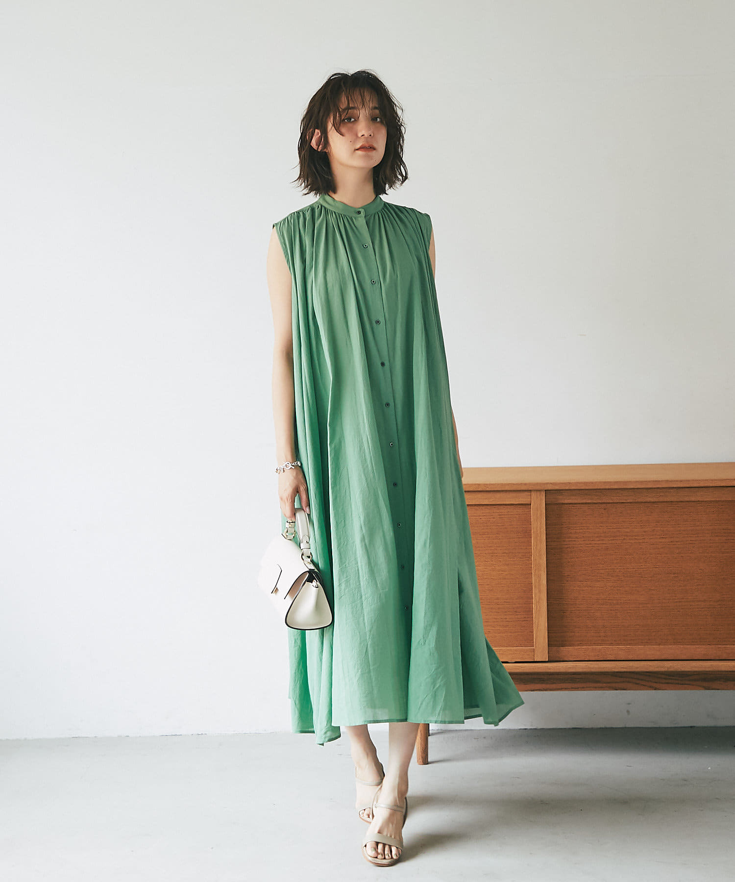 上半身はミニマルなノースリーブで、カーデやジャケットを着たときも、もたつかないデザイン。