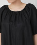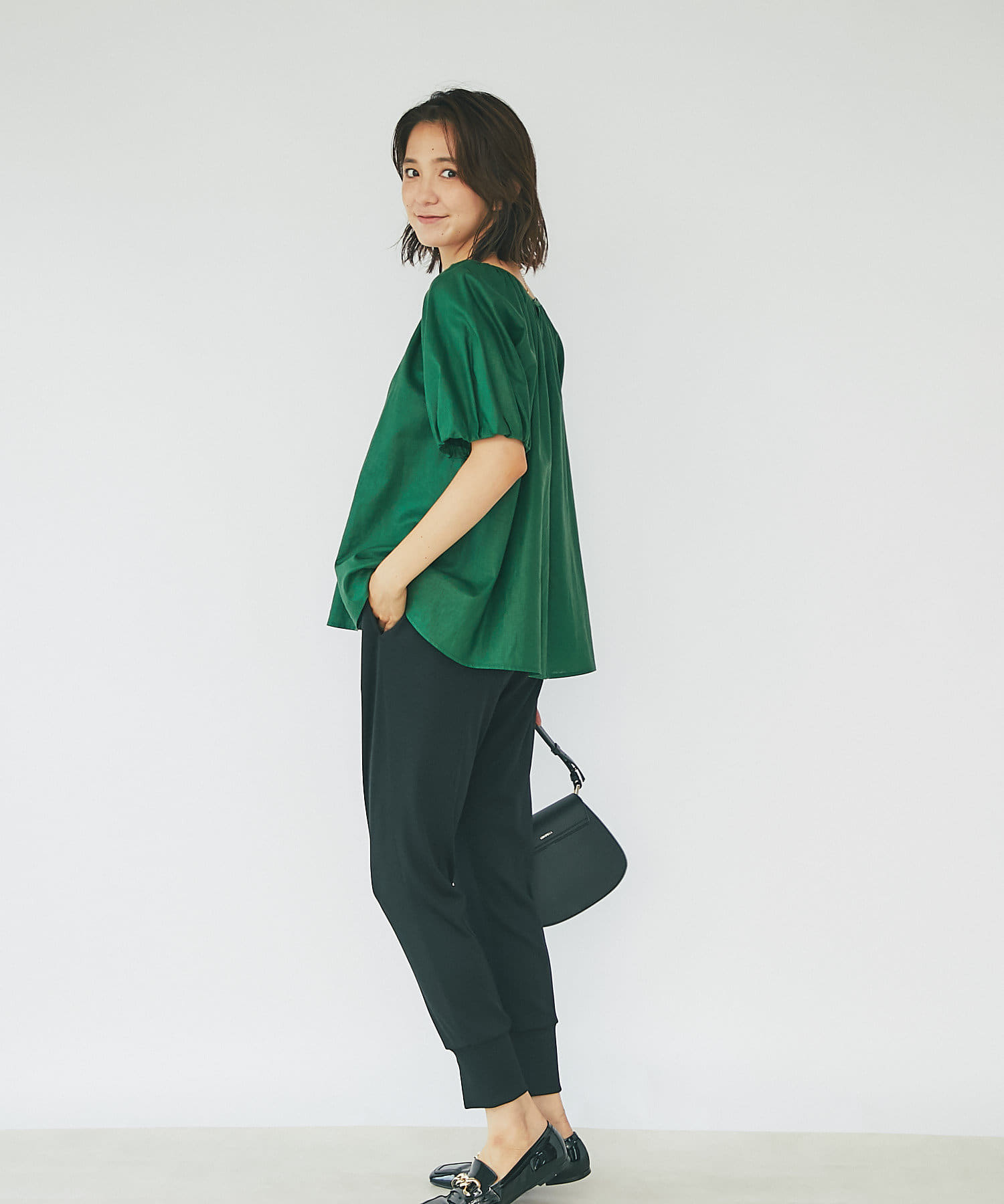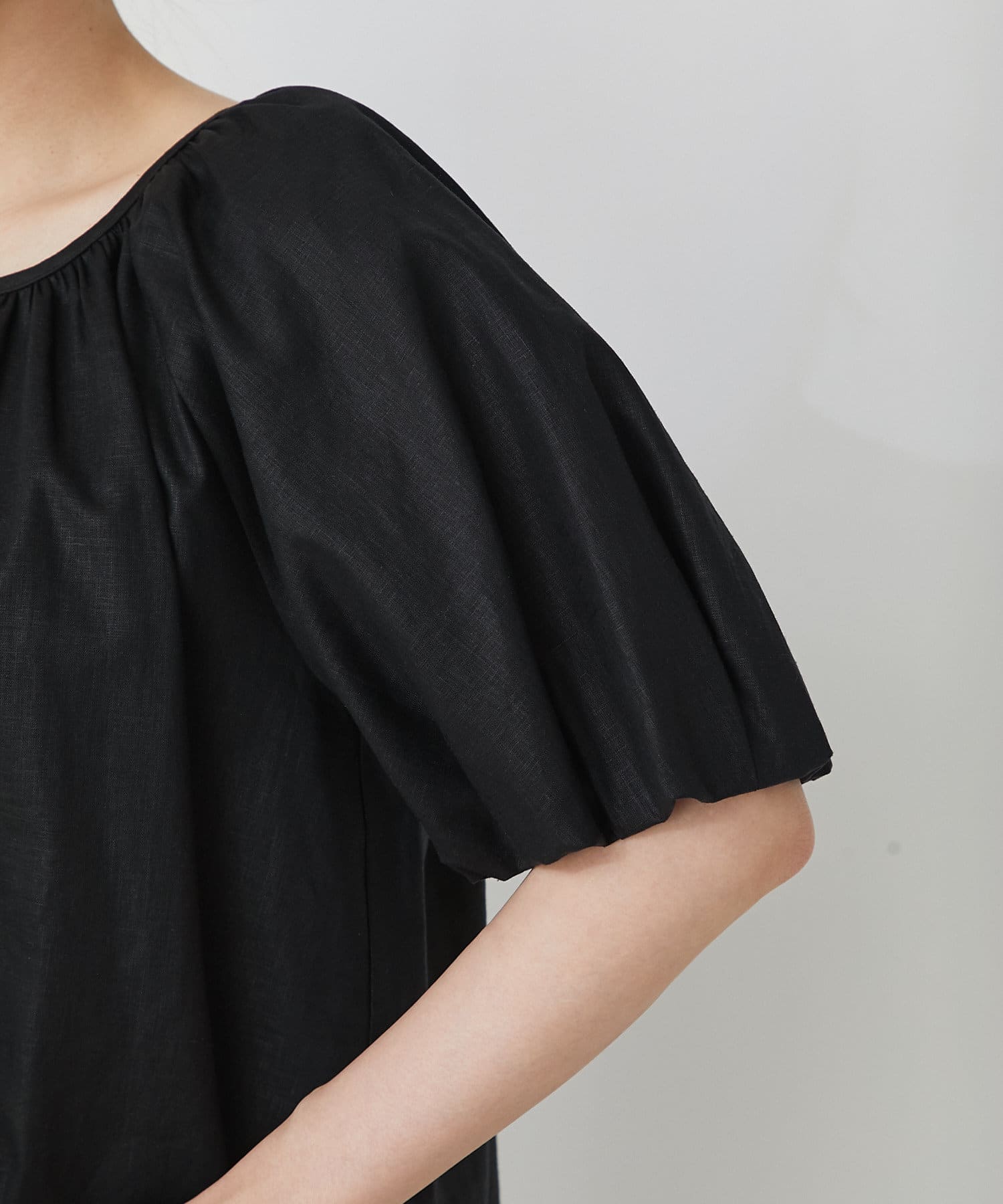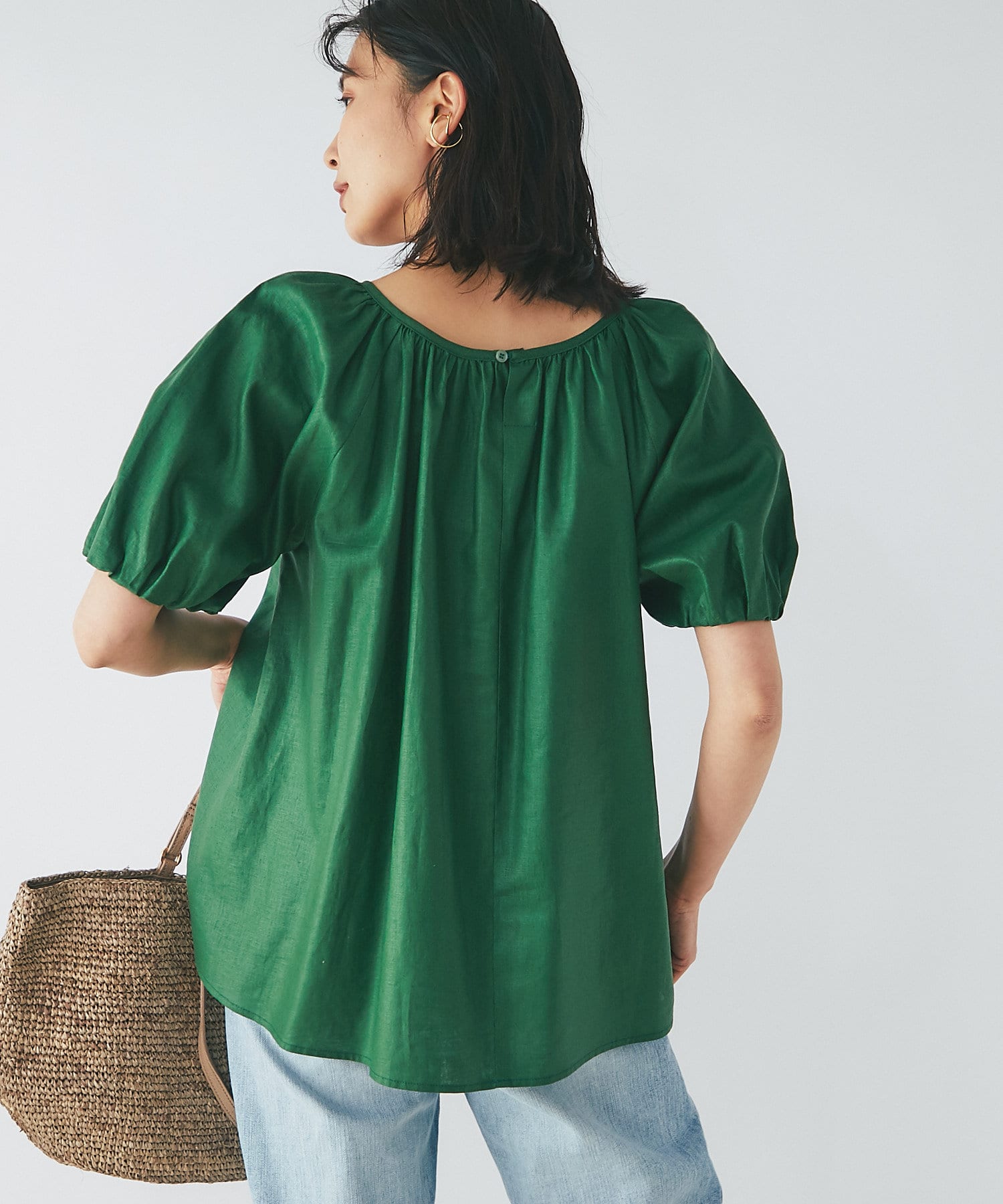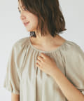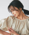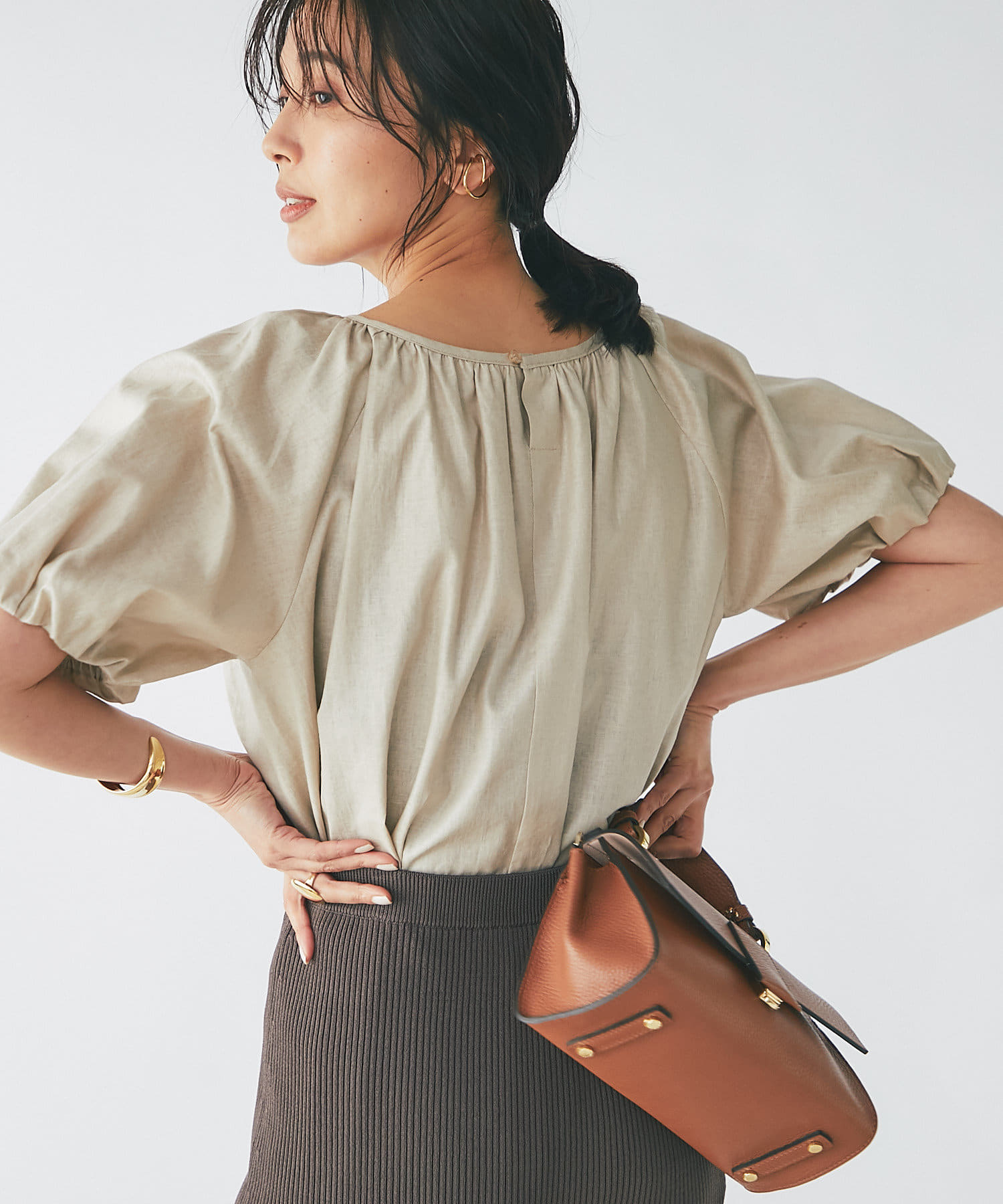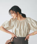 ネックラインのギャザーと、パフスリーブが華やかなアクセントをプラス