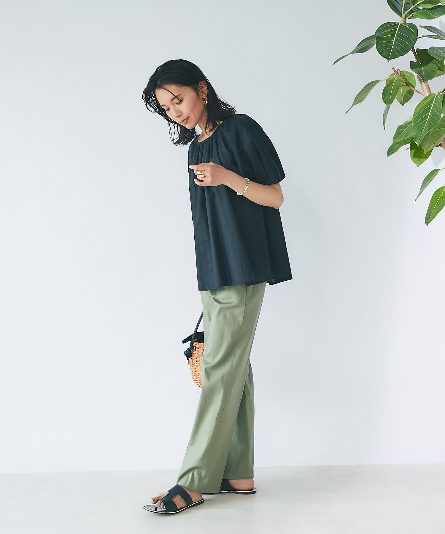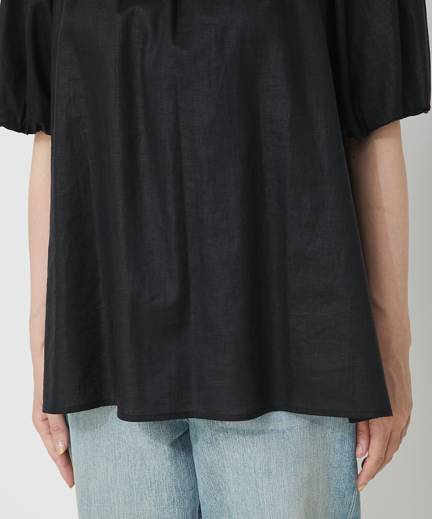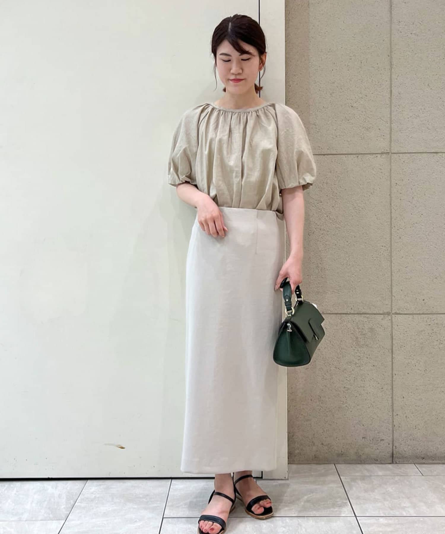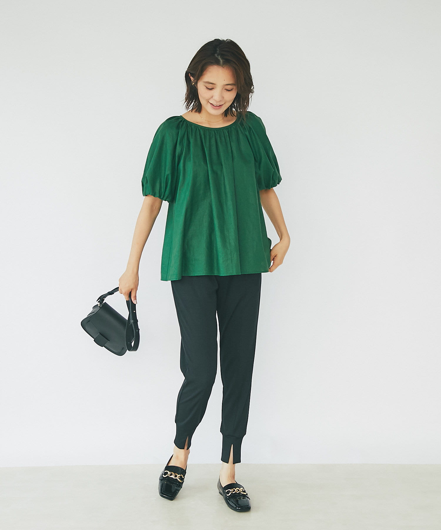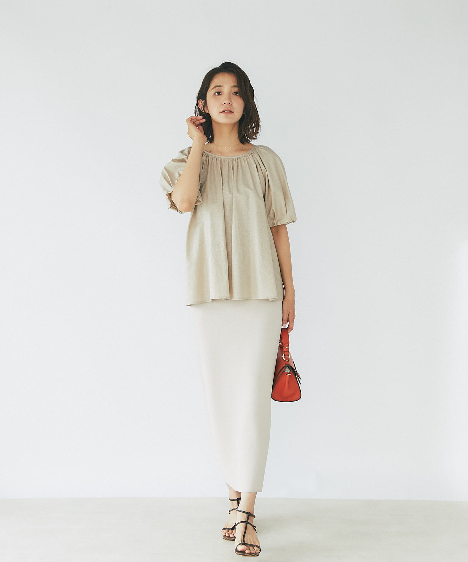 ネックラインのギャザーと、パフスリーブが華やかなアクセントをプラス