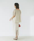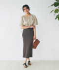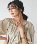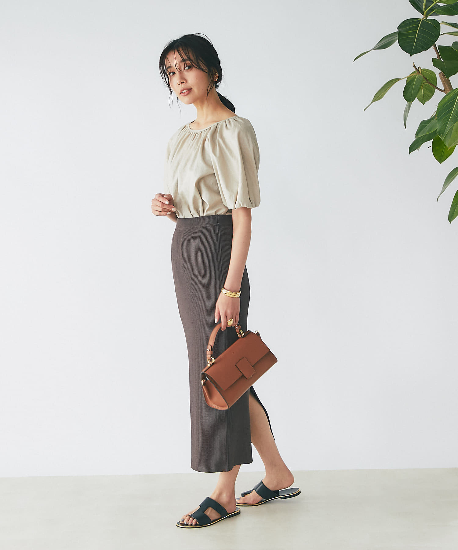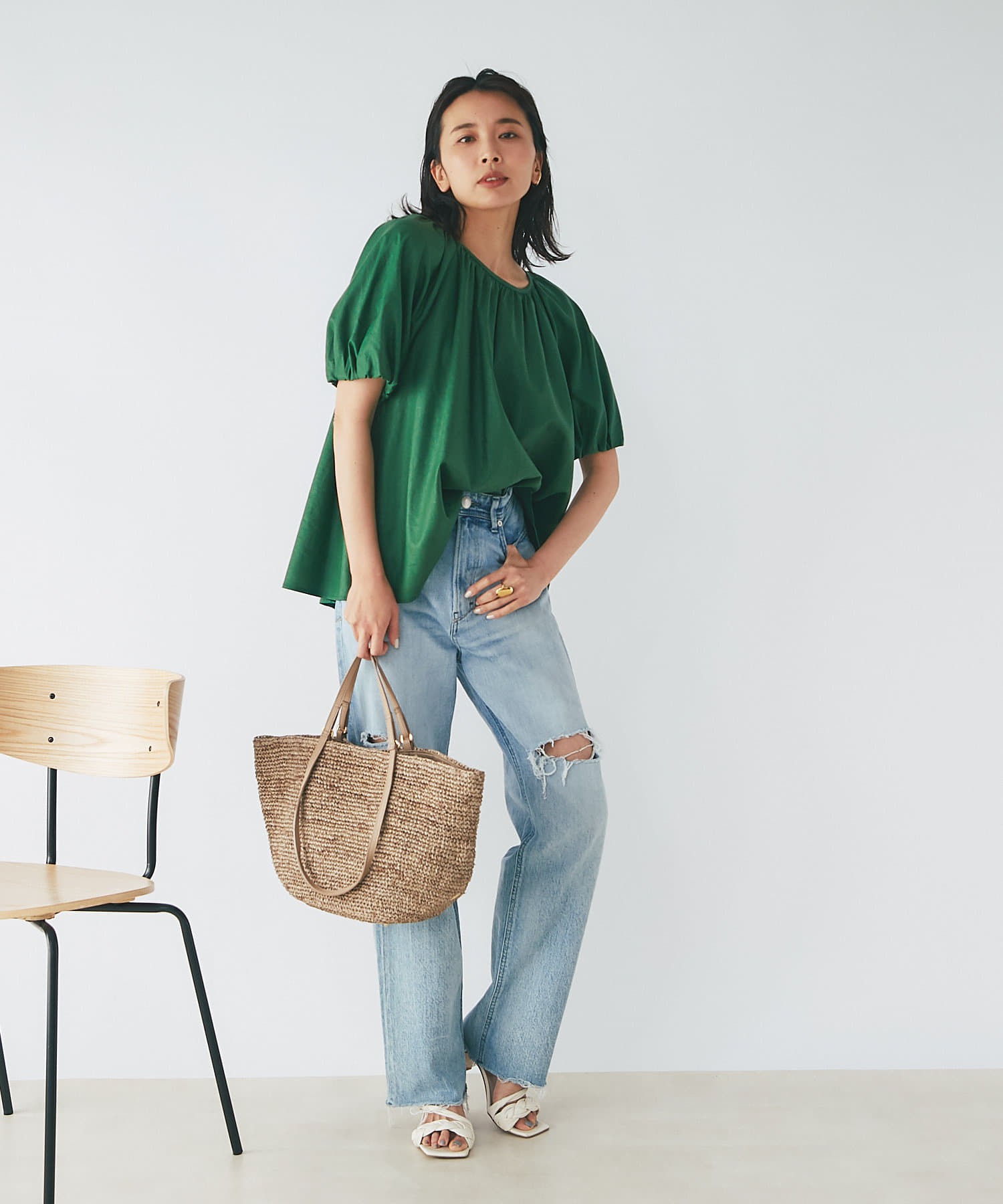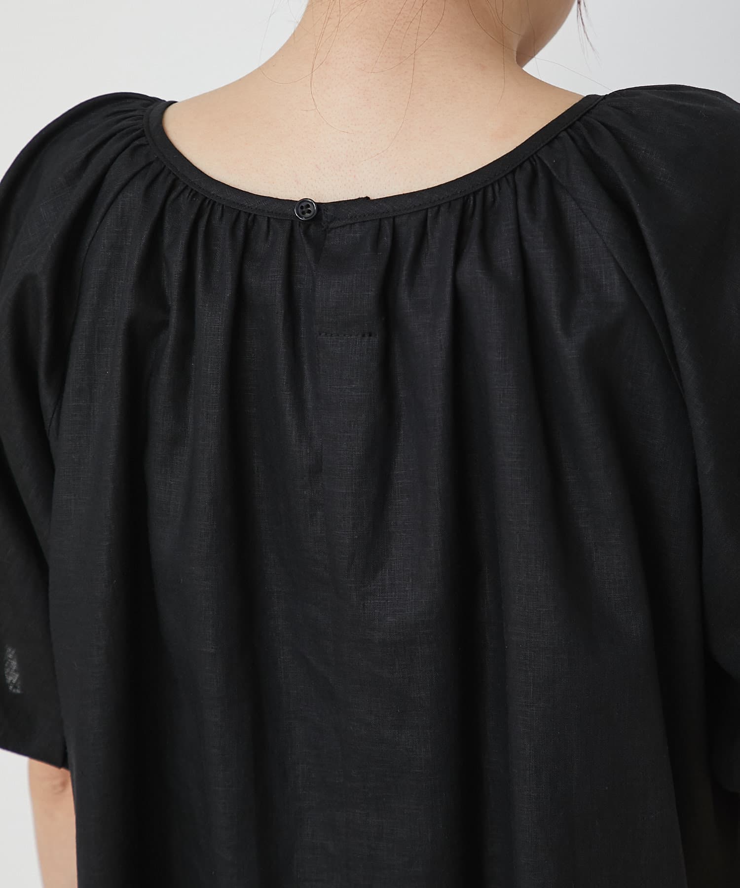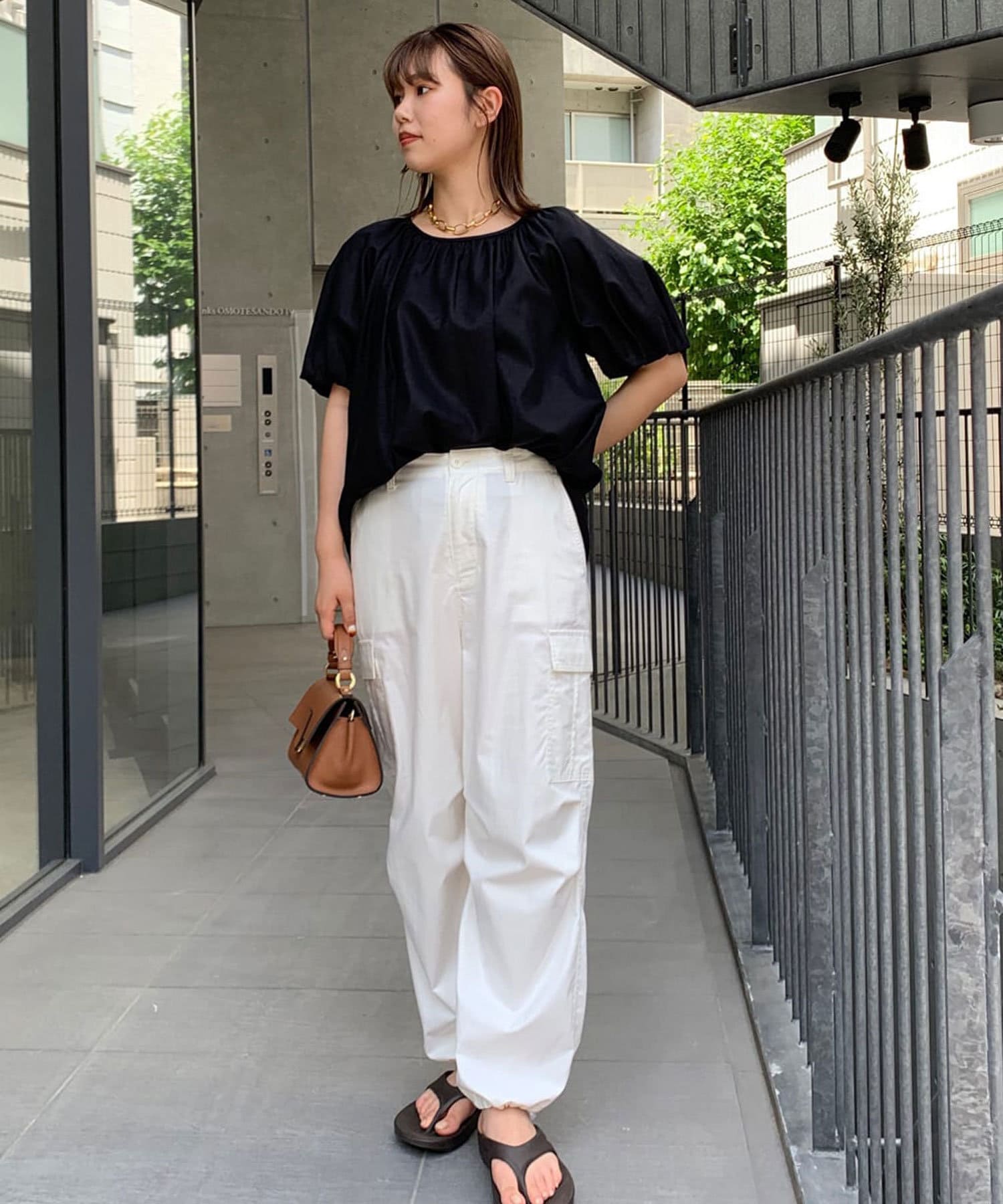 ネックラインのギャザーと、パフスリーブが華やかなアクセントをプラス