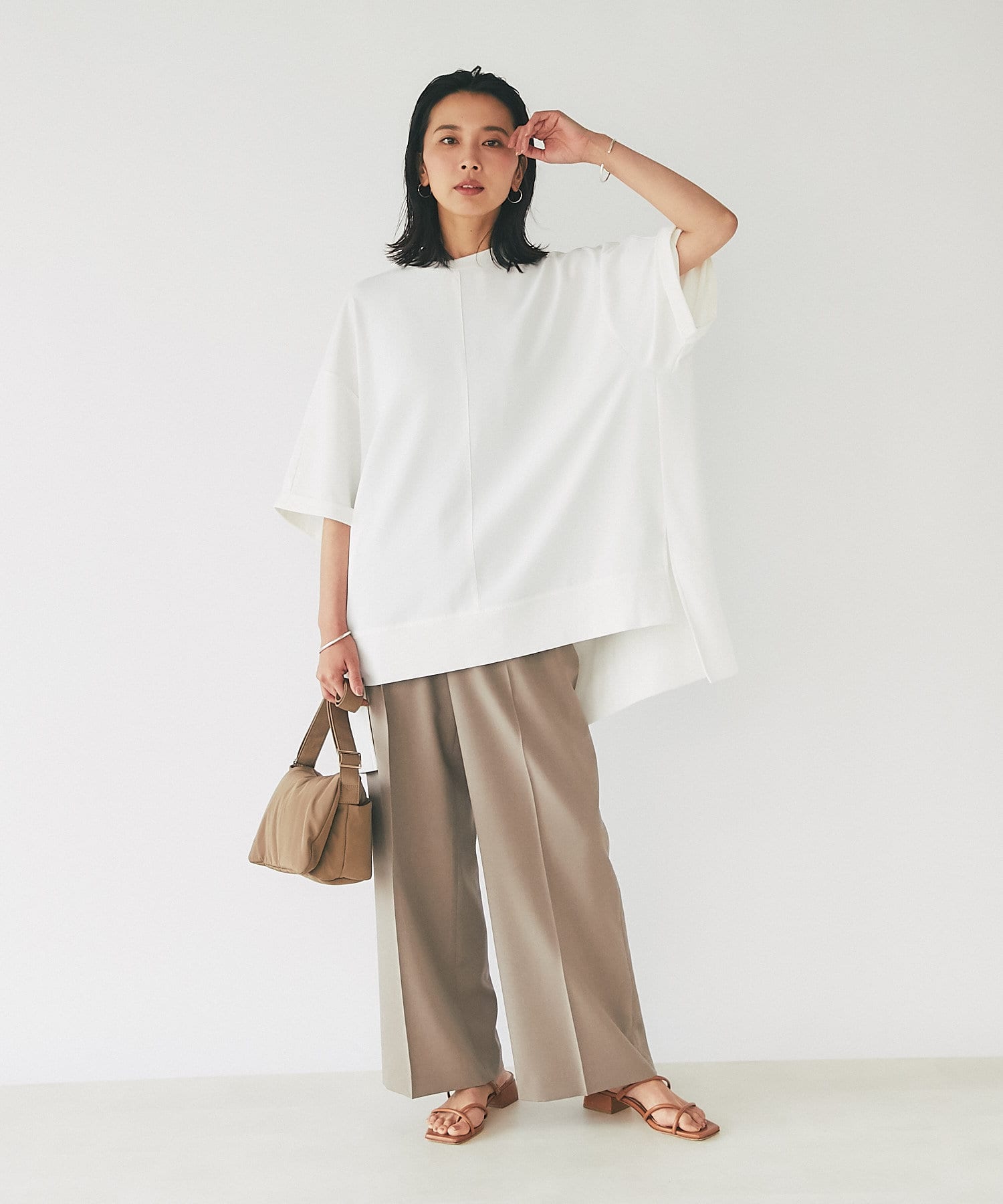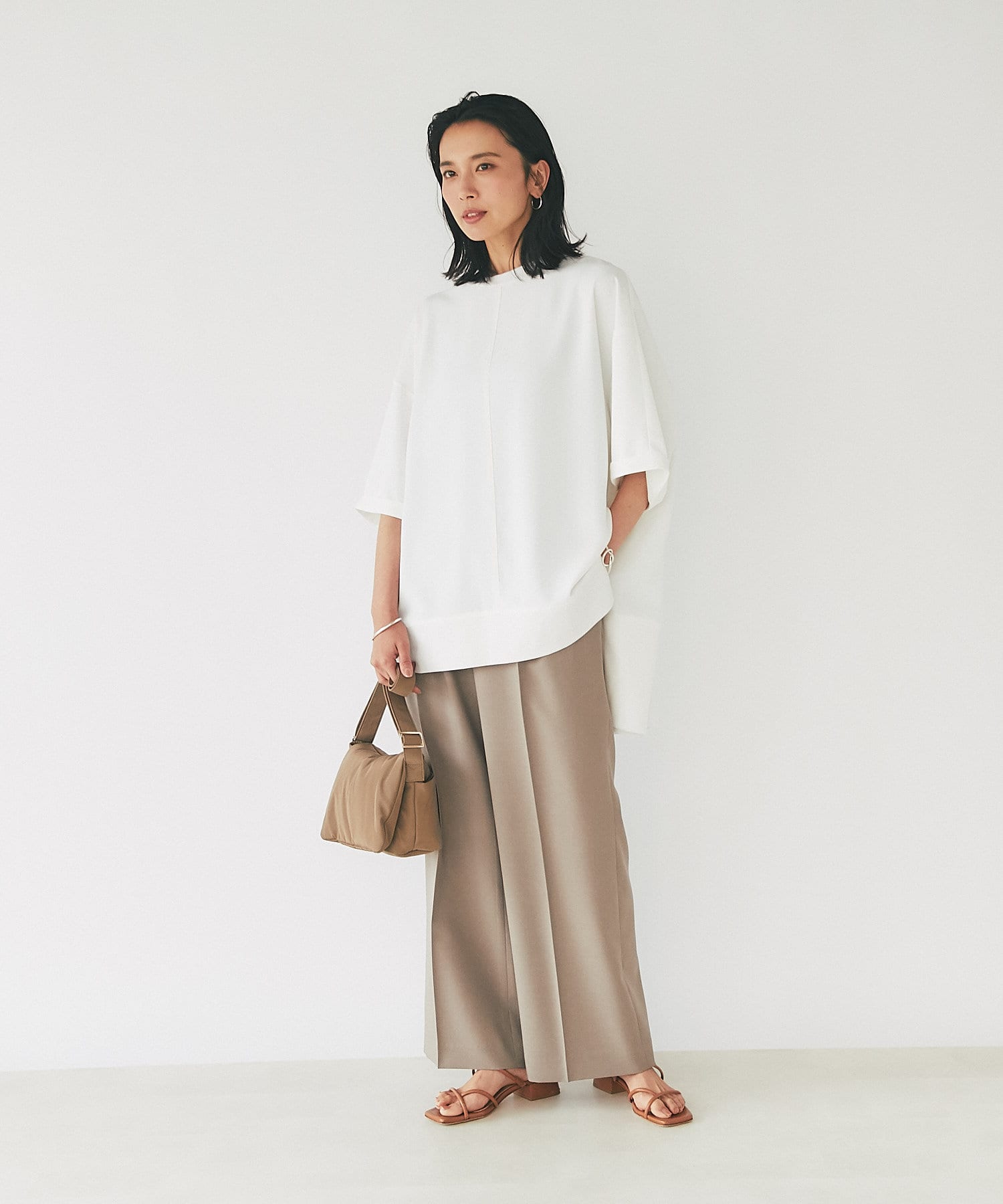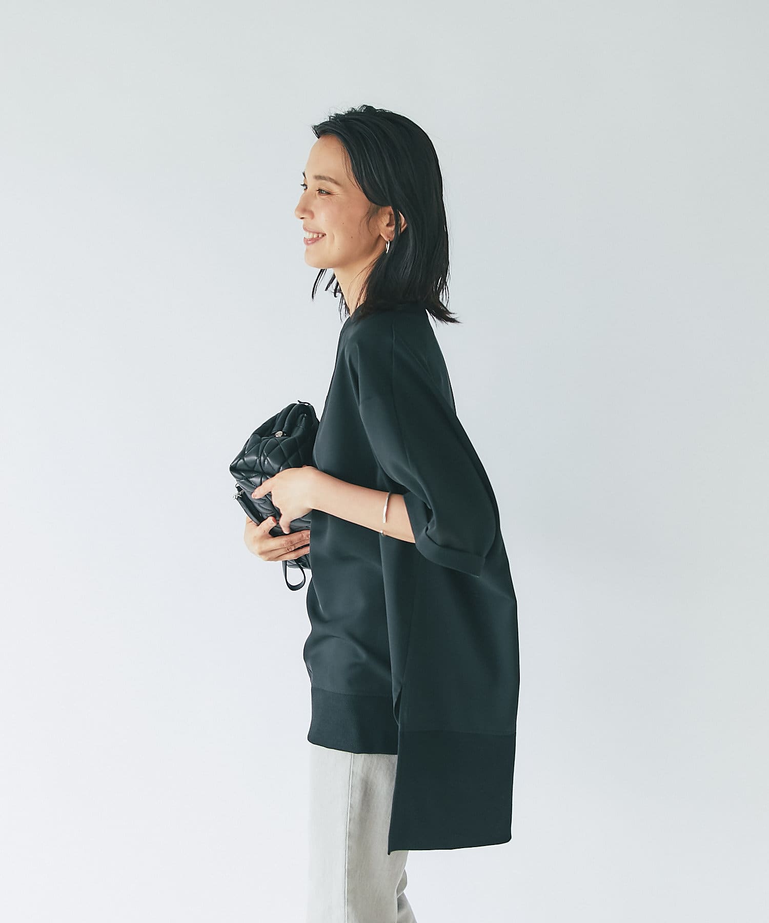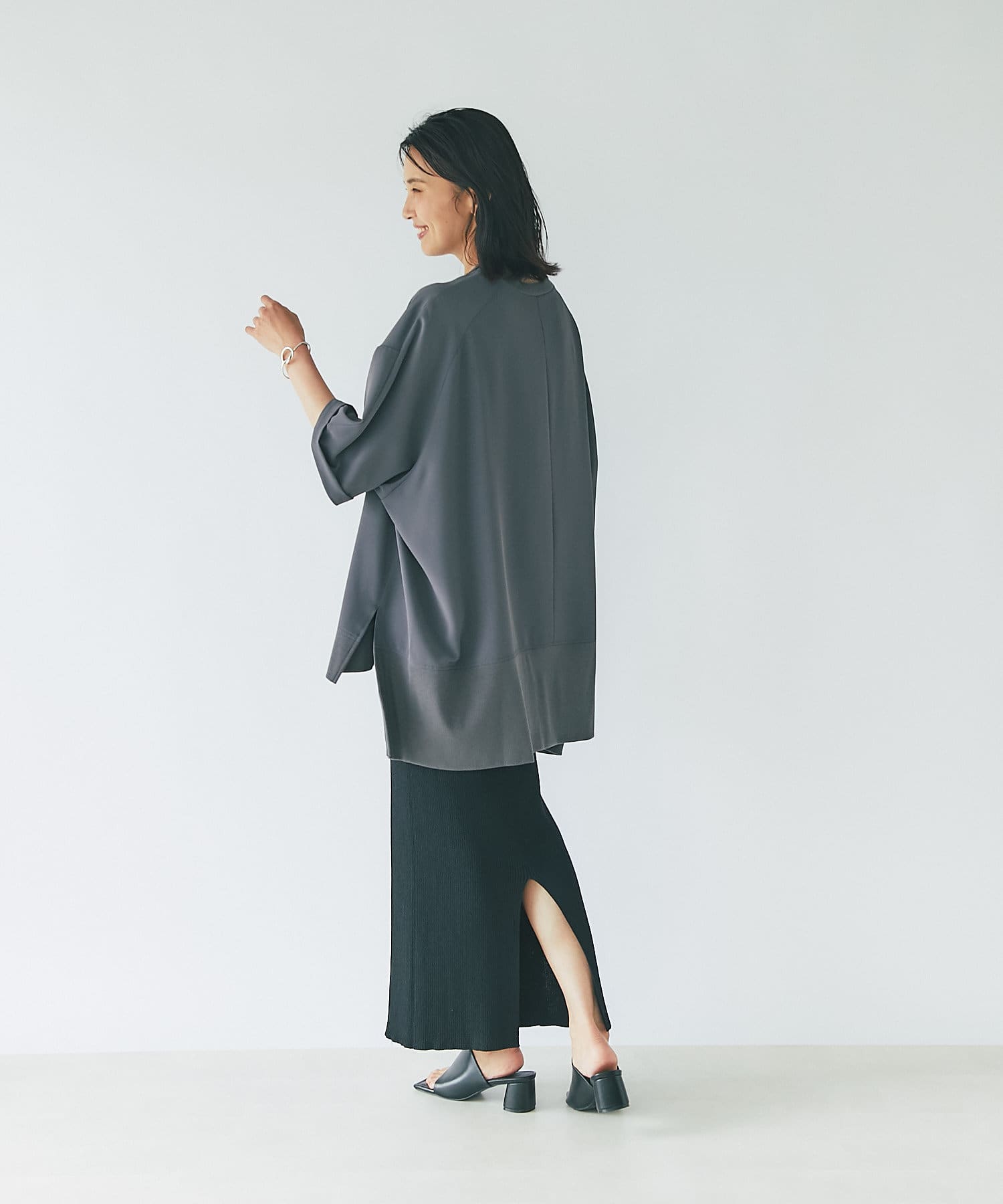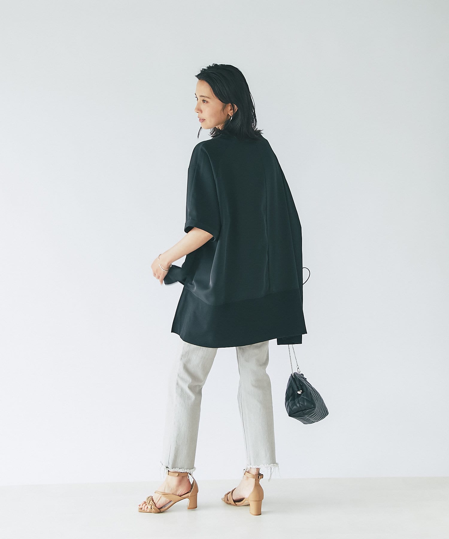 落ち感のある滑らかな生地感なので、肩まわりも張らずスッキリと着こなせます。