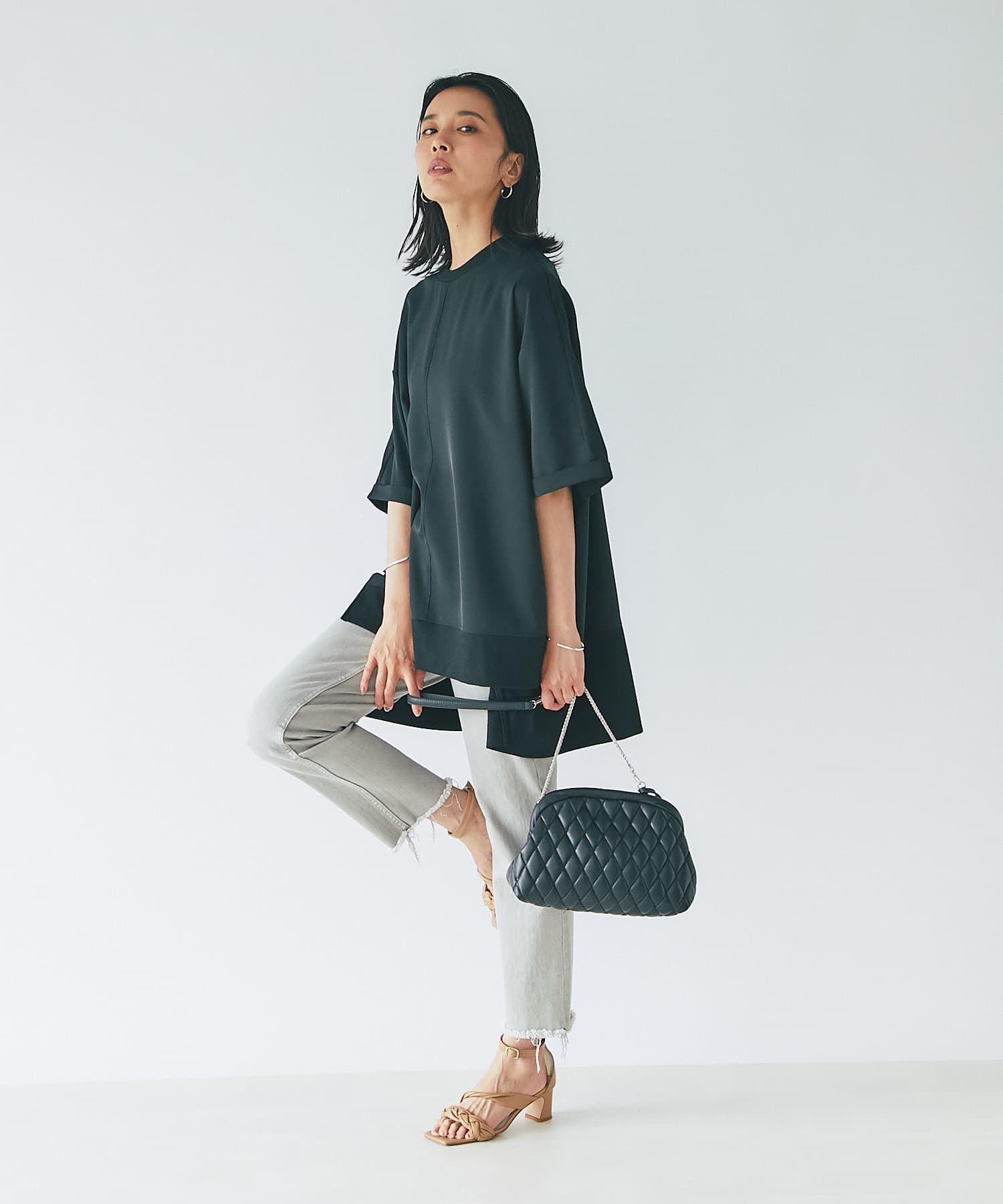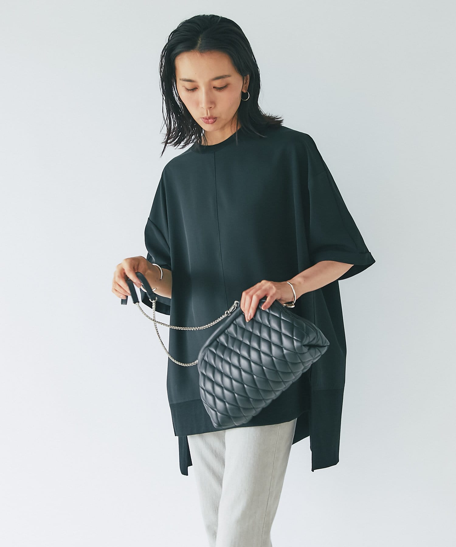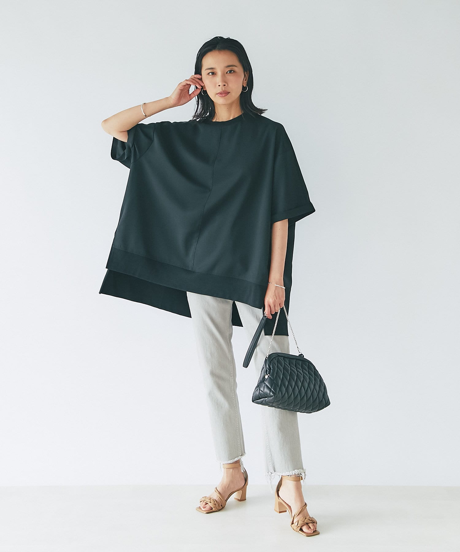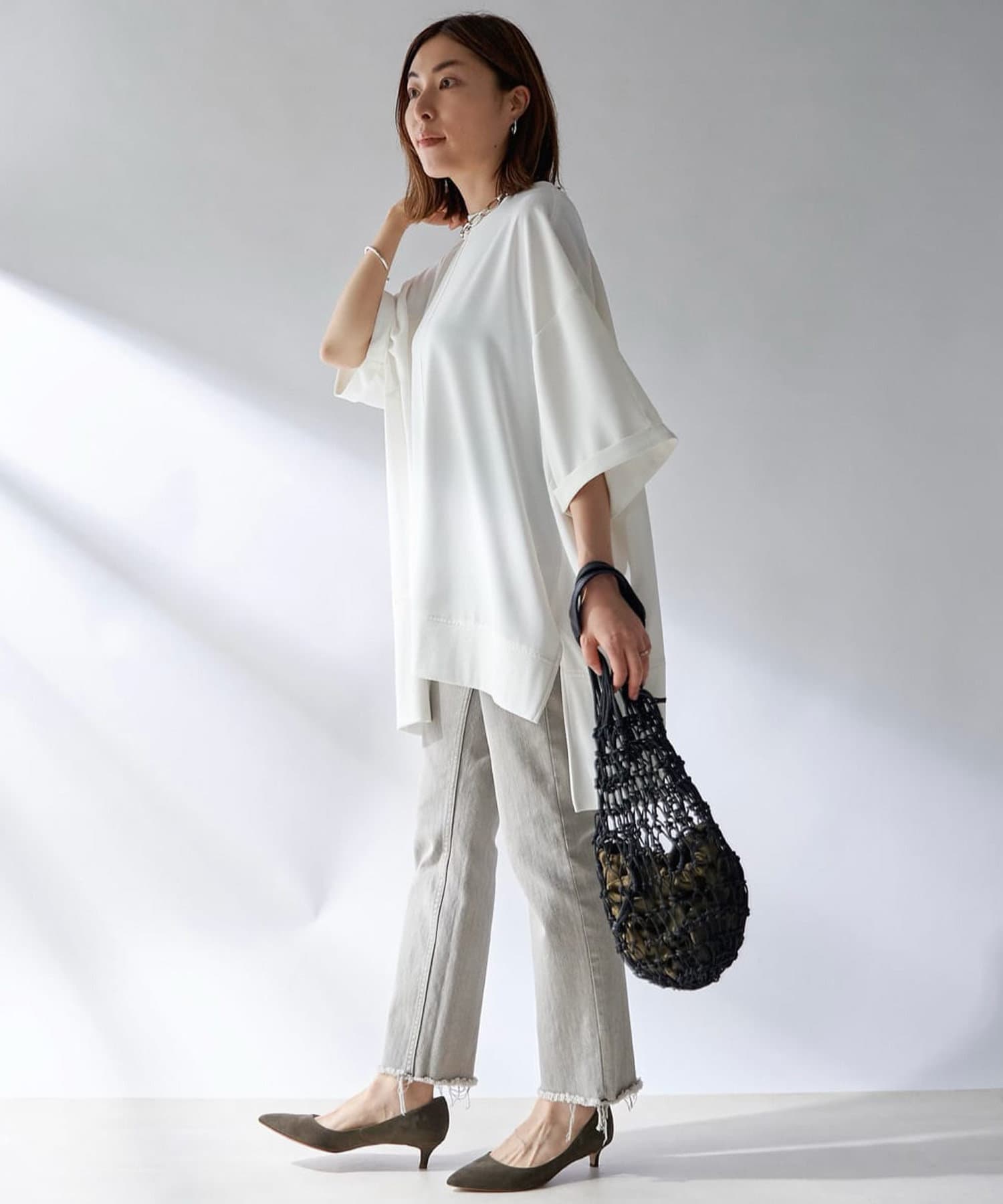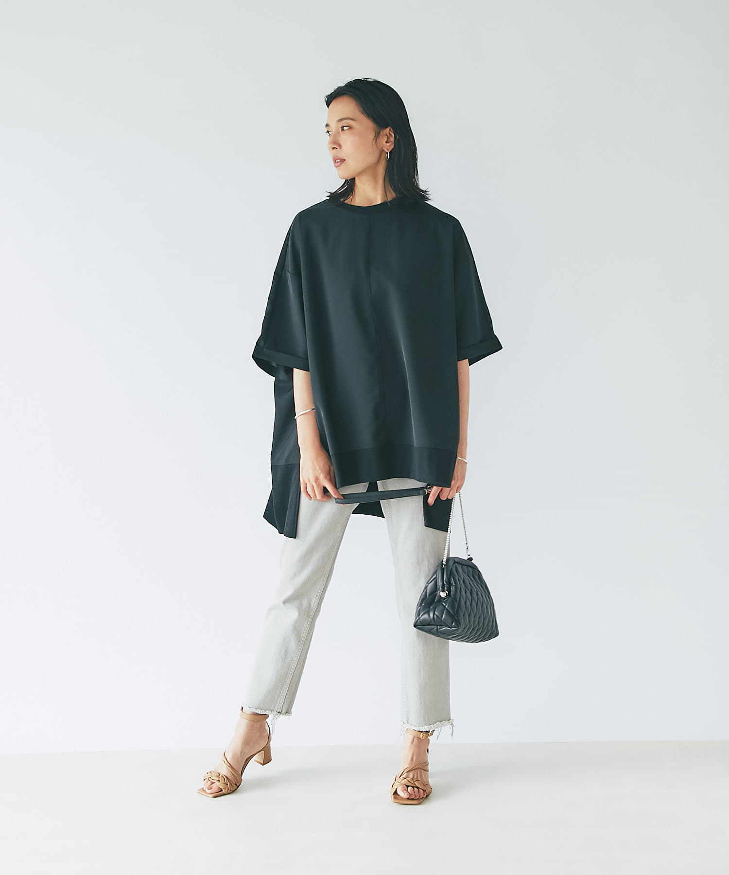 落ち感のある滑らかな生地感なので、肩まわりも張らずスッキリと着こなせます。