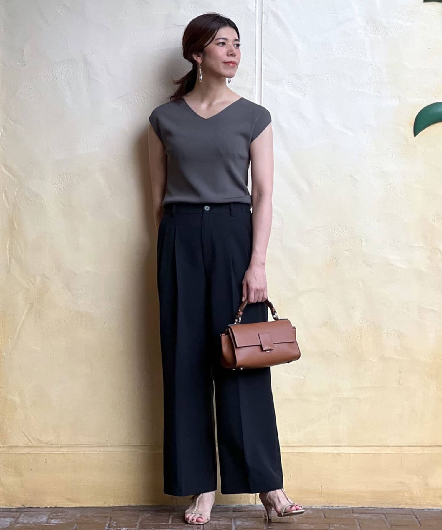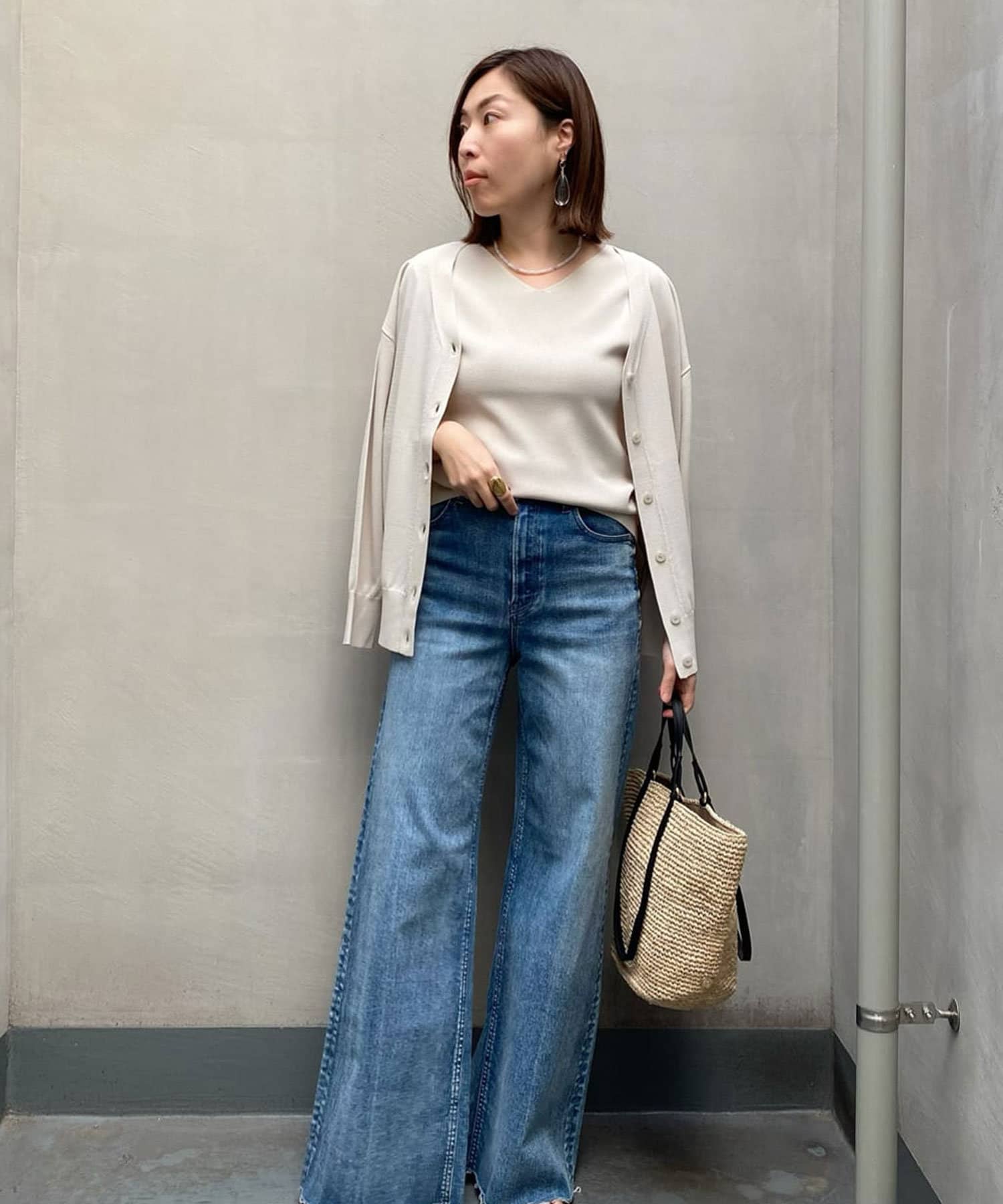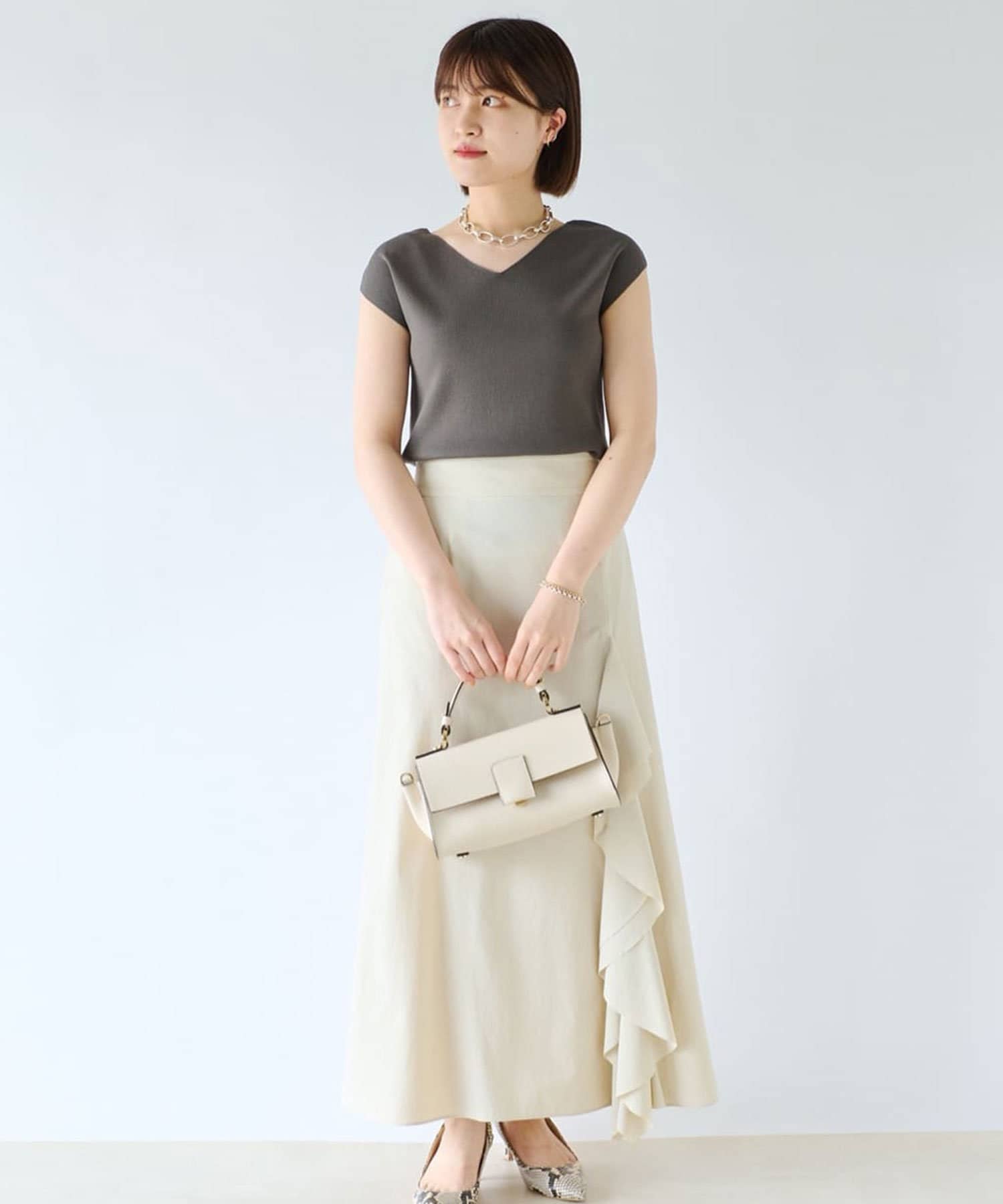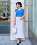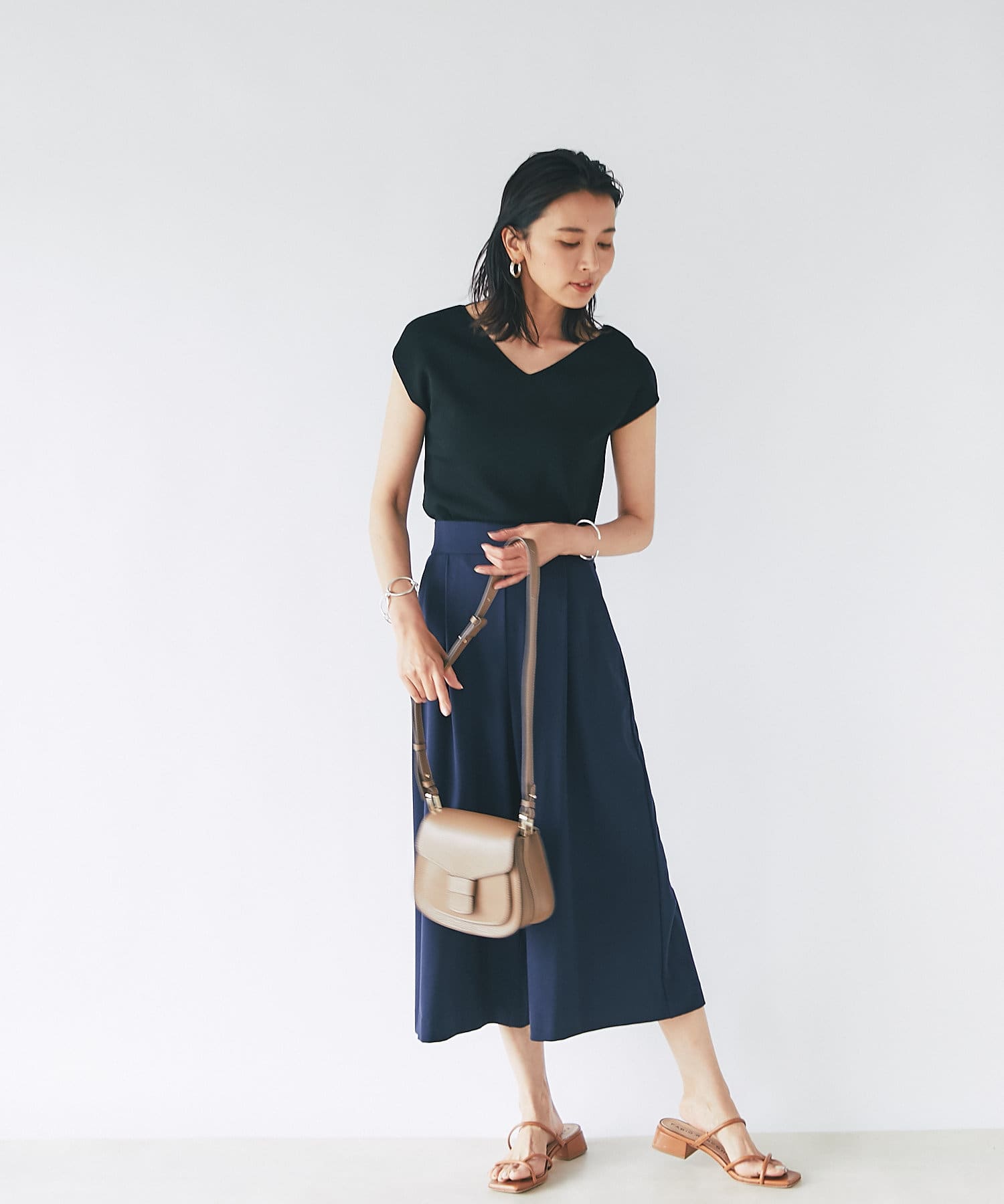 シンプルなデザインのニットなのでお仕事、お出かけ両方に使えるオンオフ兼用アイテムです。お出かけには花柄スカートなどの柄アイテムや、デニムやなどのカジュアルなボトムスで合わせても素敵です。様々なテイストのコーディネートに使えるので着回し抜群なニットです。