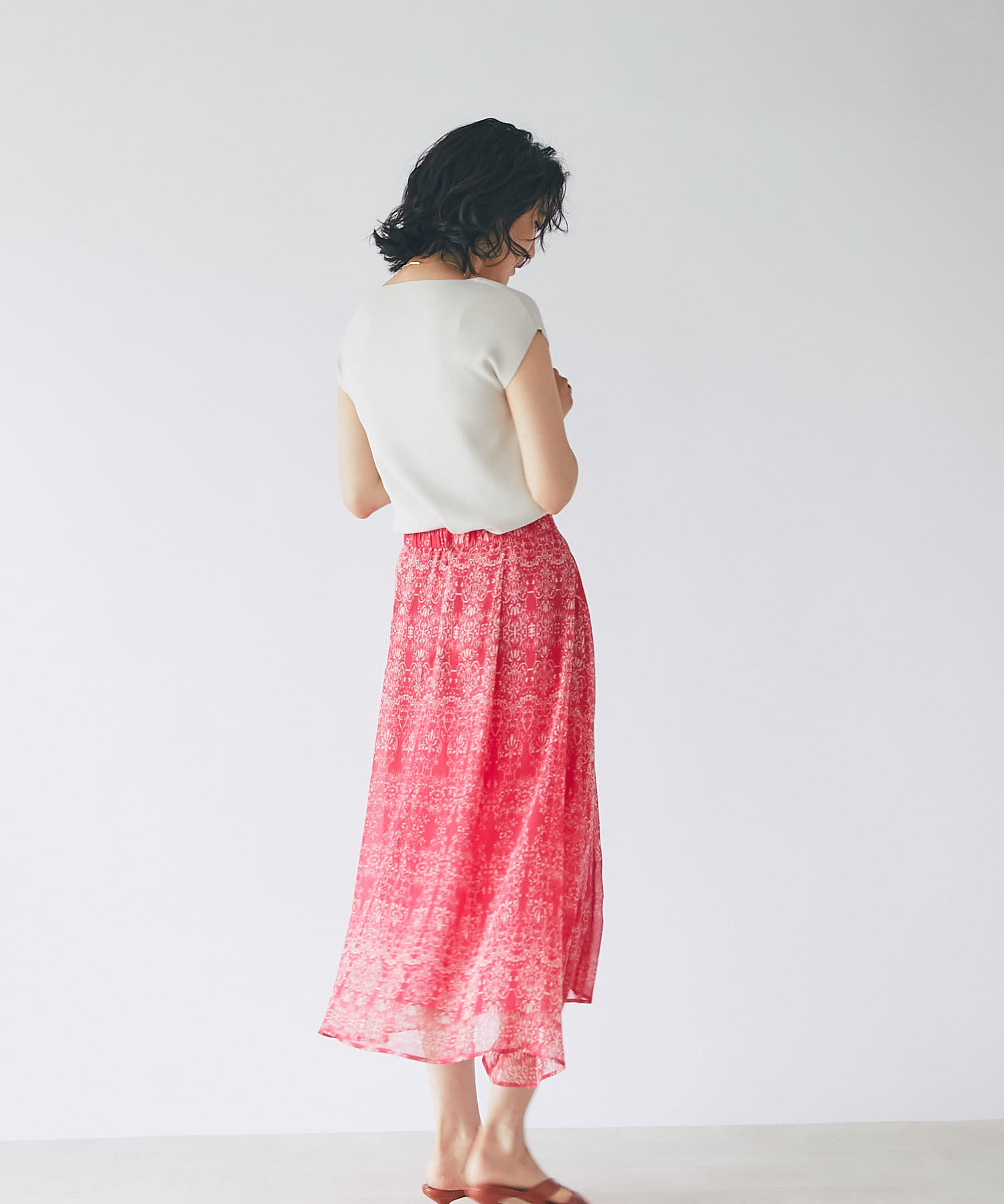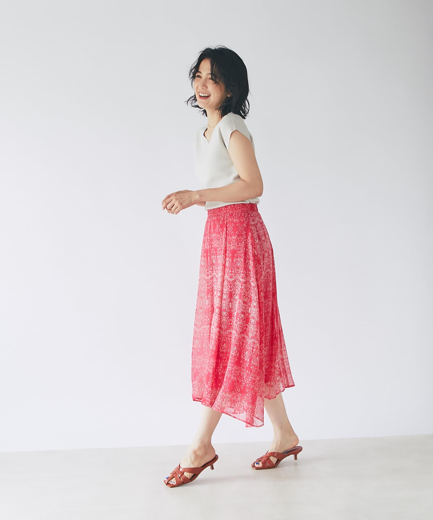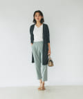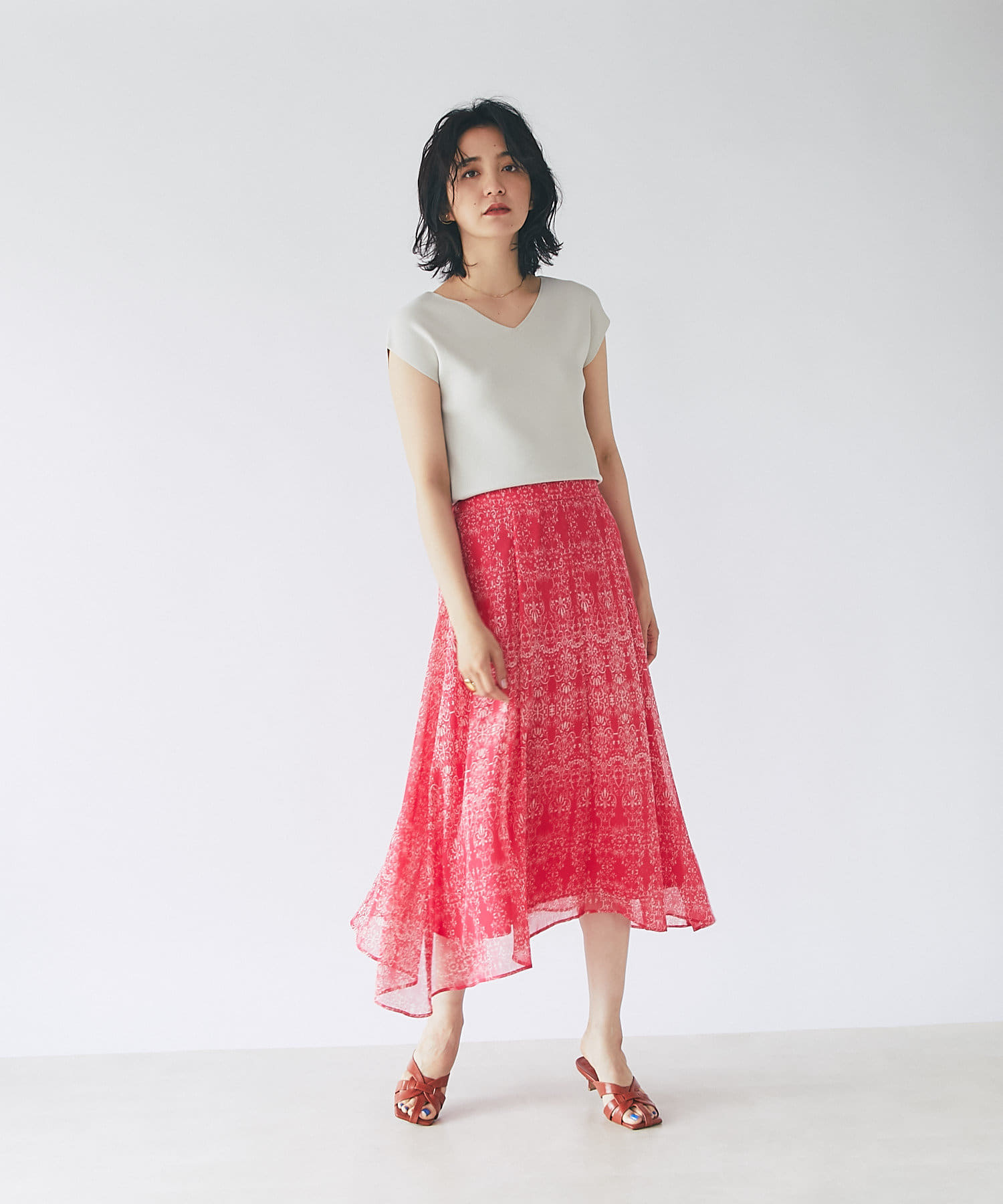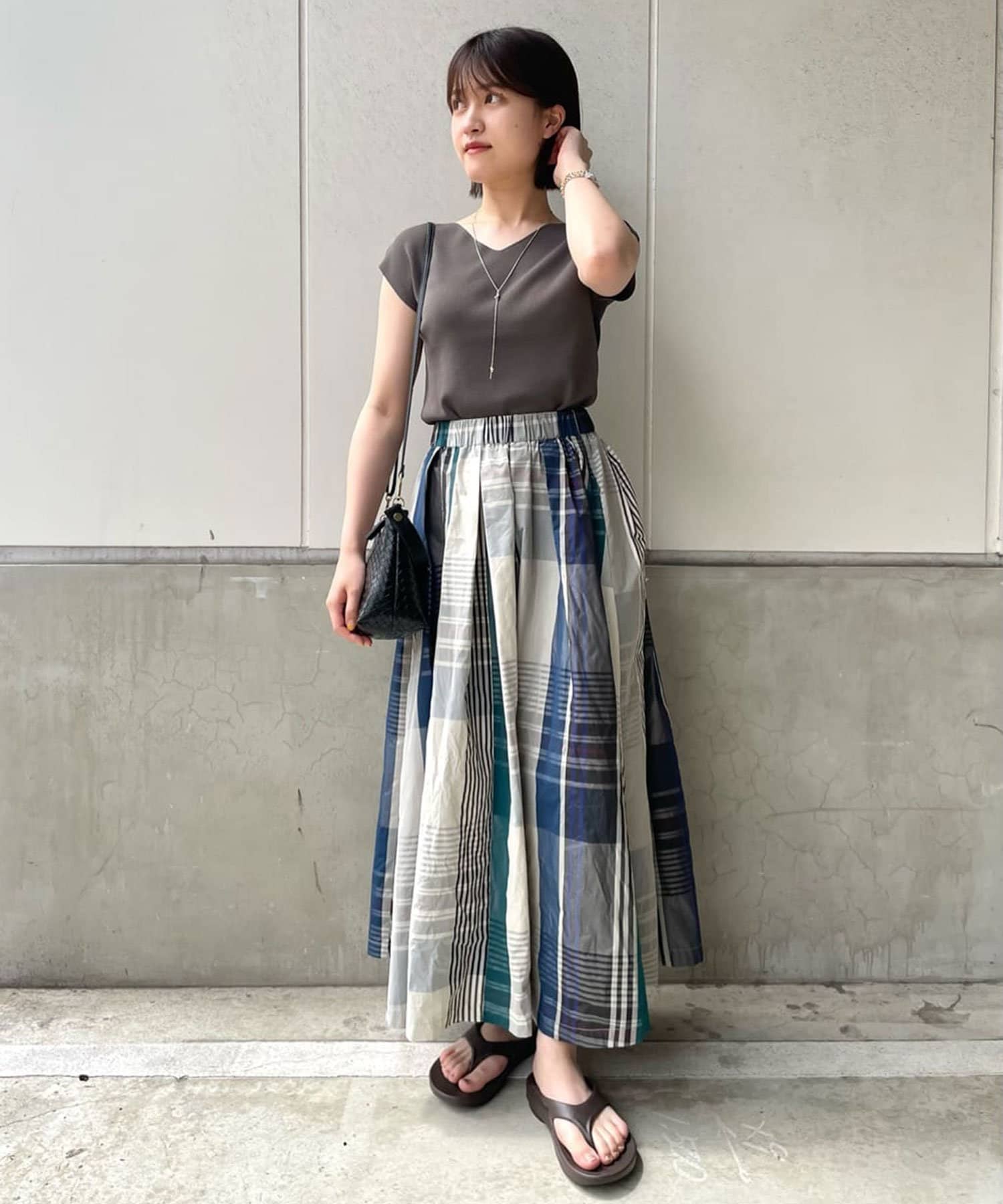 シンプルなデザインのニットなのでお仕事、お出かけ両方に使えるオンオフ兼用アイテムです。お出かけには花柄スカートなどの柄アイテムや、デニムやなどのカジュアルなボトムスで合わせても素敵です。様々なテイストのコーディネートに使えるので着回し抜群なニットです。