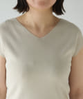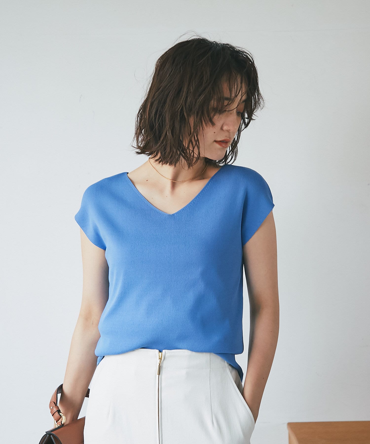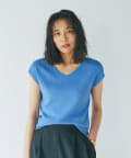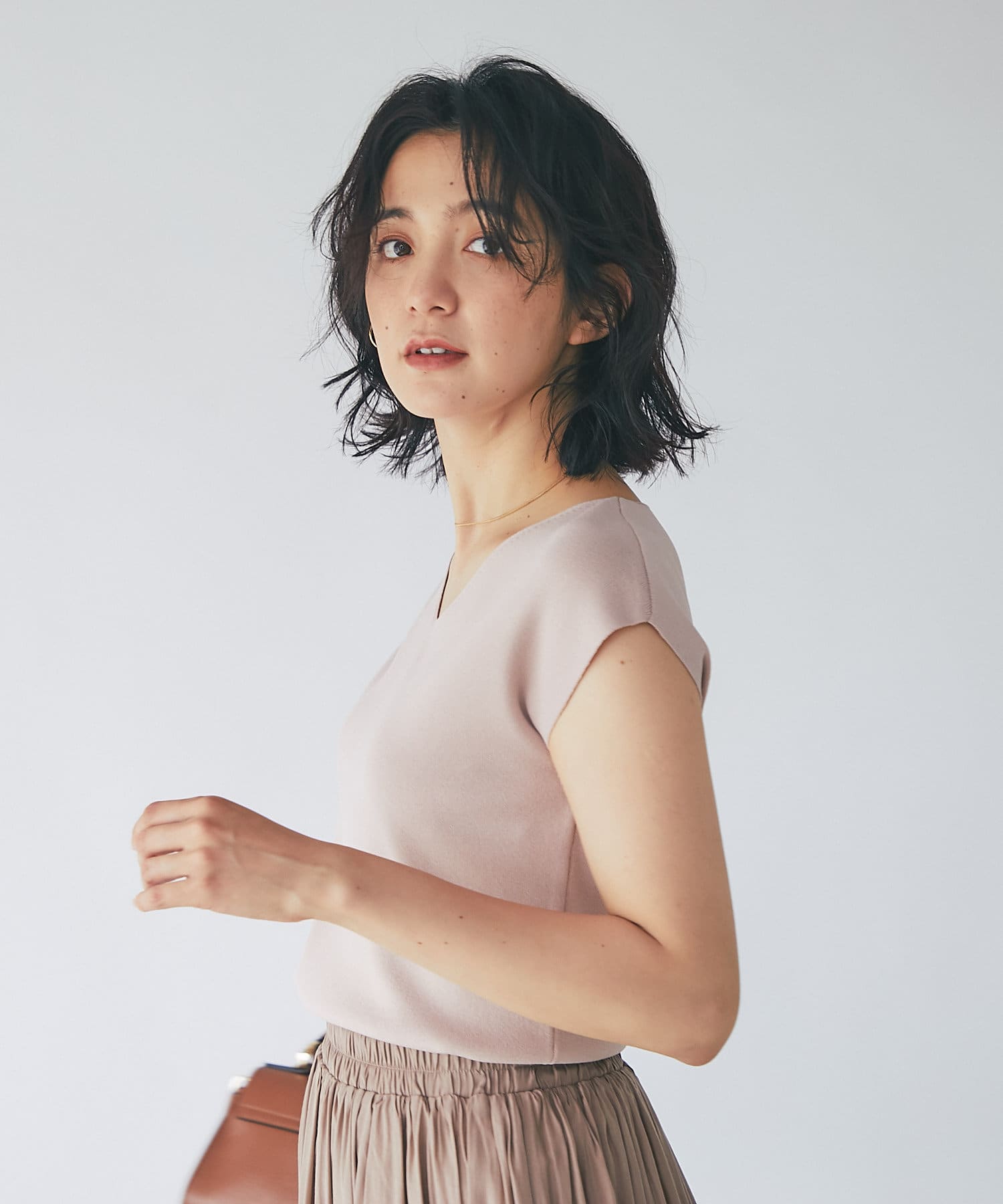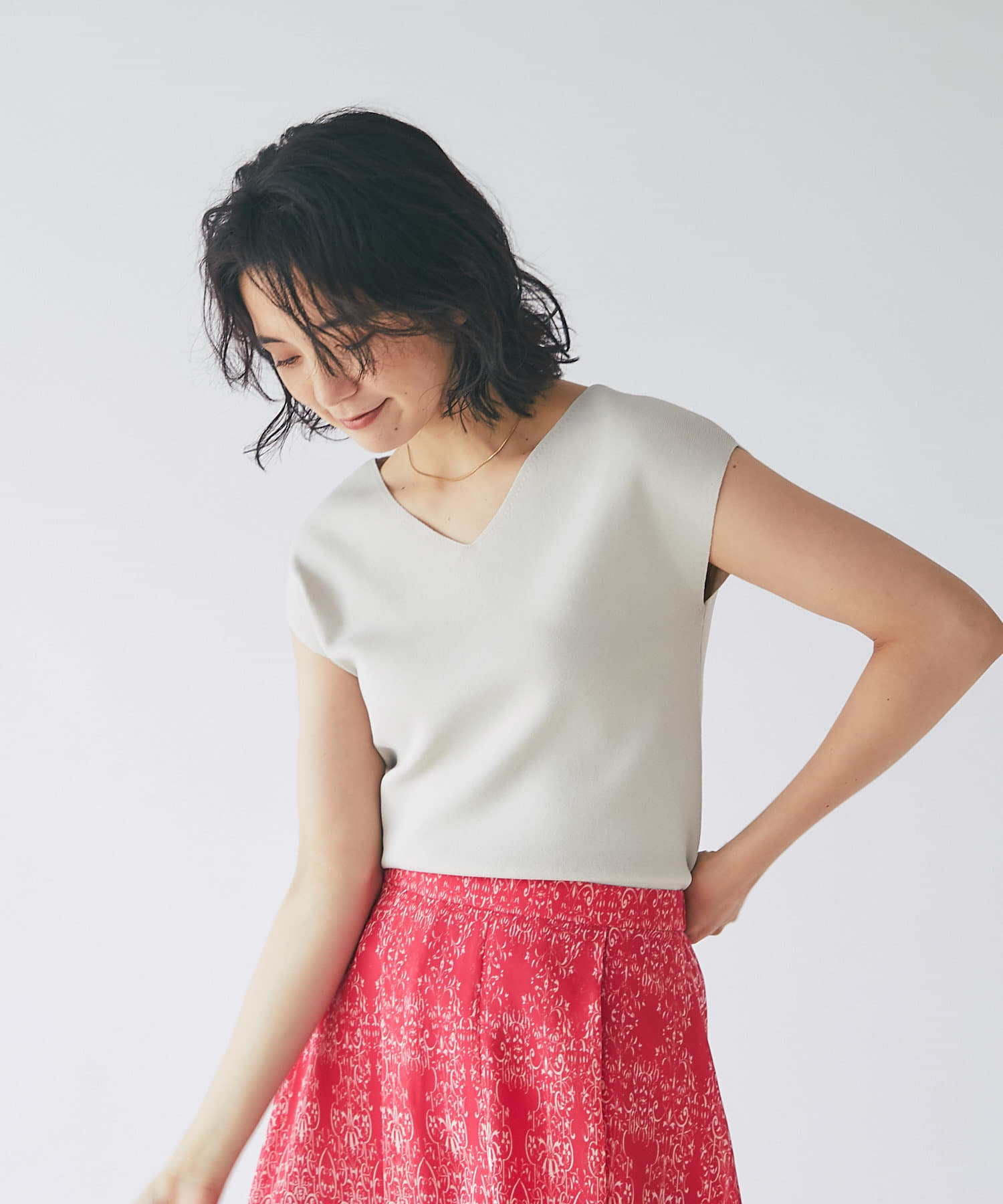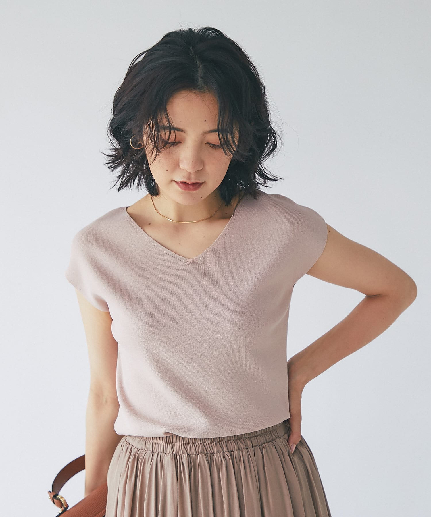 ひんやりタッチでUV効果があり、ウオッシャブル機能もついたベーシックニットは色違いで揃えたくなるアイテムです。Vネックでデコルテが綺麗にみえて、スッキリと着ていただけます。