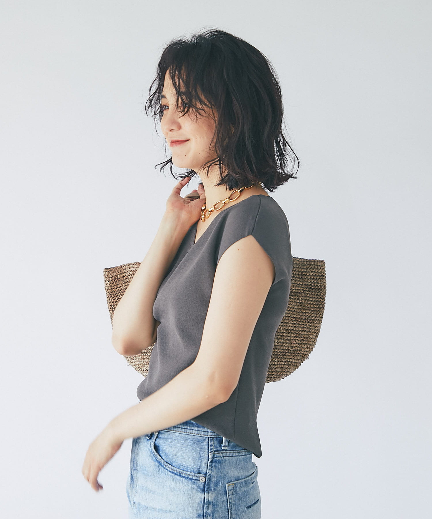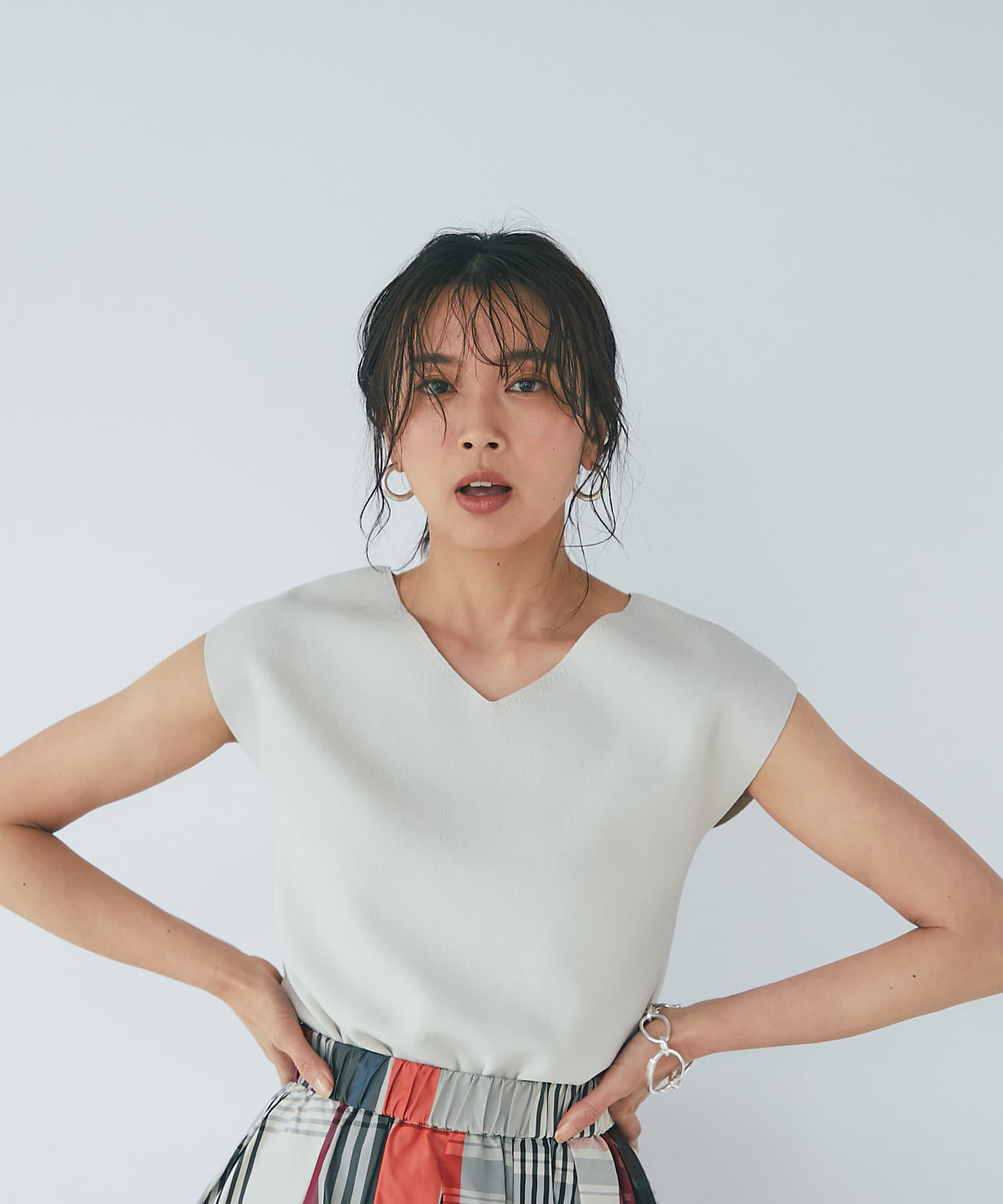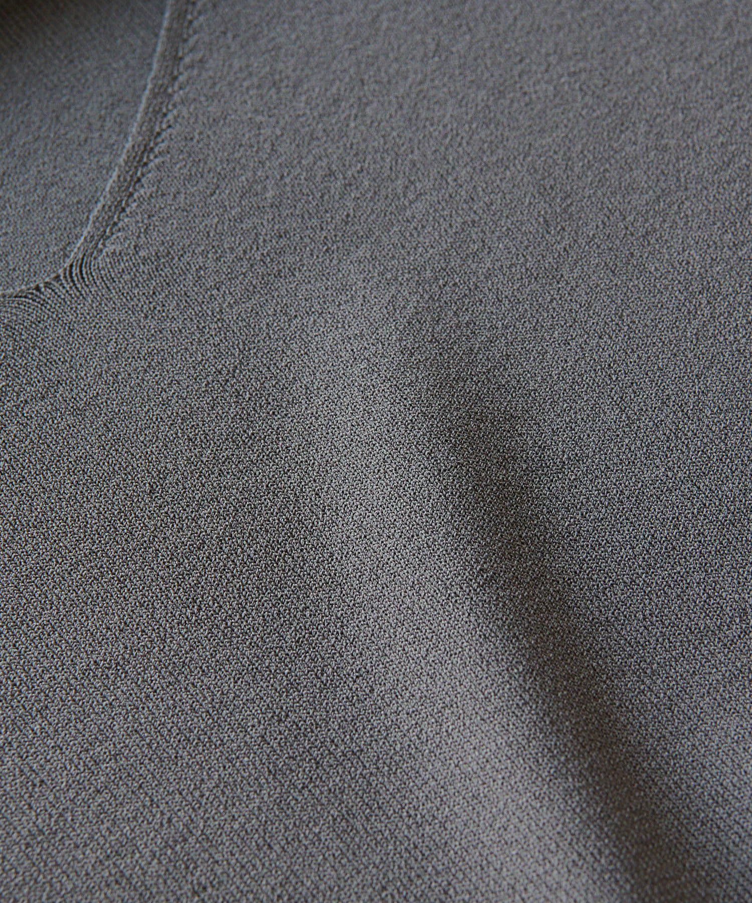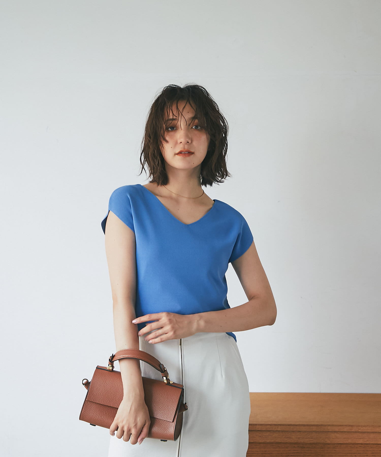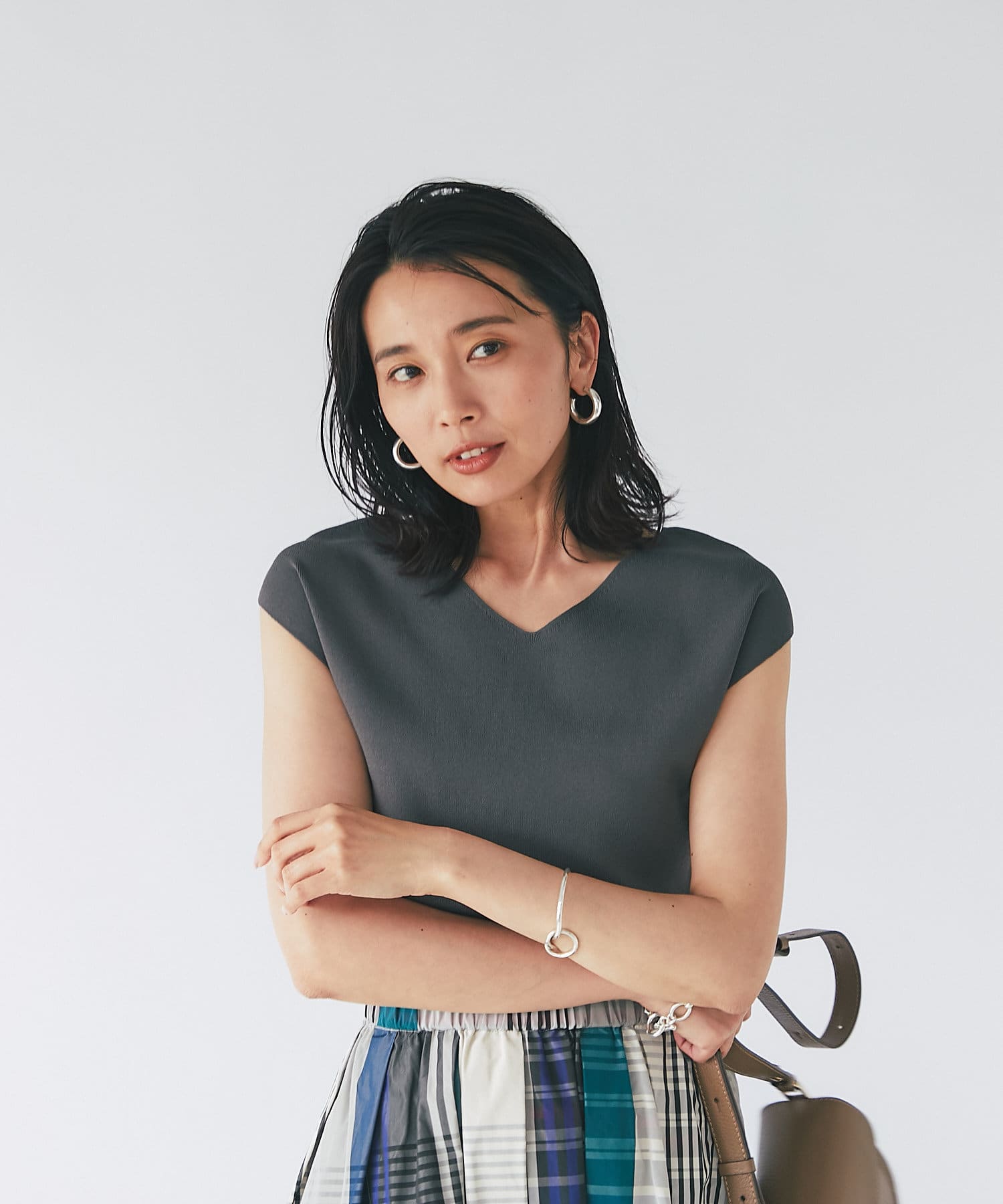 ひんやりタッチでUV効果があり、ウオッシャブル機能もついたベーシックニットは色違いで揃えたくなるアイテムです。Vネックでデコルテが綺麗にみえて、スッキリと着ていただけます。