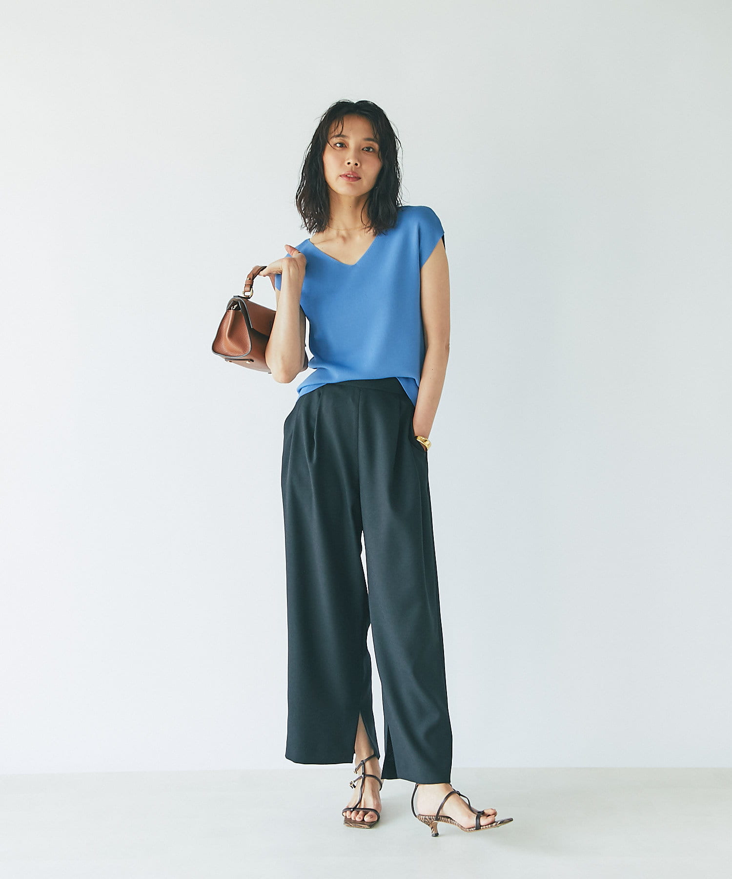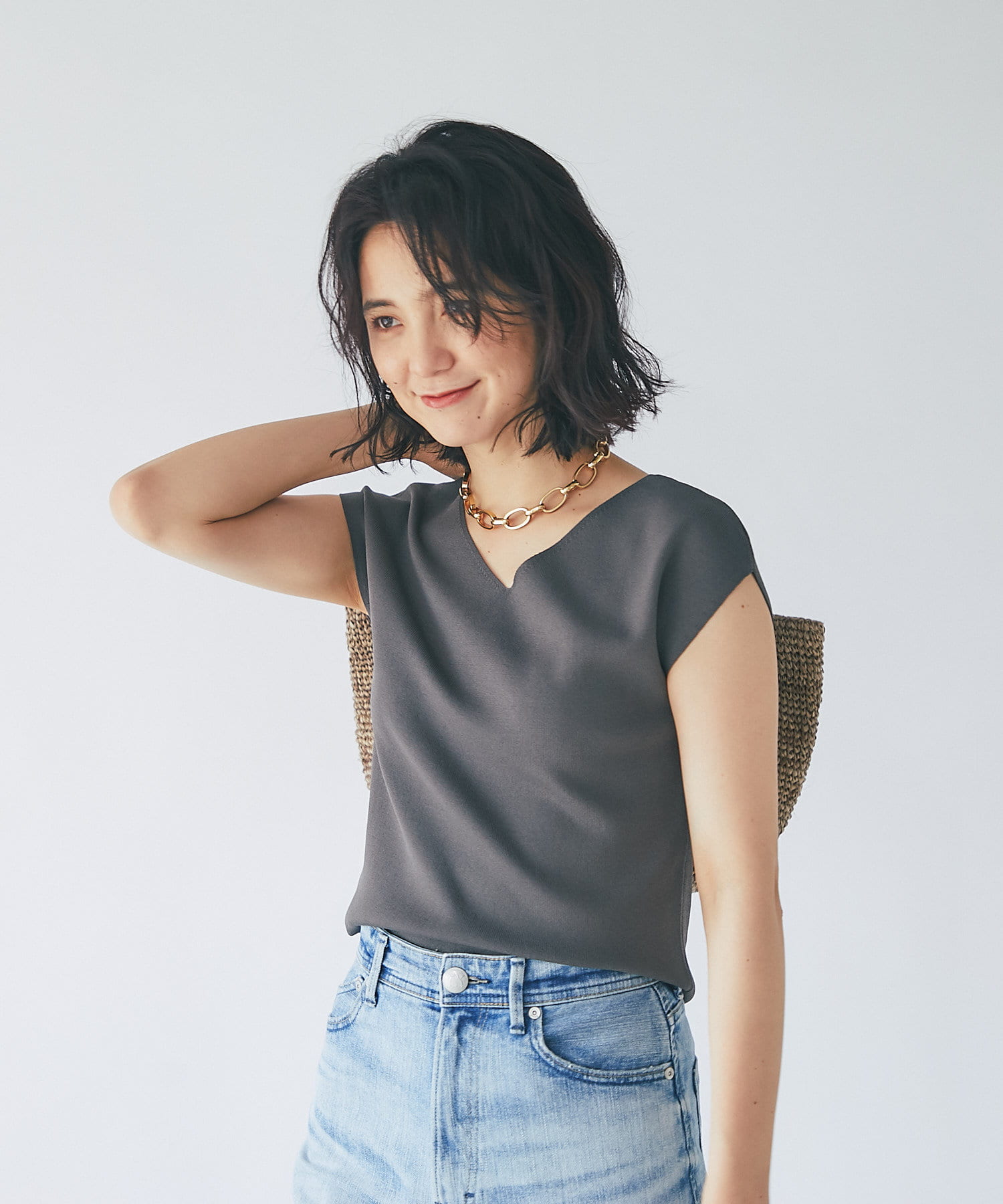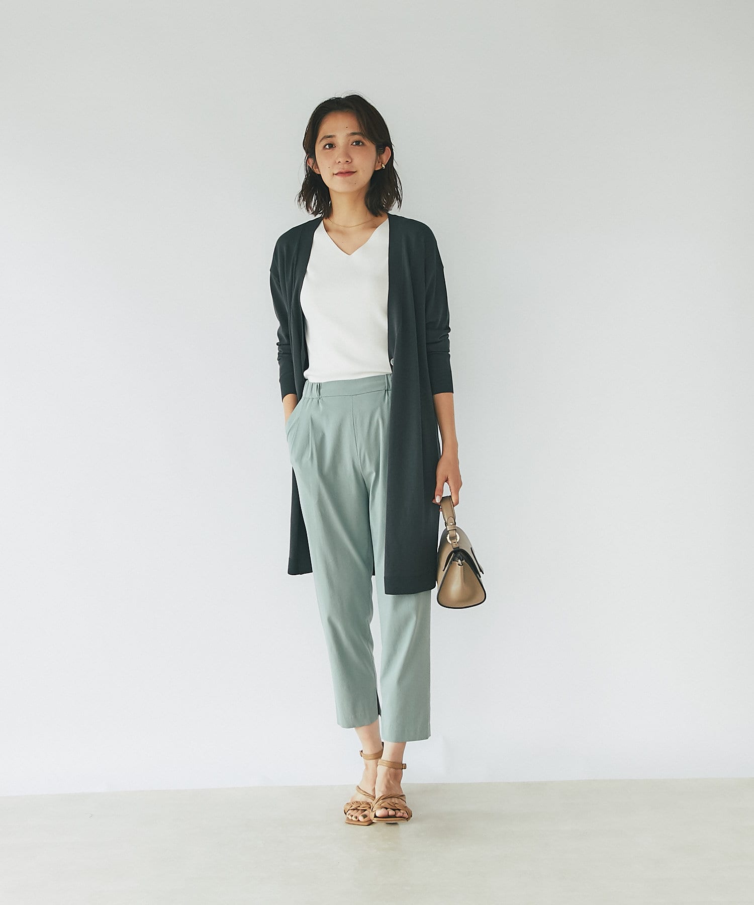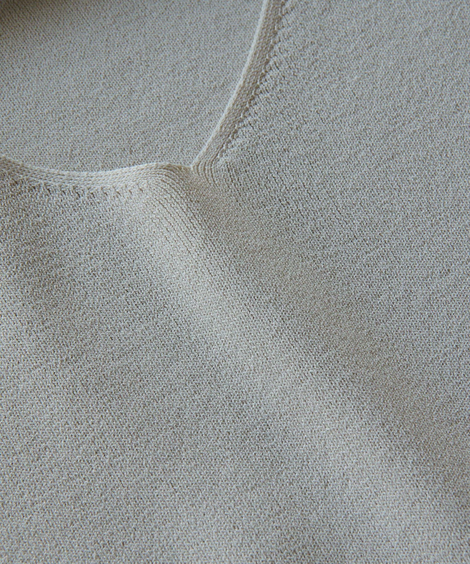 ひんやりタッチでUV効果があり、ウオッシャブル機能もついたベーシックニットは色違いで揃えたくなるアイテムです。Vネックでデコルテが綺麗にみえて、スッキリと着ていただけます。