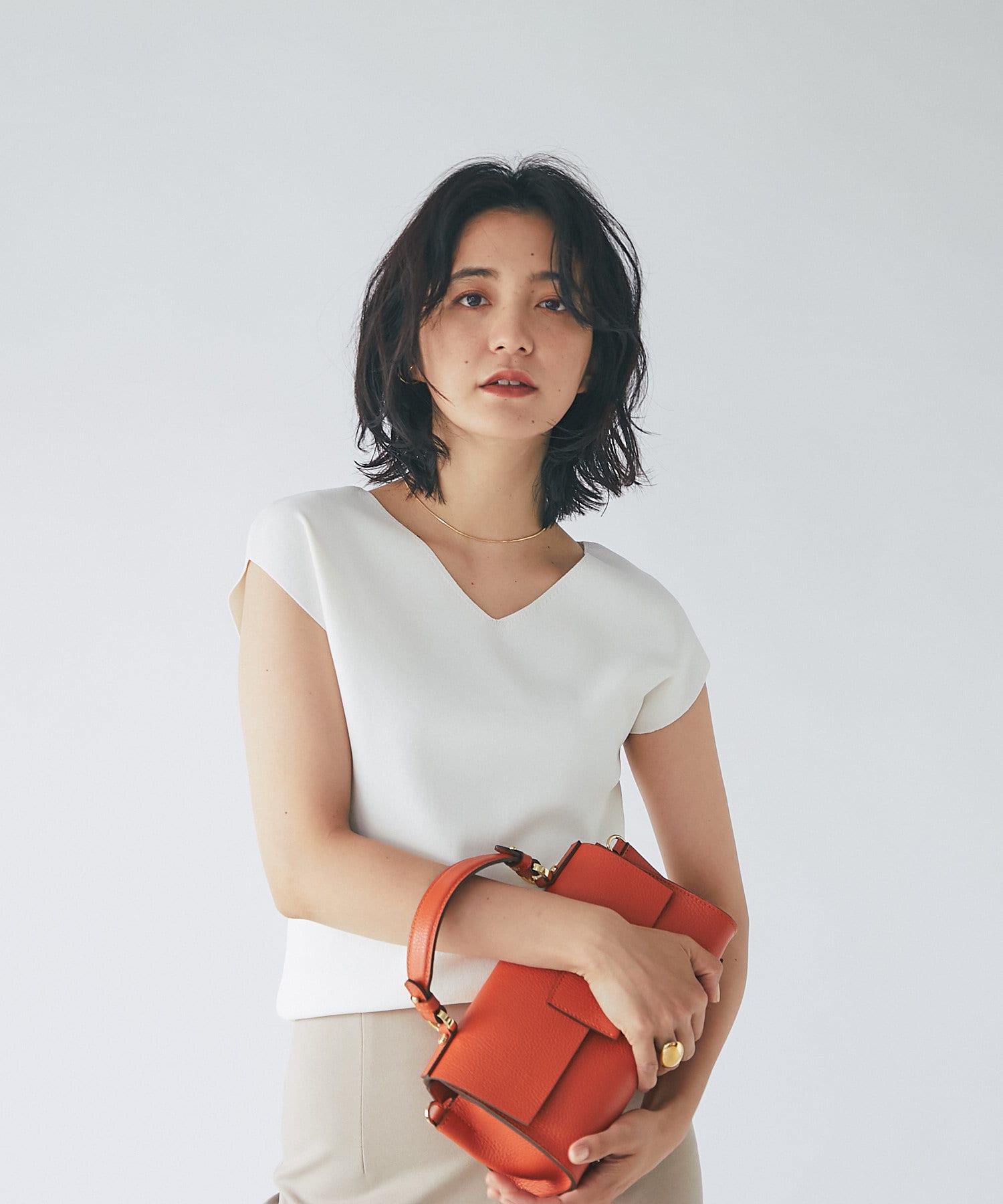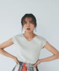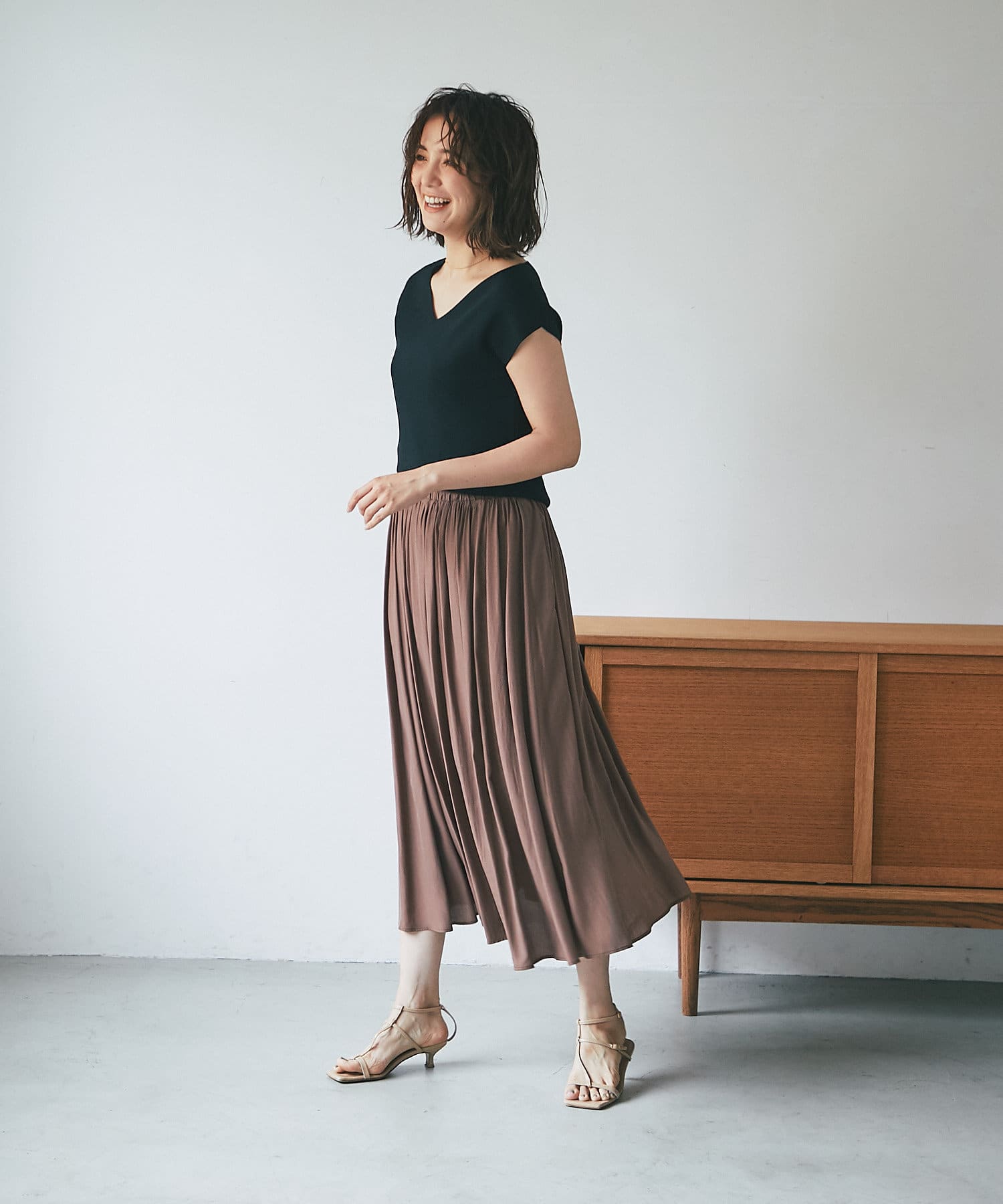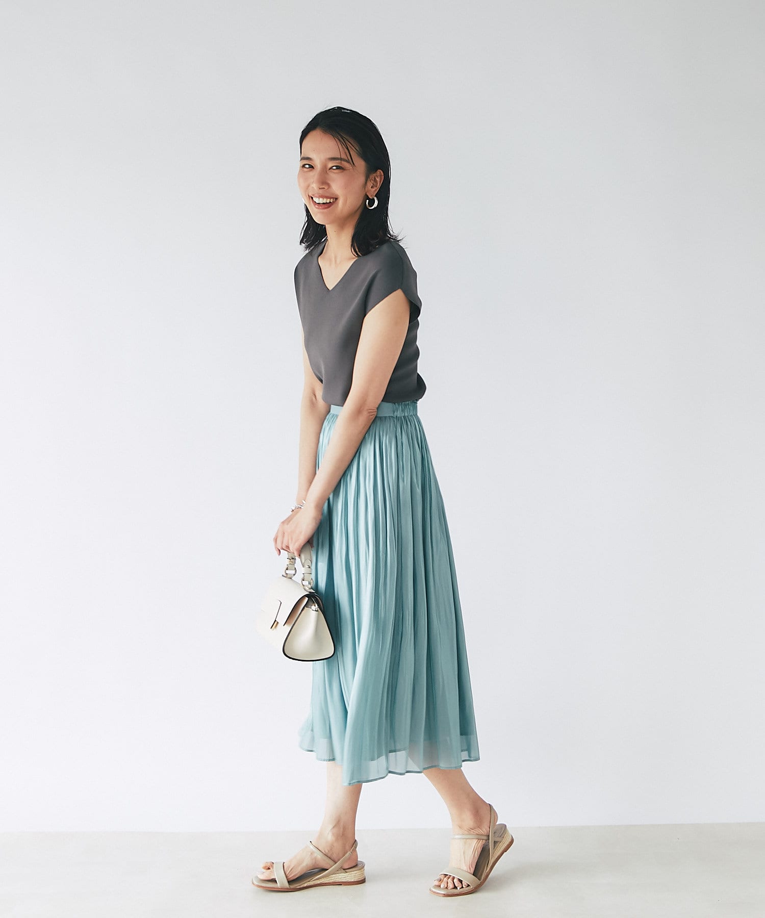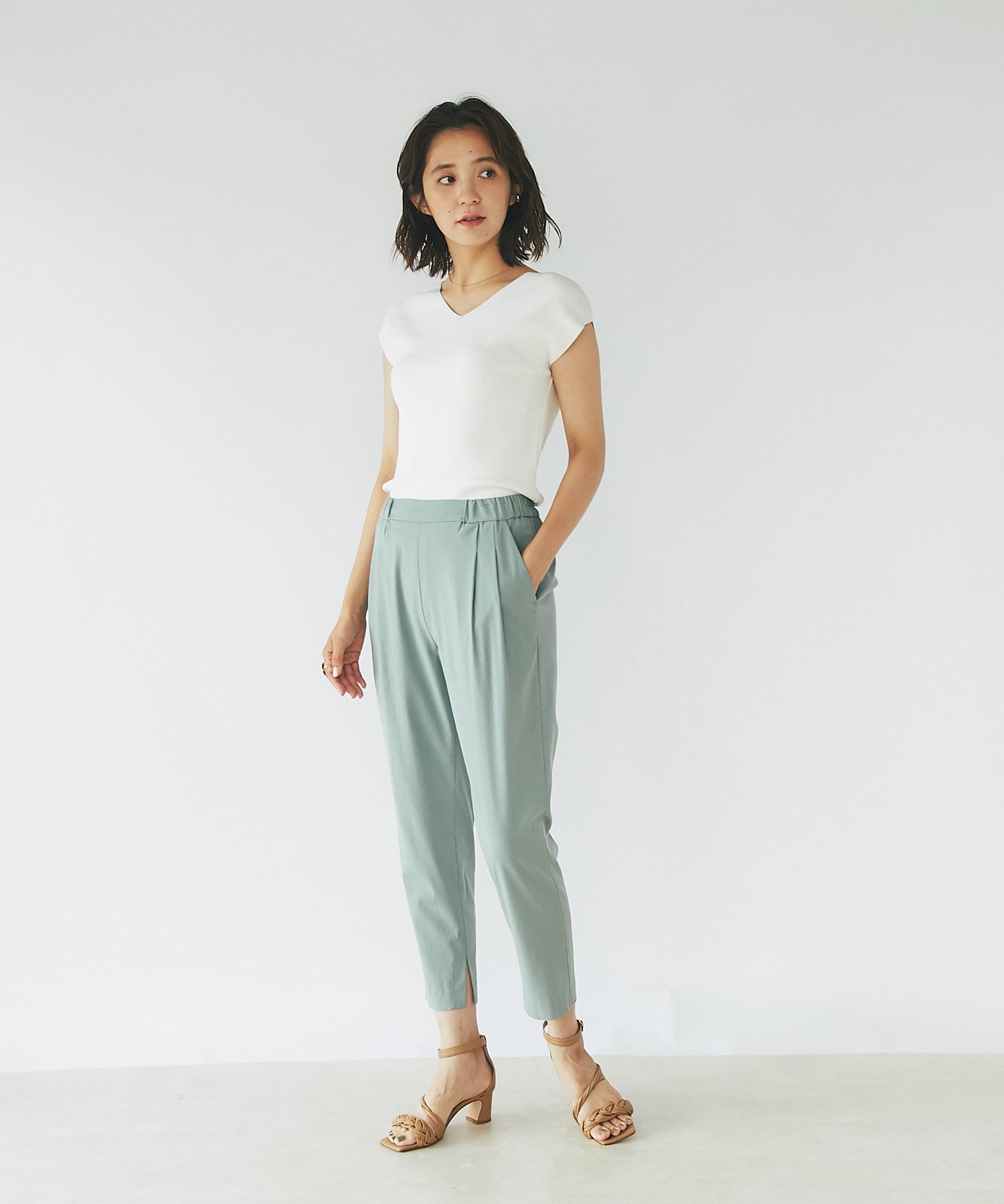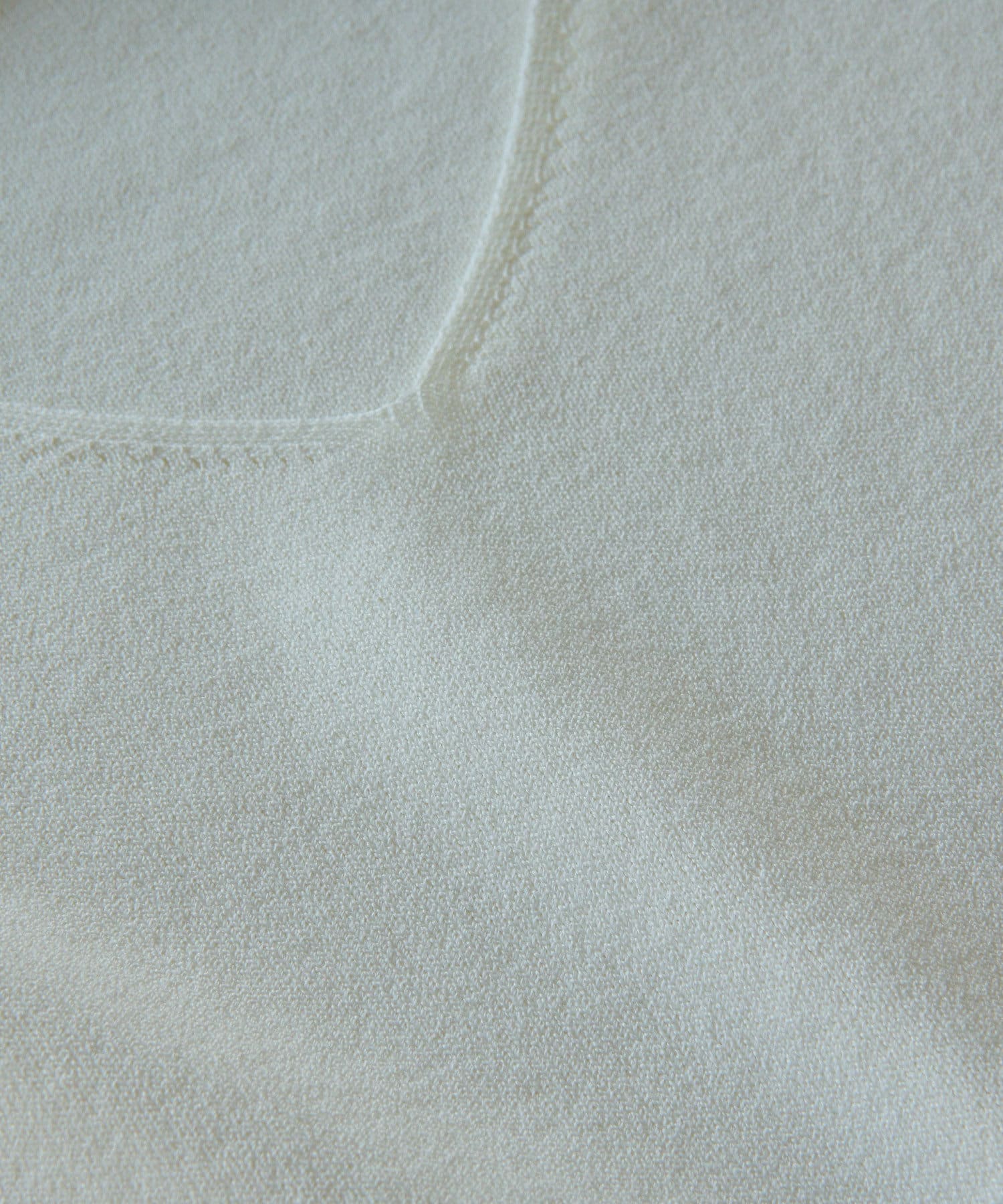 ひんやりタッチでUV効果があり、ウオッシャブル機能もついたベーシックニットは色違いで揃えたくなるアイテムです。Vネックでデコルテが綺麗にみえて、スッキリと着ていただけます。