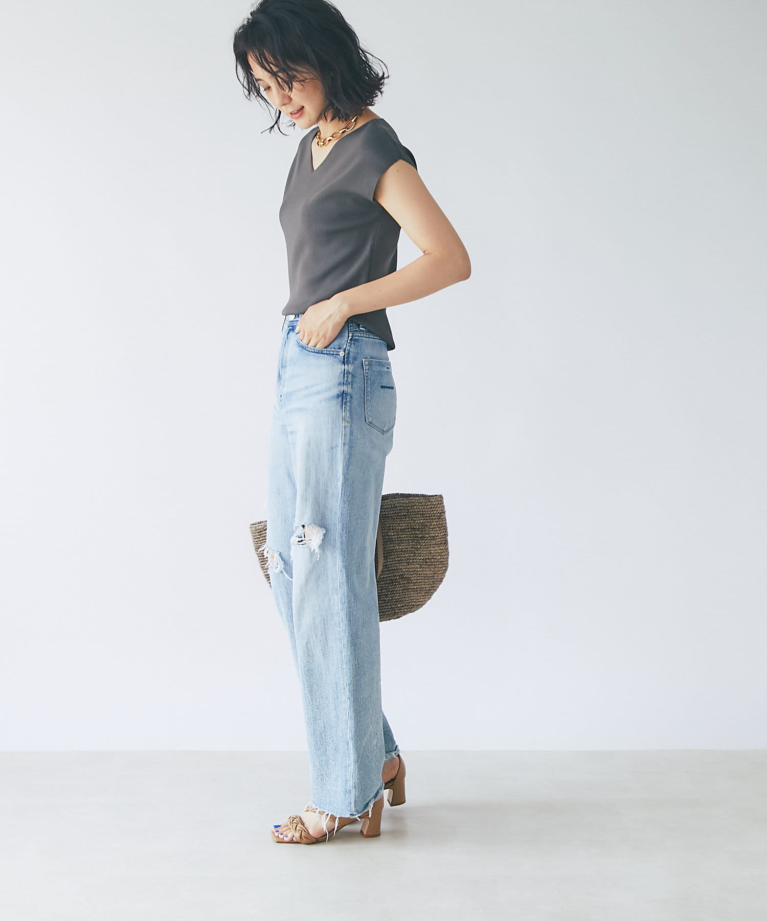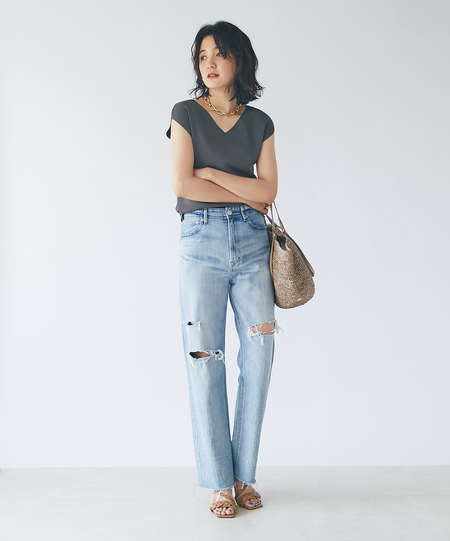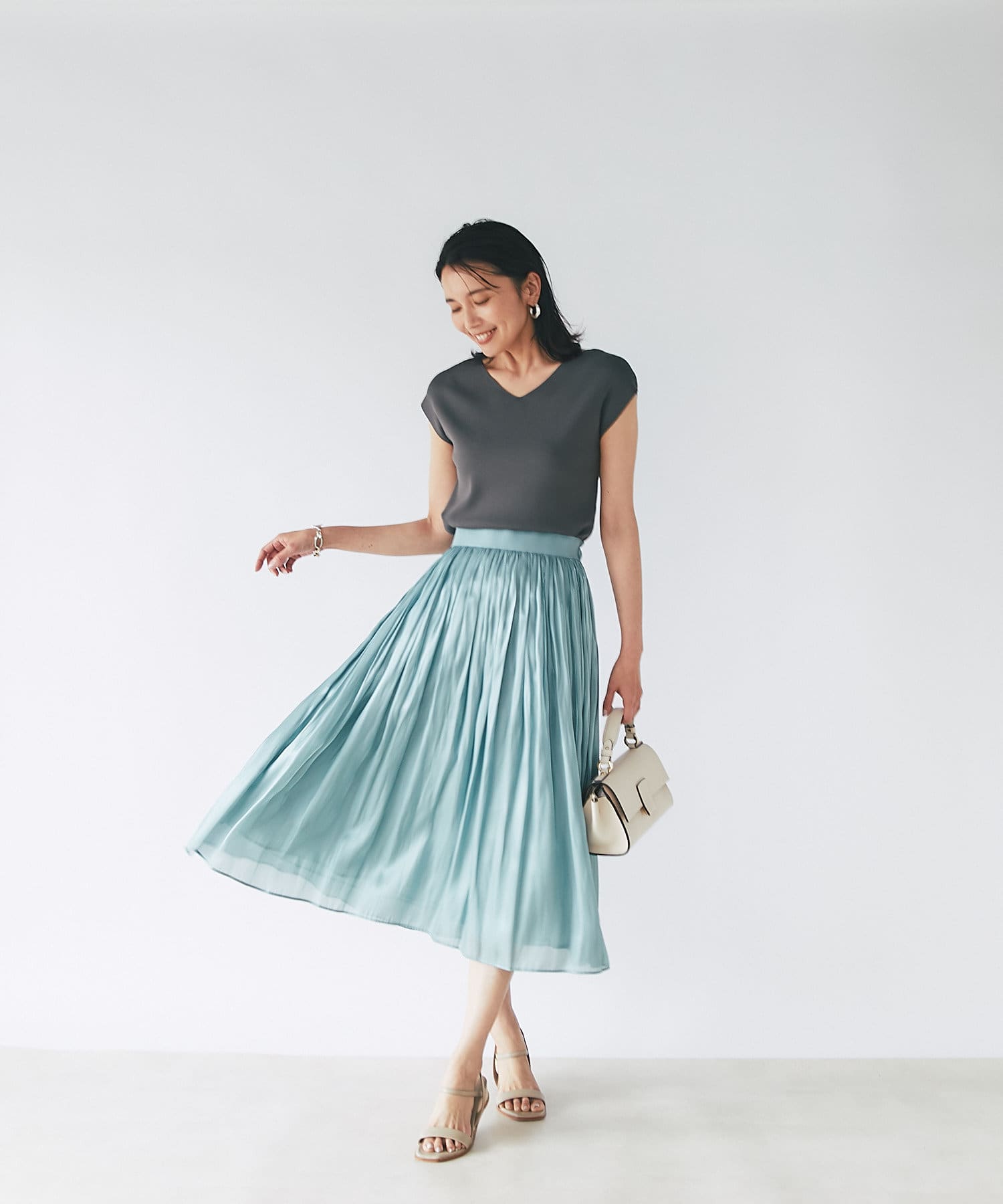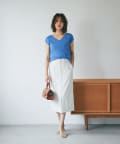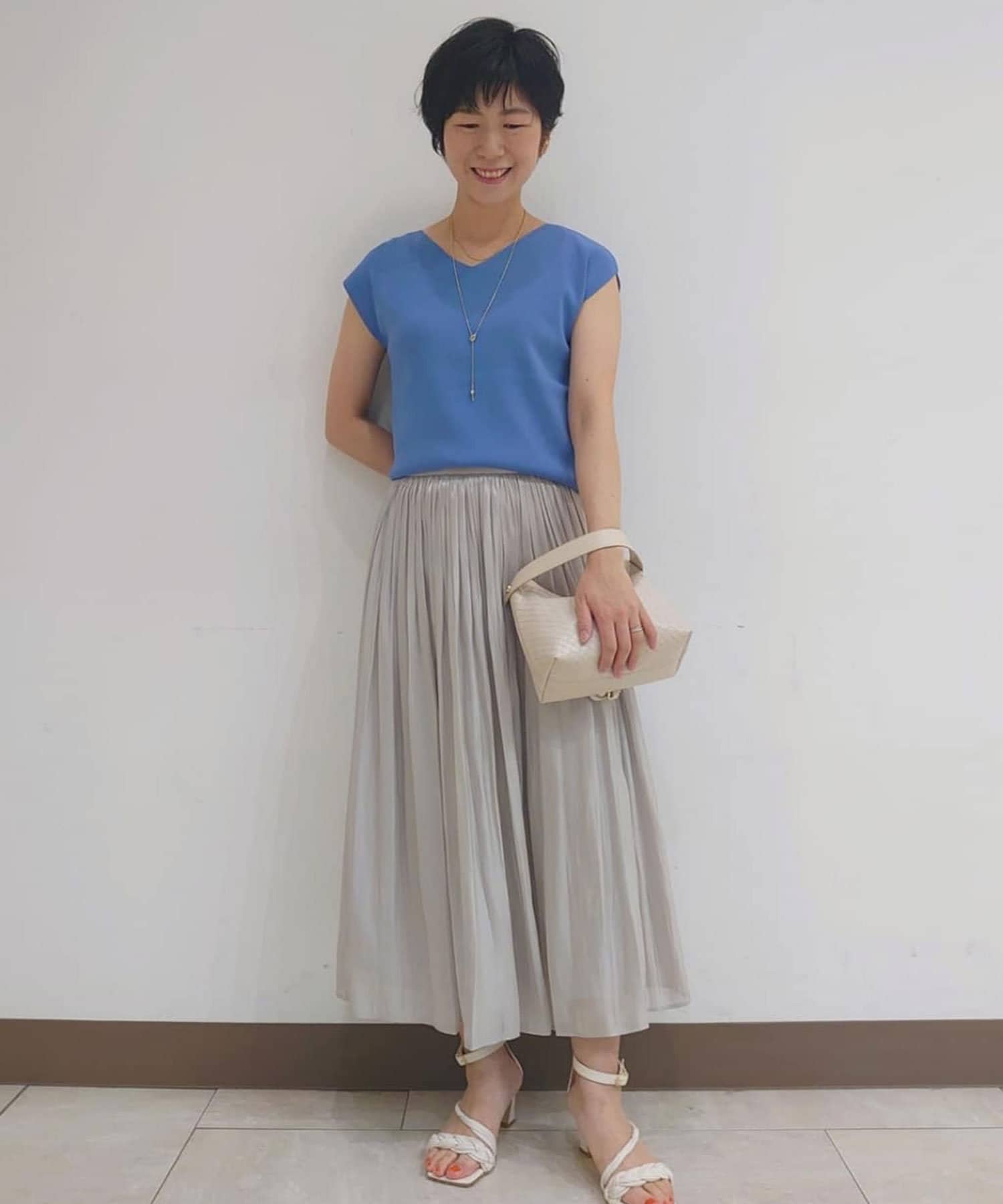ひんやりタッチでUV効果があり、ウオッシャブル機能もついたベーシックニットは色違いで揃えたくなるアイテムです。Vネックでデコルテが綺麗にみえて、スッキリと着ていただけます。