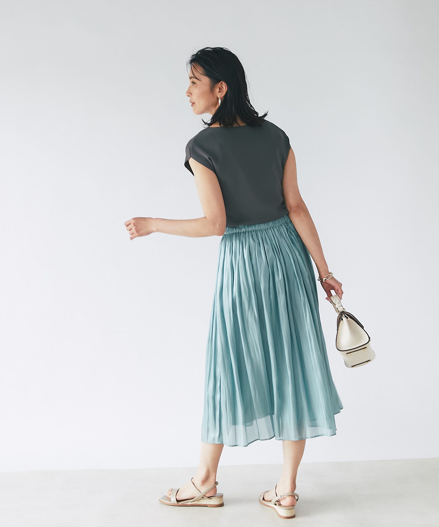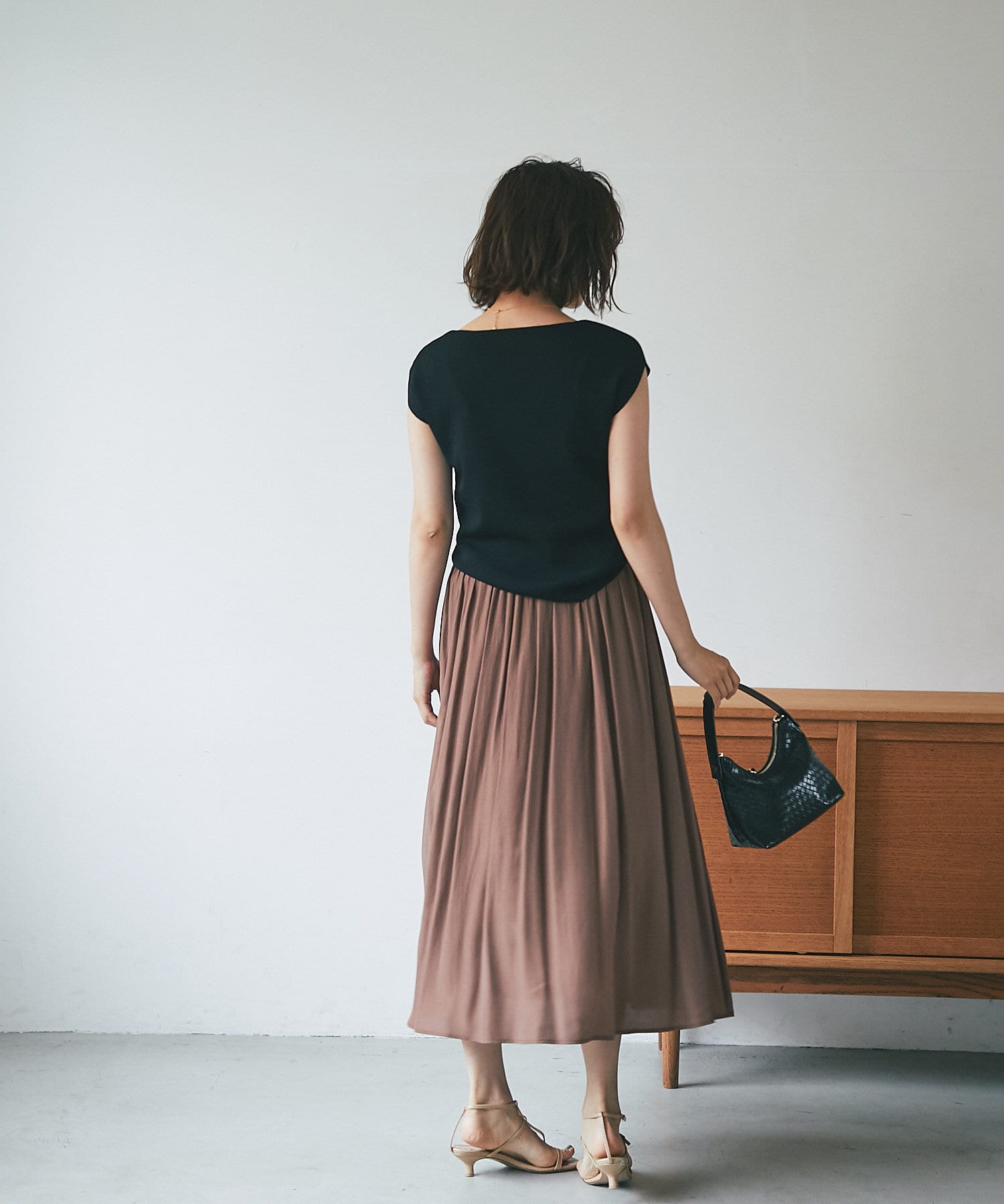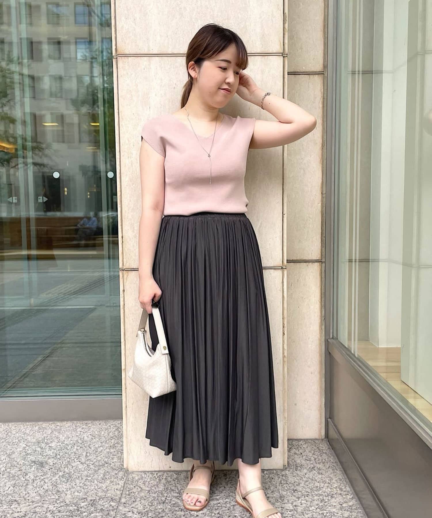 袖口が広くないため脇が見えず安心です。またミドル丈なのでインでもアウトでも着用しやすいです。飽きのこないシンプルなデザインは定番ニットとして持っておきたい一枚です。