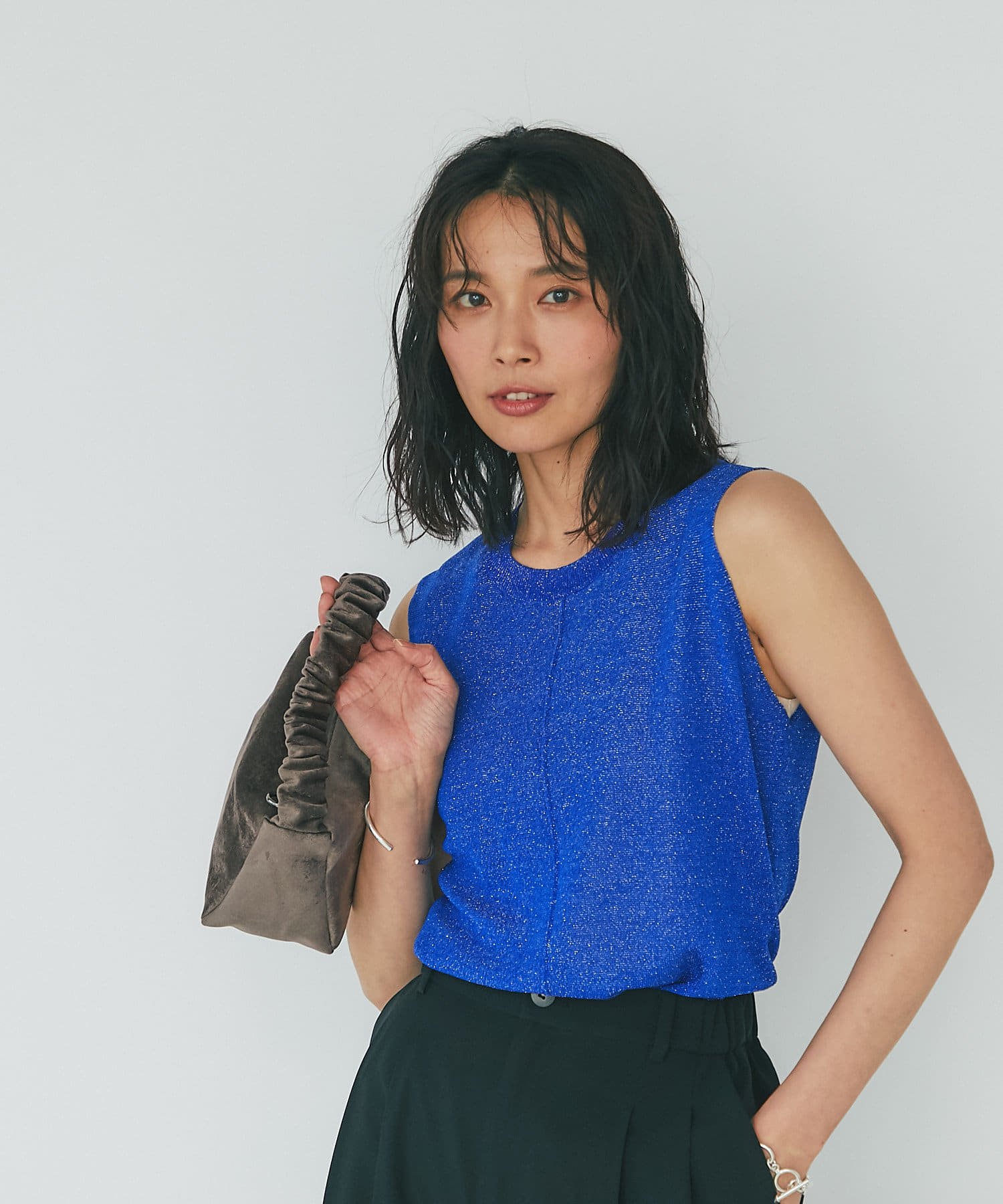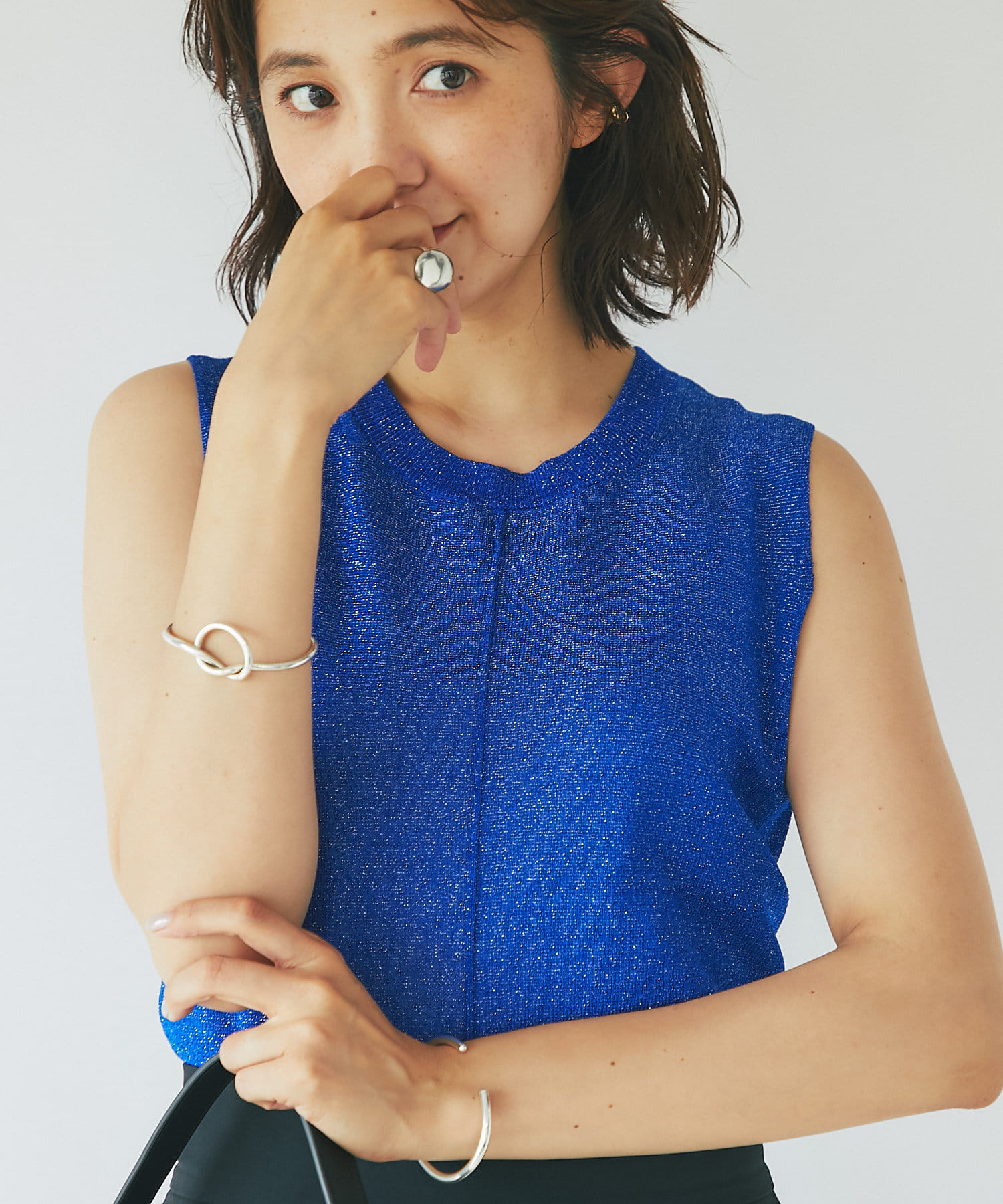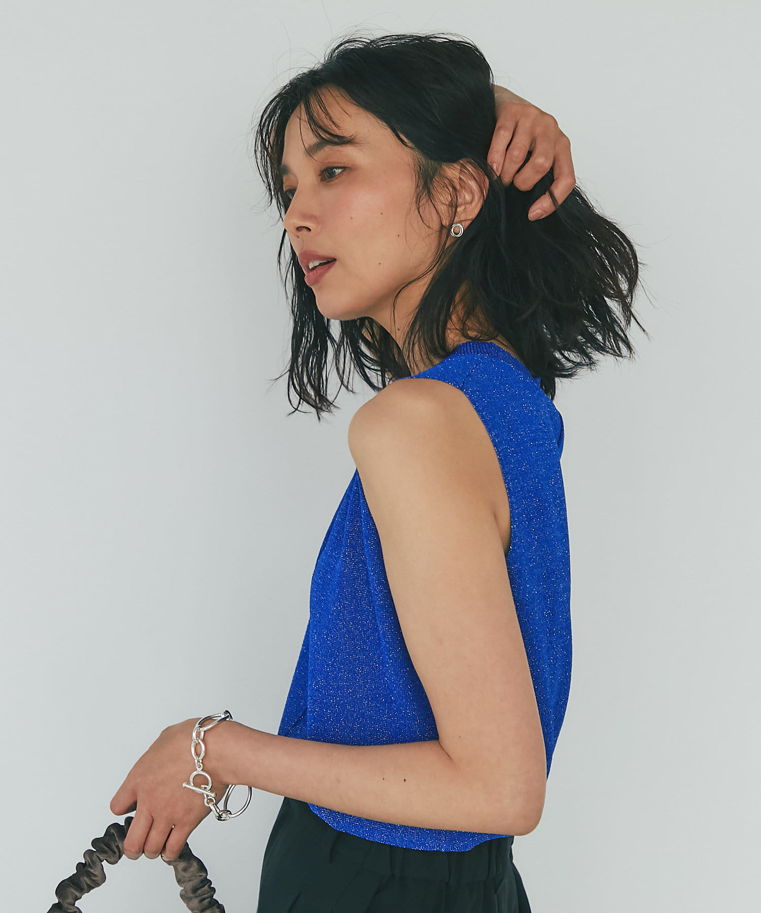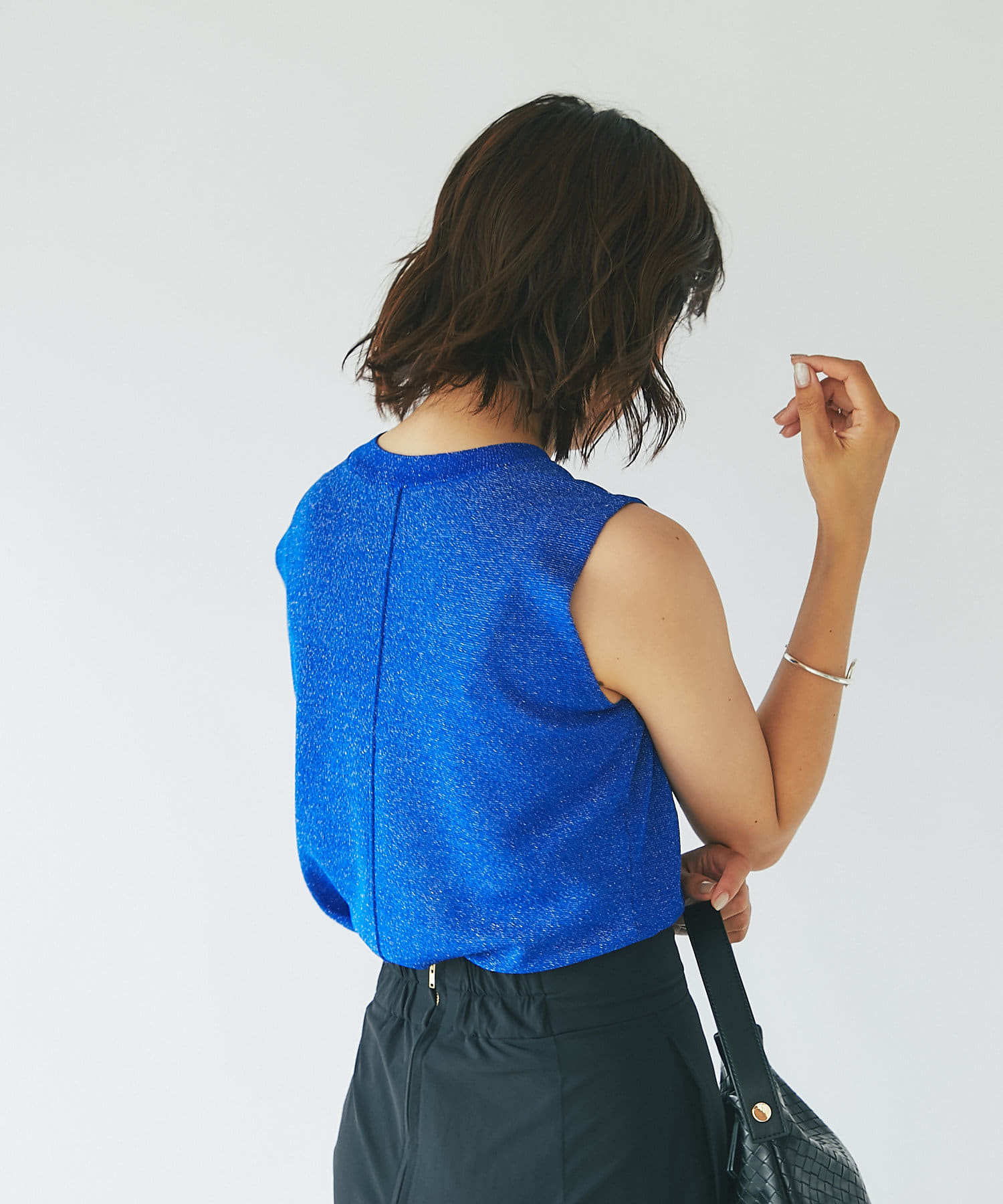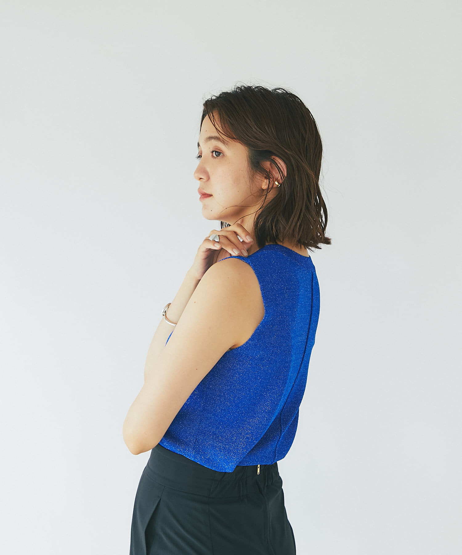 コンパクトなシルエットとスッキリしたノースリーブでモード感があるラメニット。