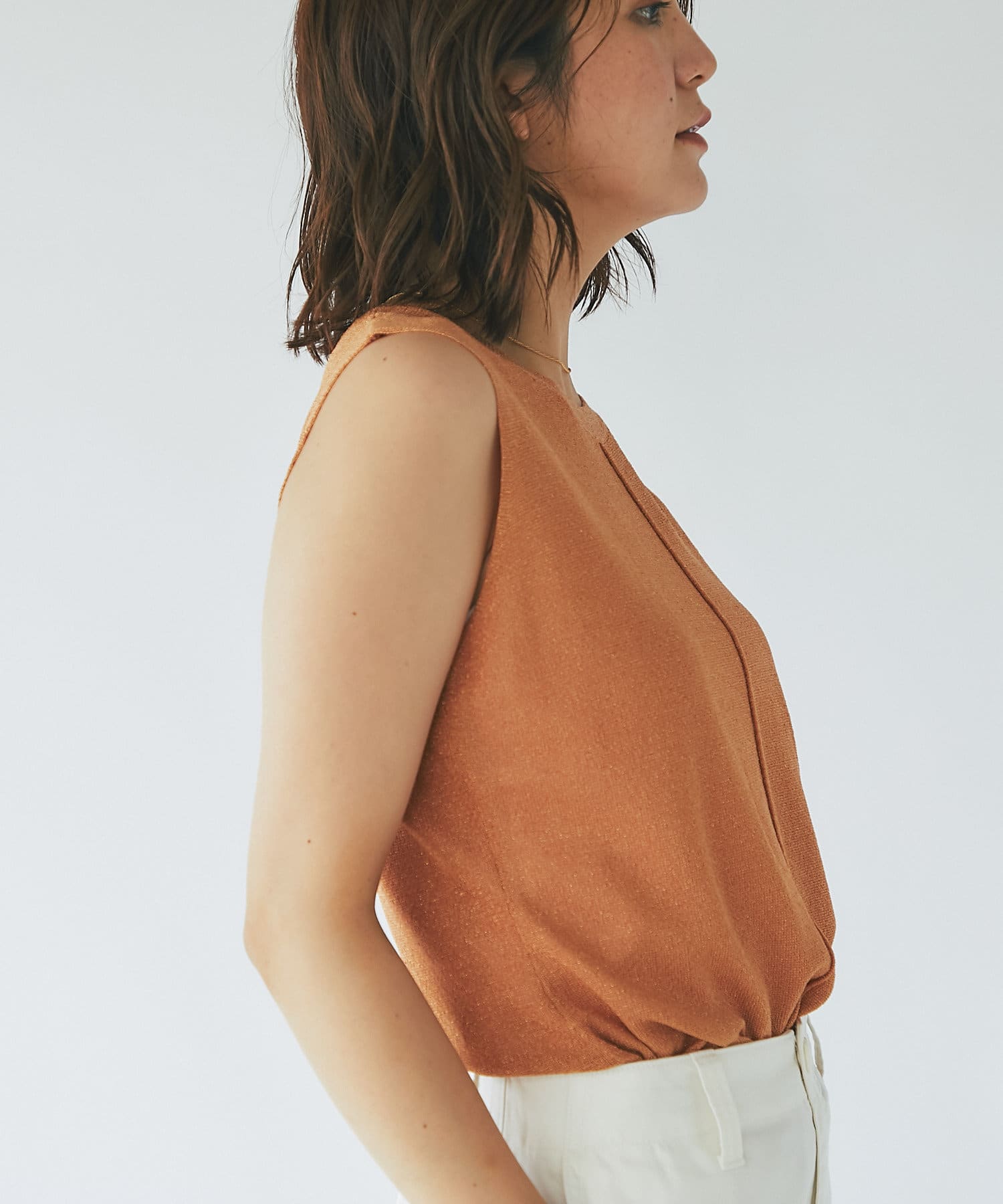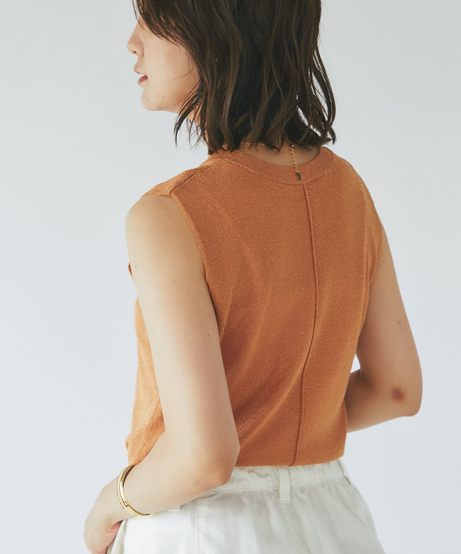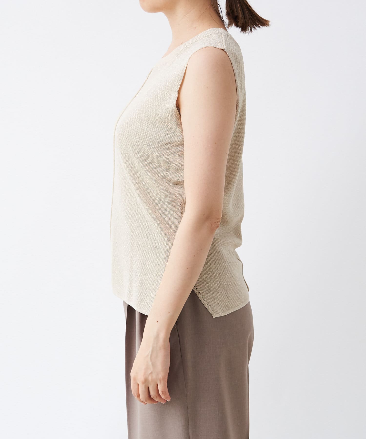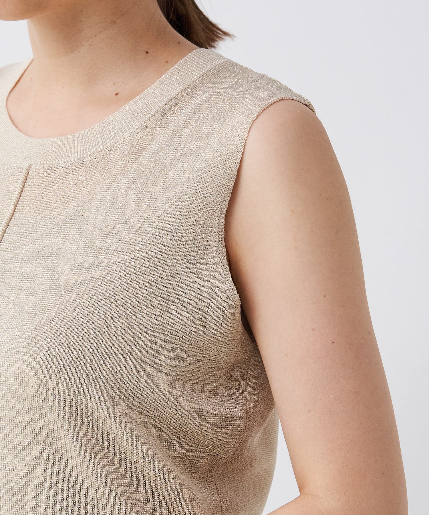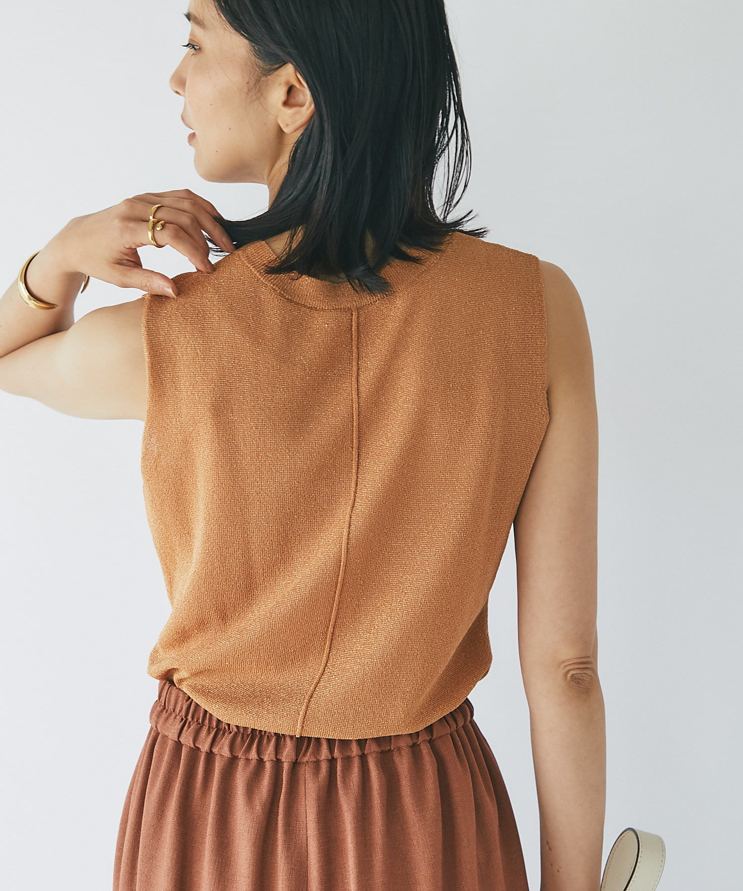 コンパクトなシルエットとスッキリしたノースリーブでモード感があるラメニット。