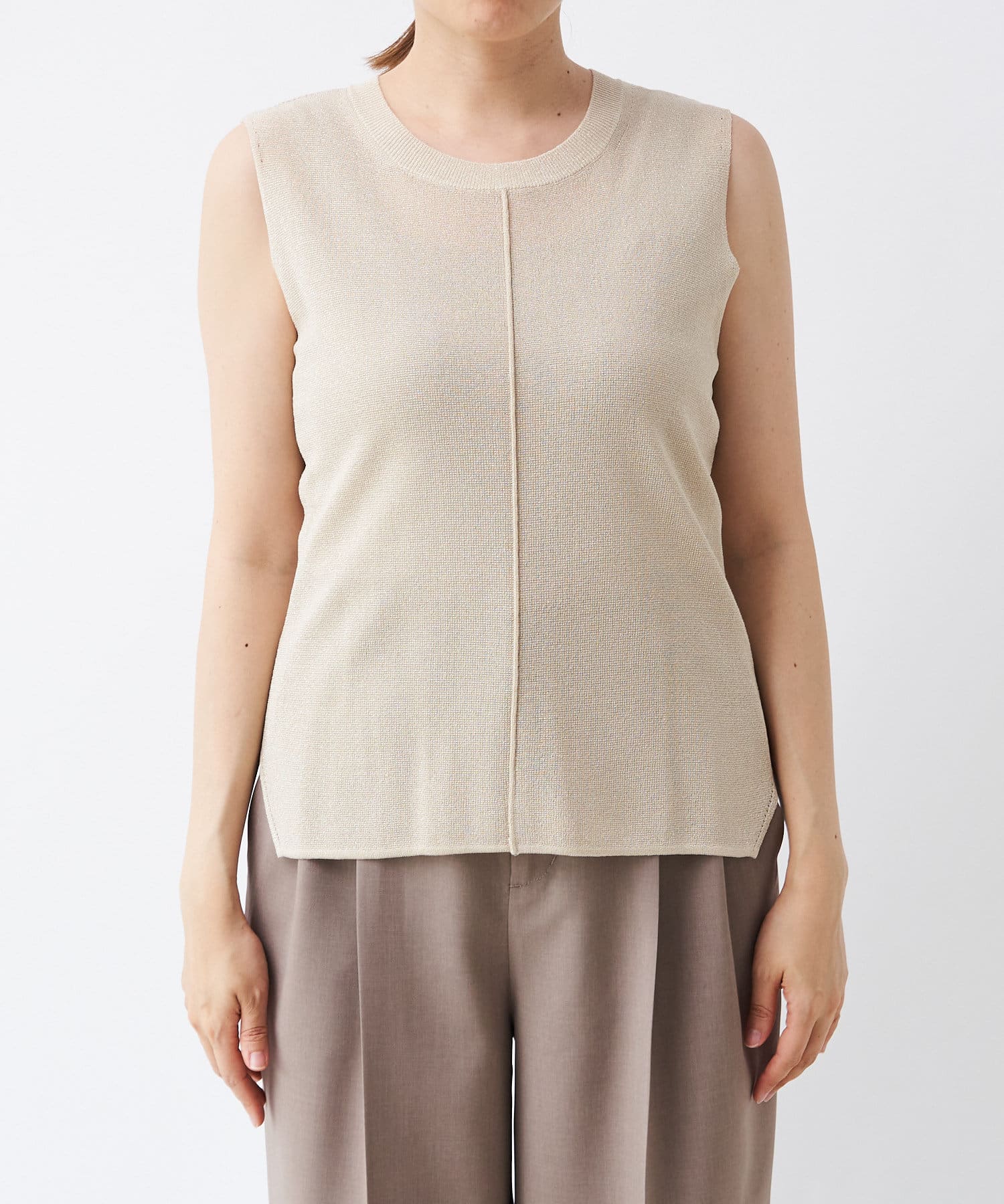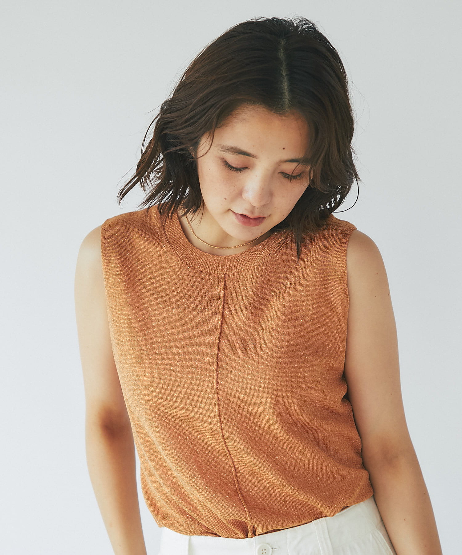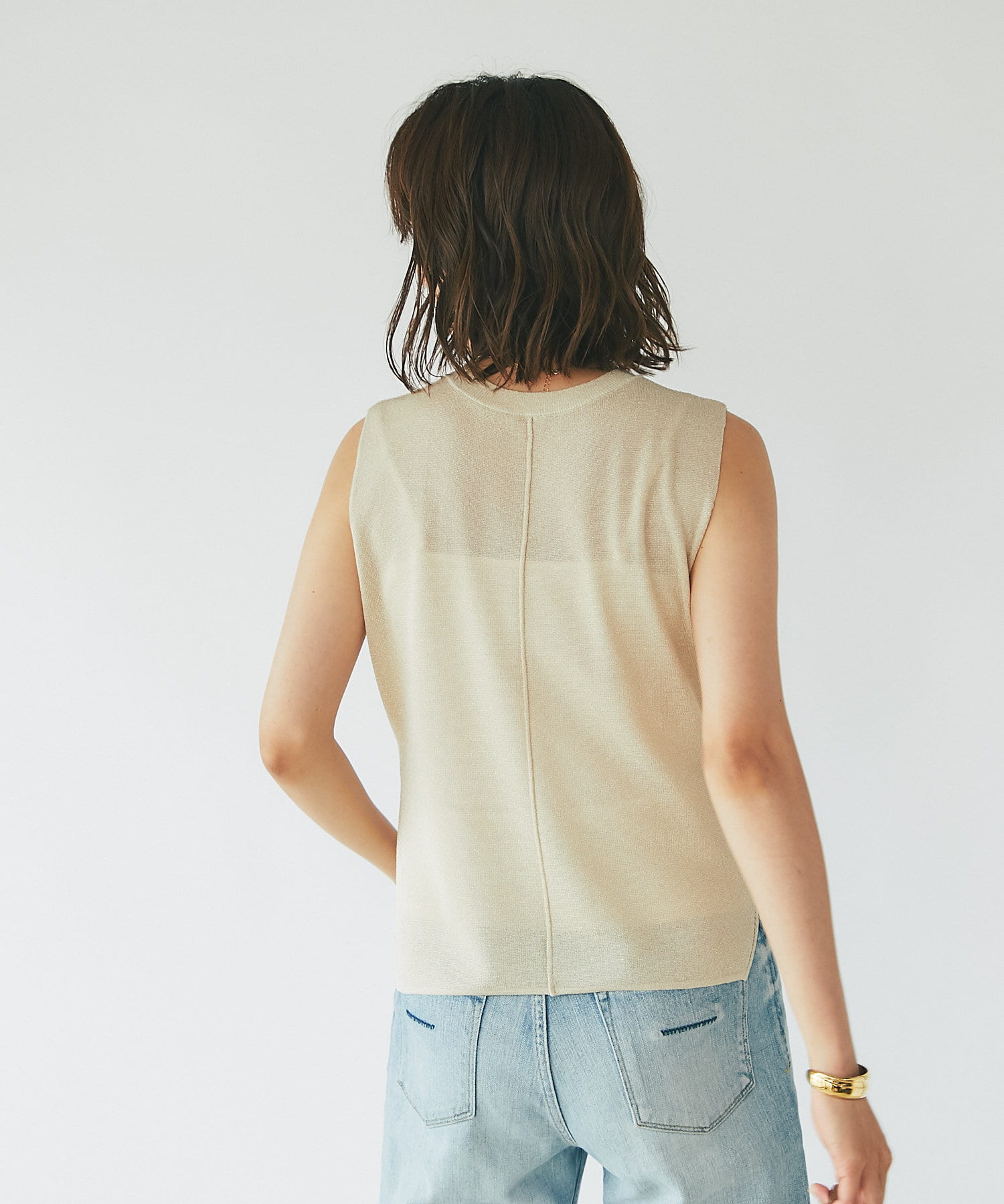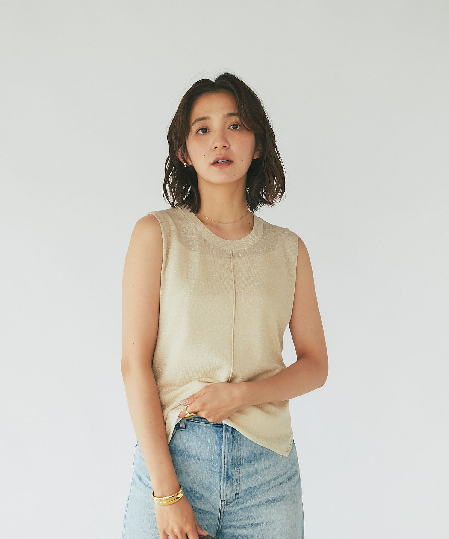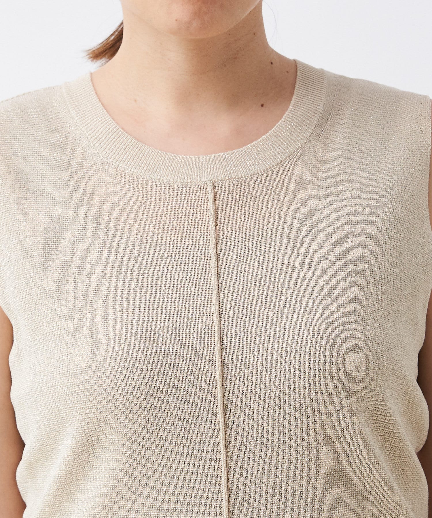 コンパクトなシルエットとスッキリしたノースリーブでモード感があるラメニット。