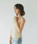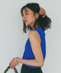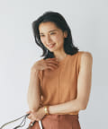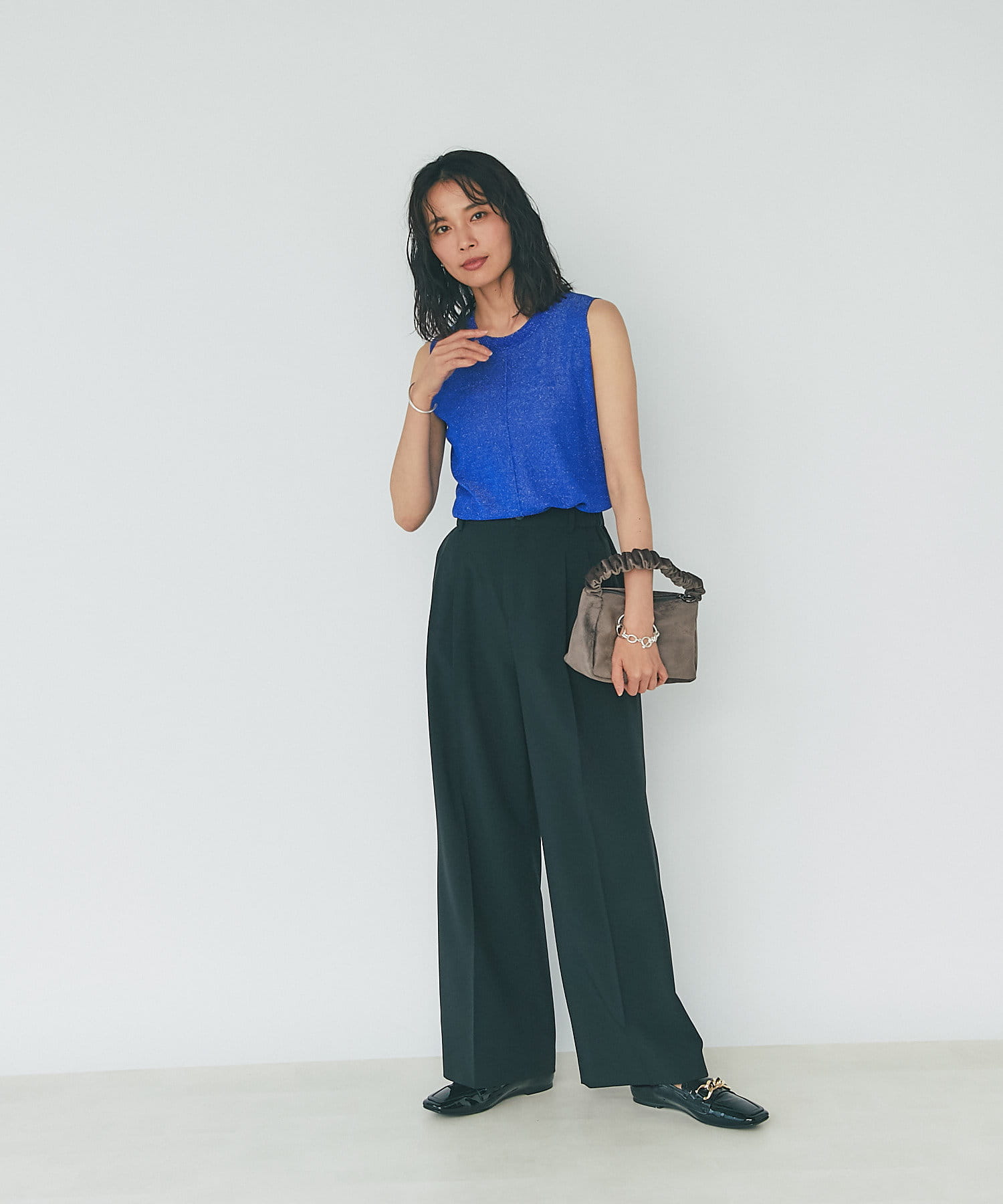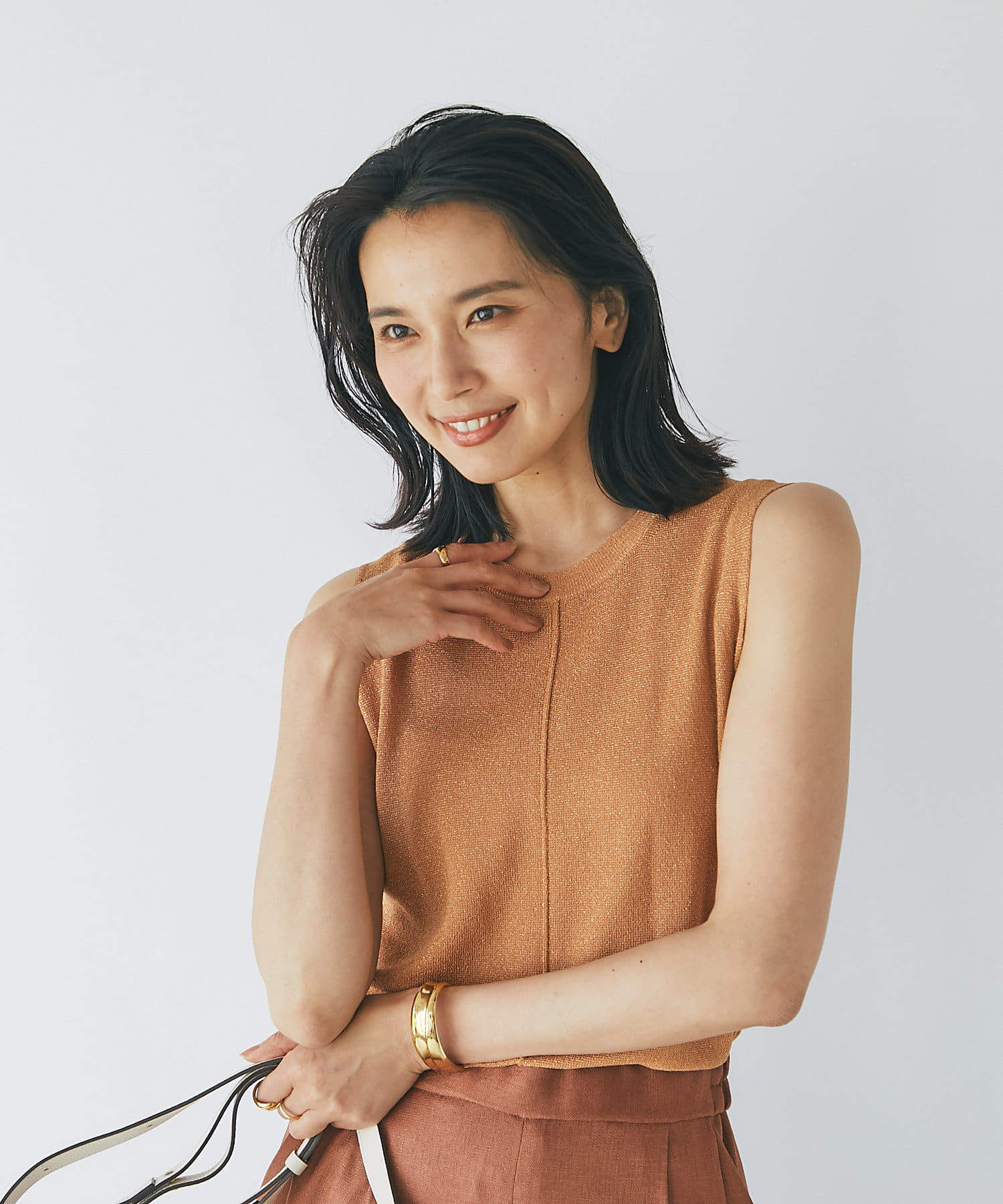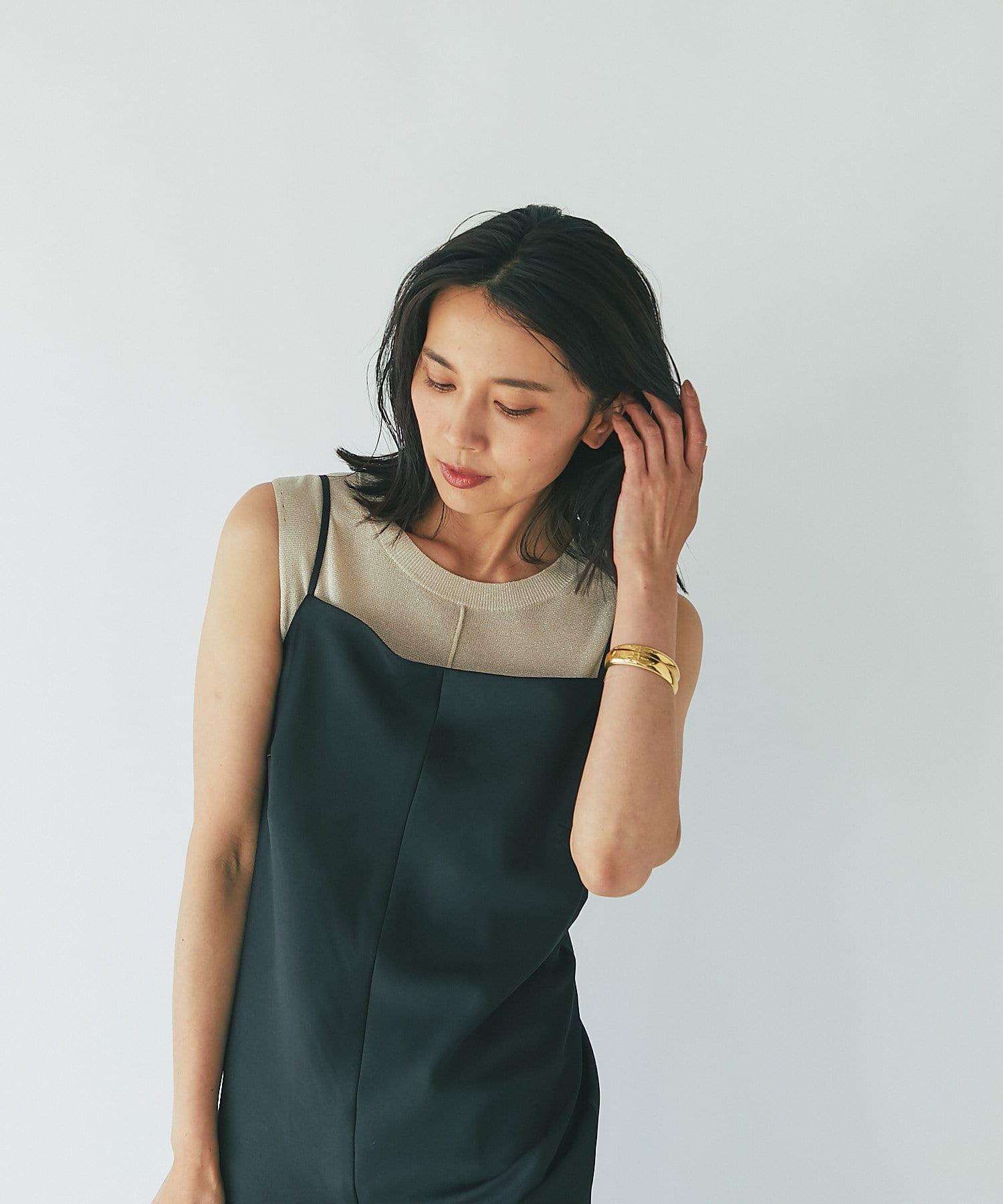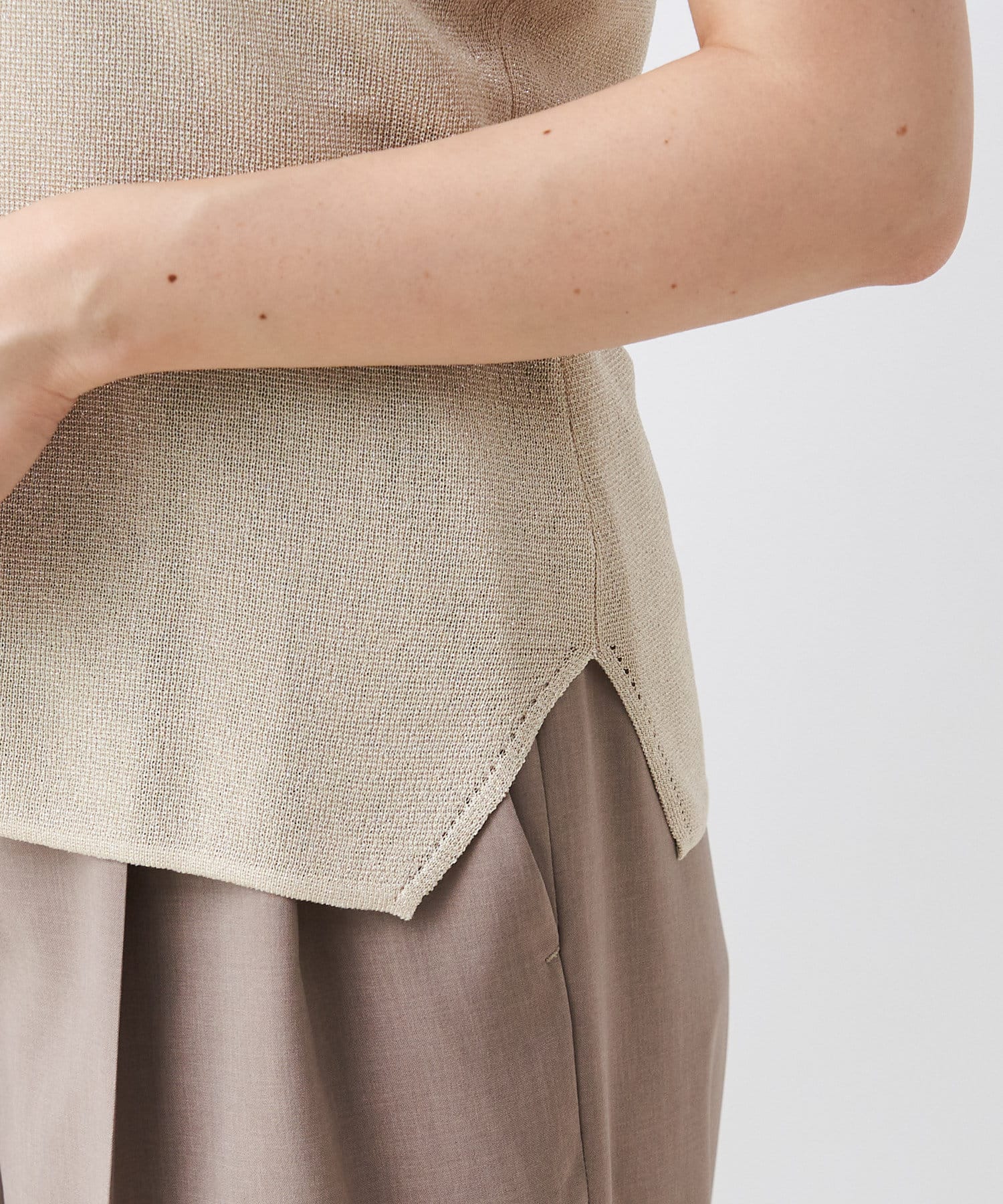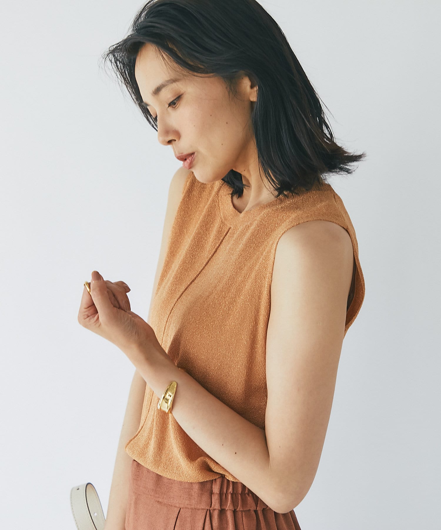 コンパクトなシルエットとスッキリしたノースリーブでモード感があるラメニット。