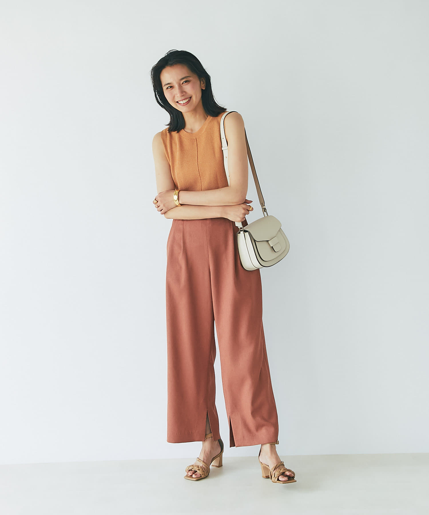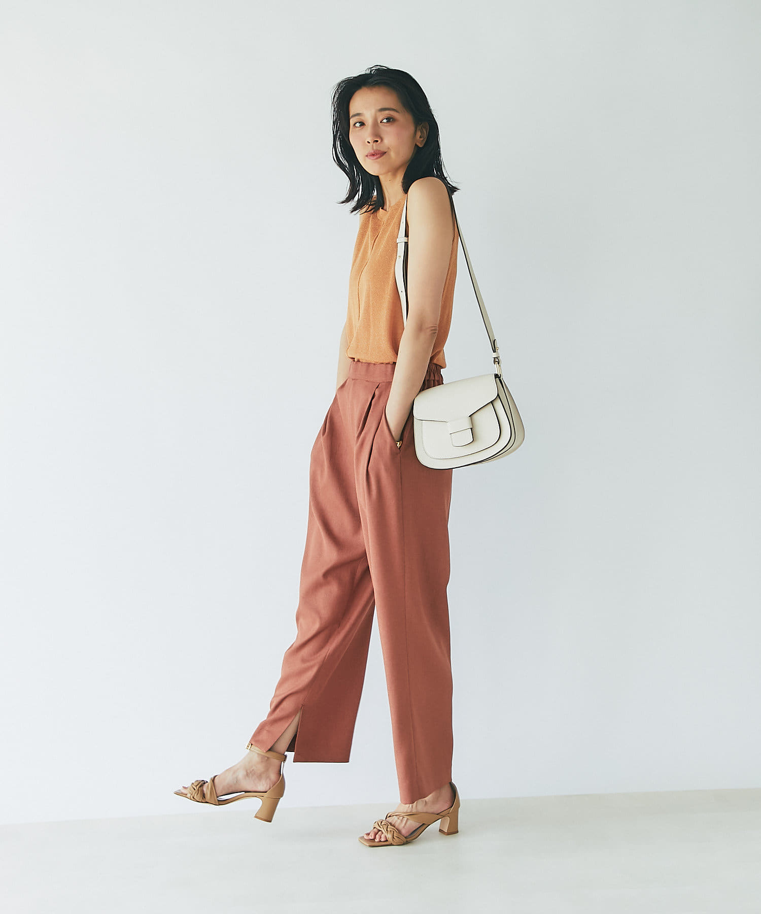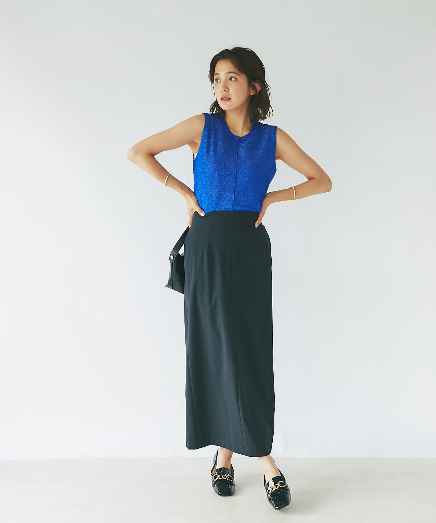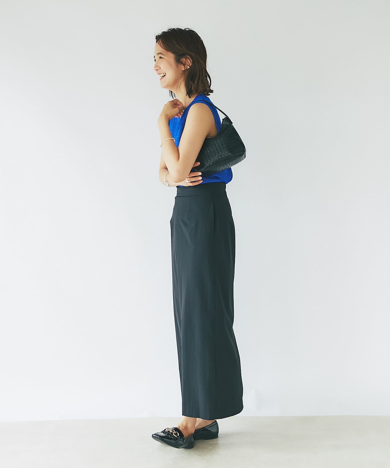 キレイめなスタイリングには上品さのあるタイトスカートで合わせて、程よく女性らしさをプラス。