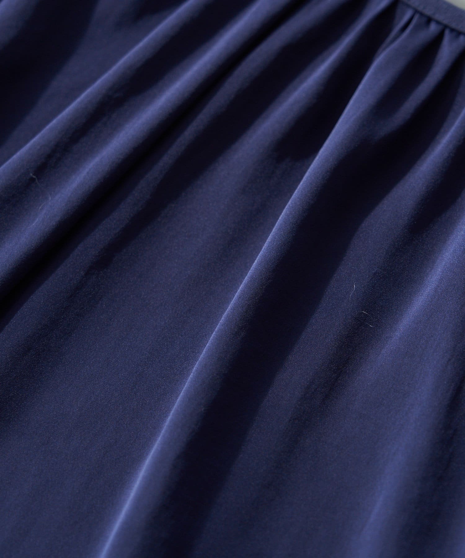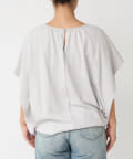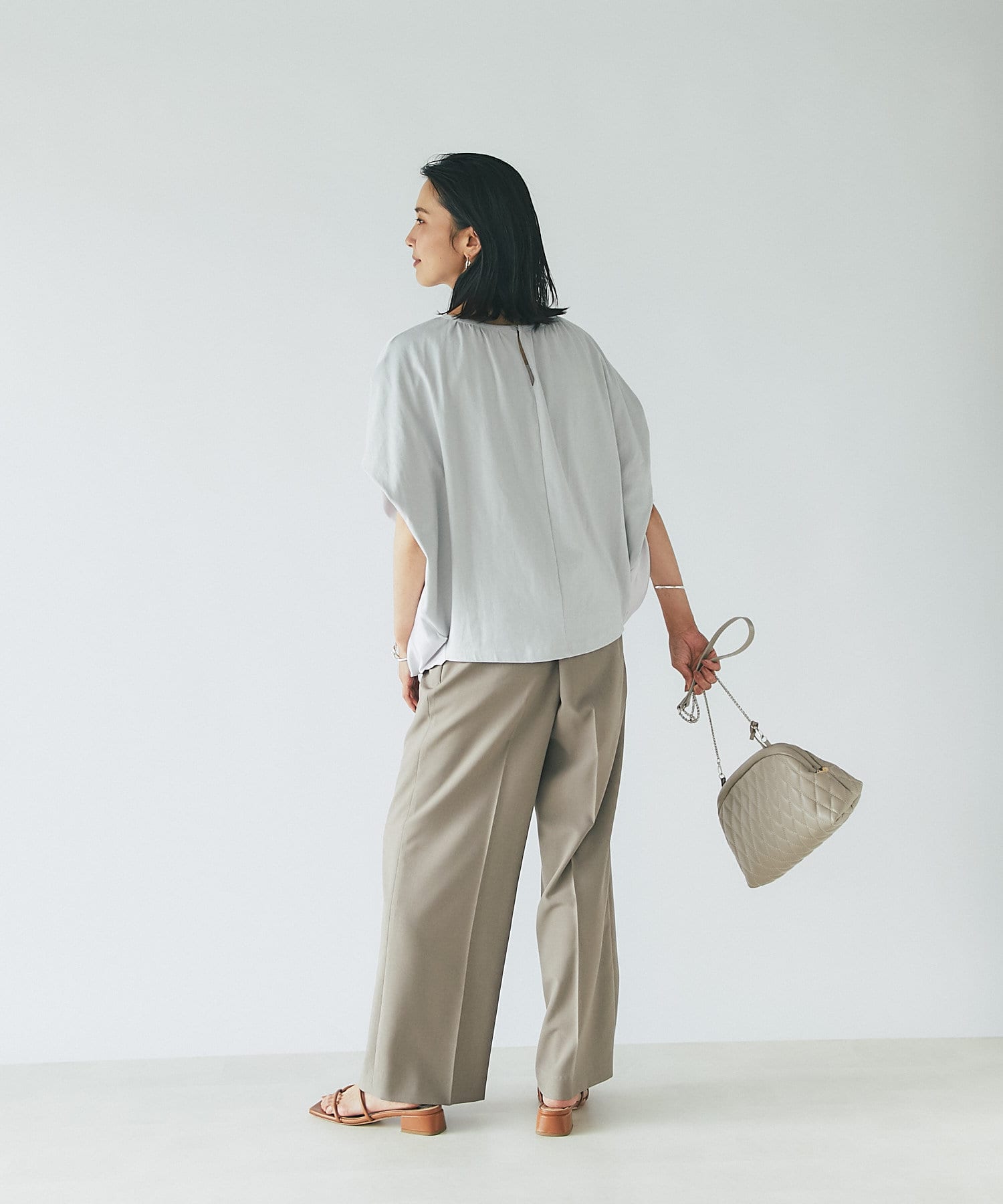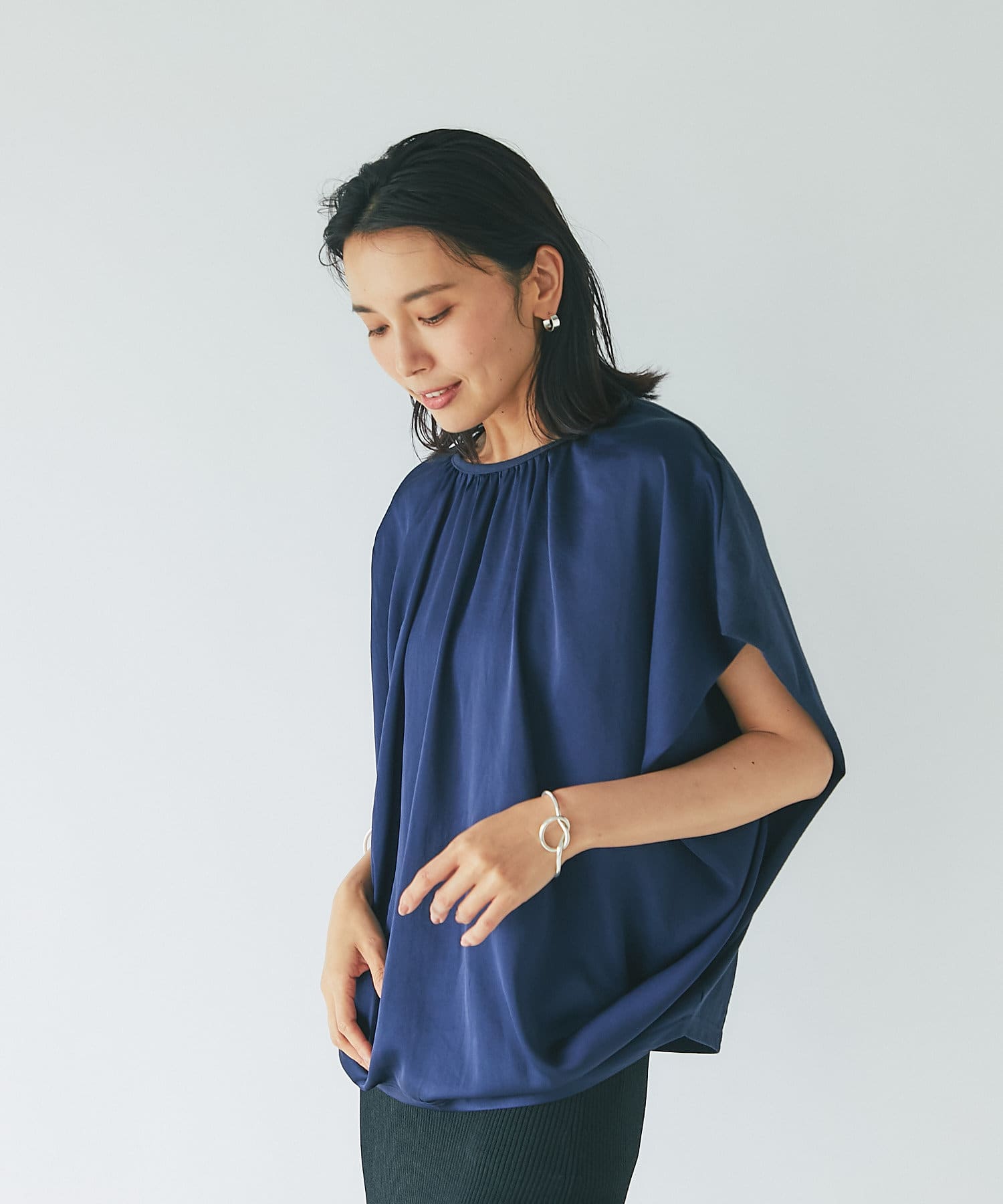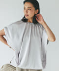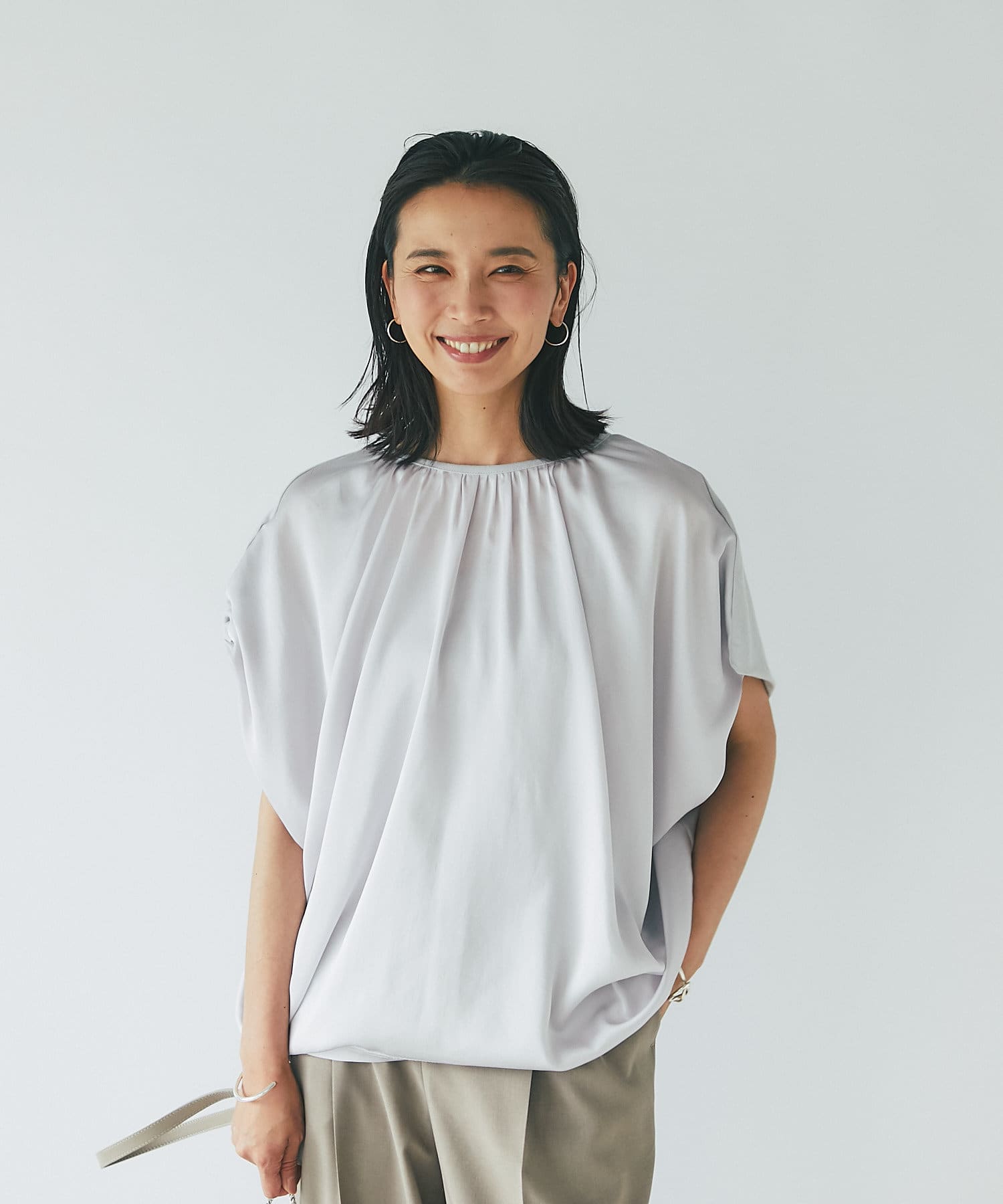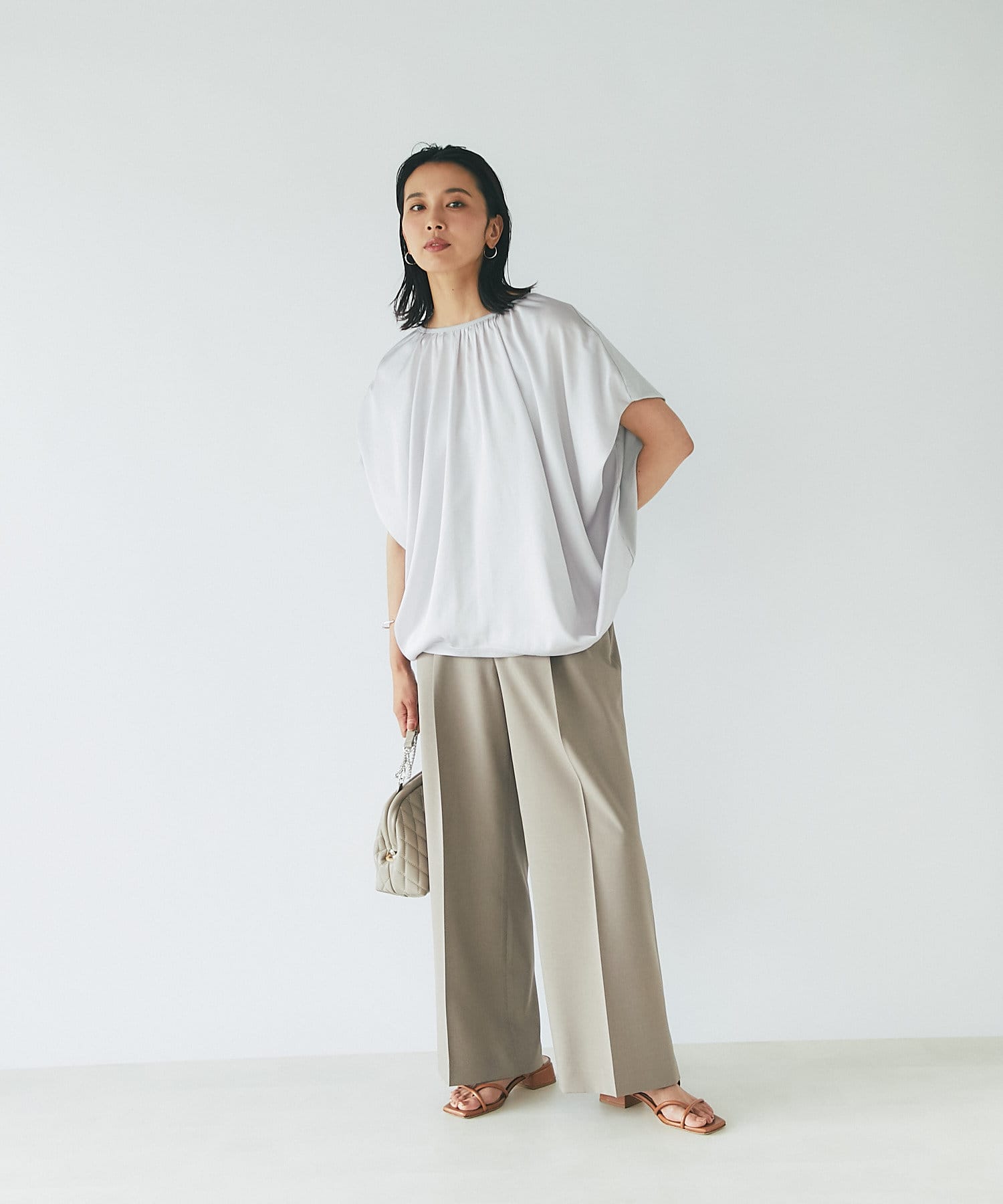 首元のギャザーが華やかさをプラスしてくれるのでレディライクなスタイリングにも相性◎