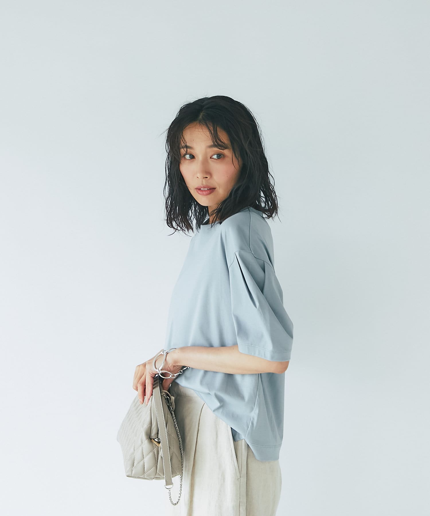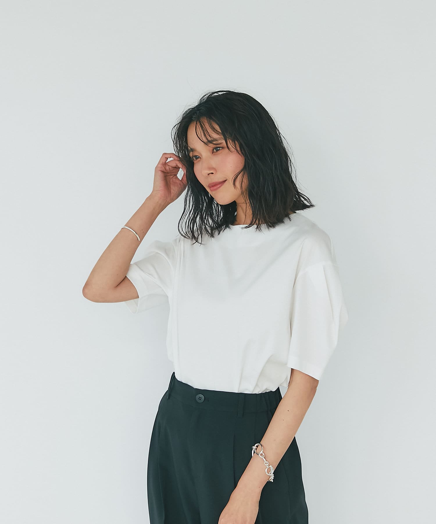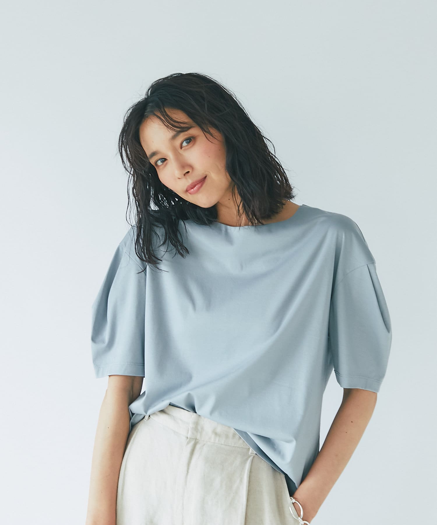 【袖のボリューム感がアクセント】カーブタックスリーブカットソー