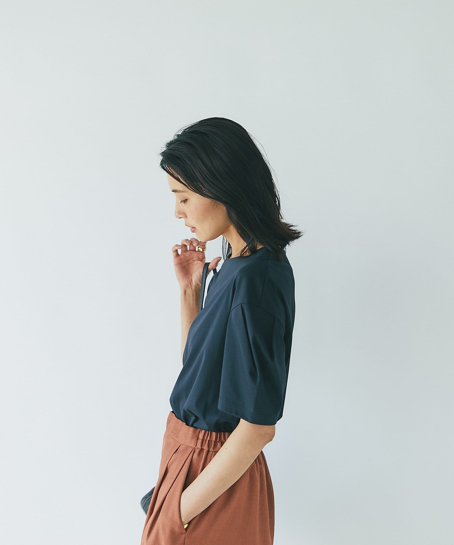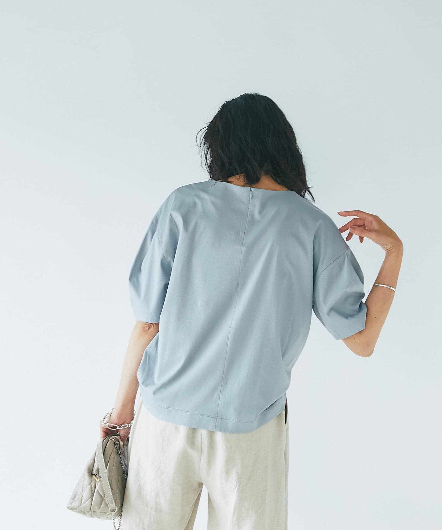 裾は少し広めのステッチ始末でアウトスタイルもブラウスライクにご着用いただけます。