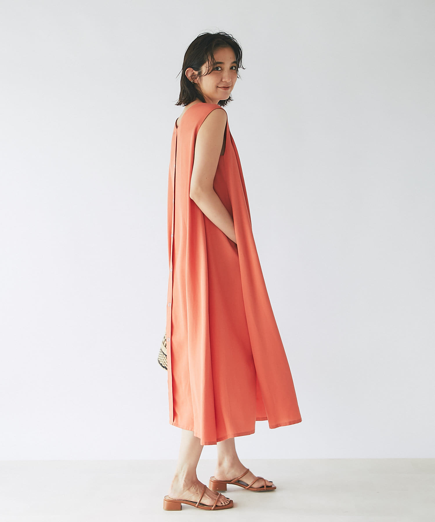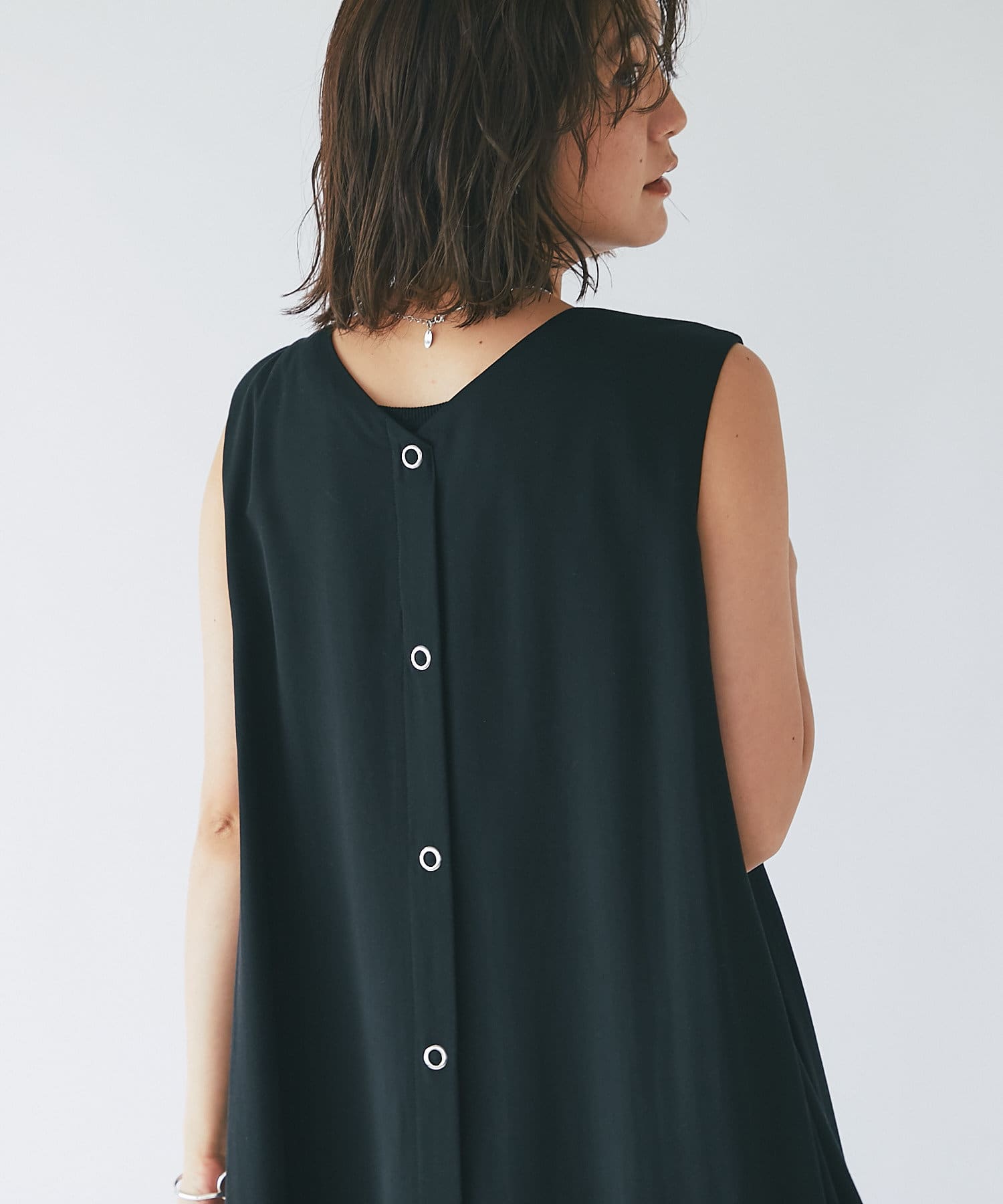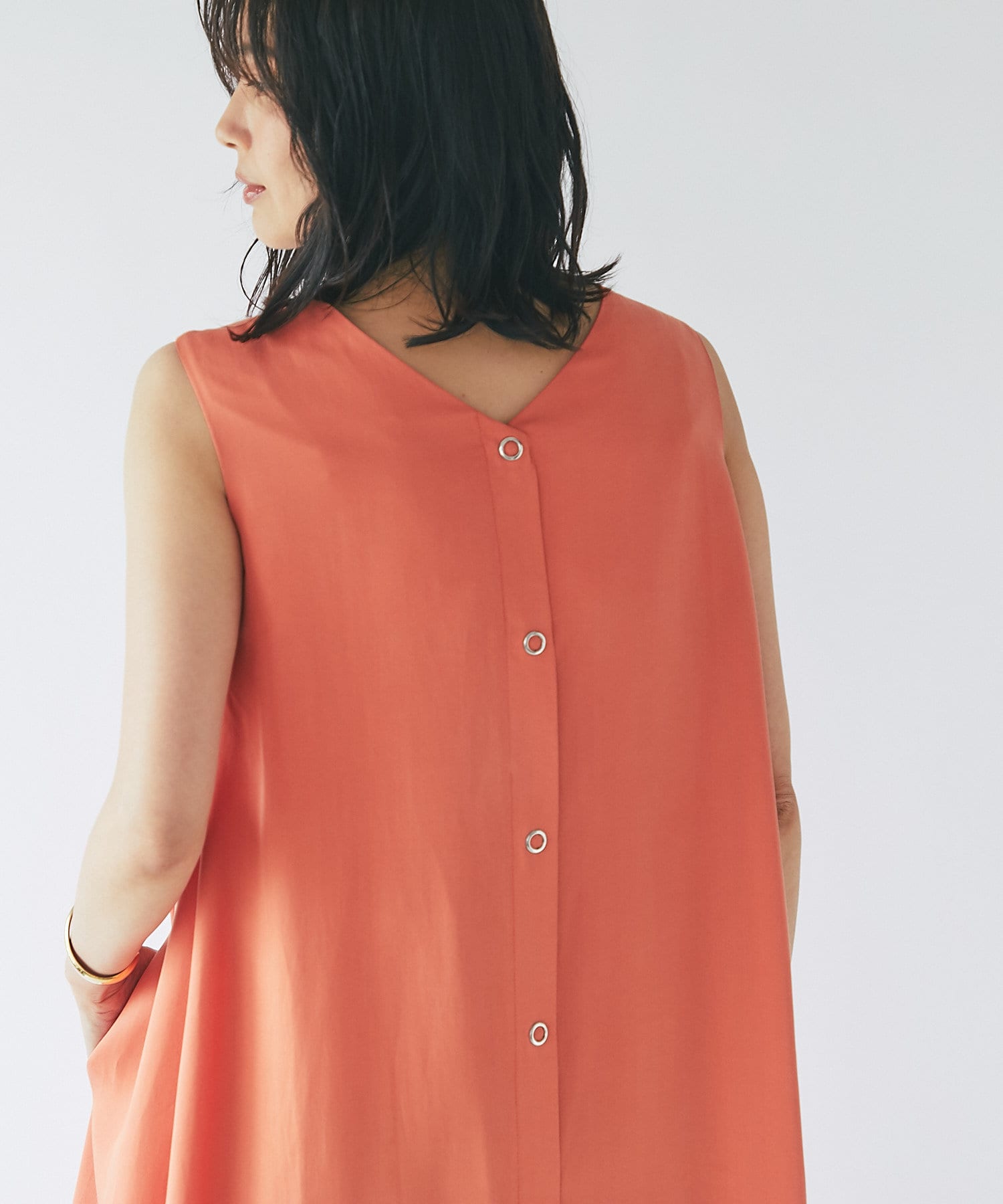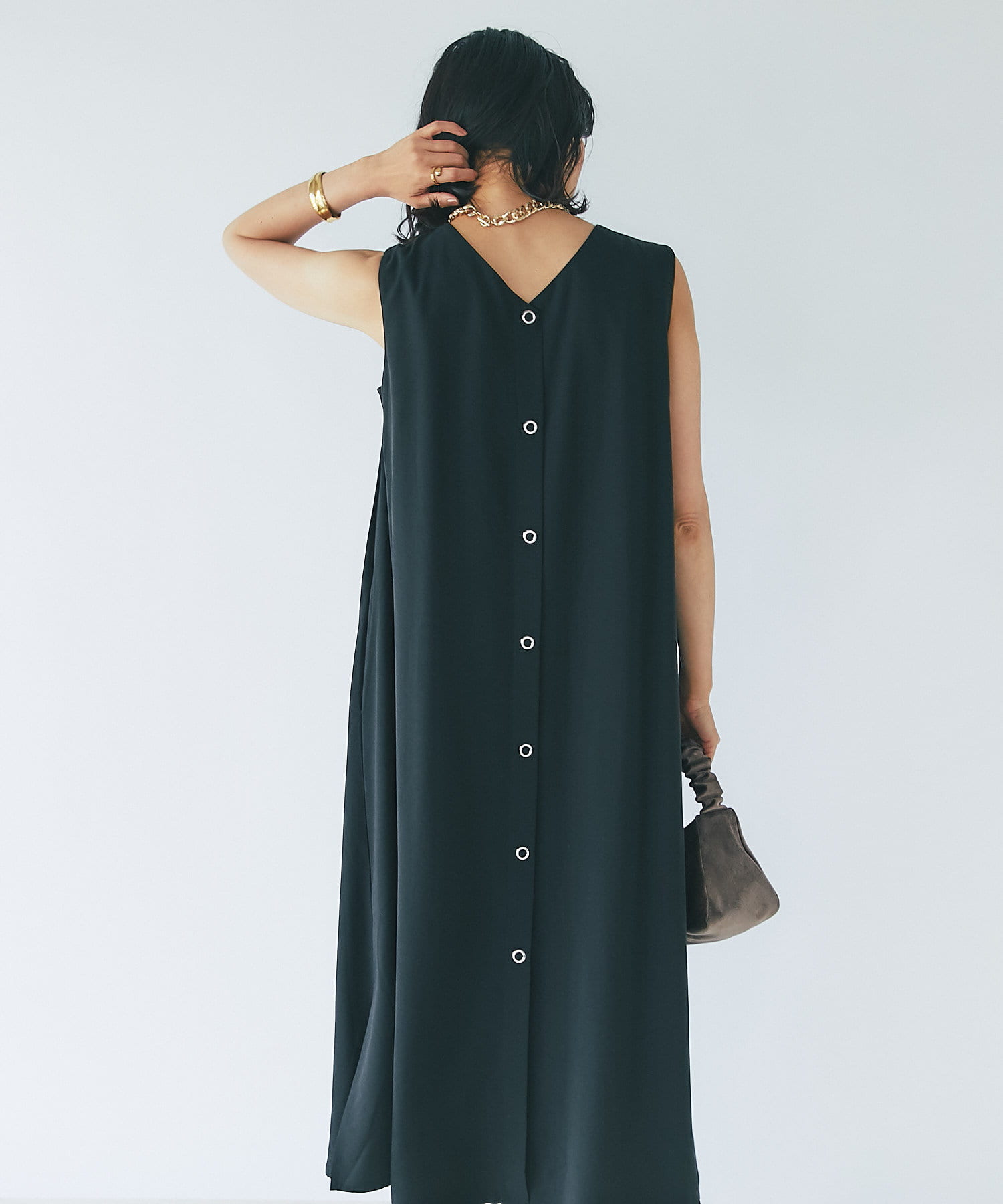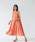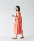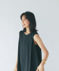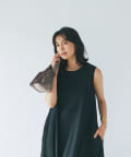 ノースリーブなので、羽織りによっても雰囲気が変えられ、シャツやカーディガンを羽織るとロングシーズンお使いいただけます。