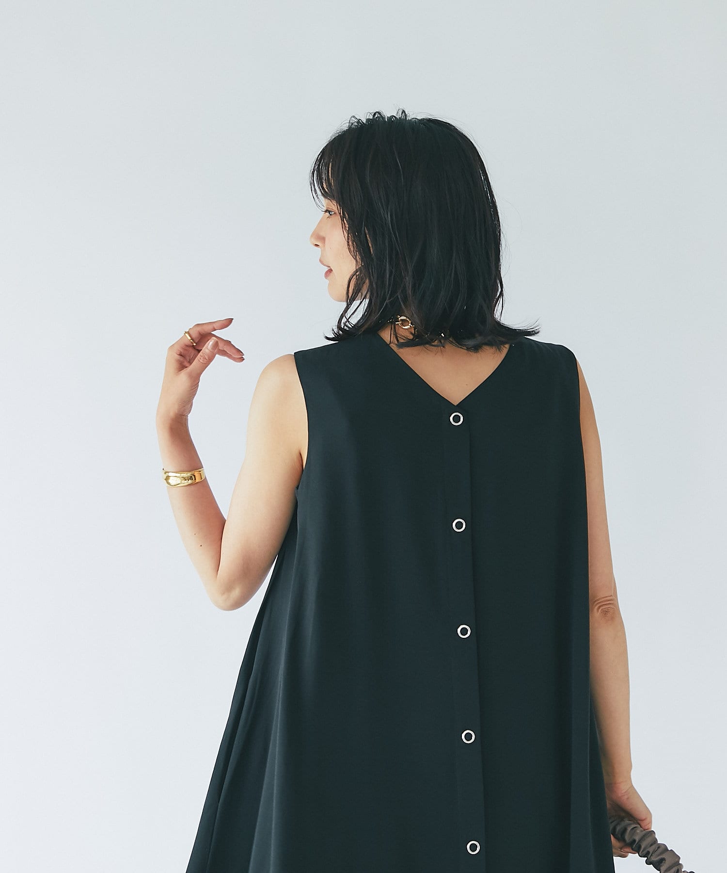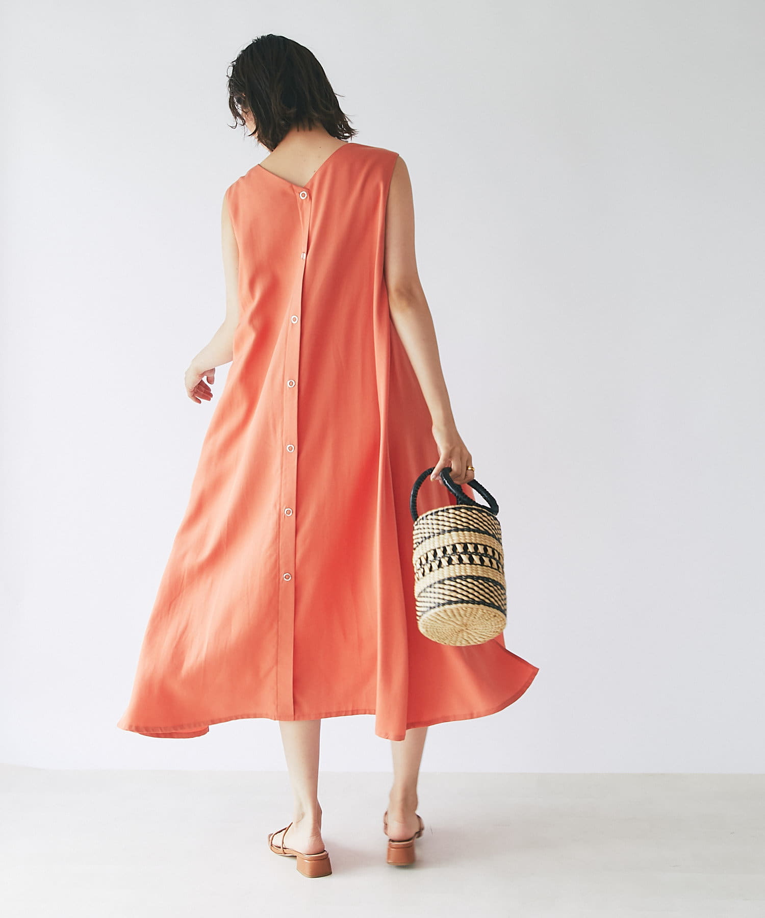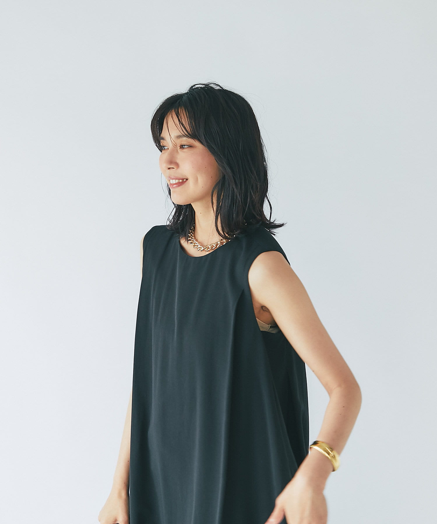 ノースリーブなので、羽織りによっても雰囲気が変えられ、シャツやカーディガンを羽織るとロングシーズンお使いいただけます。