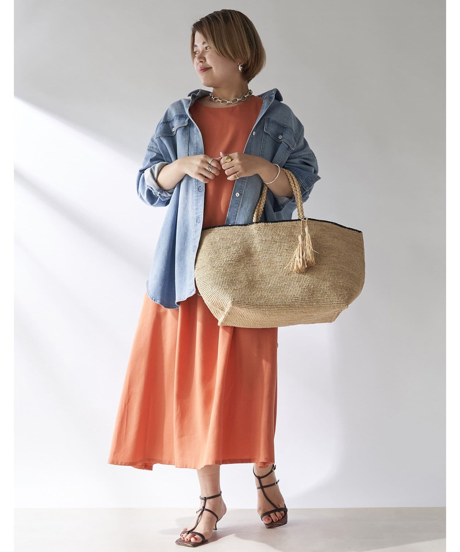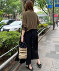 また夏らしいラタン素材の小物使いやハットと合わせて夏らしくスタイリングするのがオススメです。