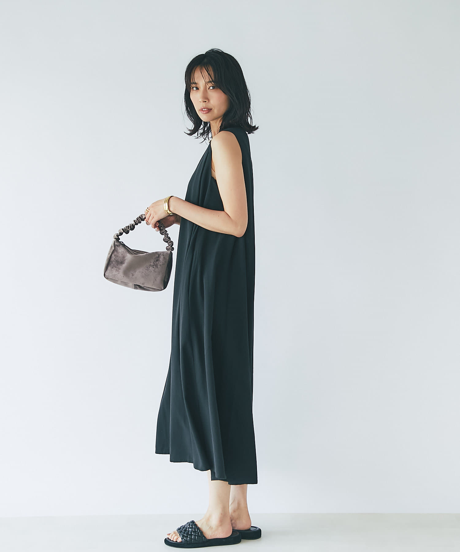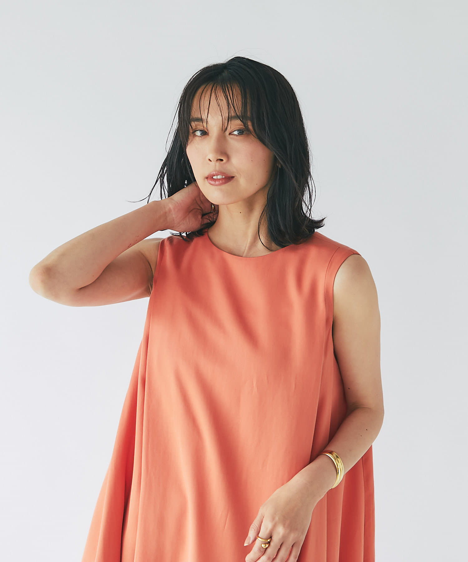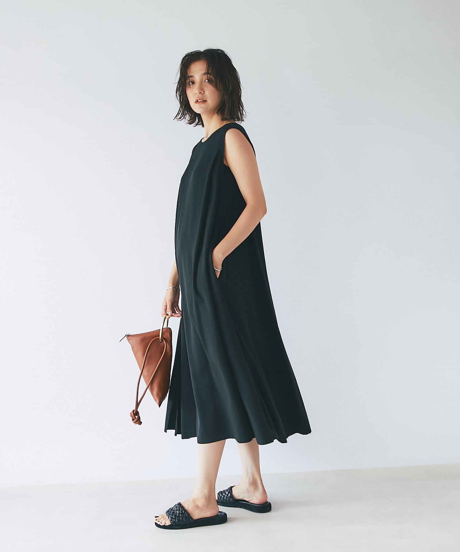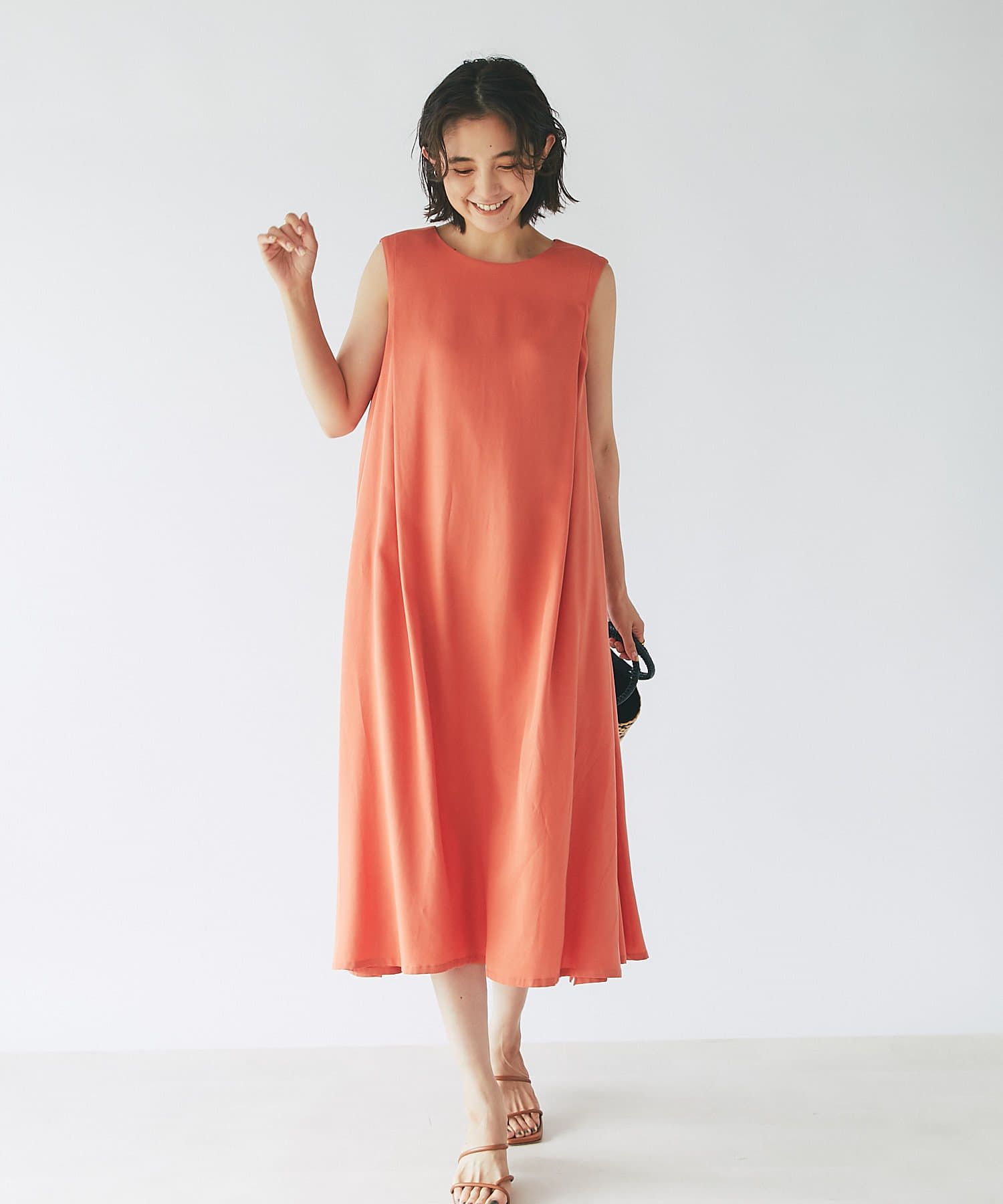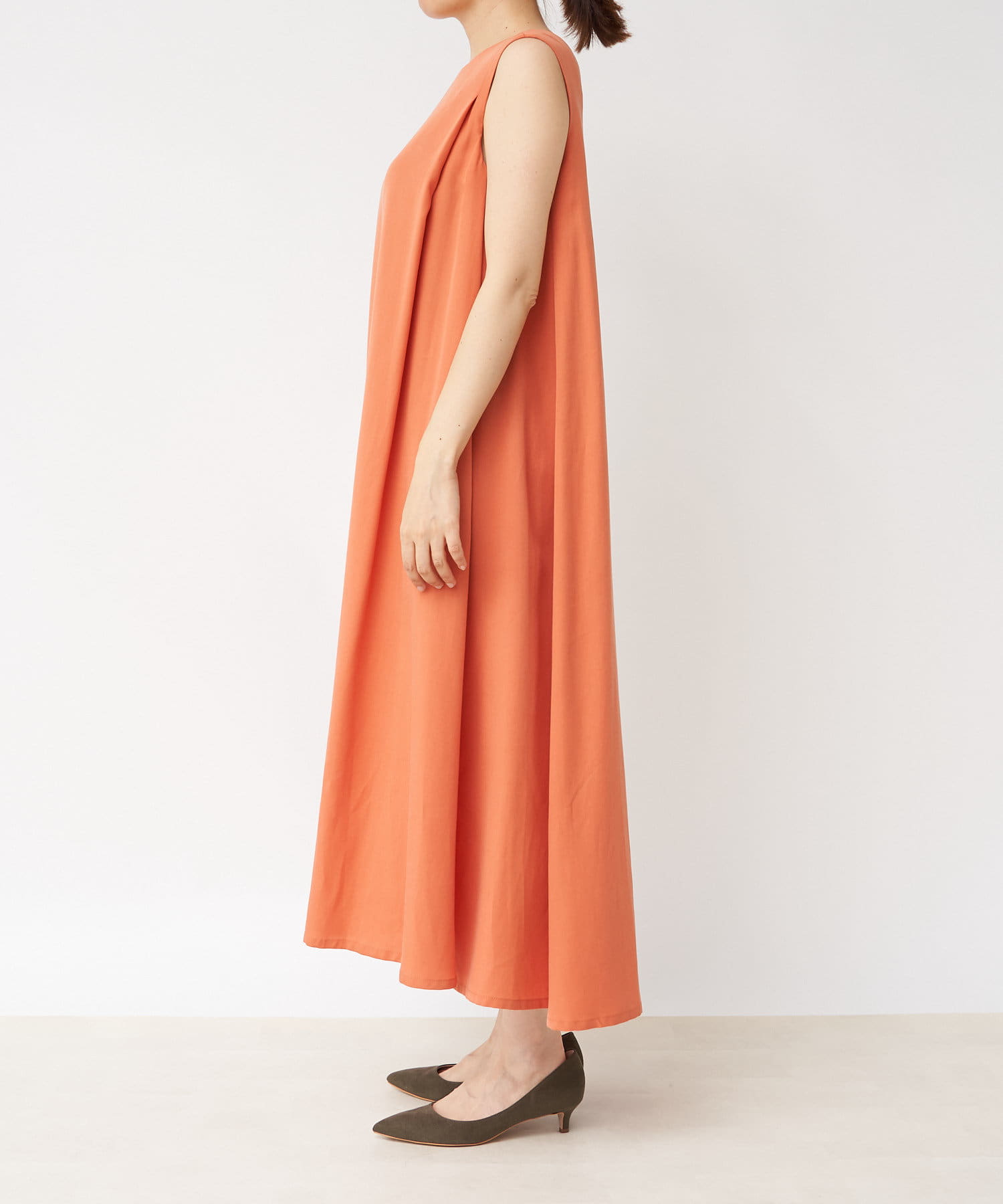 滑らか落ち感のある素材感でテントシルエットのひらりとした動きが清涼感をプラスしてくれるワンピース。