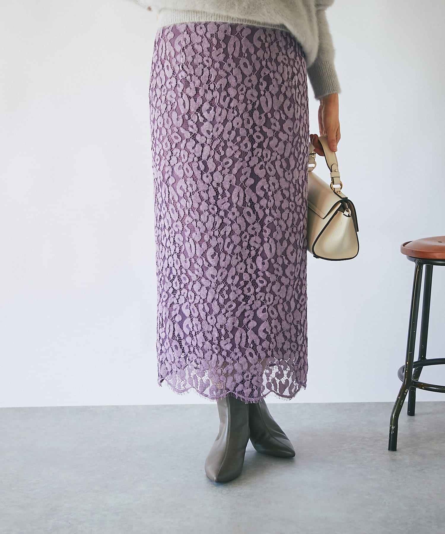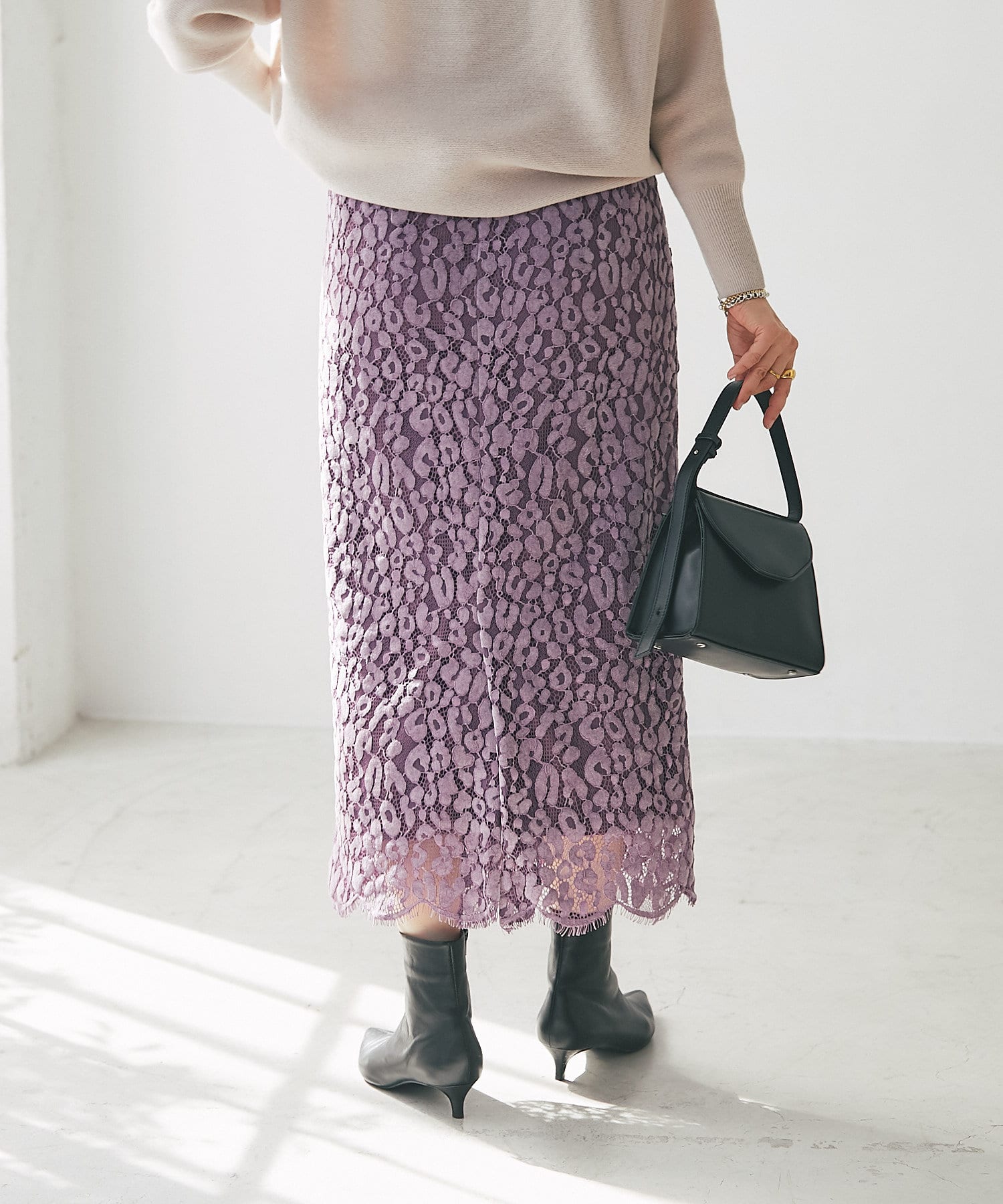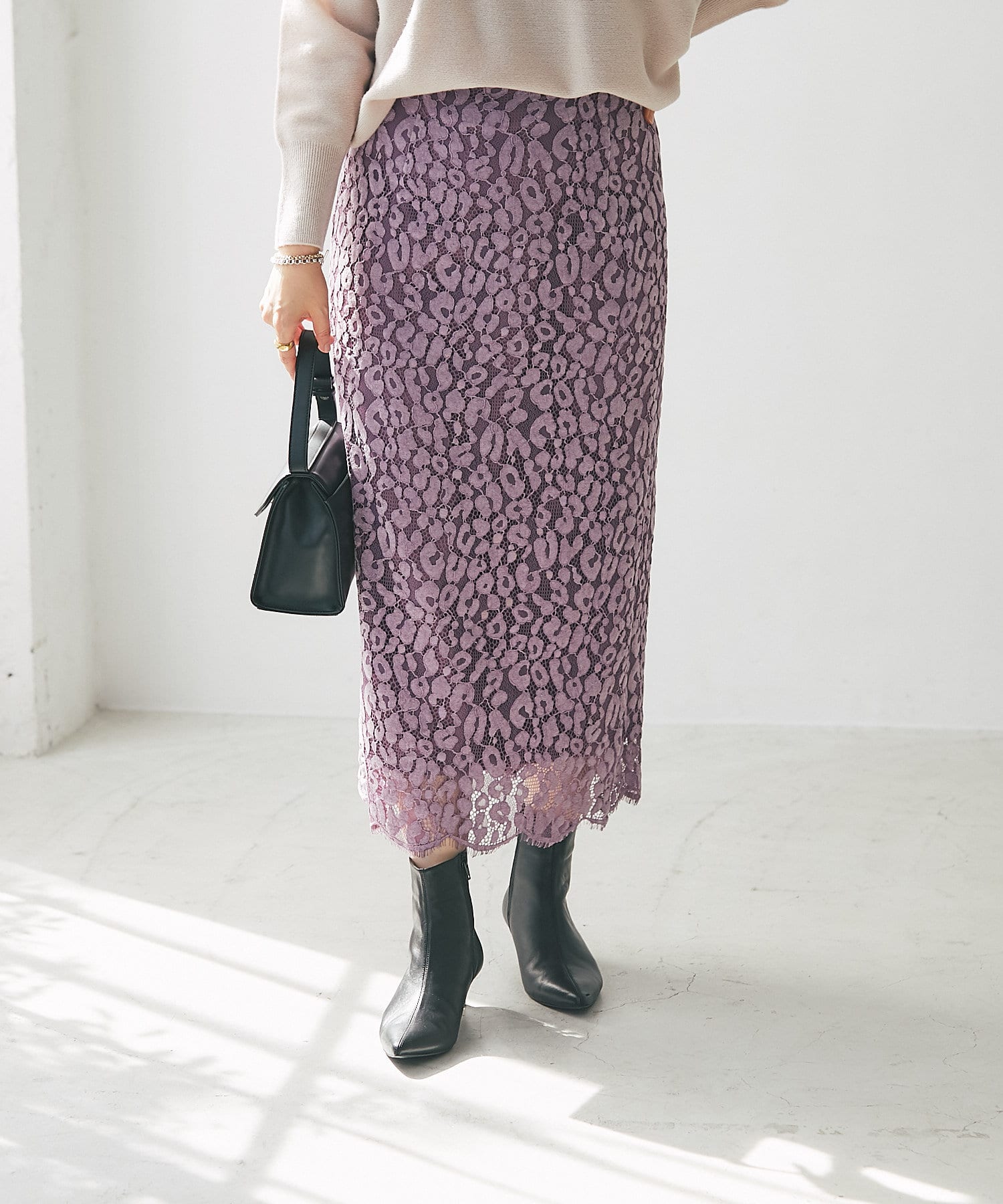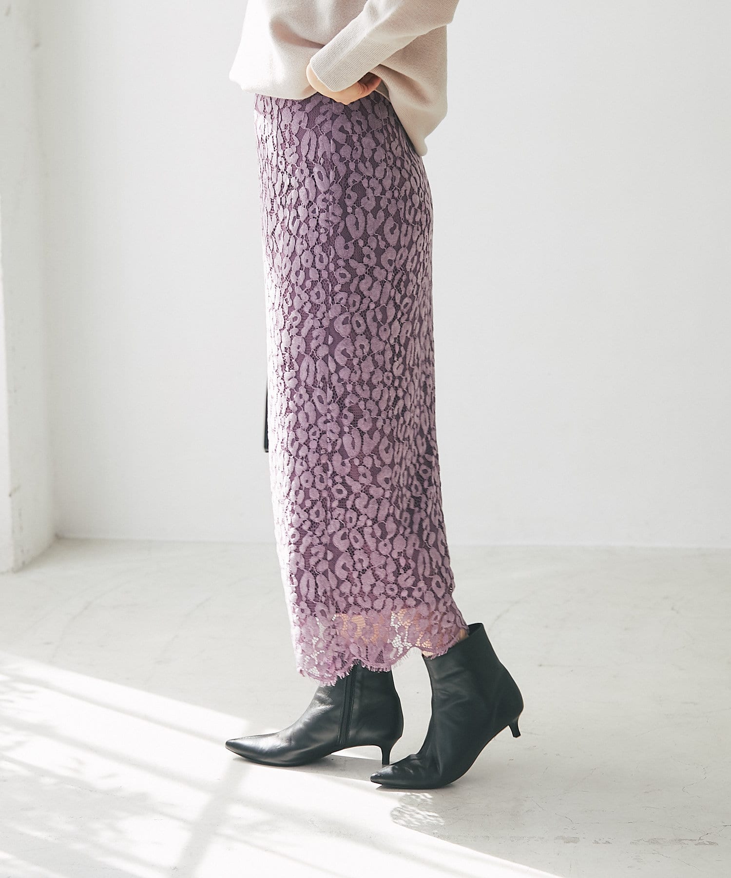 一枚で着映えするレース使いが品のあるエレガントさを演出してくれるタイトスカート。