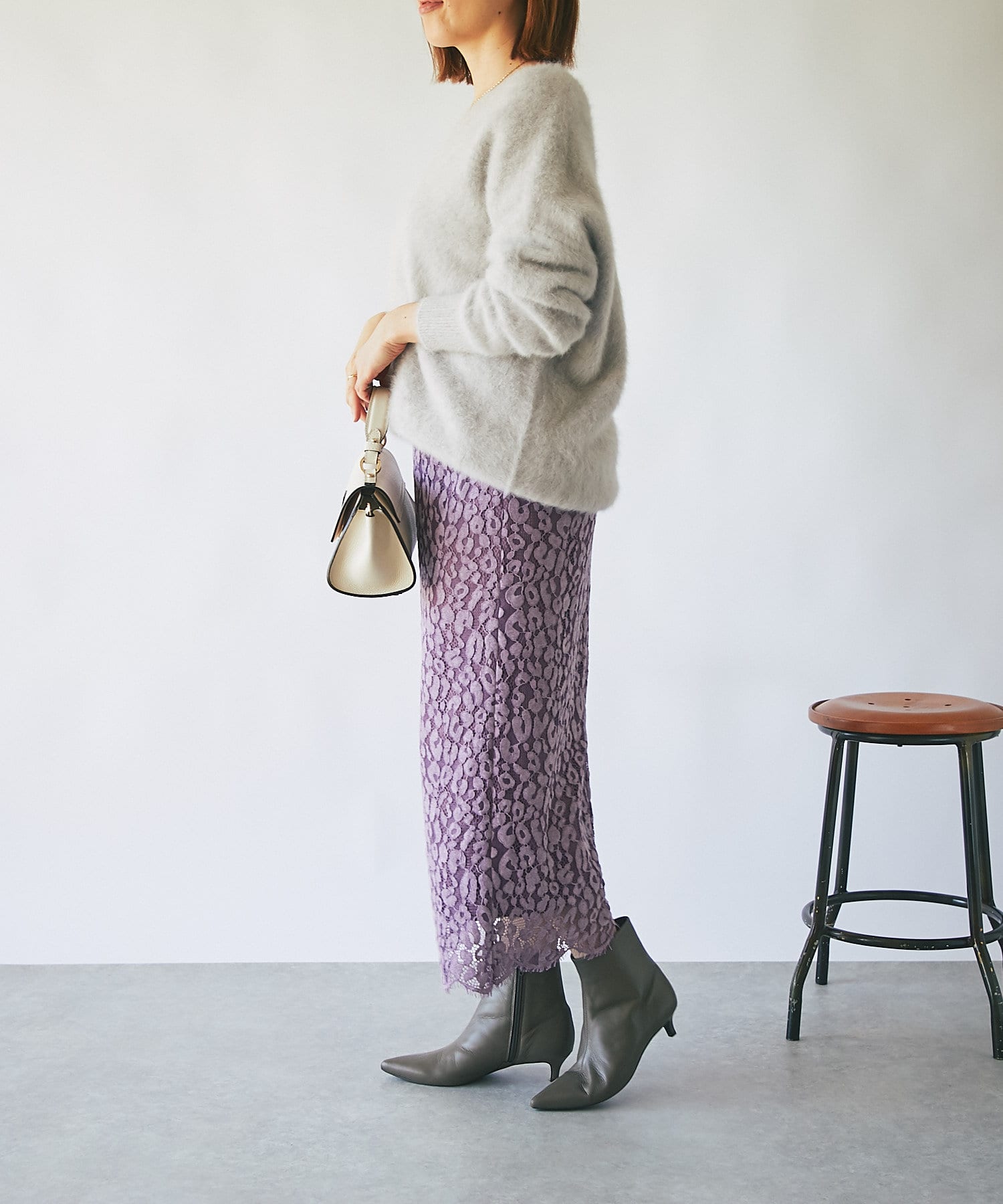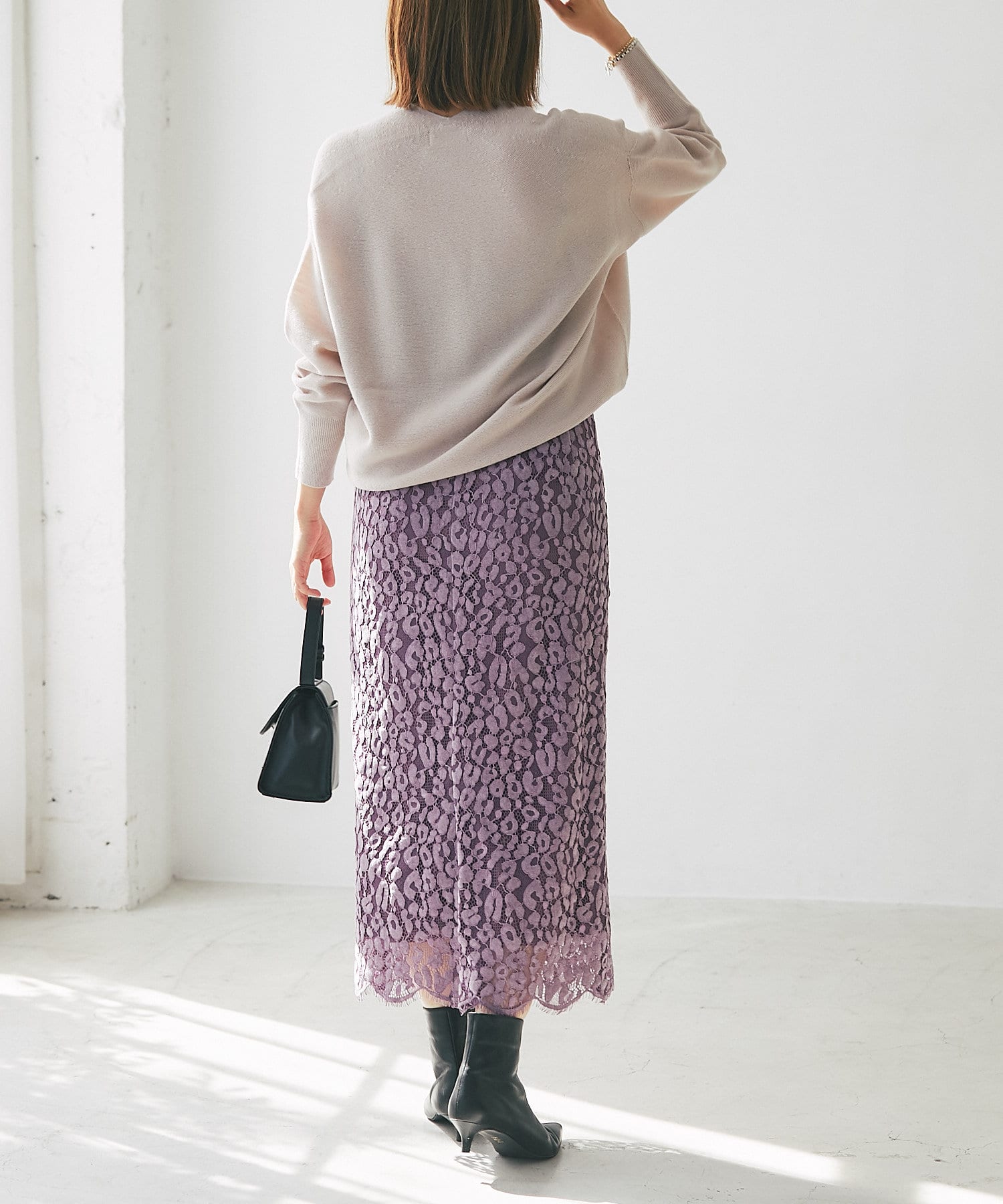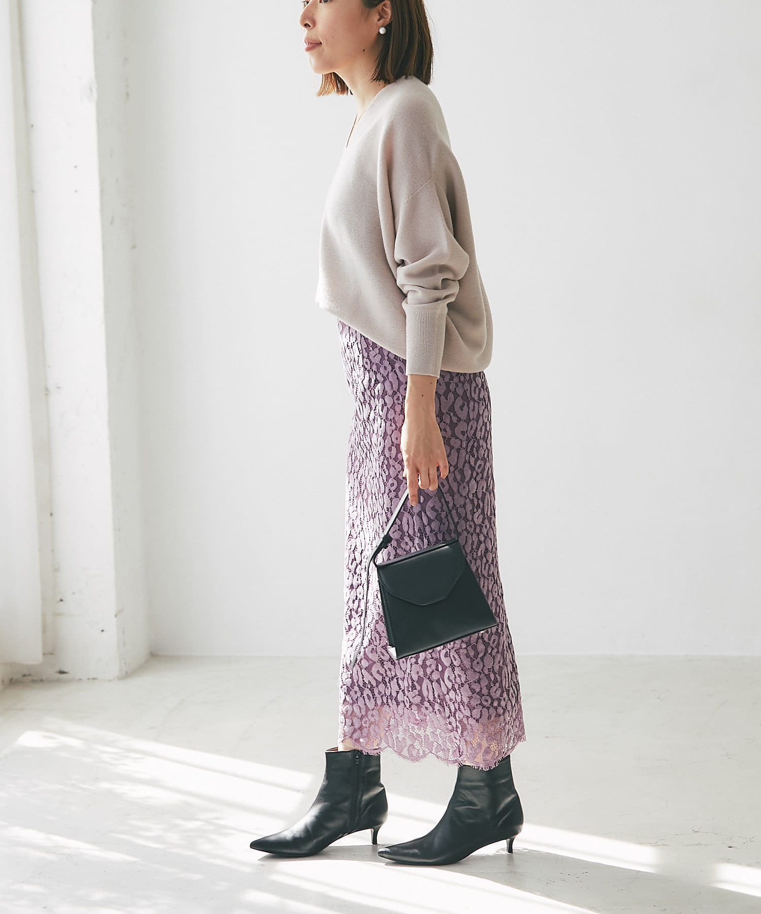 秋冬らしいスモーキーなカラー展開で甘くなりがちなレースを知的な印象で楽しめるように仕上げています。