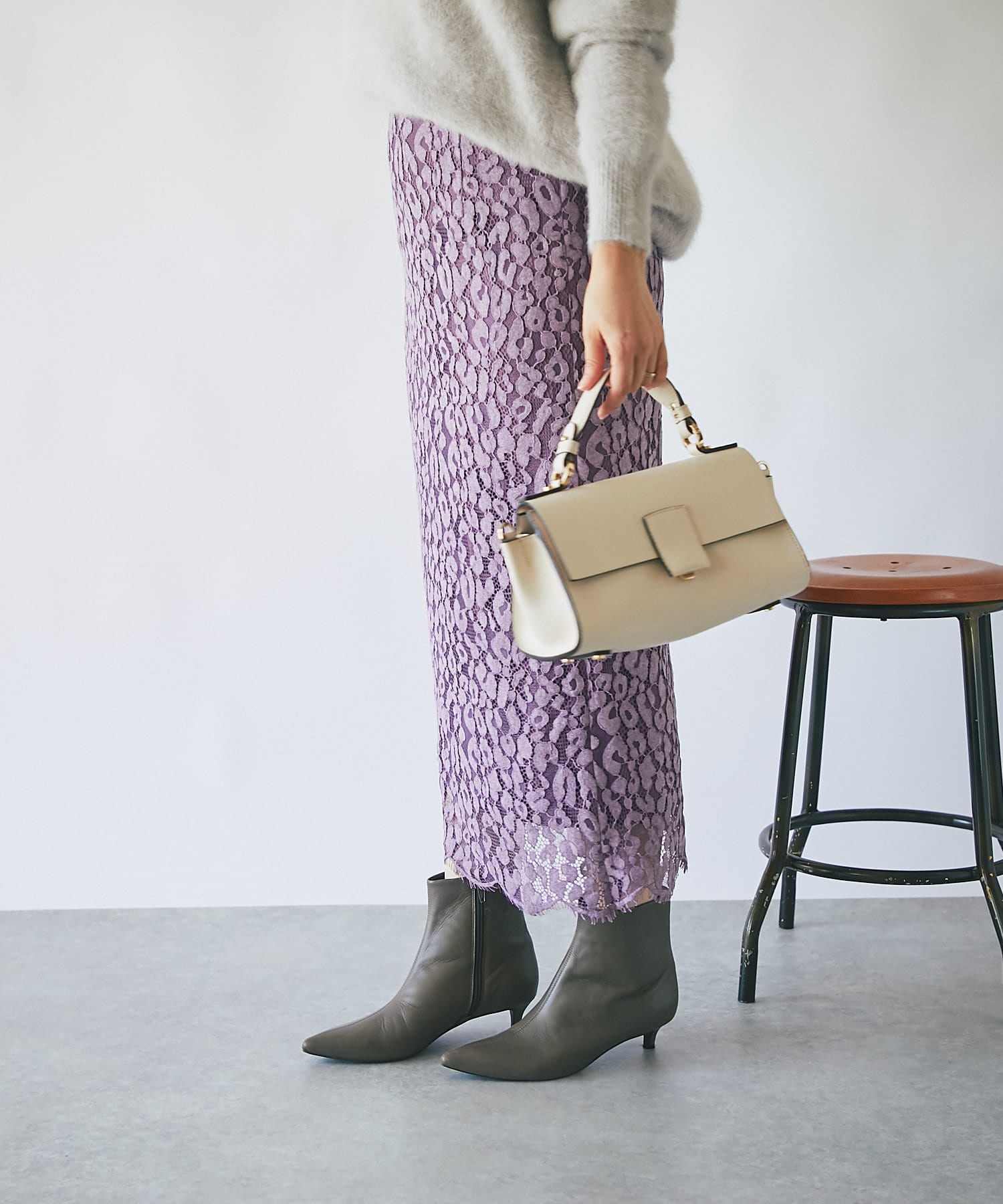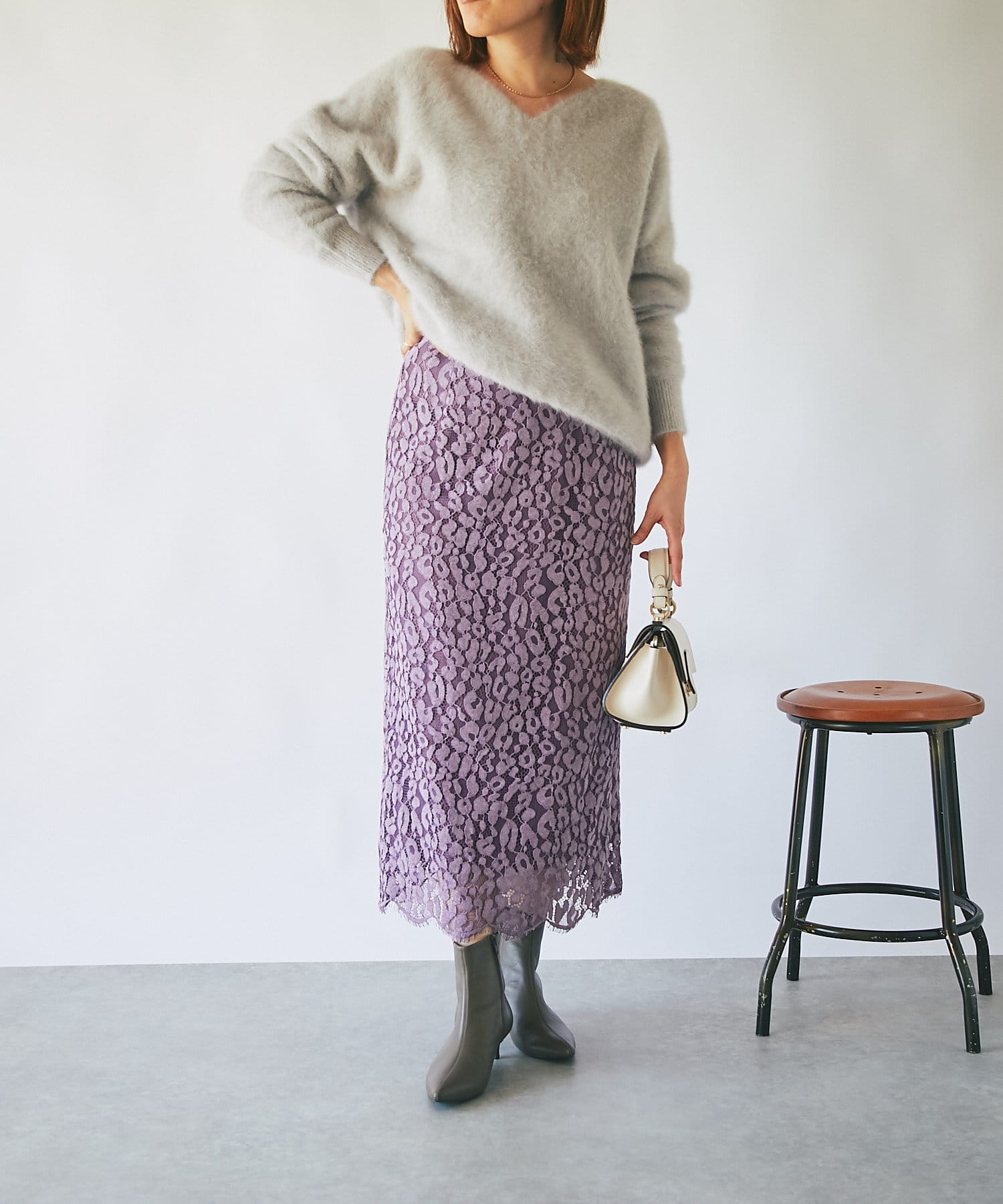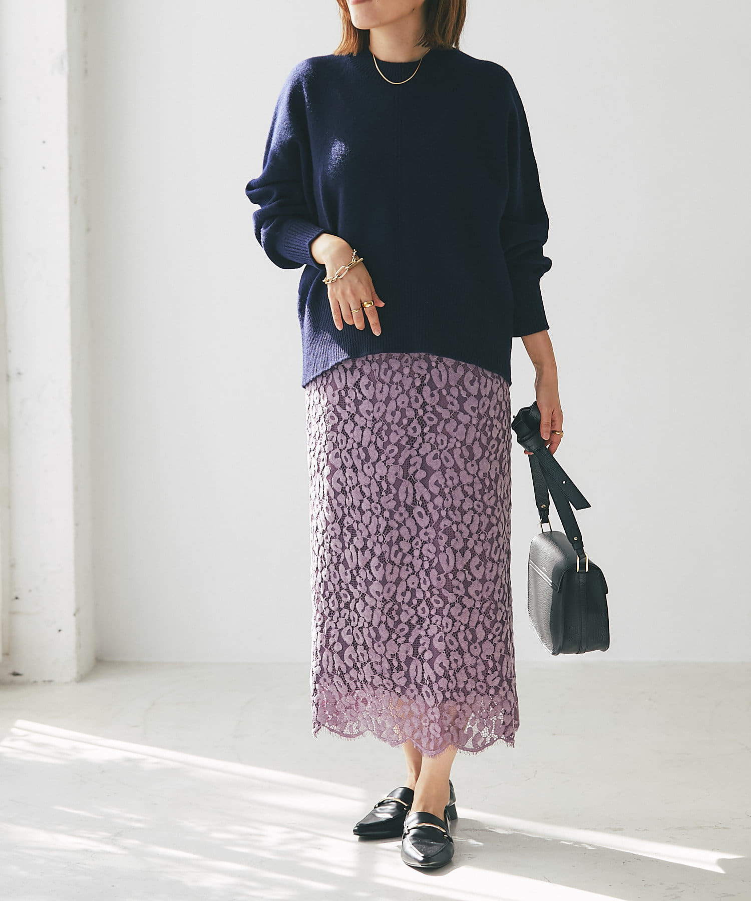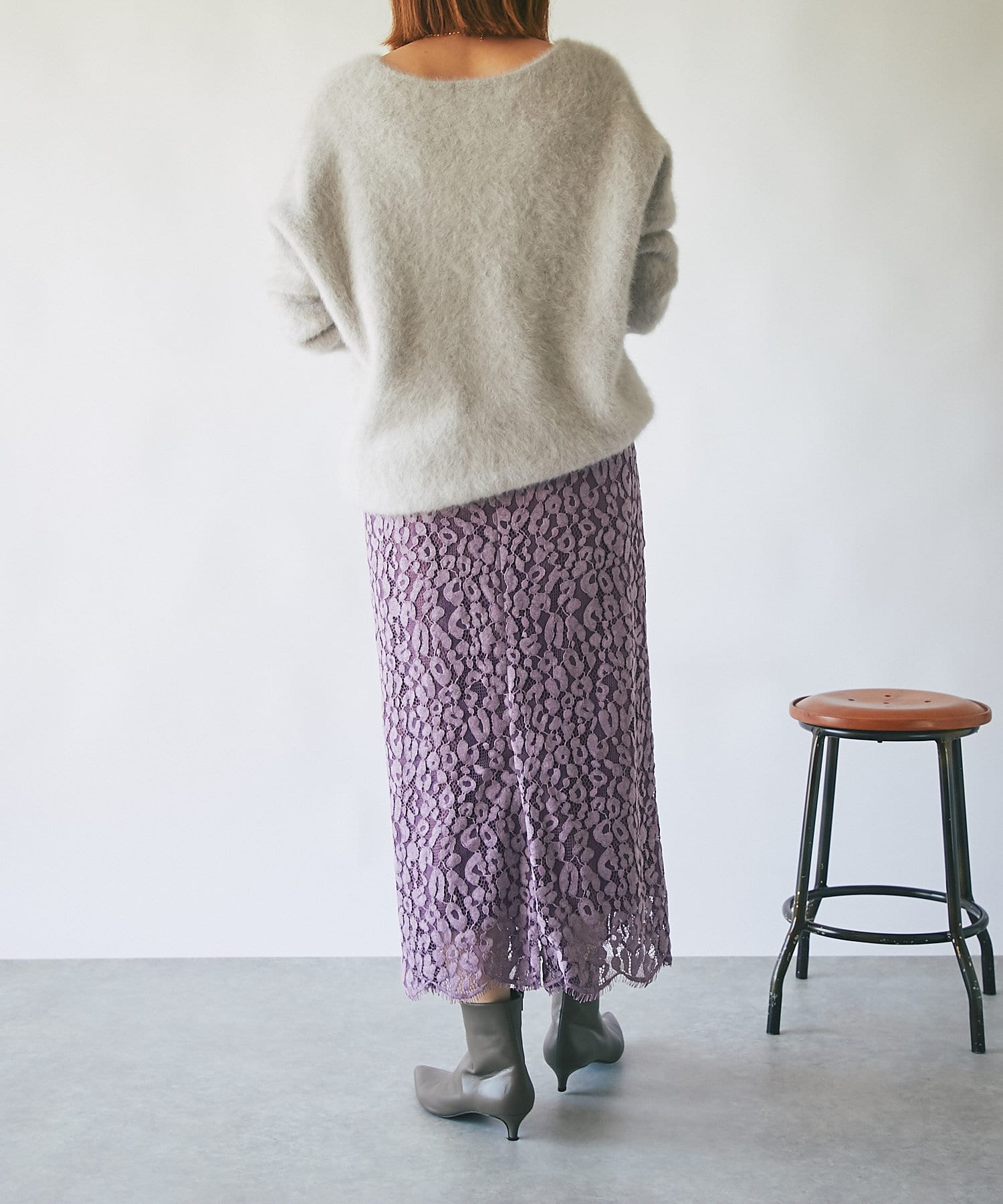 秋冬らしいスモーキーなカラー展開で甘くなりがちなレースを知的な印象で楽しめるように仕上げています。