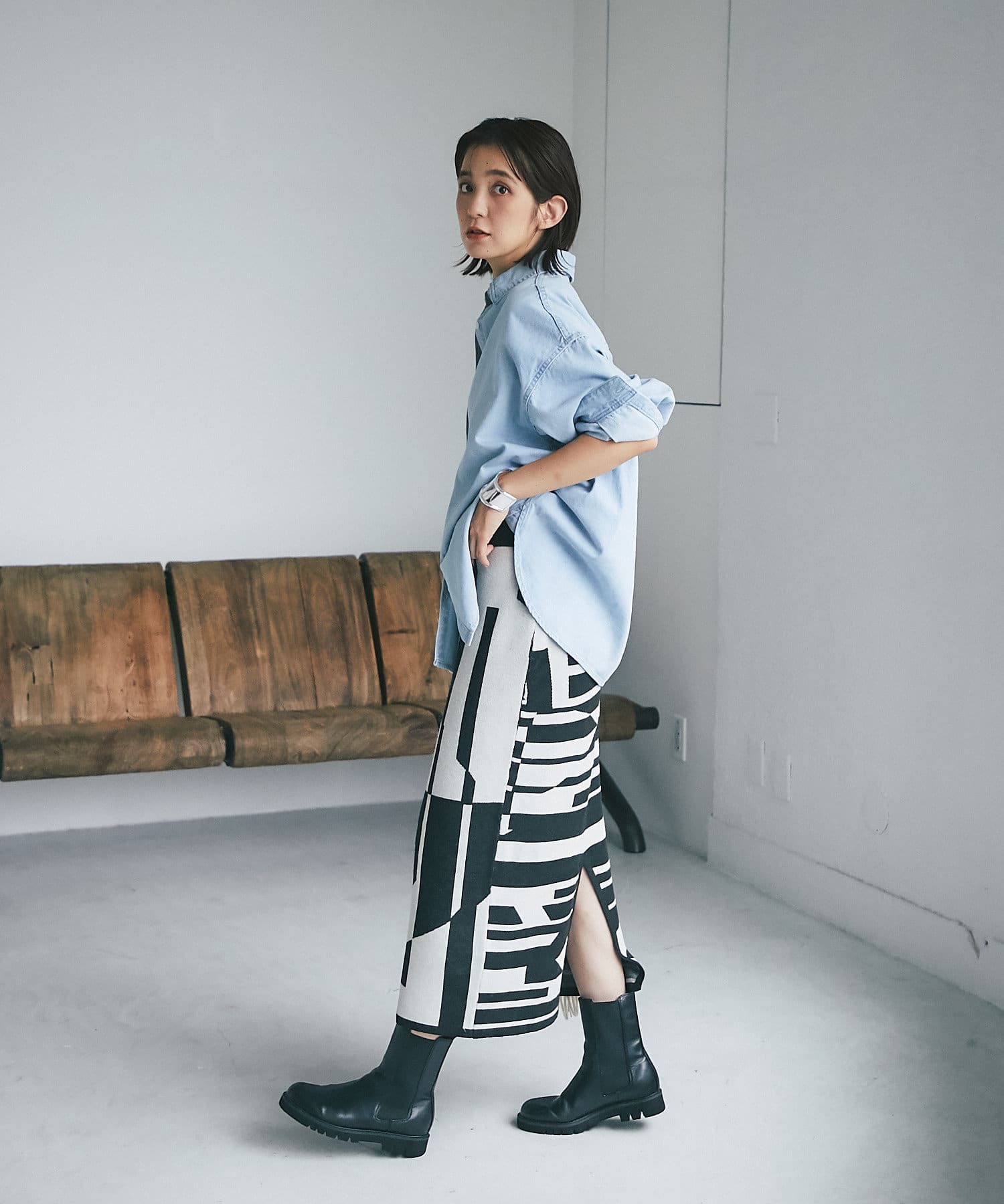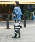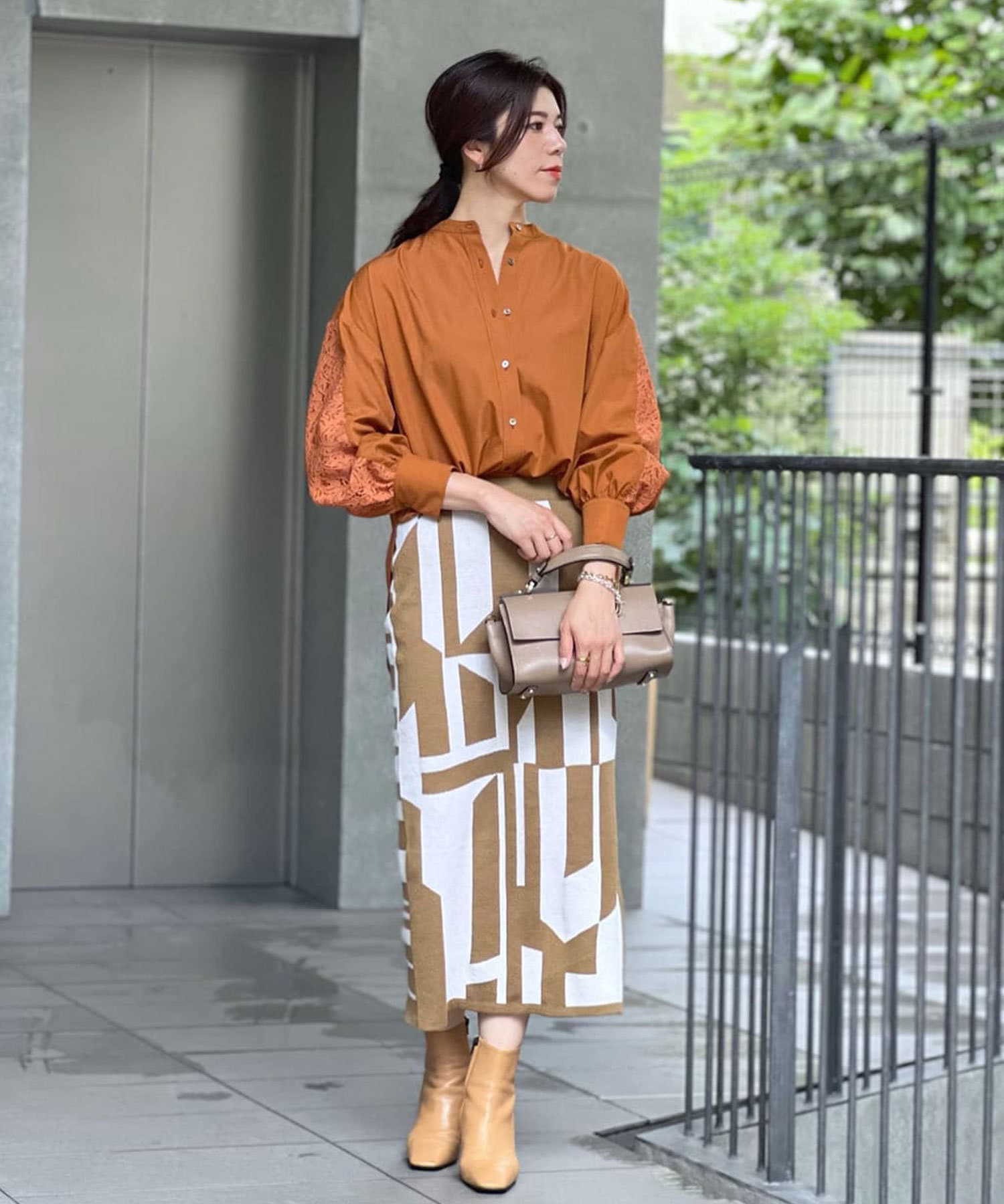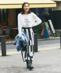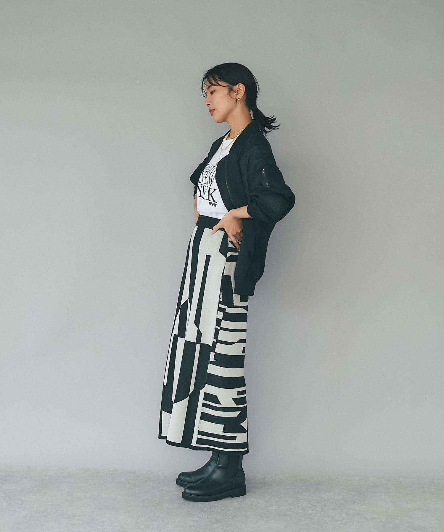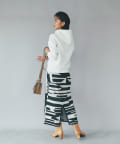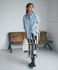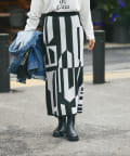 柄にインパクトがあるのでトップスはシンプルなアイテムで合わせるとより、スカートが引き立つスタイリングになり◎