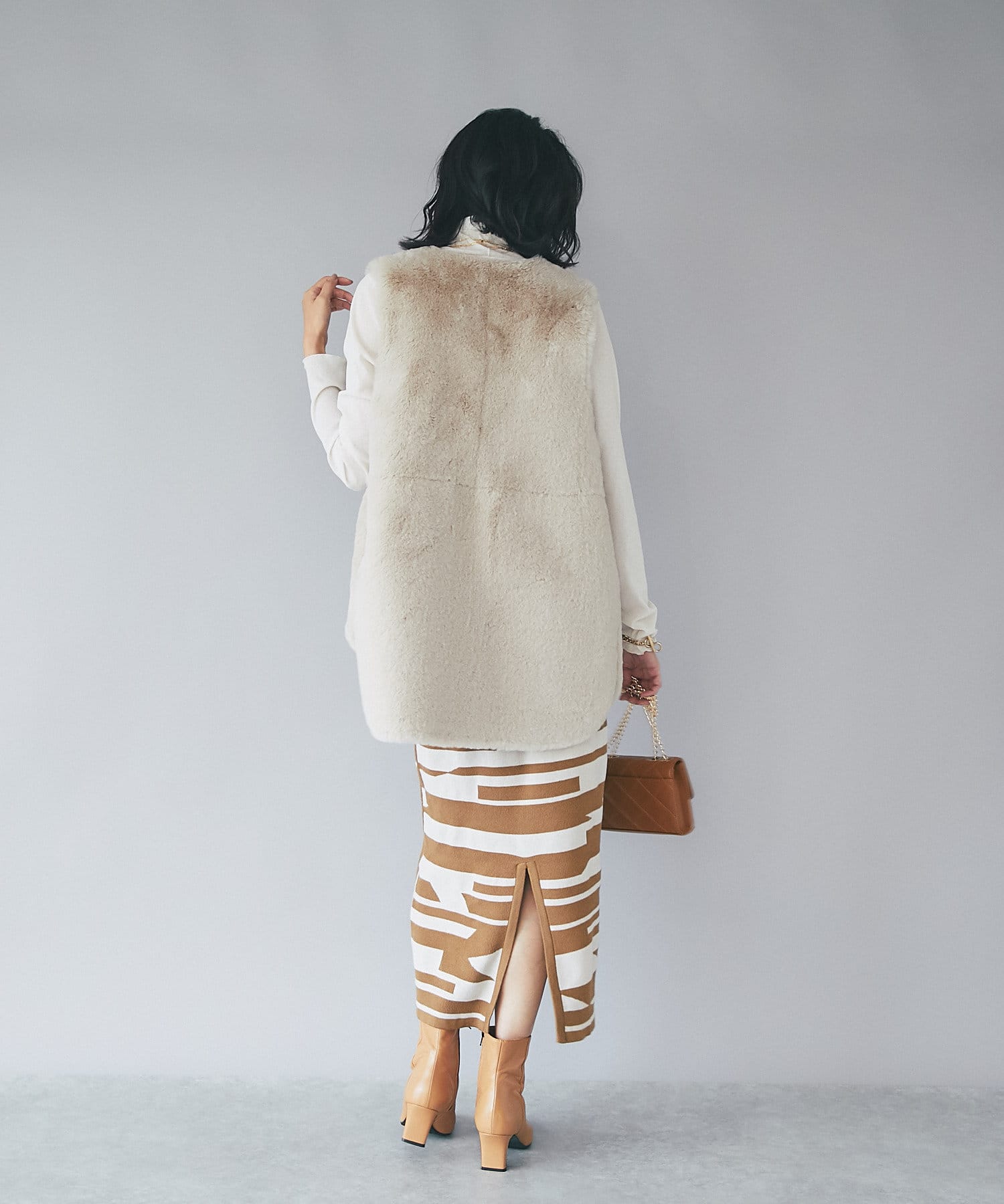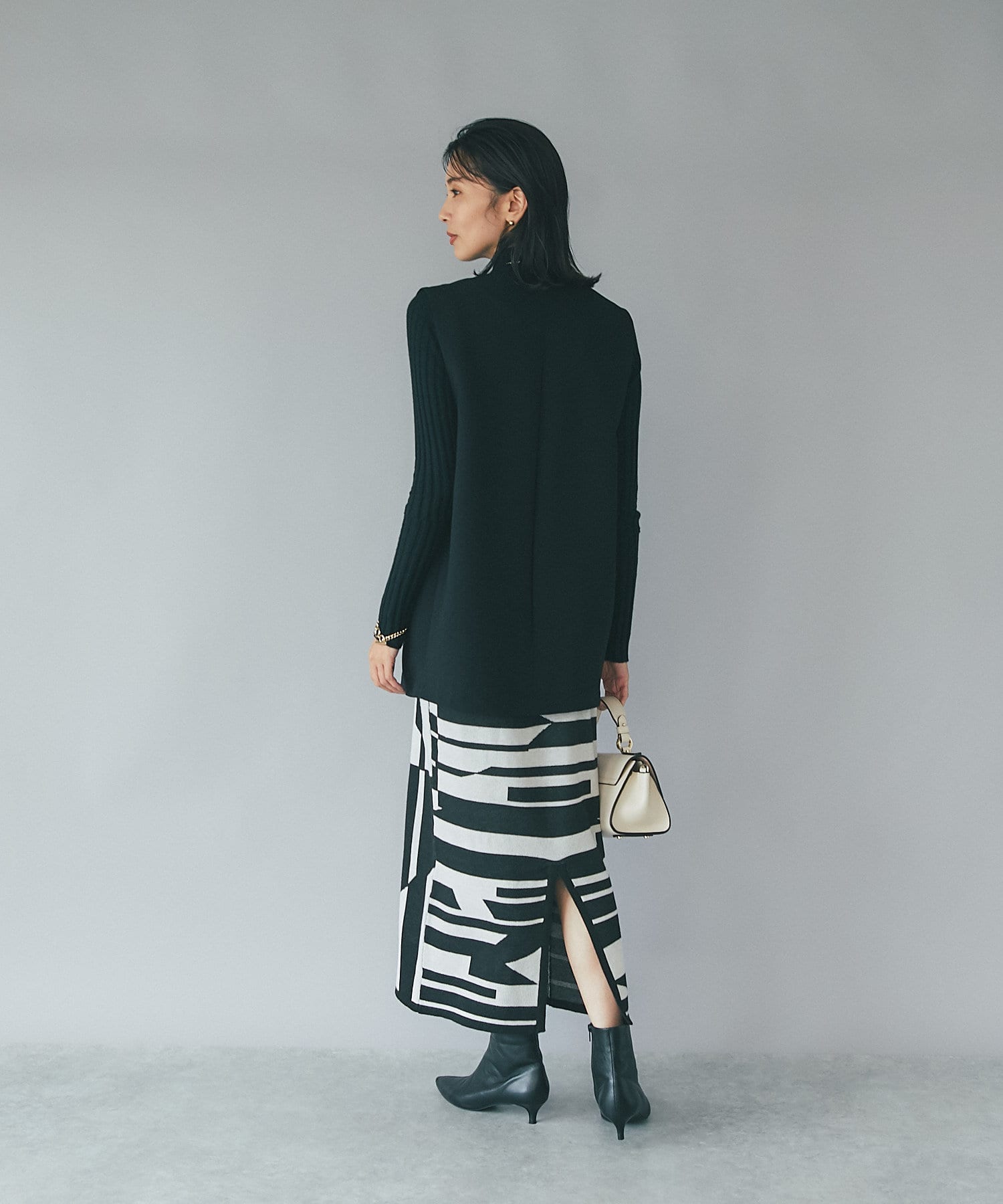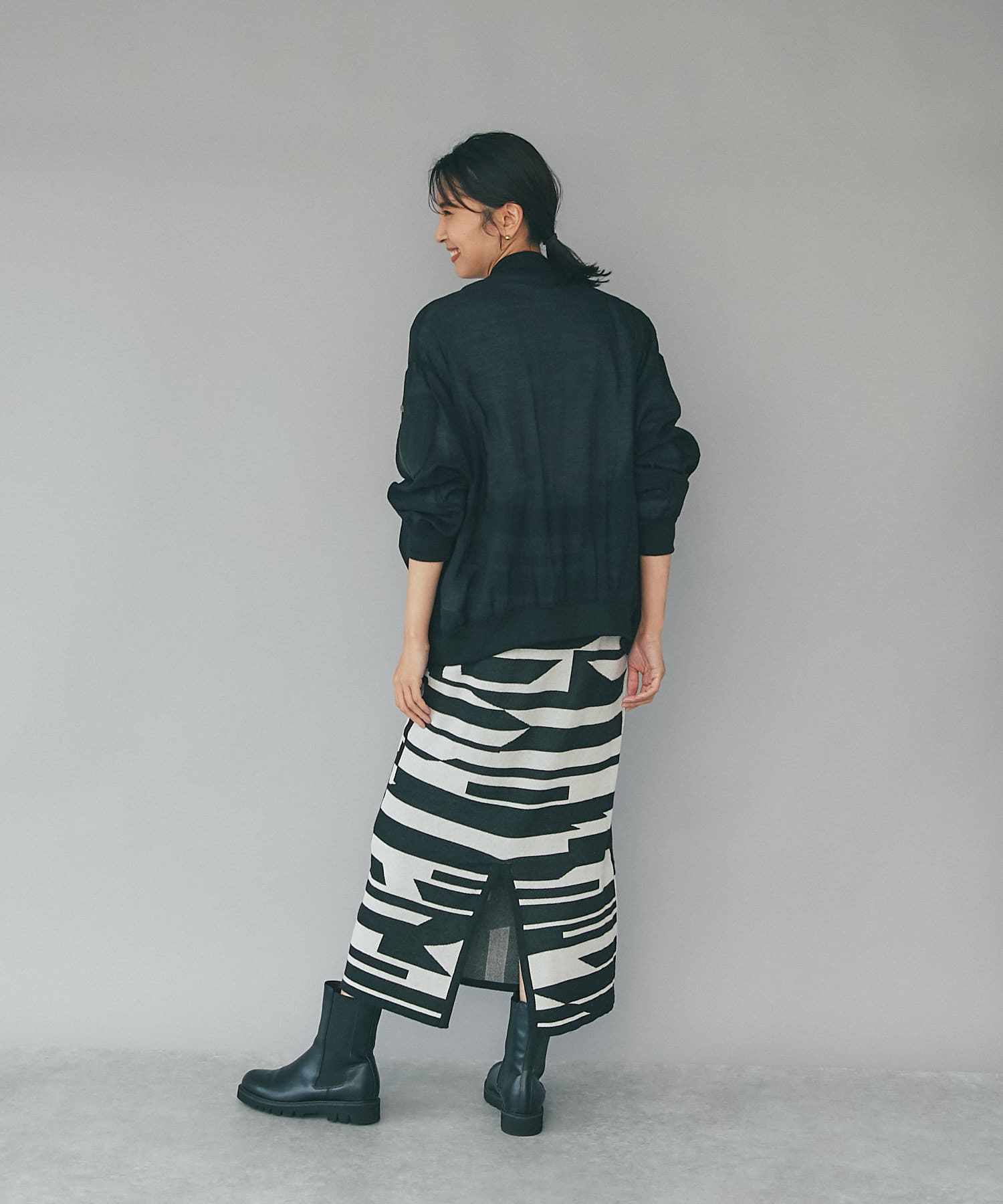 後身頃にはスリット入りで足さばきも良く、重くなりがちな秋冬のコーディネートに抜け感をプラスしてくれます。