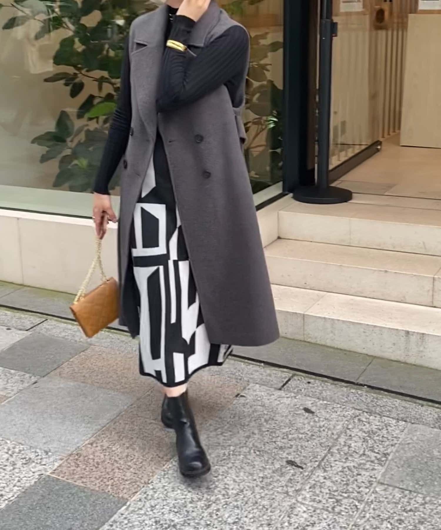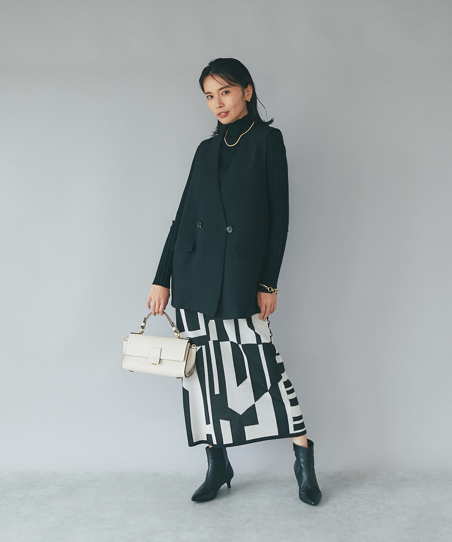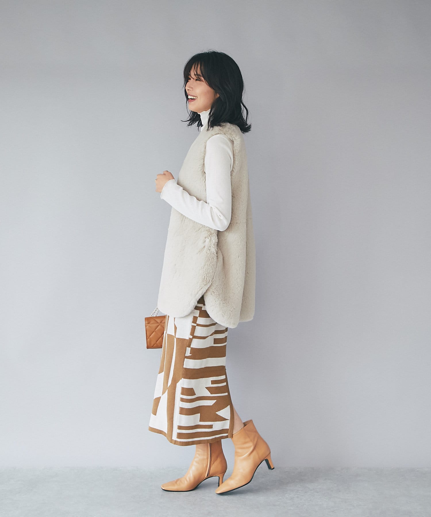 後身頃にはスリット入りで足さばきも良く、重くなりがちな秋冬のコーディネートに抜け感をプラスしてくれます。