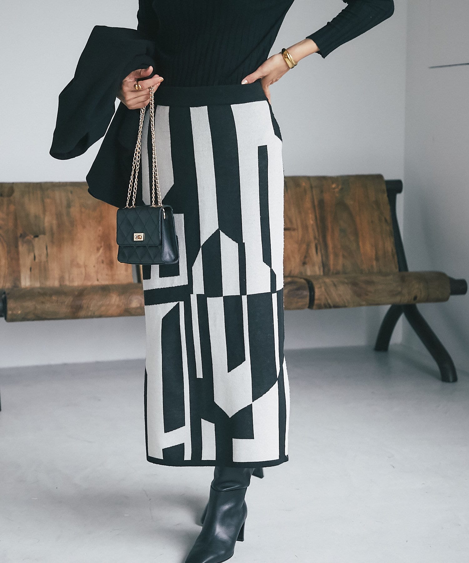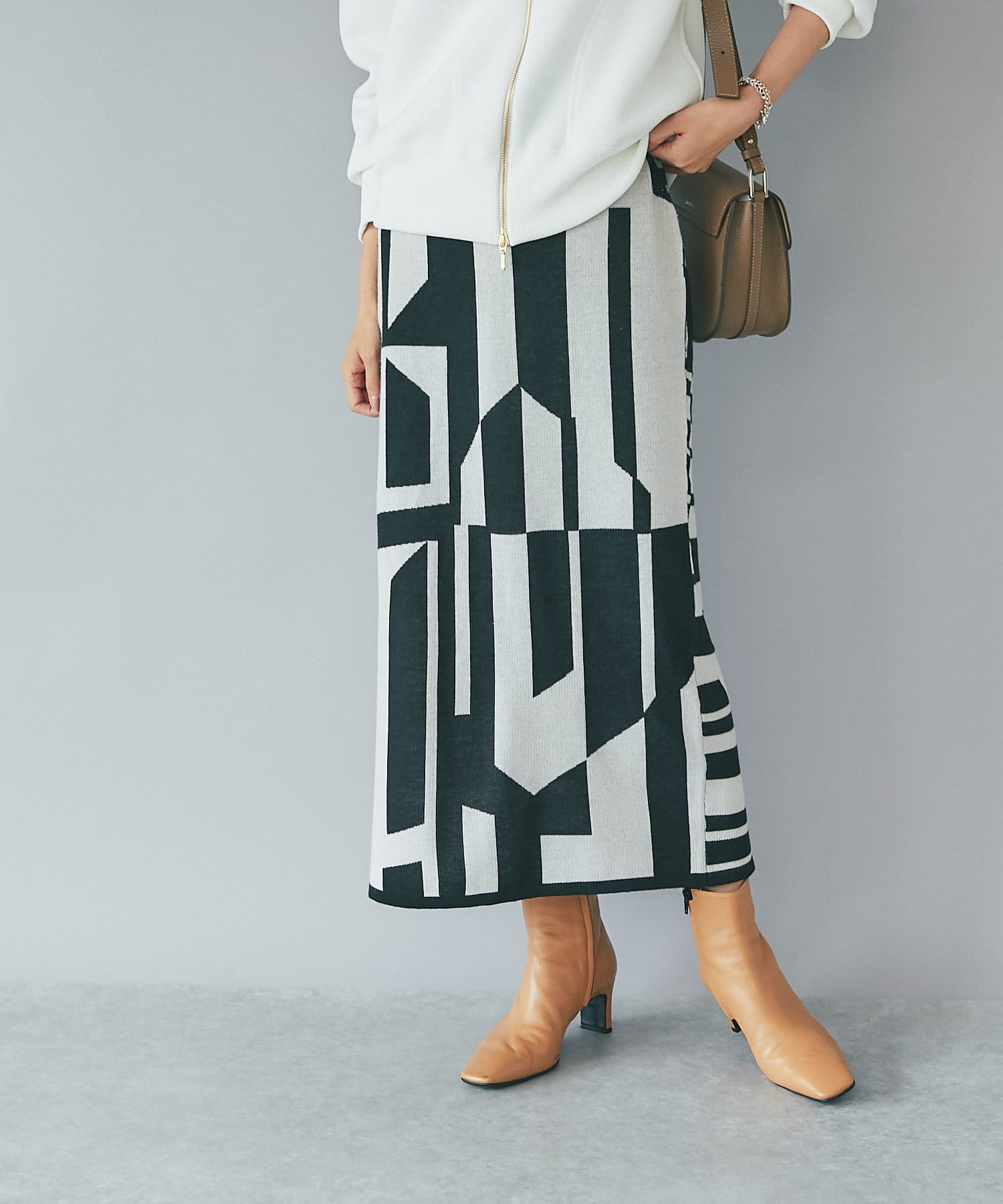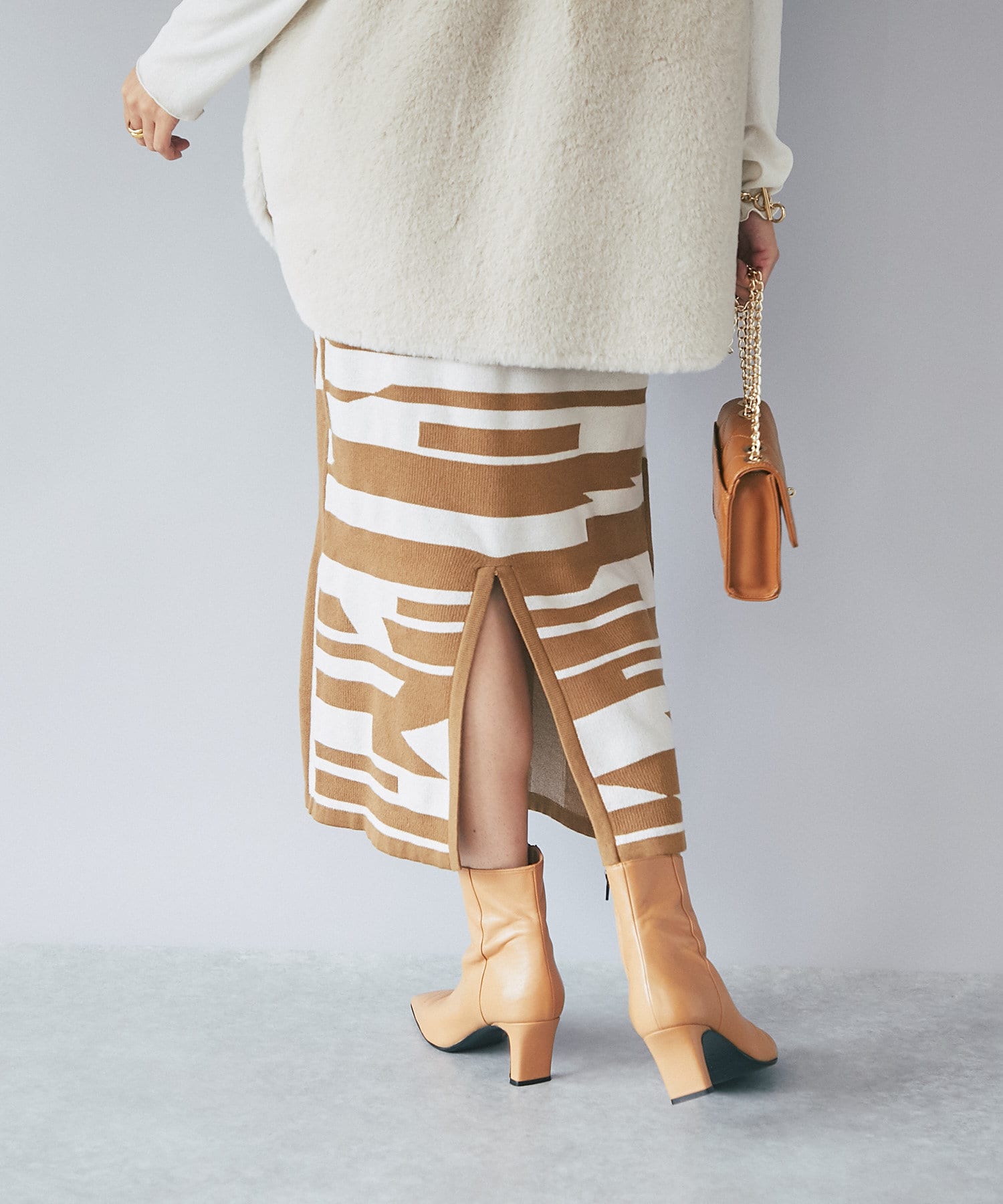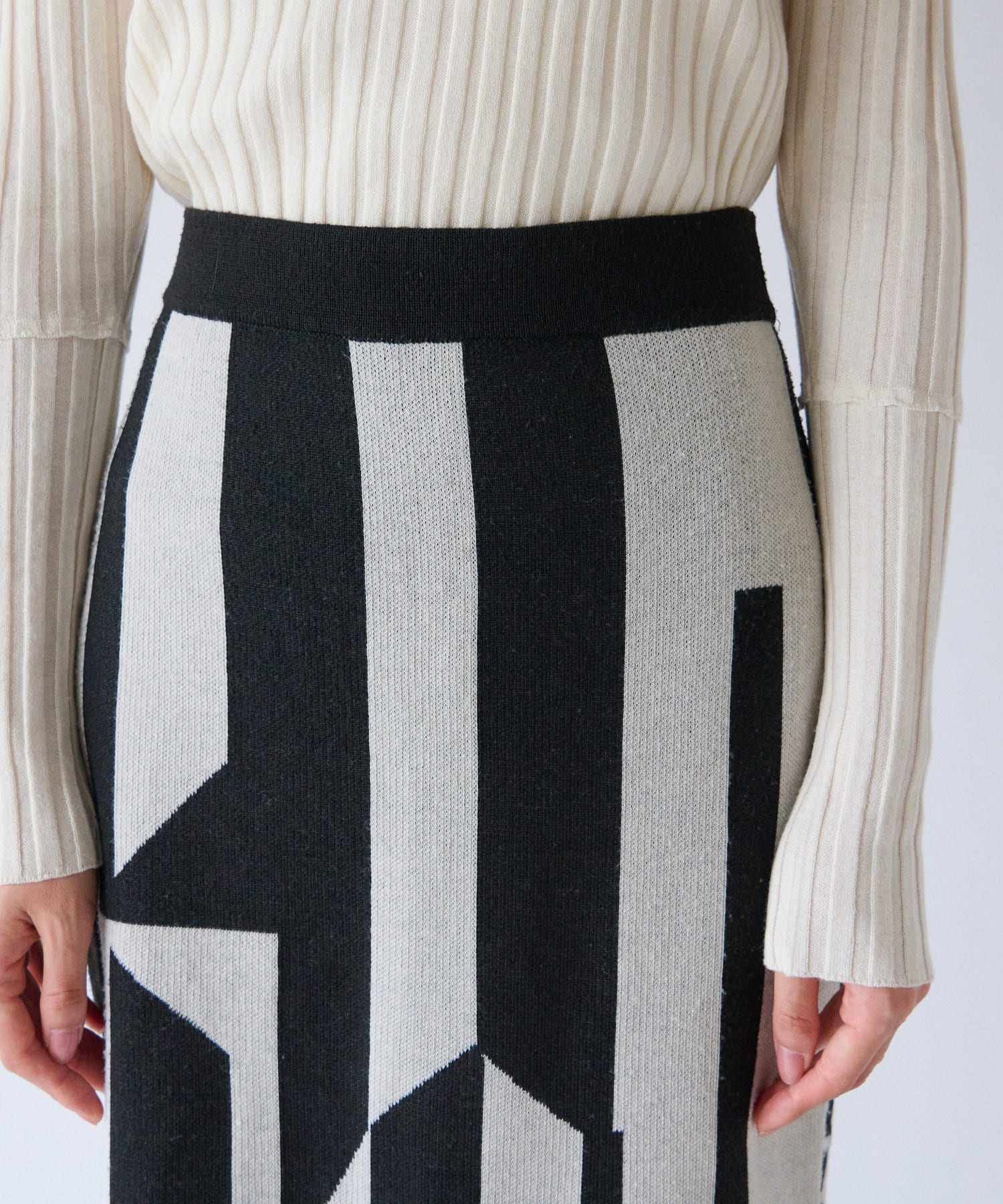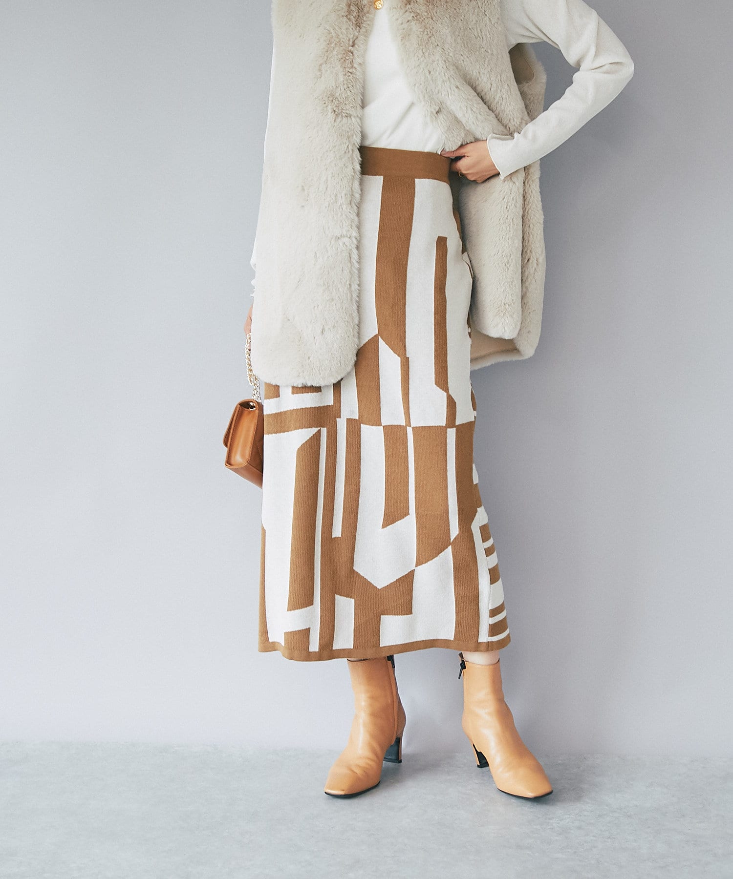 インパクトのあるジャガードが目を惹く今季らしいニットスカート。