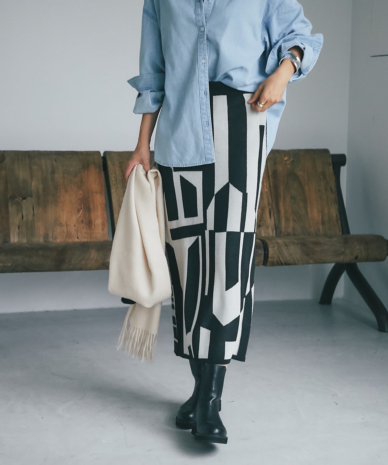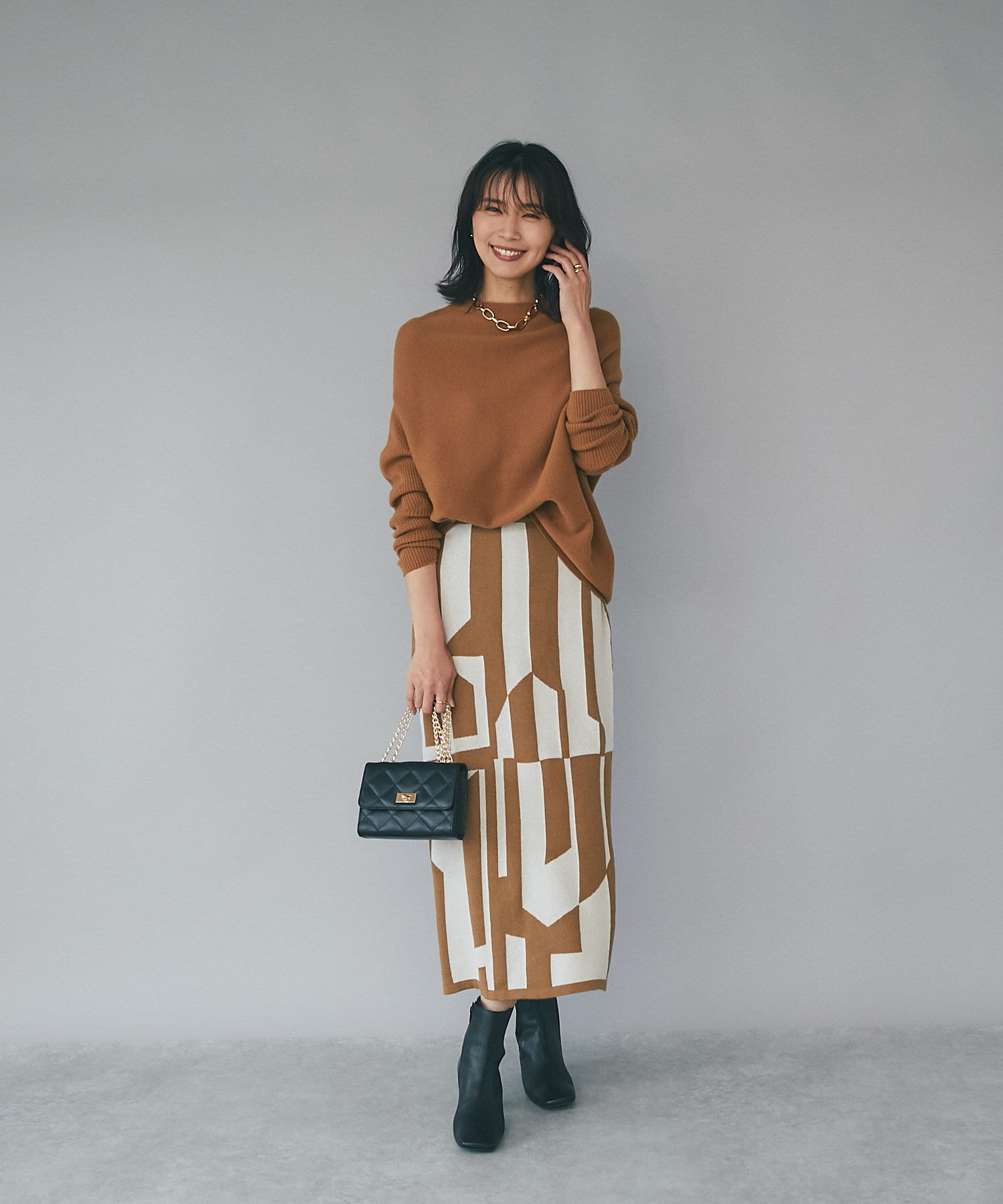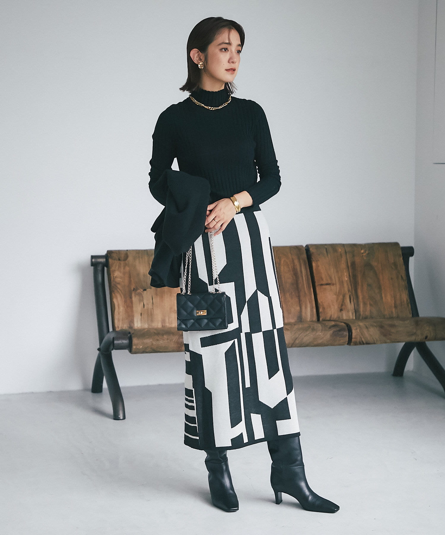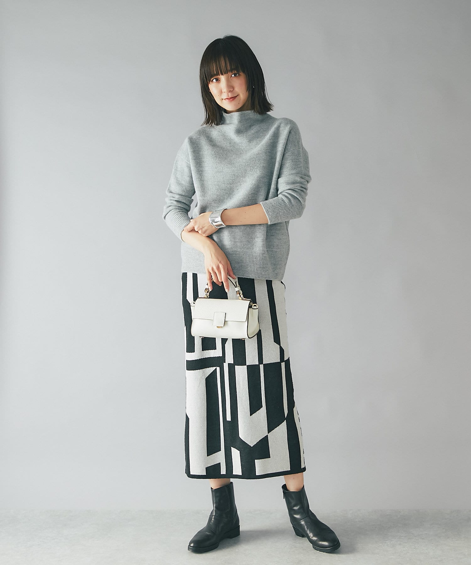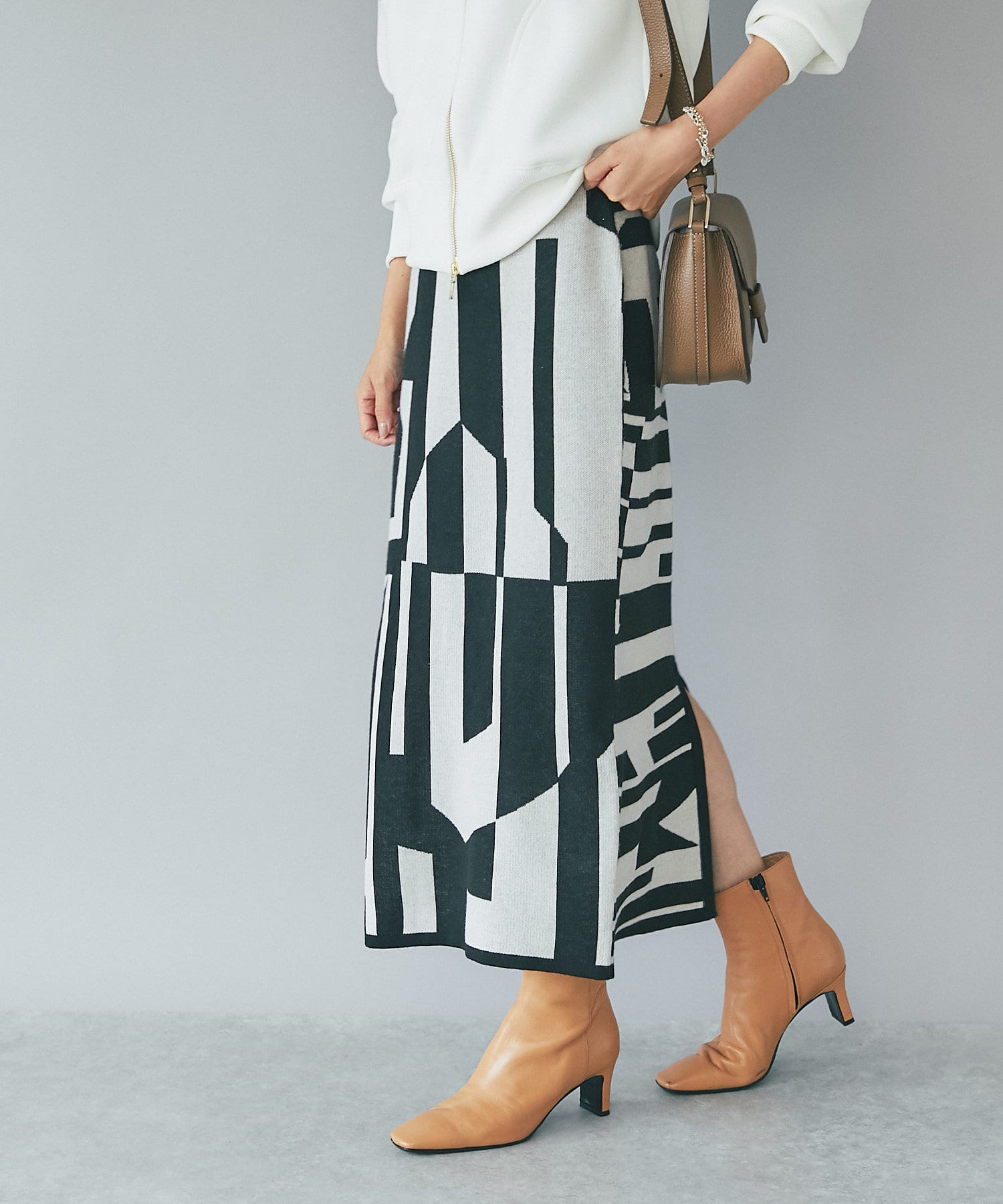 インパクトのあるジャガードが目を惹く今季らしいニットスカート。