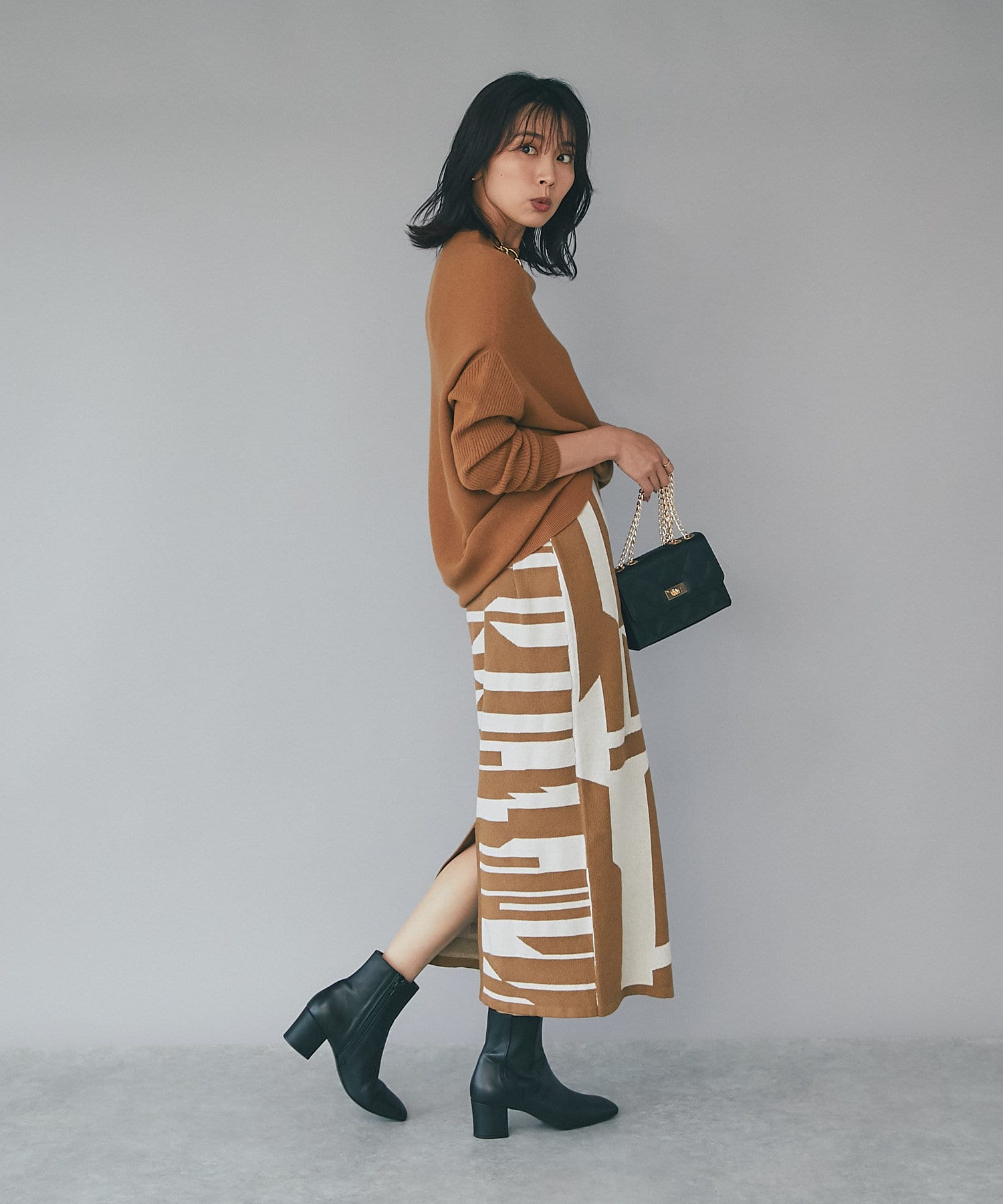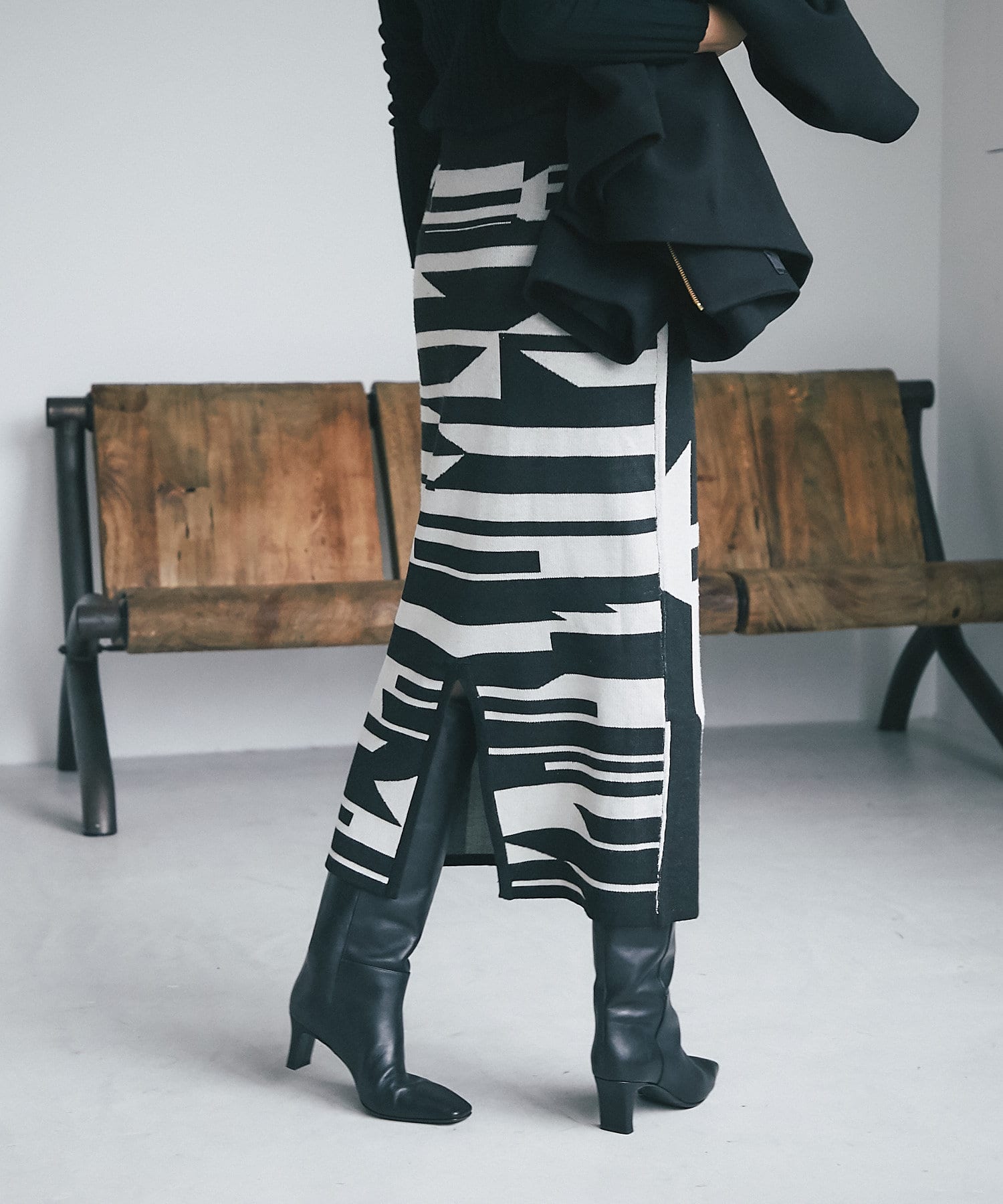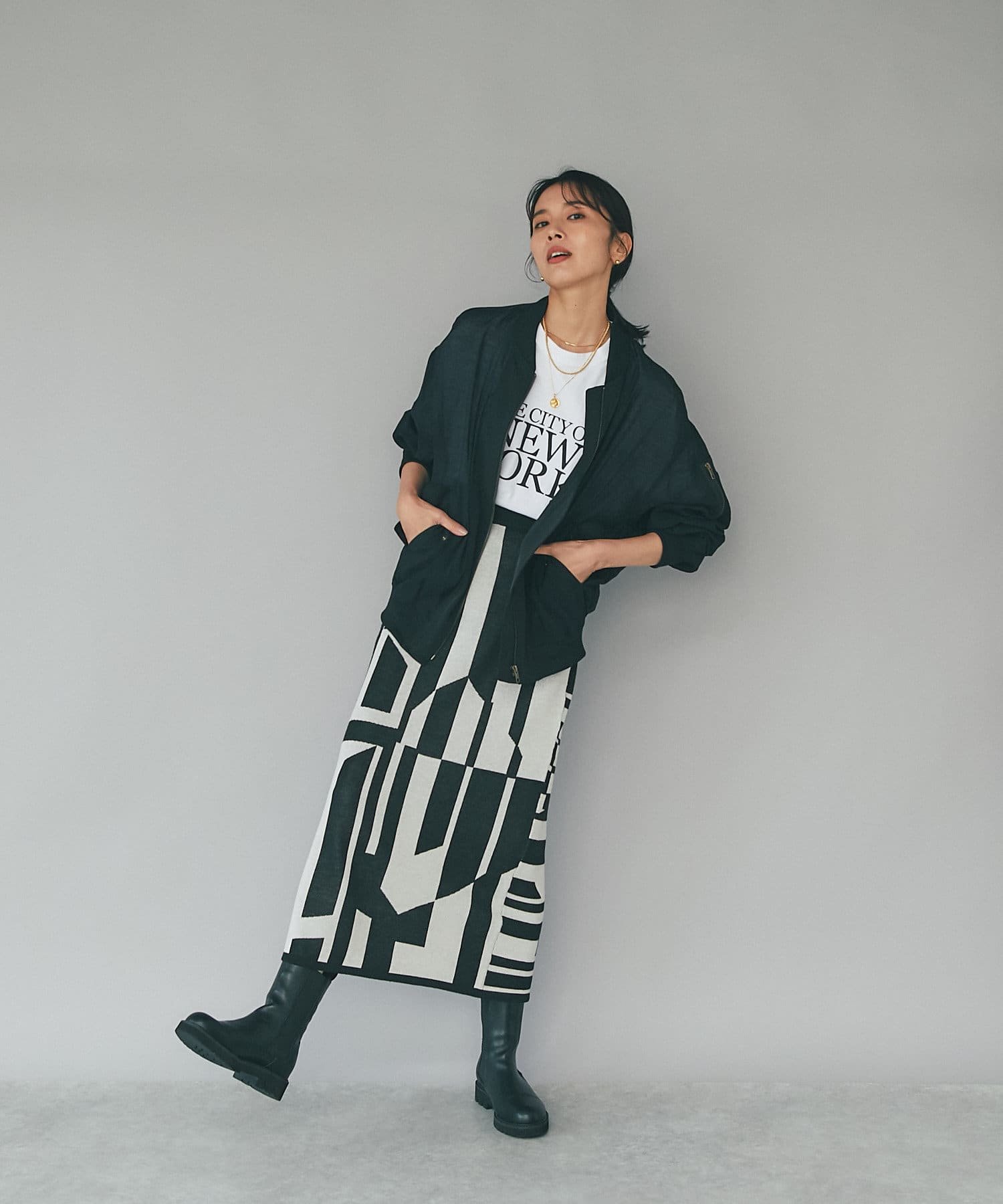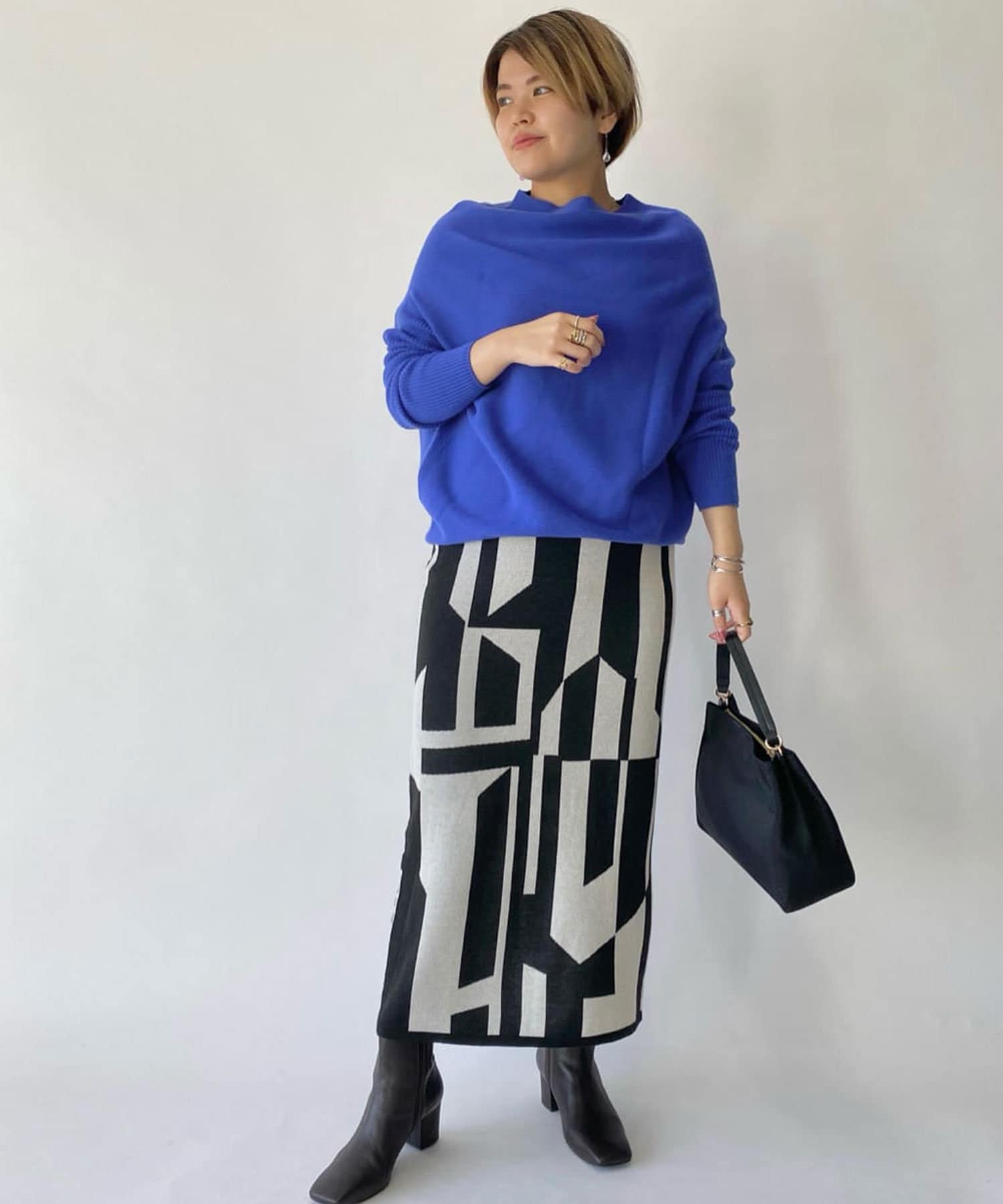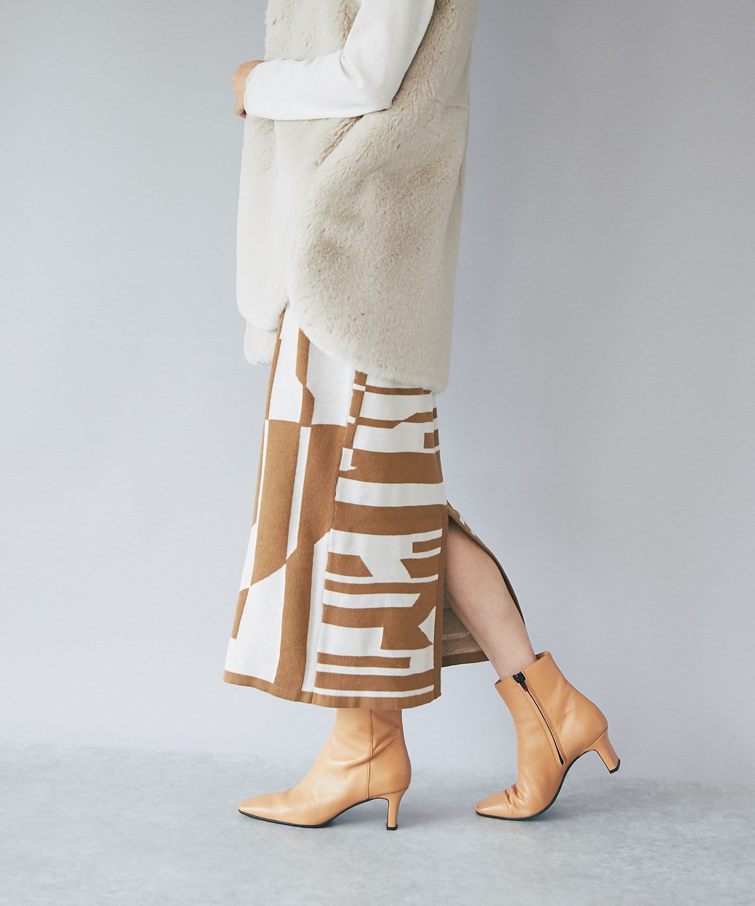 インパクトのあるジャガードが目を惹く今季らしいニットスカート。
