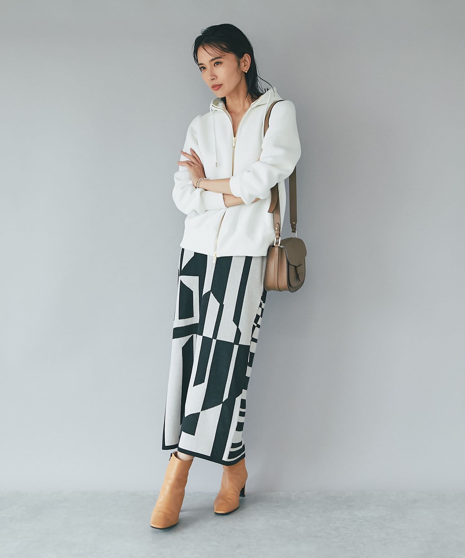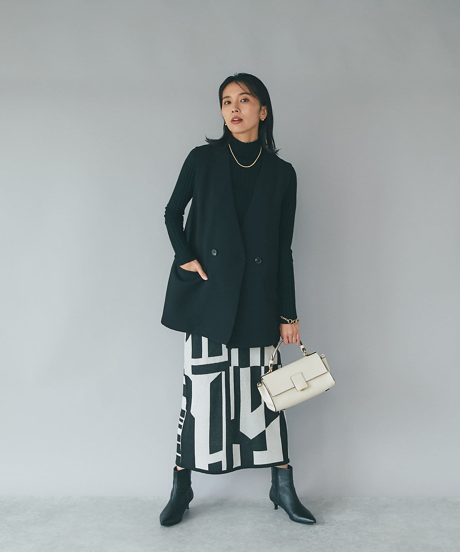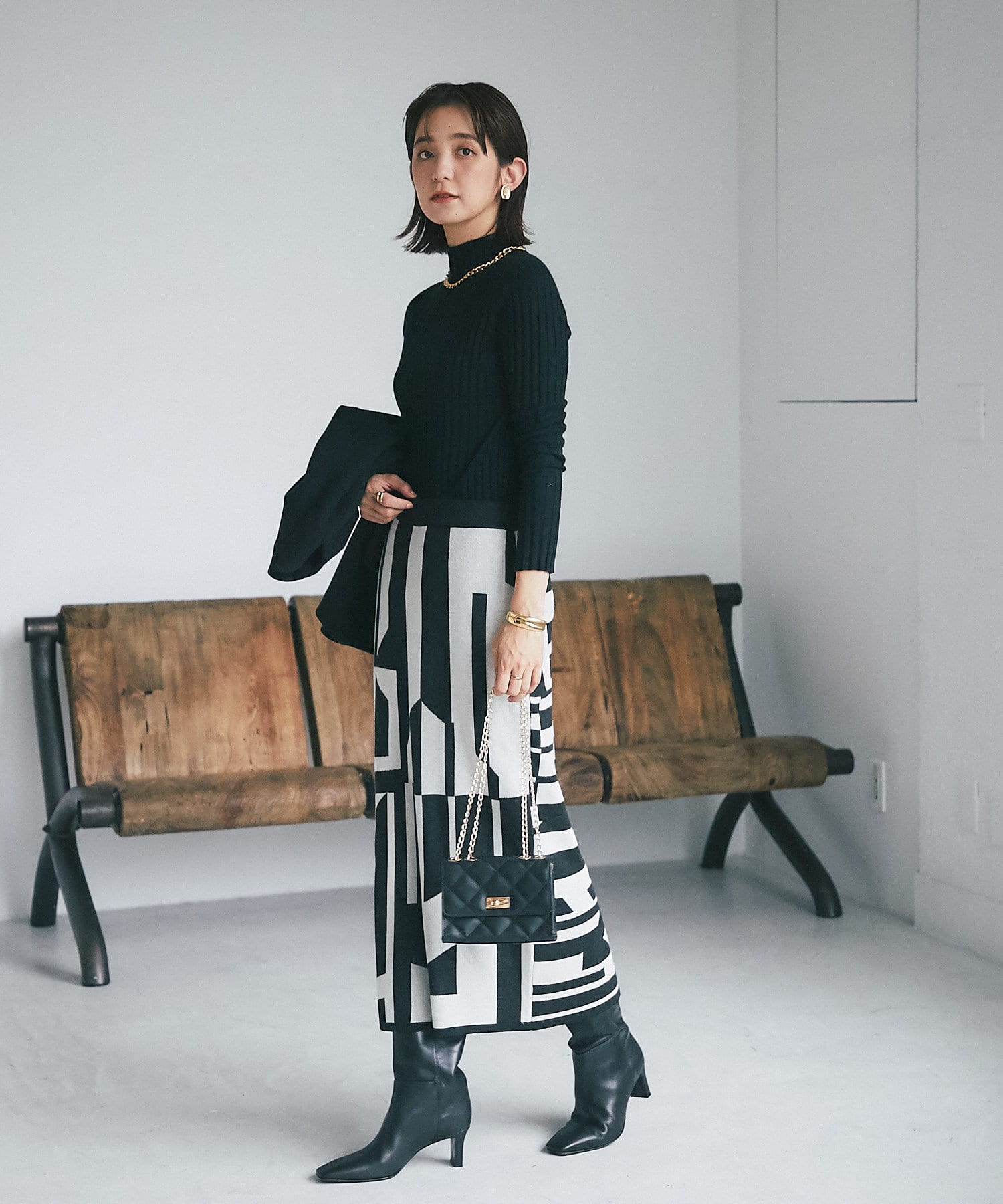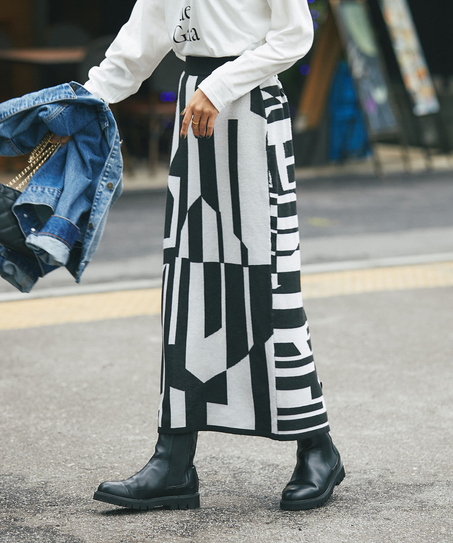 インパクトのあるジャガードが目を惹く今季らしいニットスカート。