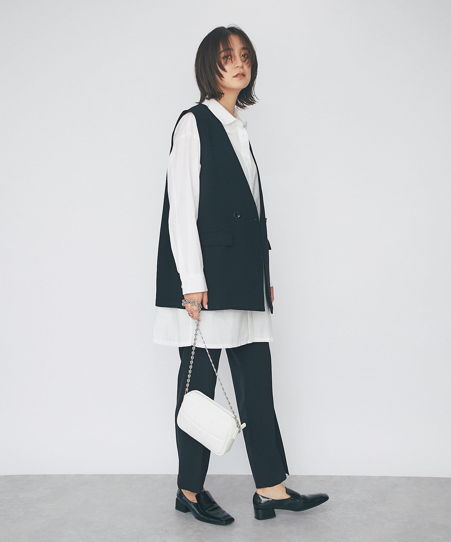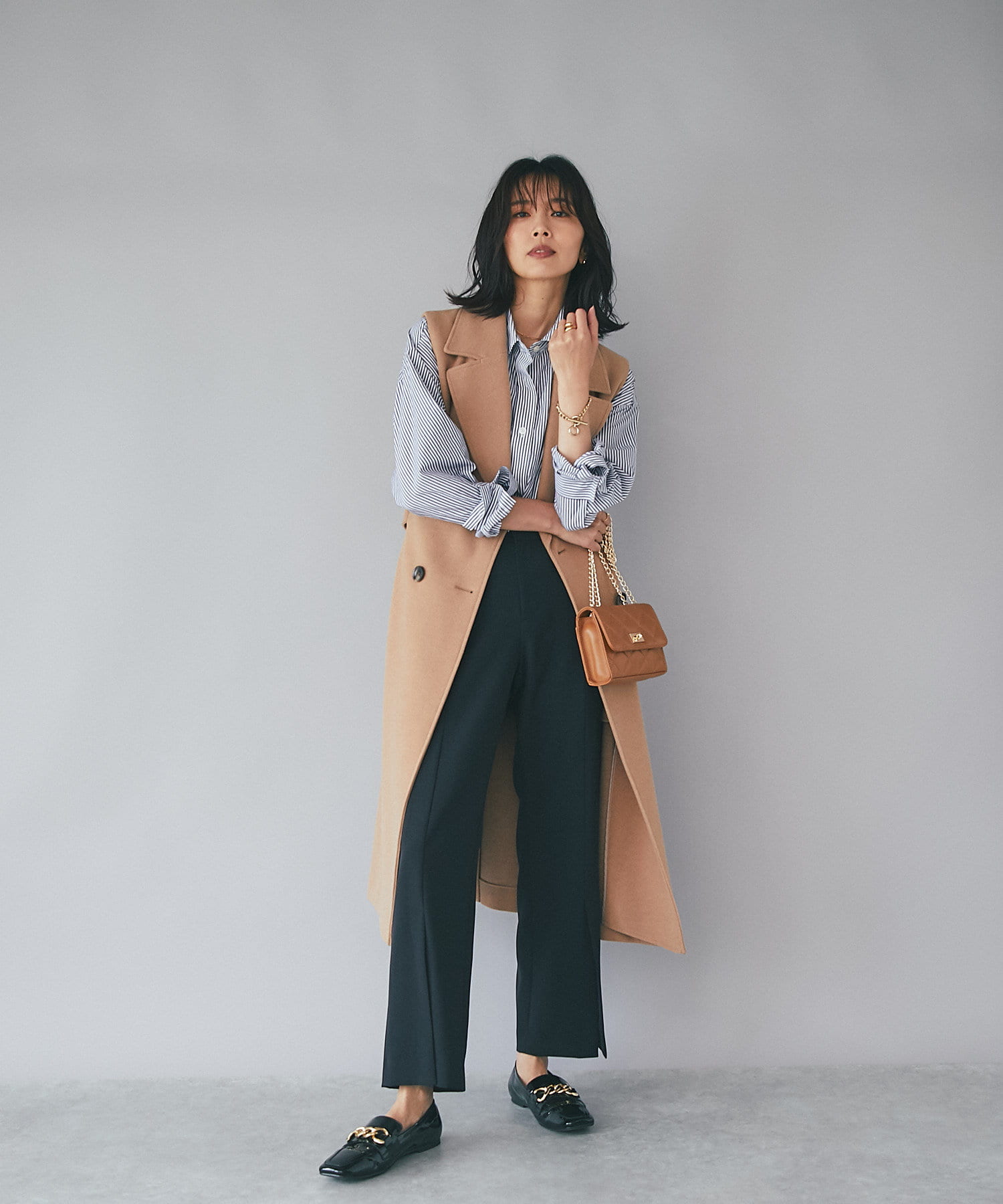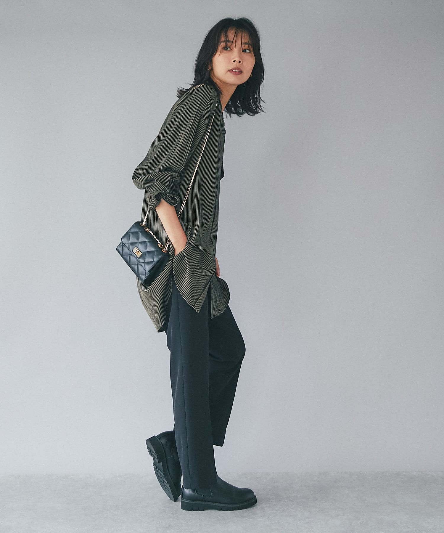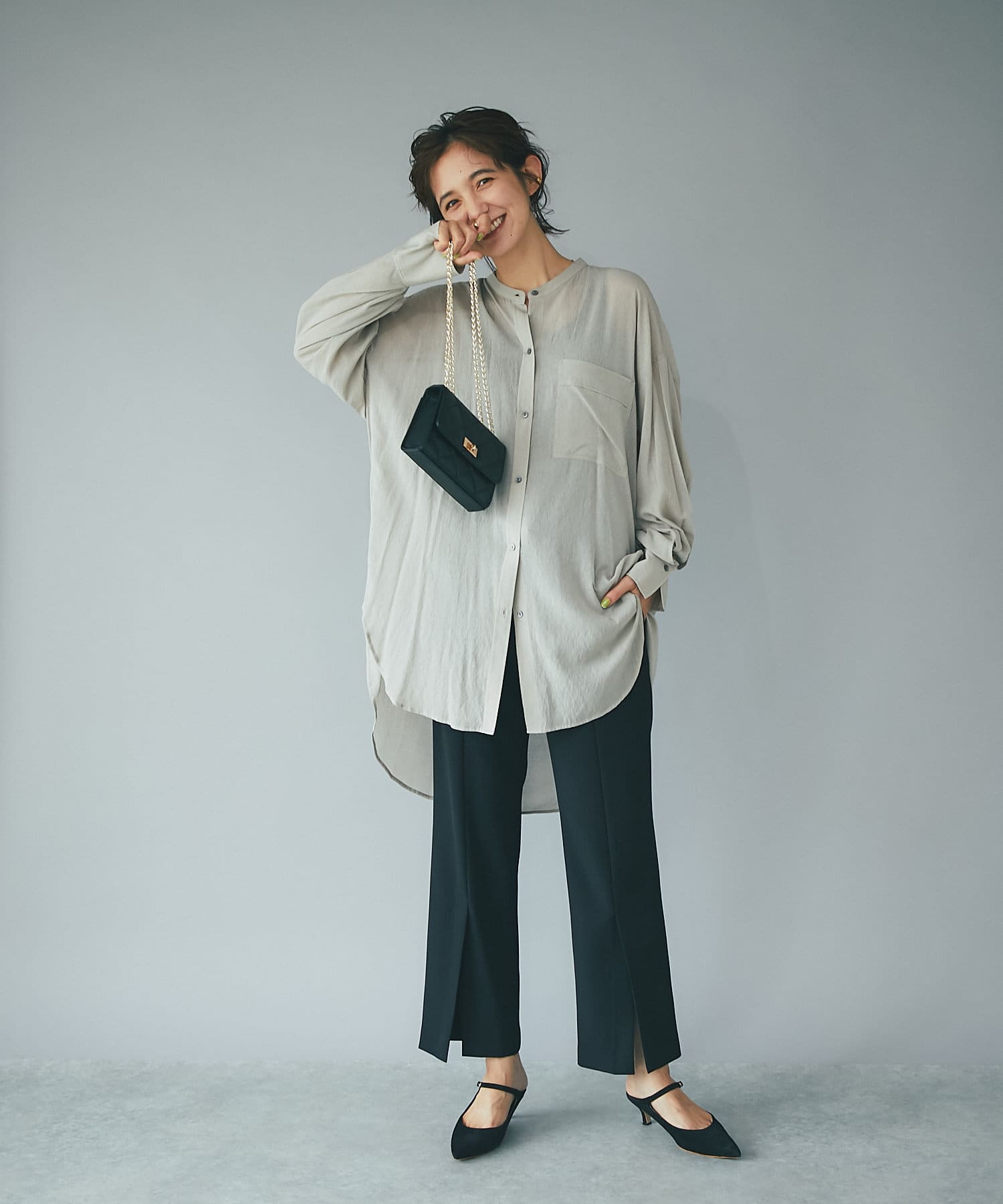 ポケットディティールシャツやストライプバックシャンシャツのような長めトップスとのハンサムコーデがオススメ。