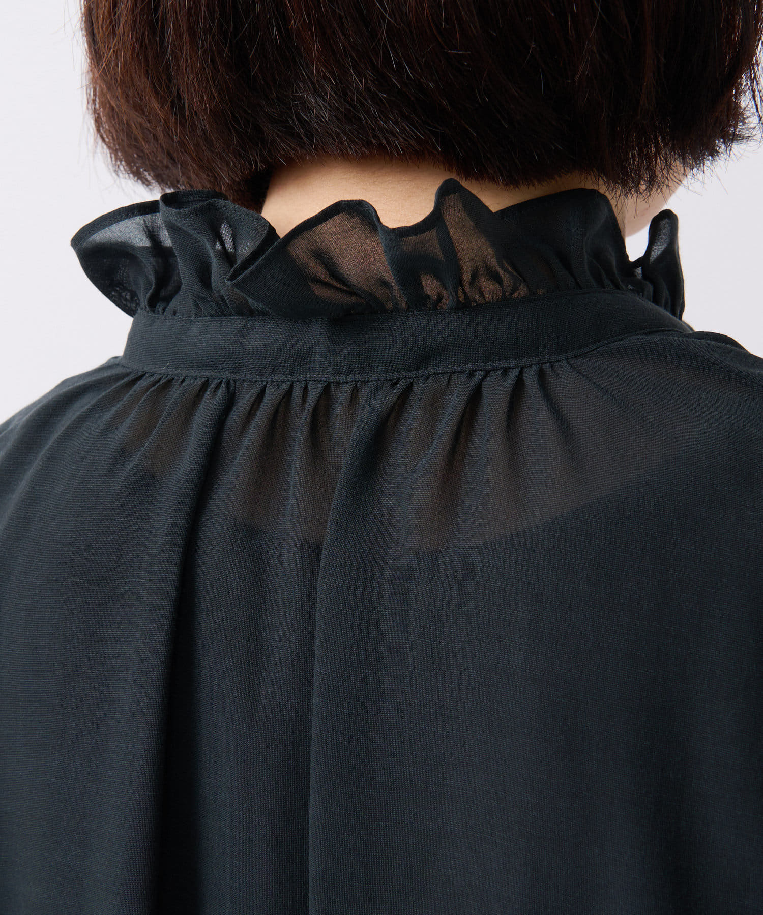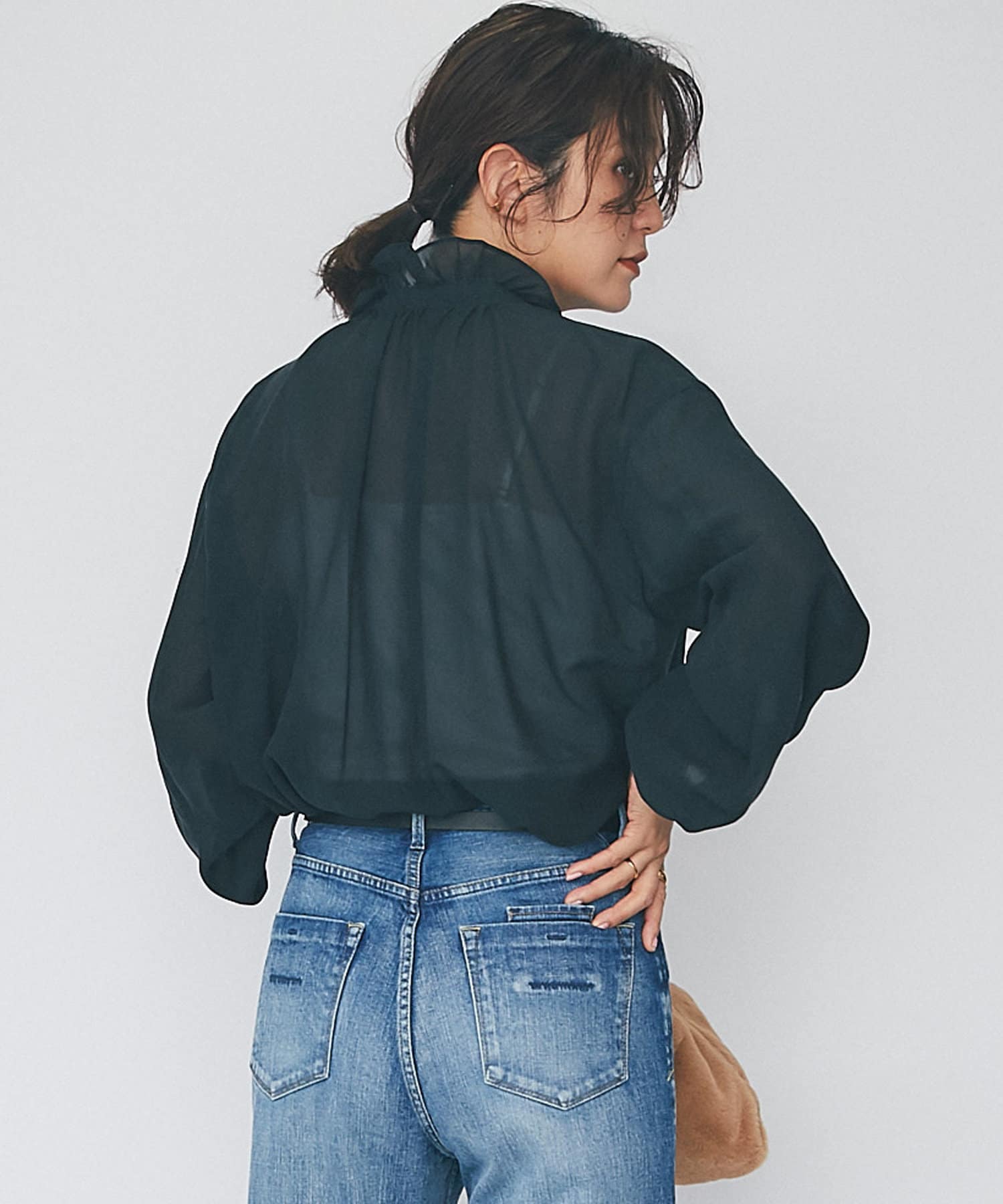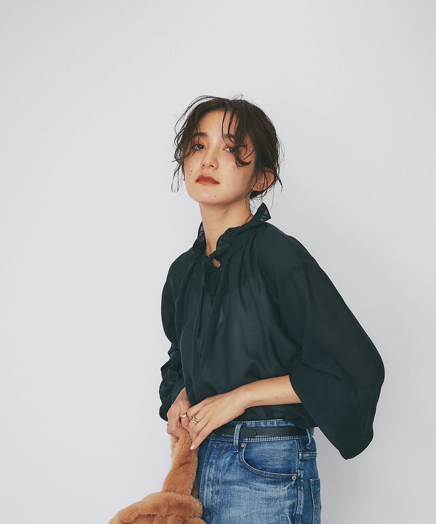 着こなしに繊細な甘さをプラスしてくれるペザント風フリルカラーブラウス。