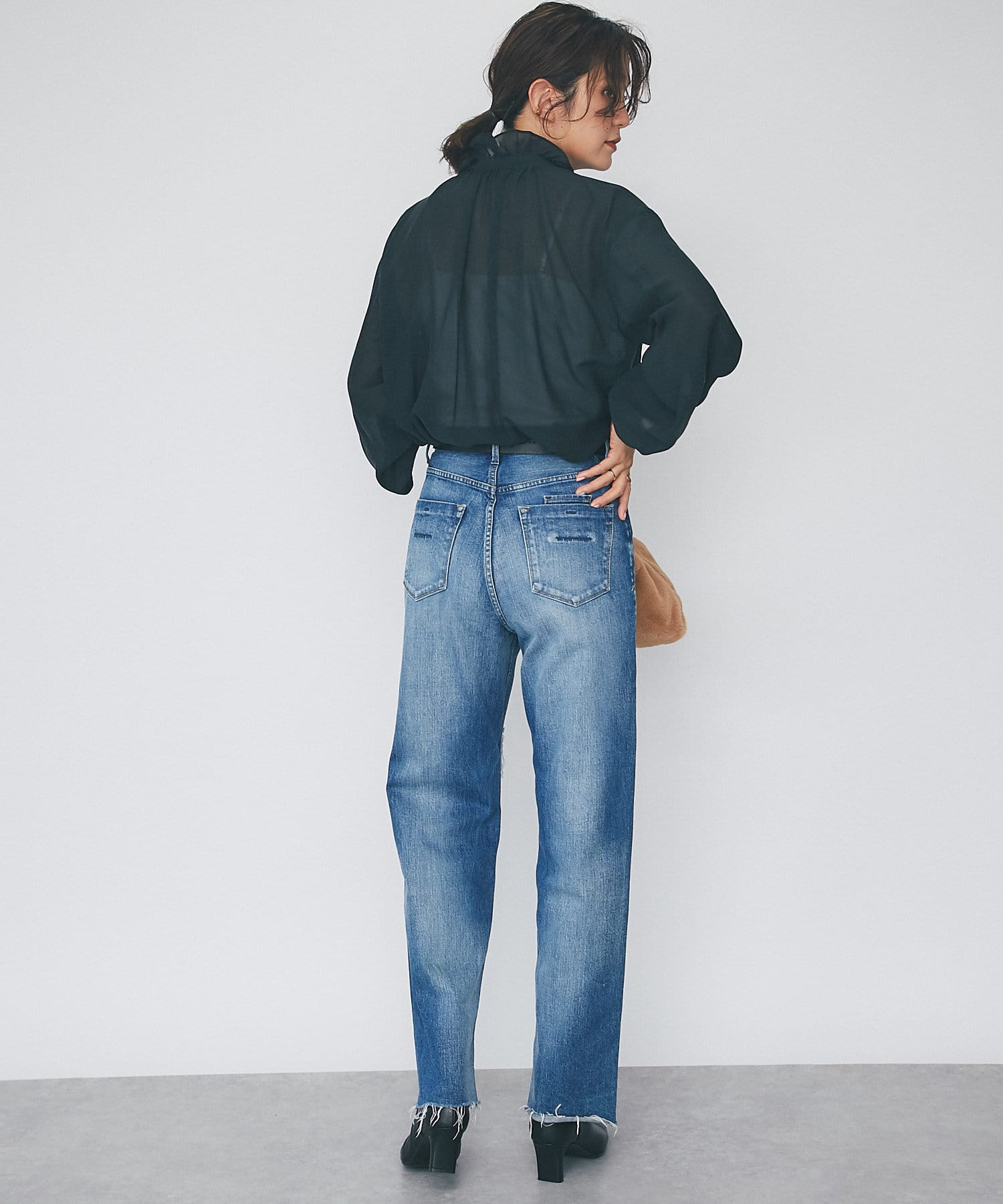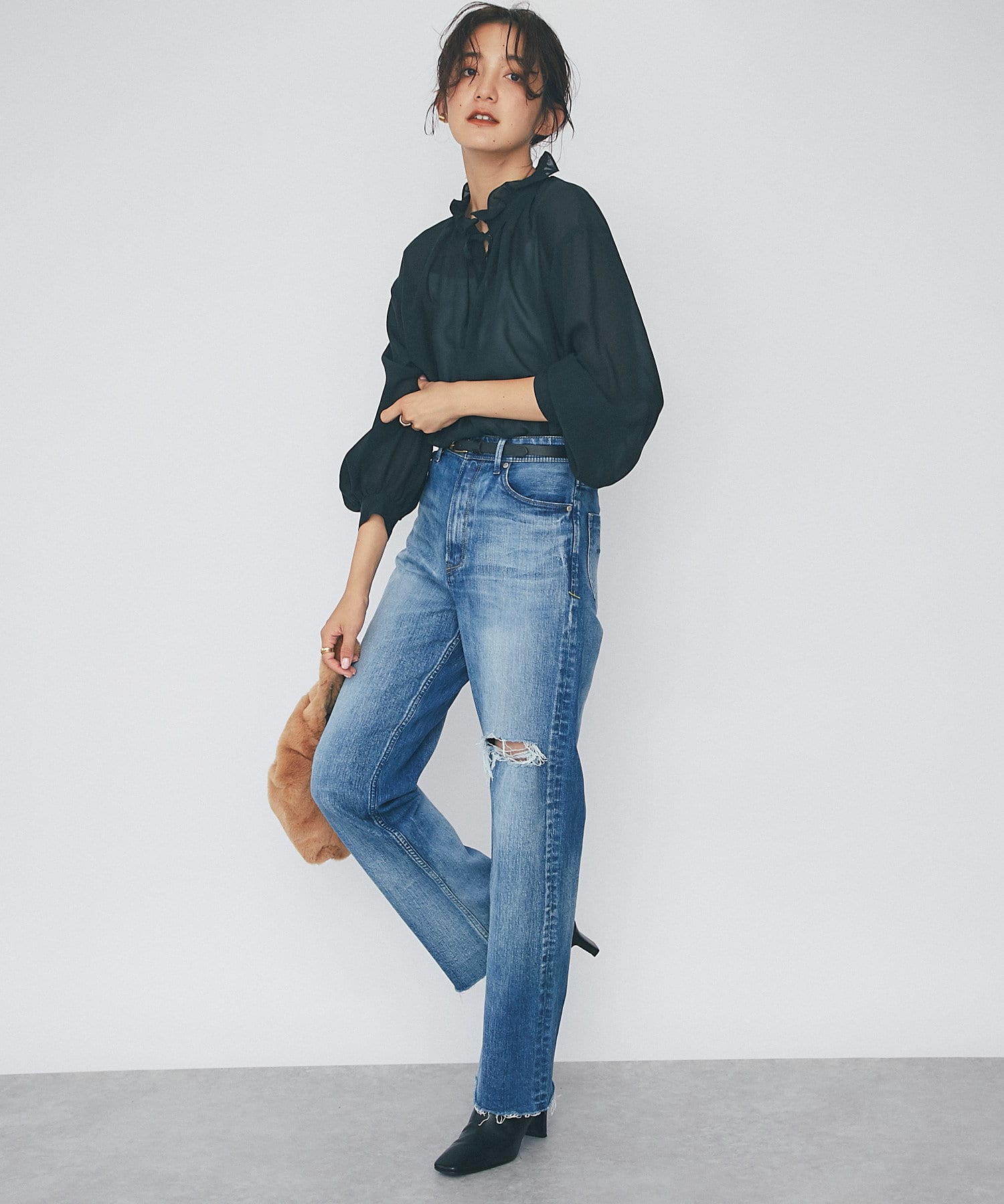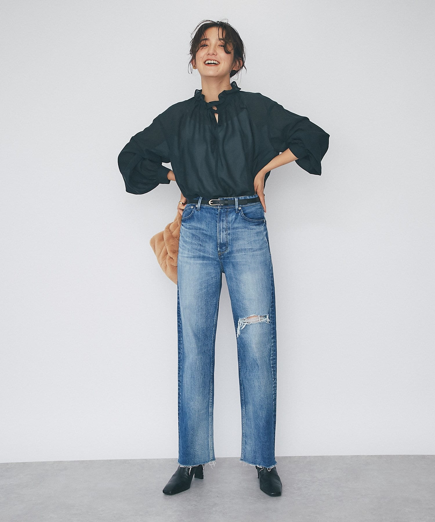 着こなしに繊細な甘さをプラスしてくれるペザント風フリルカラーブラウス。