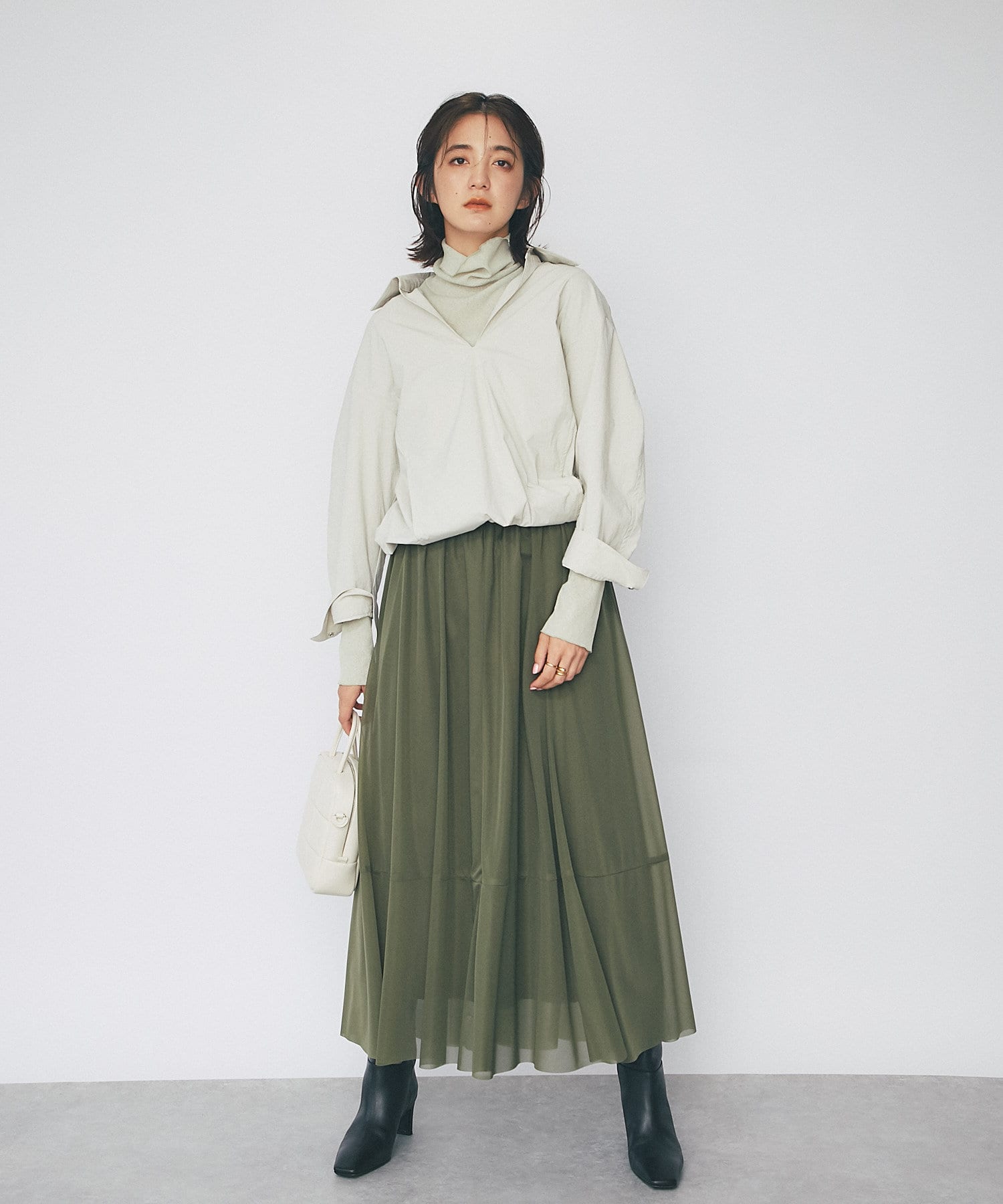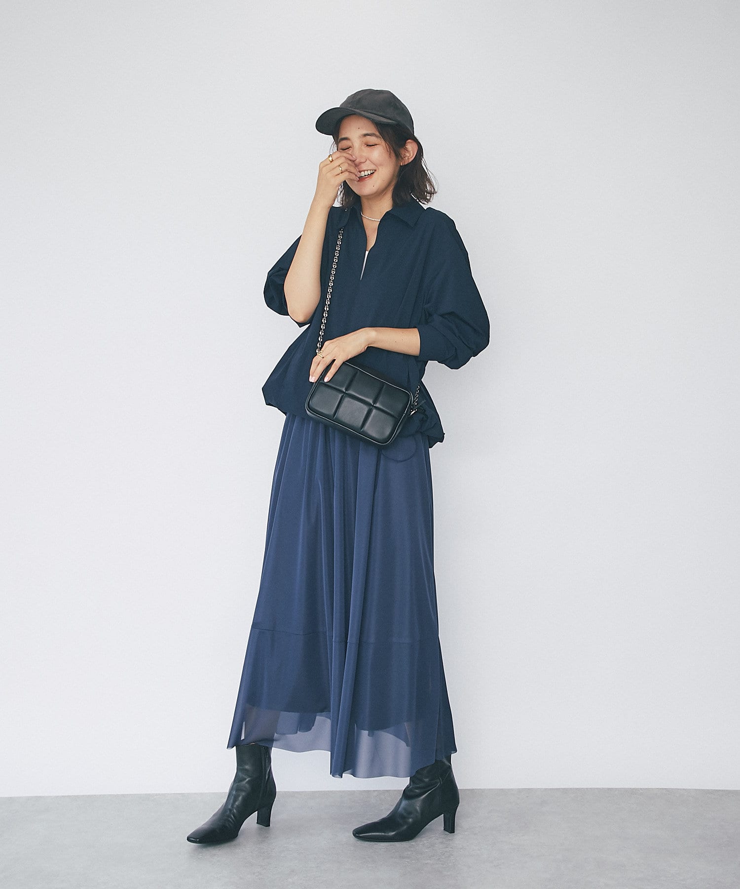 存在感のあるスキッパーカラーはVゾーンが顔まわりをすっきりと見せてくれ、今季注目のカラータートルとのレイヤードも決まります。