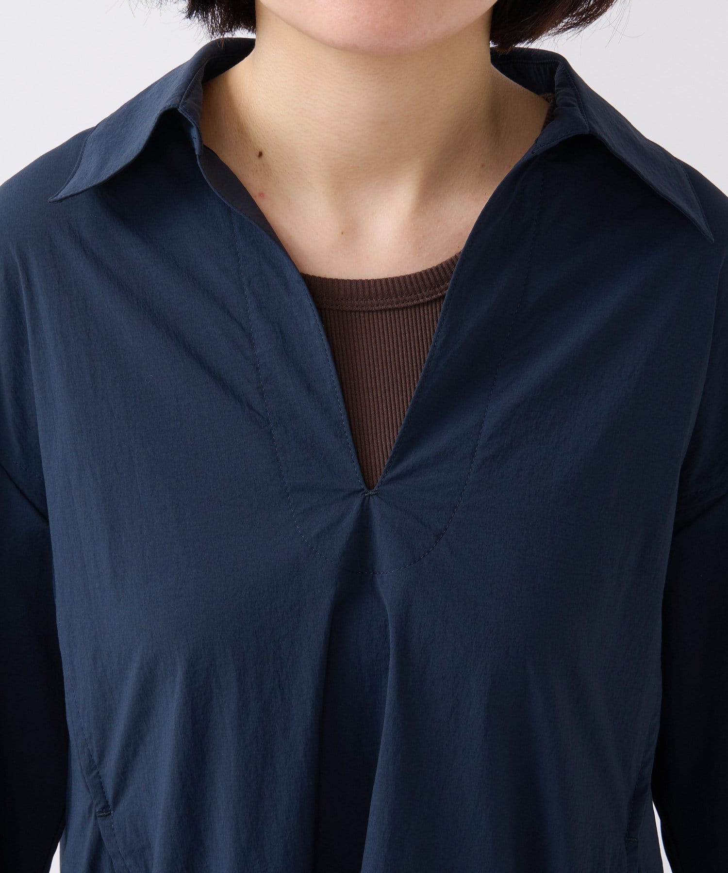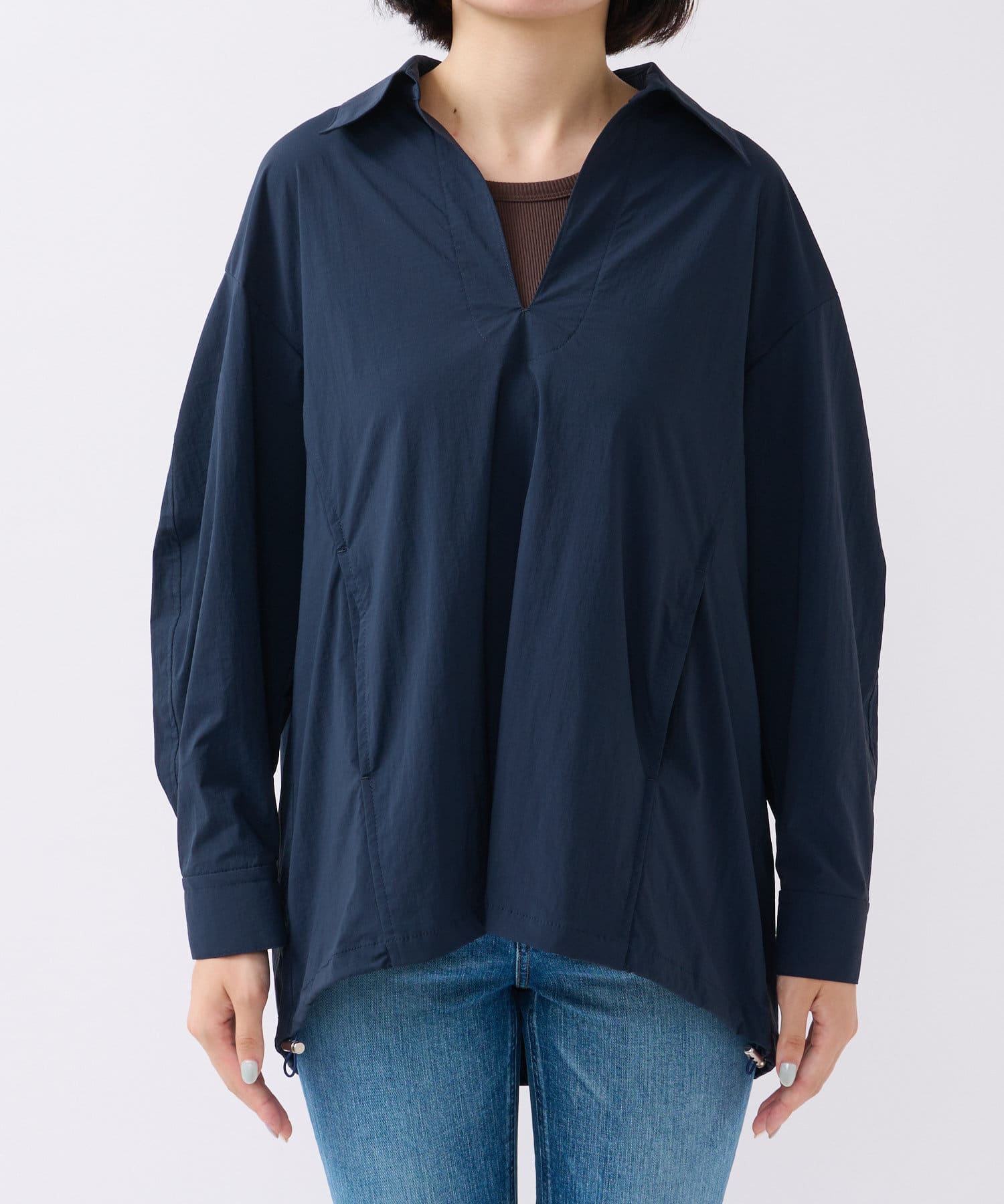ドライ感としなやかな風合いの生地を使用し、デザイン全体にアウトドアムードをプラスしたドロストシャツ。