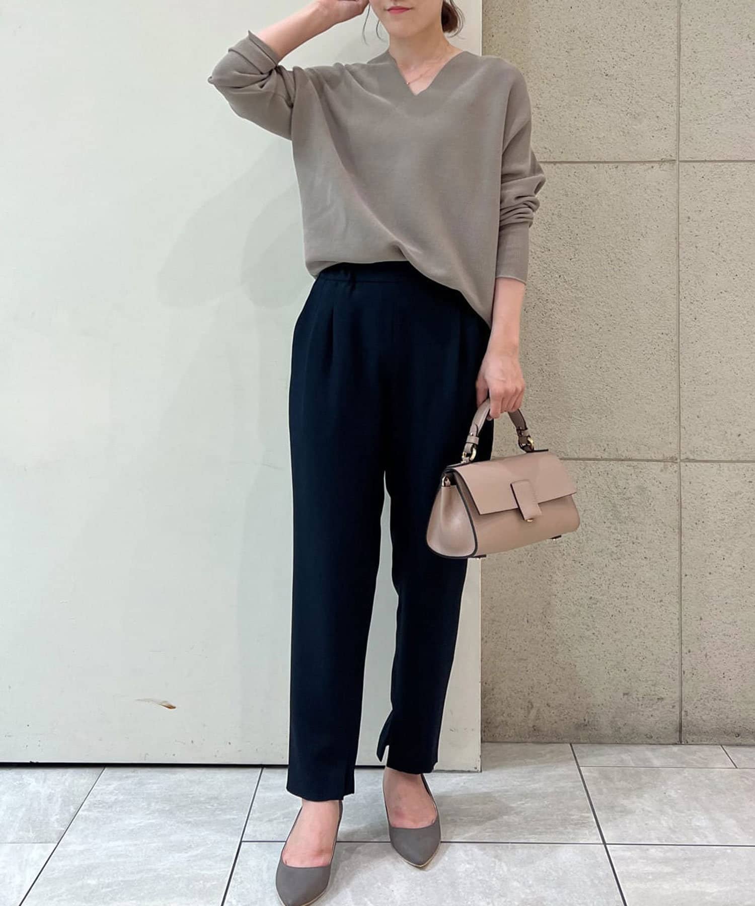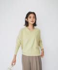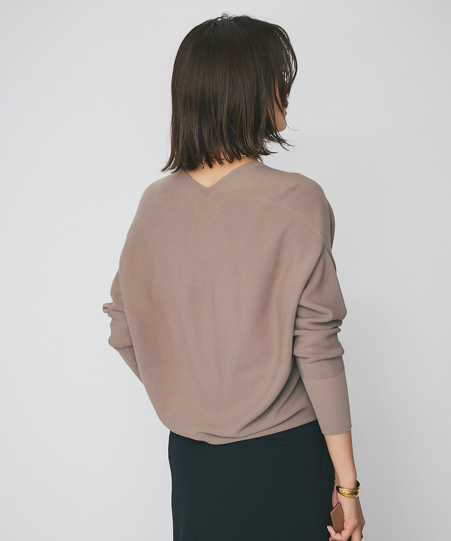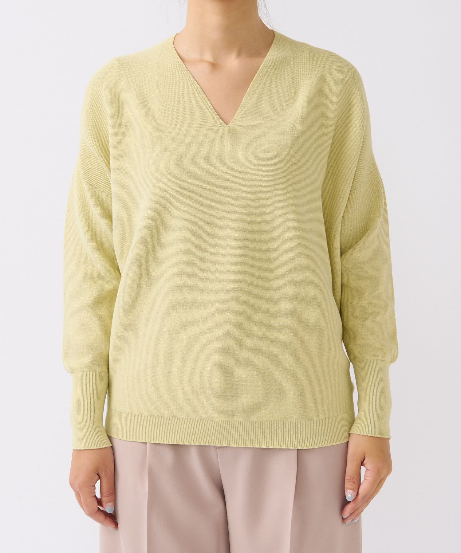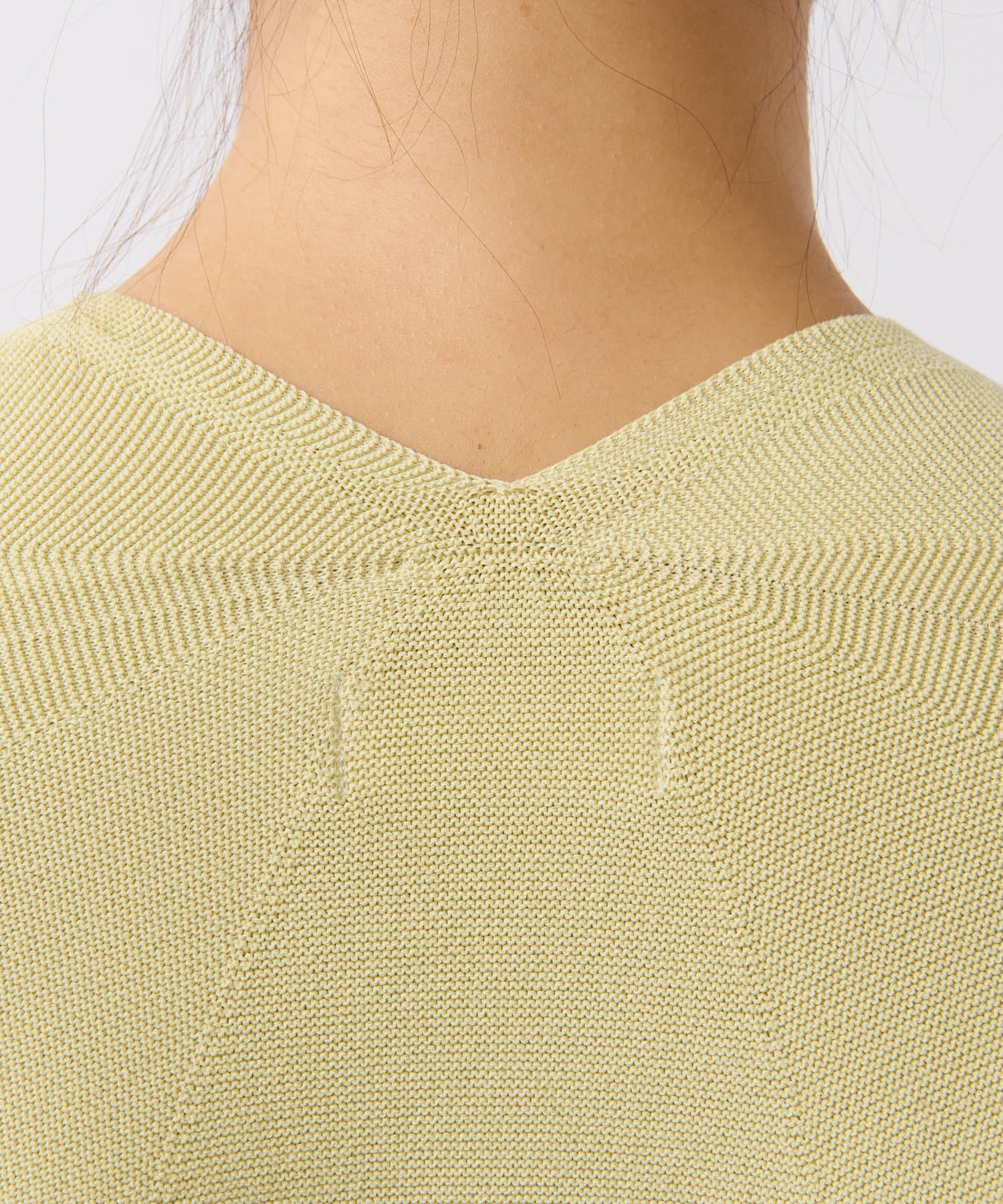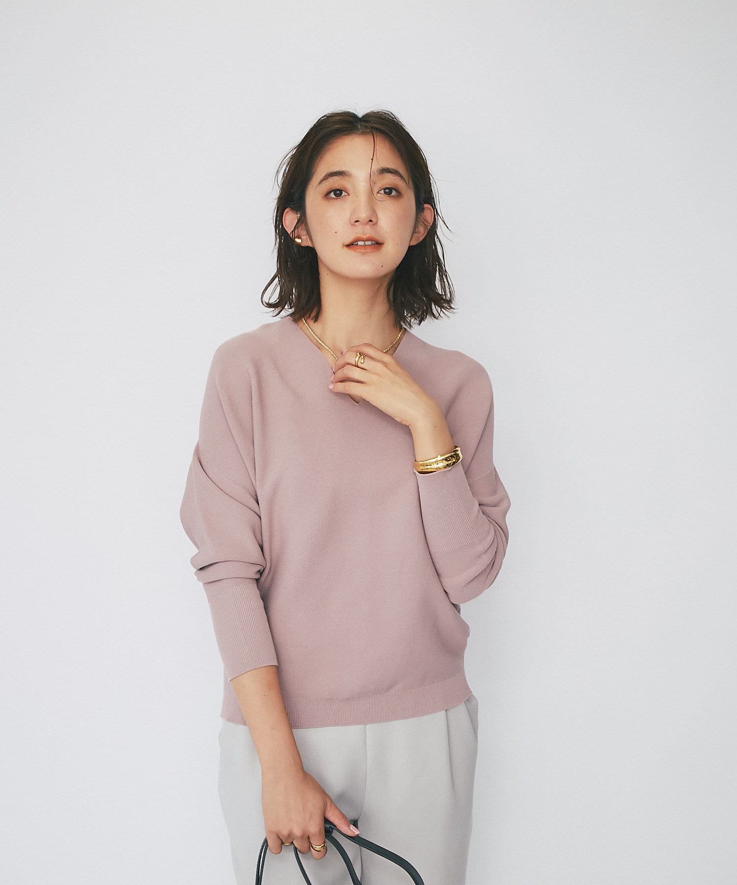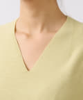 首元を華やかに見せるVネックで女性らしく着用していただけ、ショートネックレスなどのアクセサリーを引き立てるネックラインです。