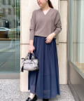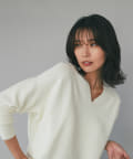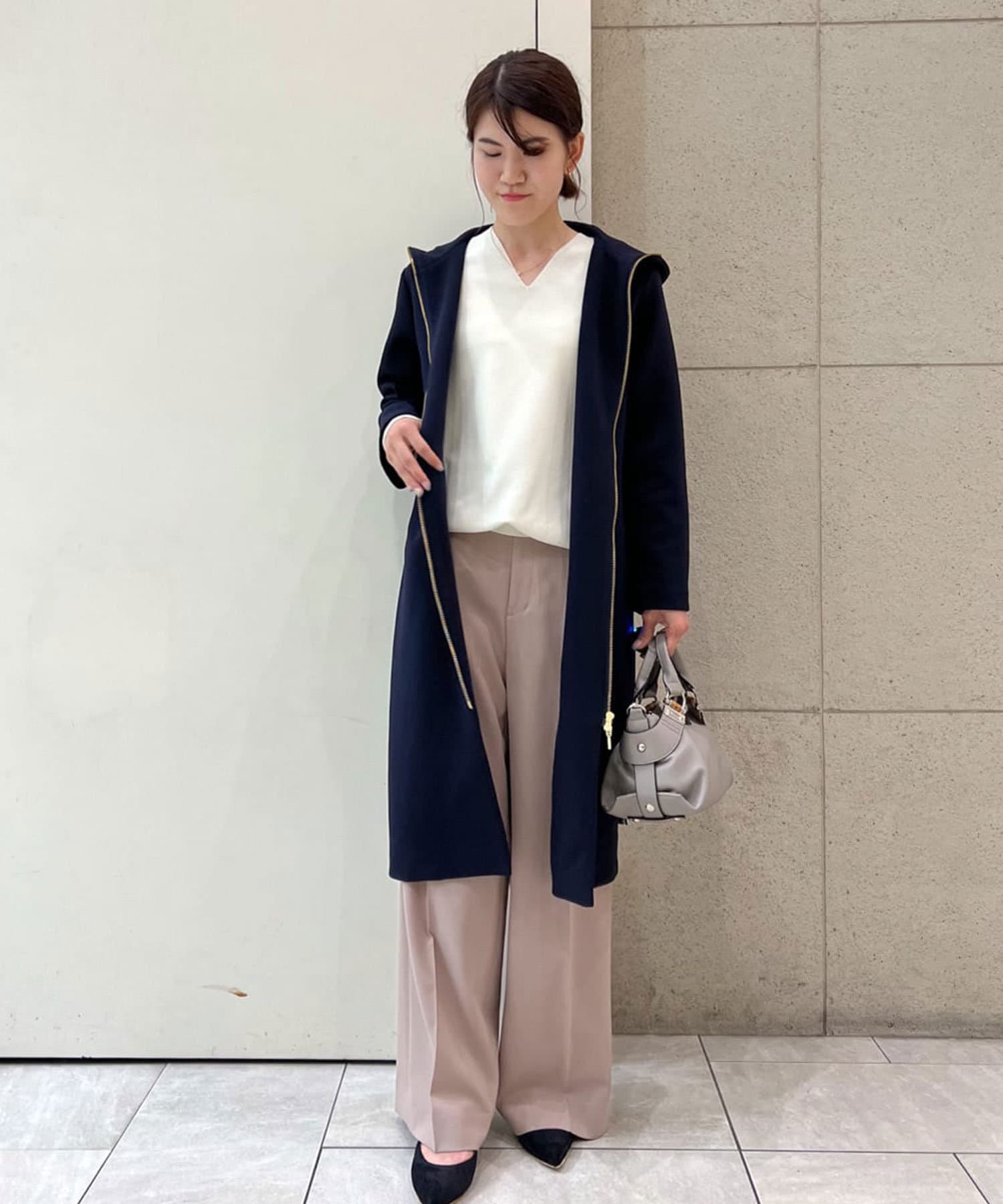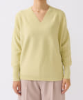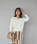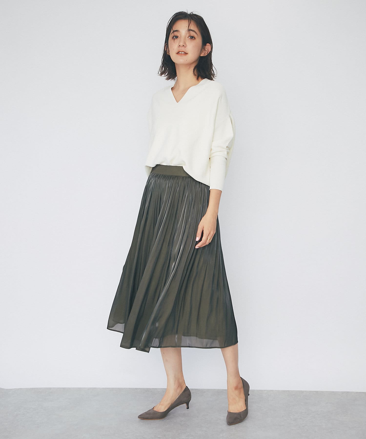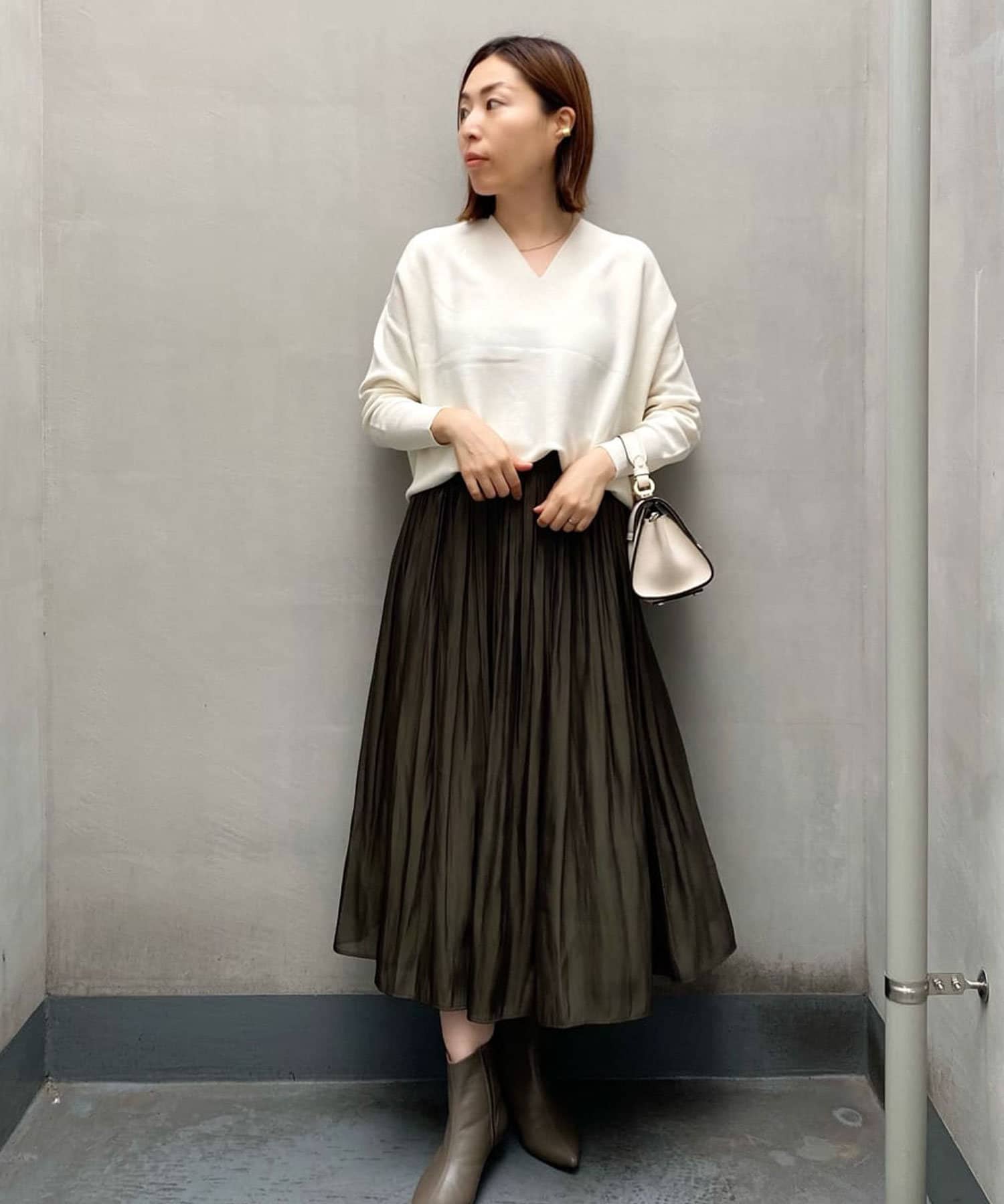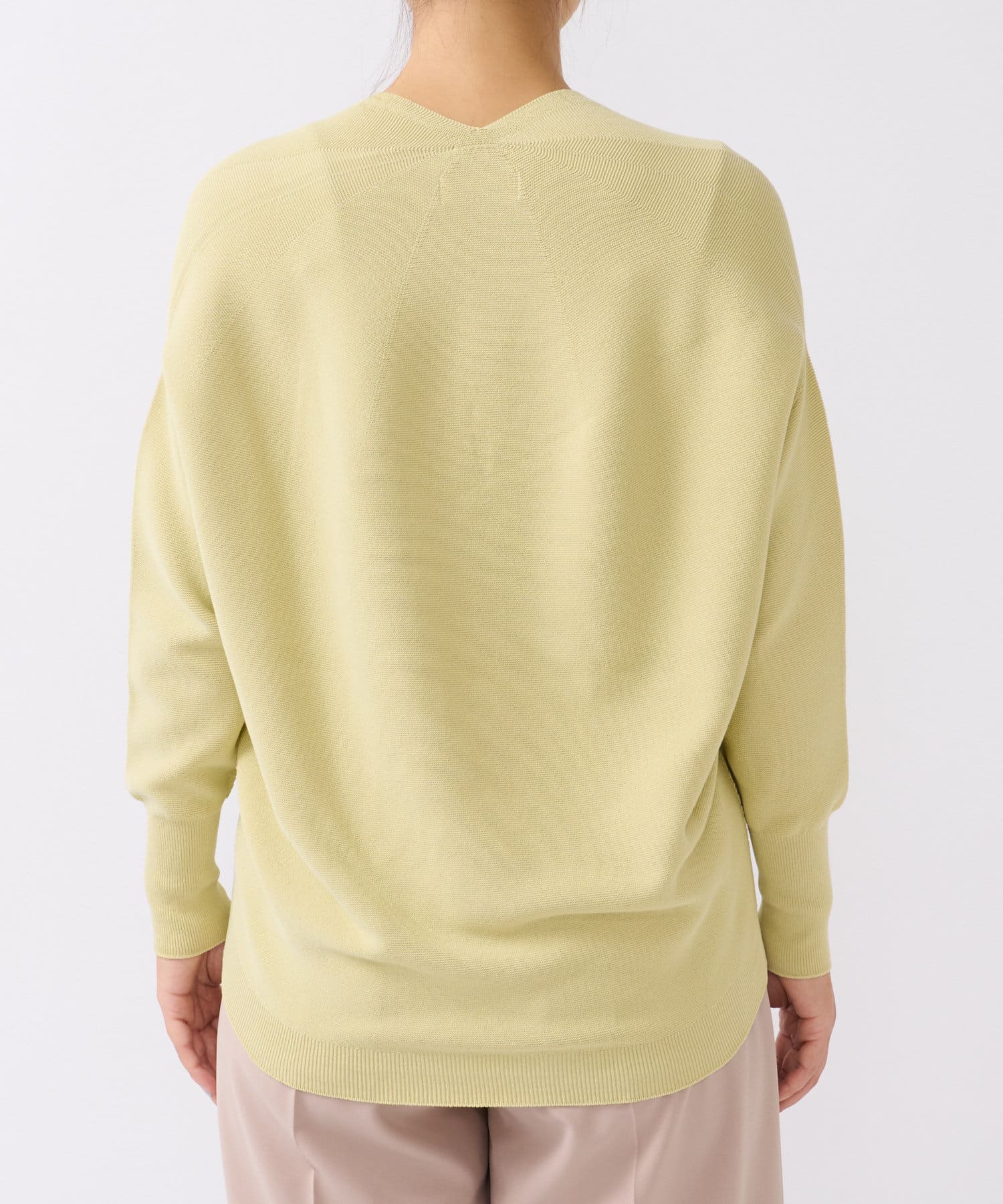 首元を華やかに見せるVネックで女性らしく着用していただけ、ショートネックレスなどのアクセサリーを引き立てるネックラインです。