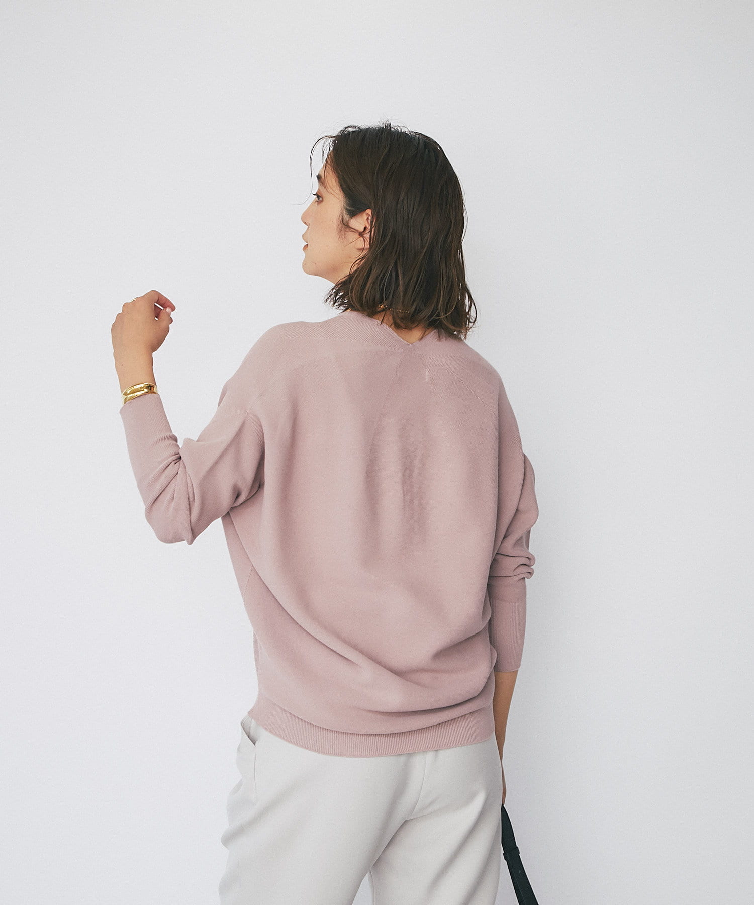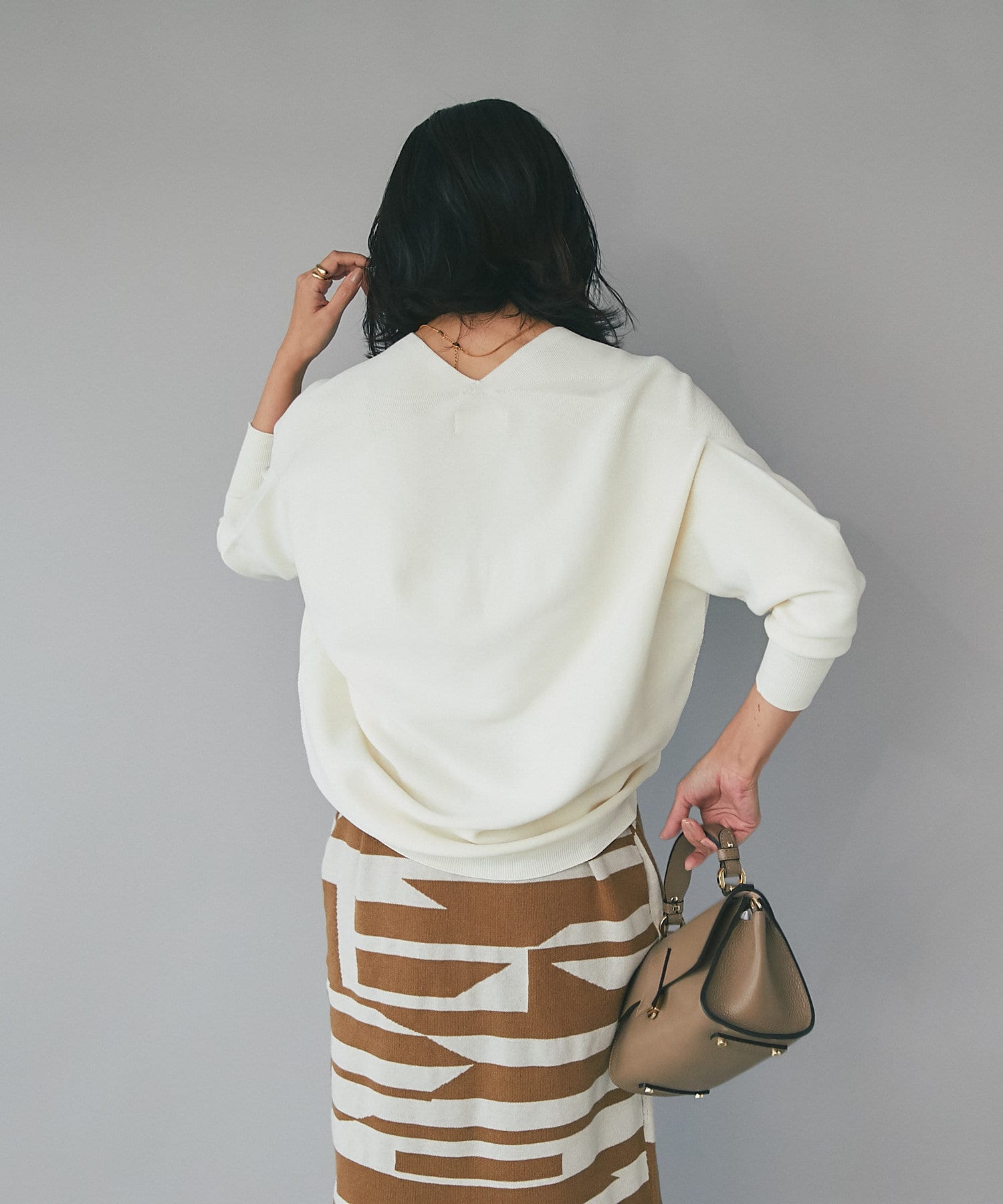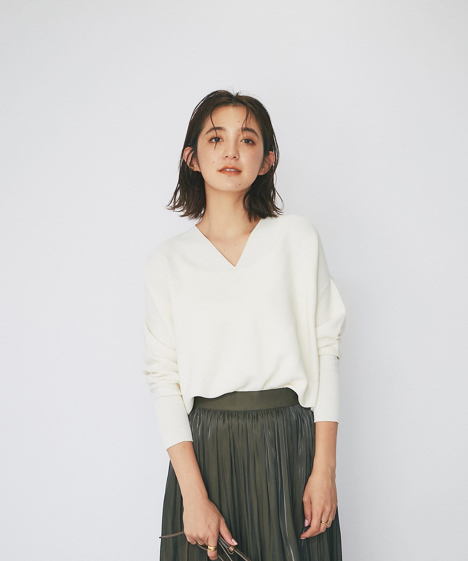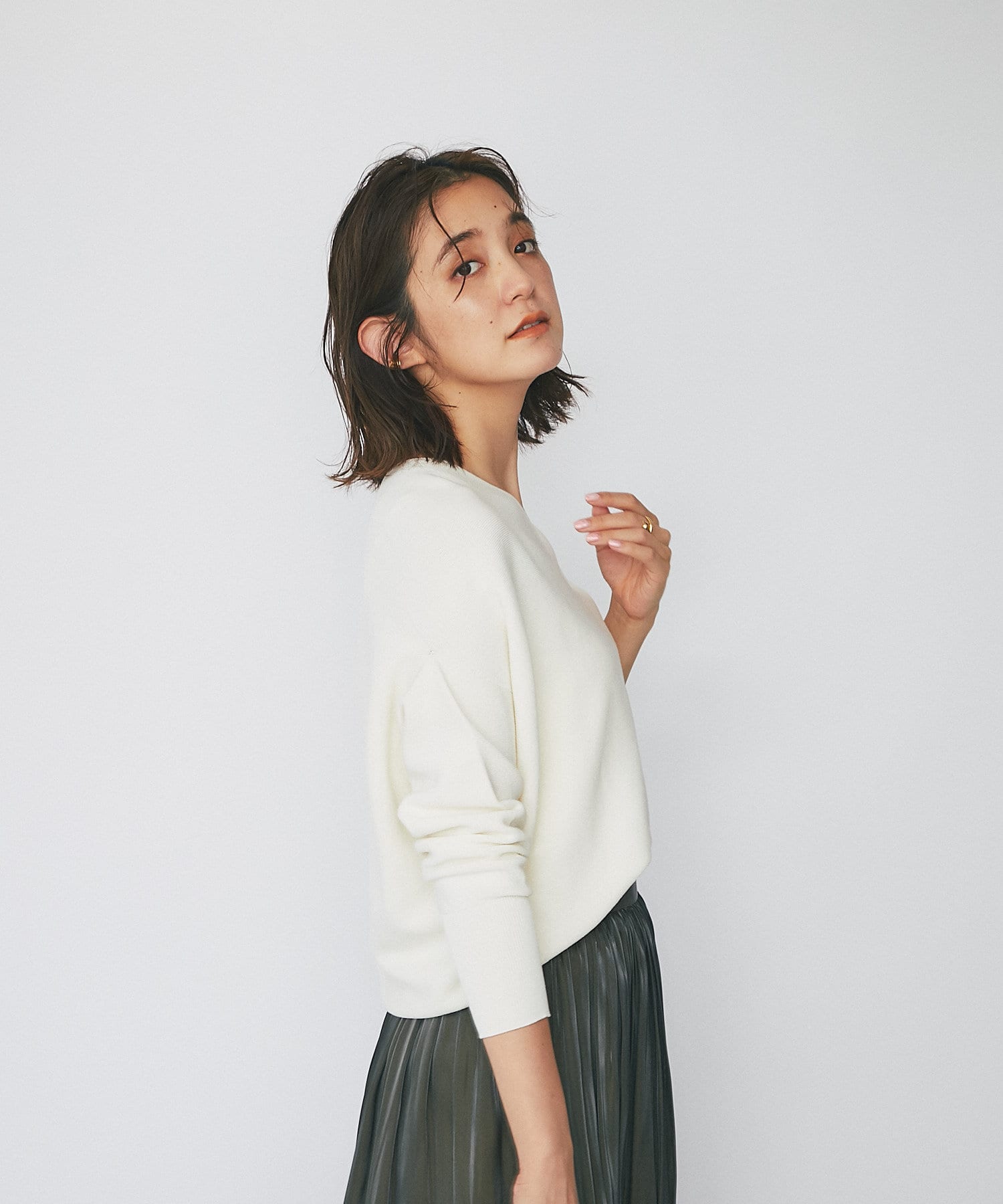 オンオフ兼用でボトムを選ばずに使えるシンプルさが引き立つニットは、今季一枚は持っておきたいアイテム。