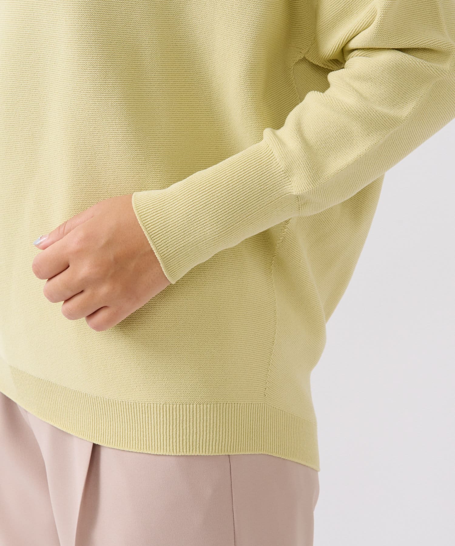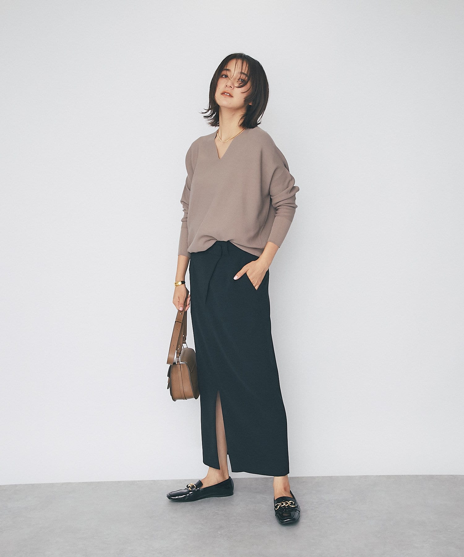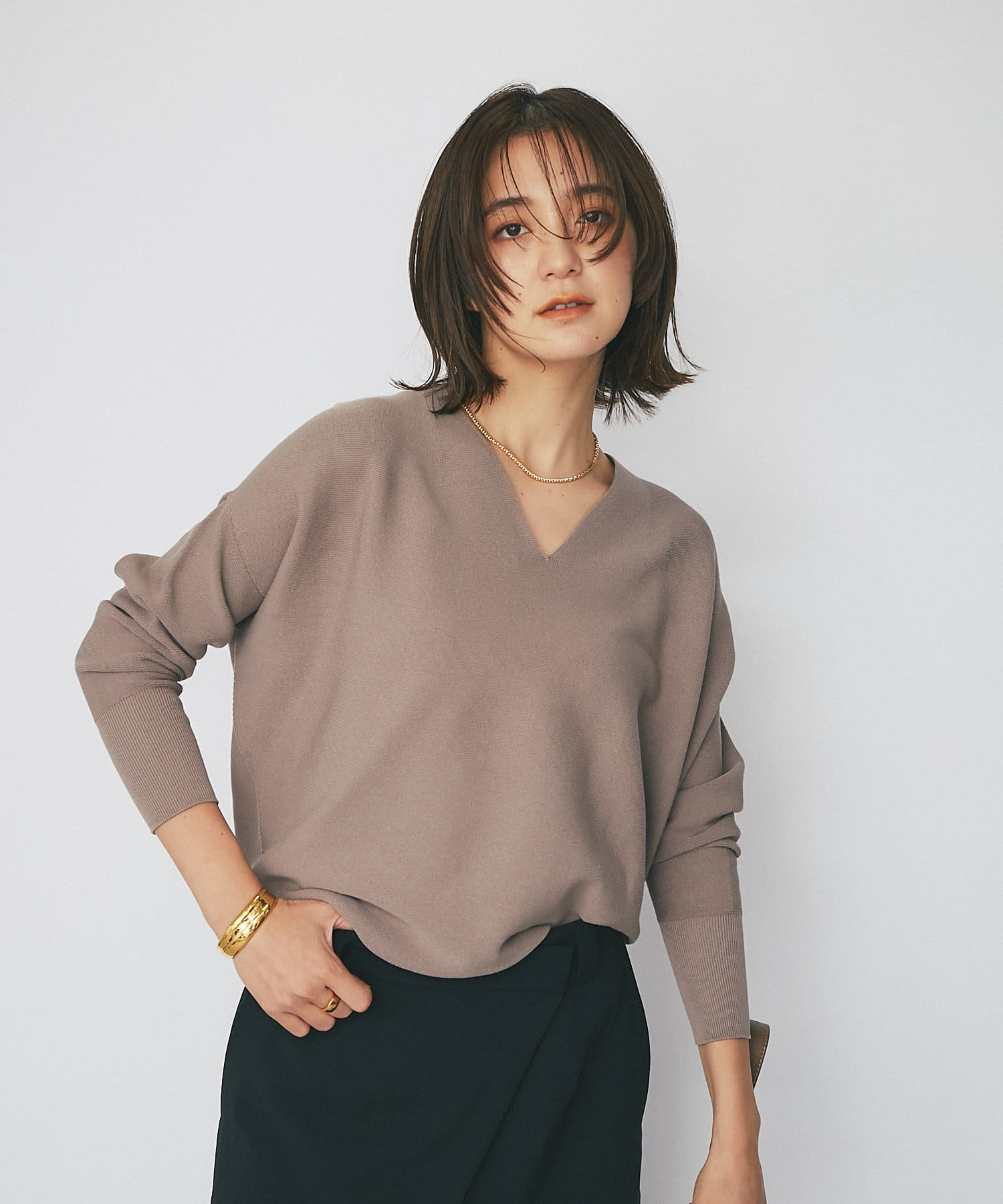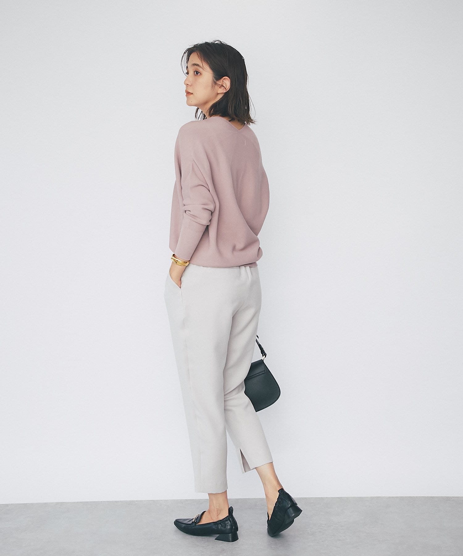 オンオフ兼用でボトムを選ばずに使えるシンプルさが引き立つニットは、今季一枚は持っておきたいアイテム。