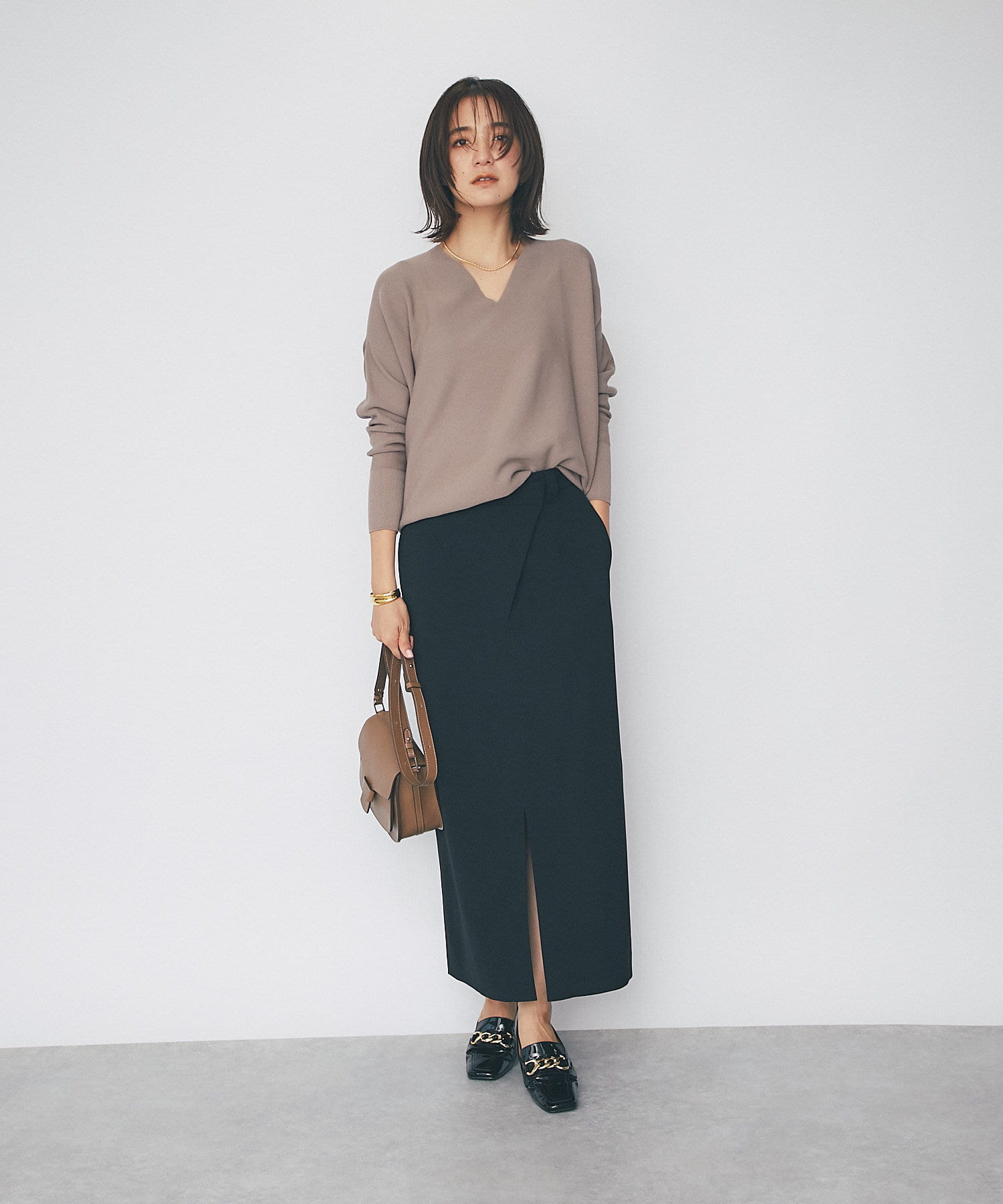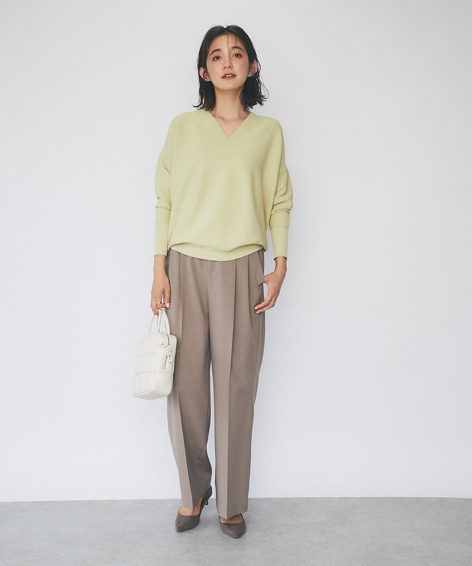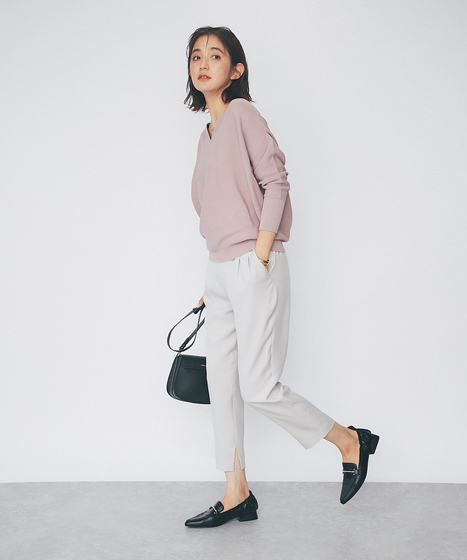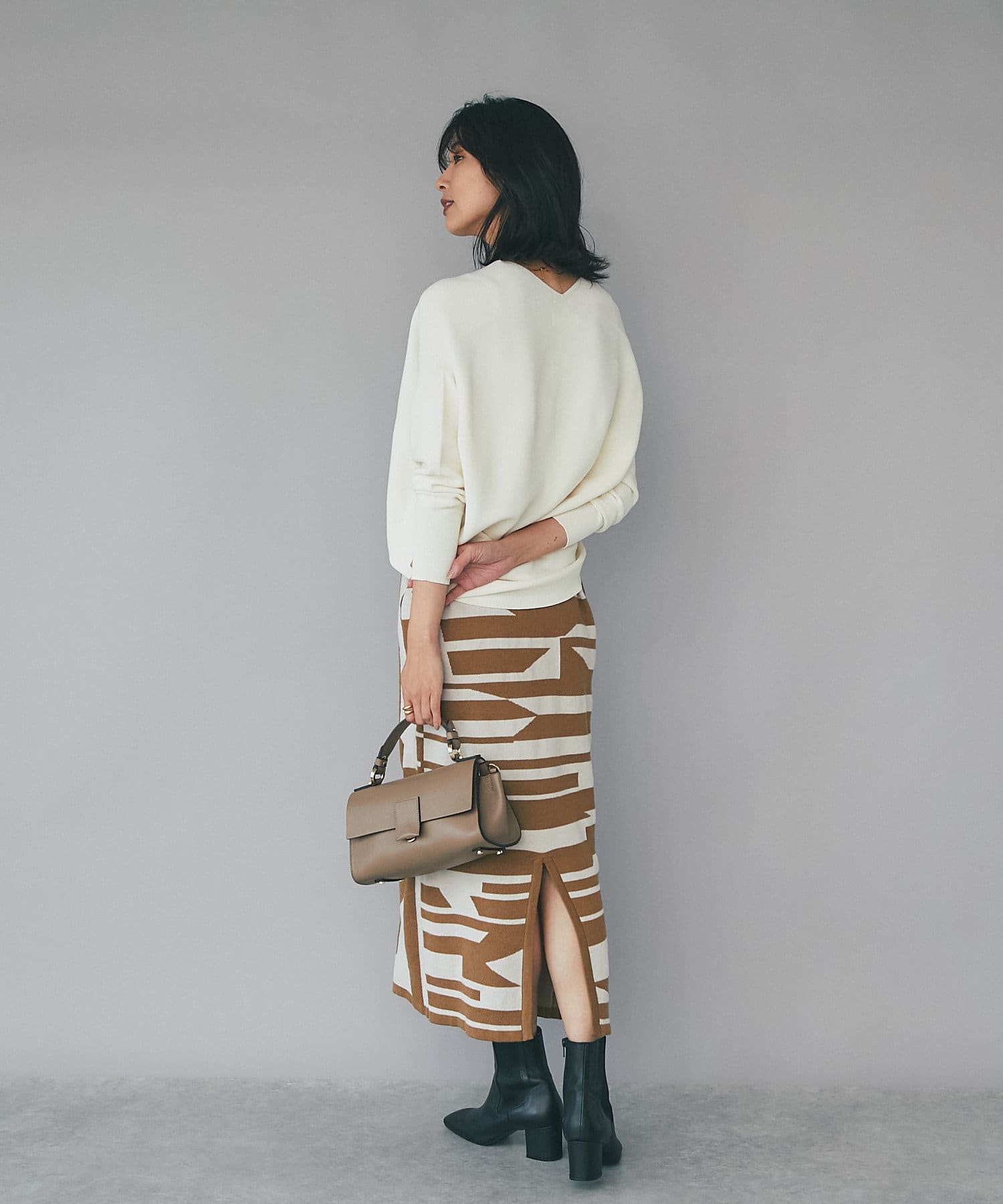 オンオフ兼用でボトムを選ばずに使えるシンプルさが引き立つニットは、今季一枚は持っておきたいアイテム。