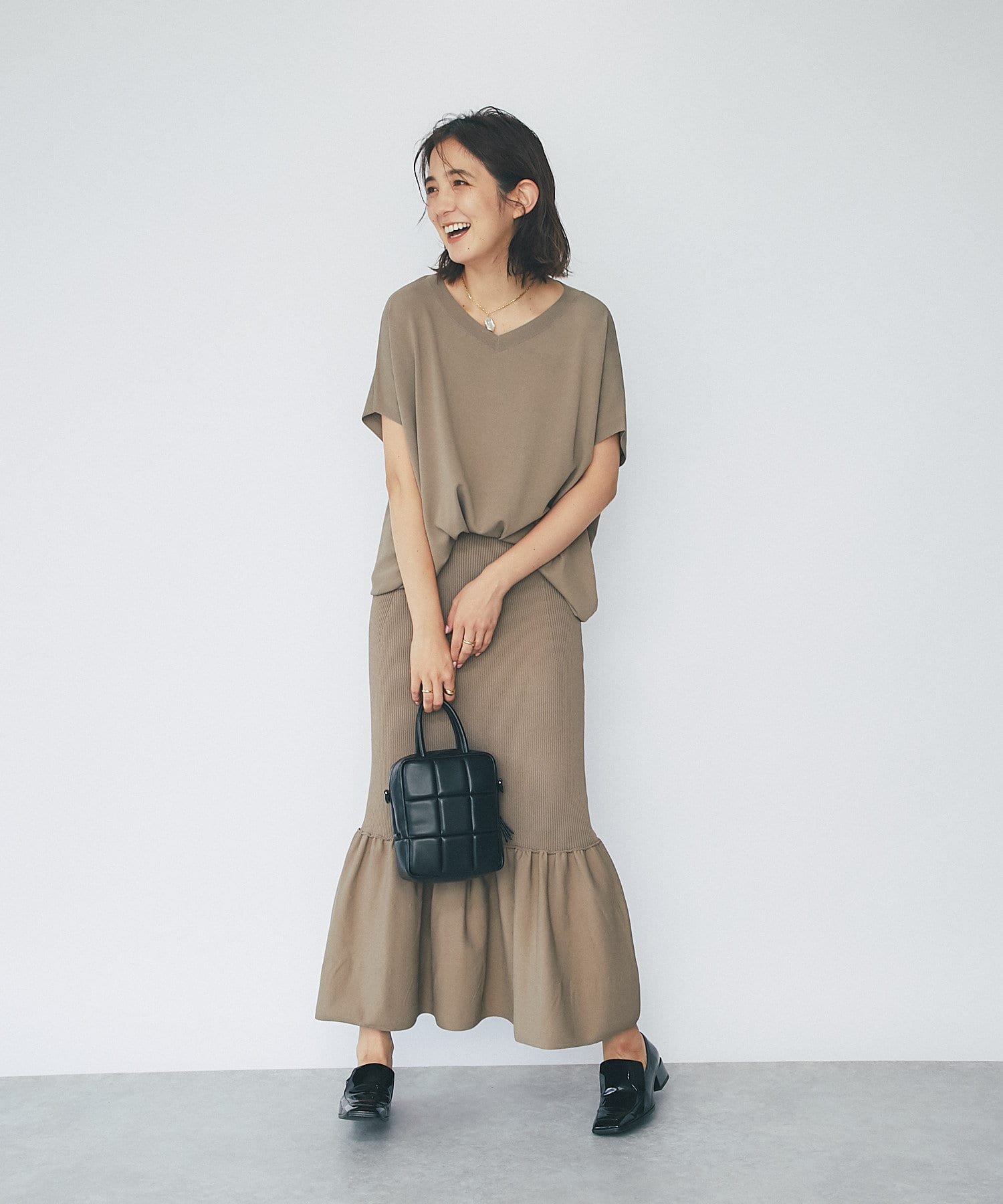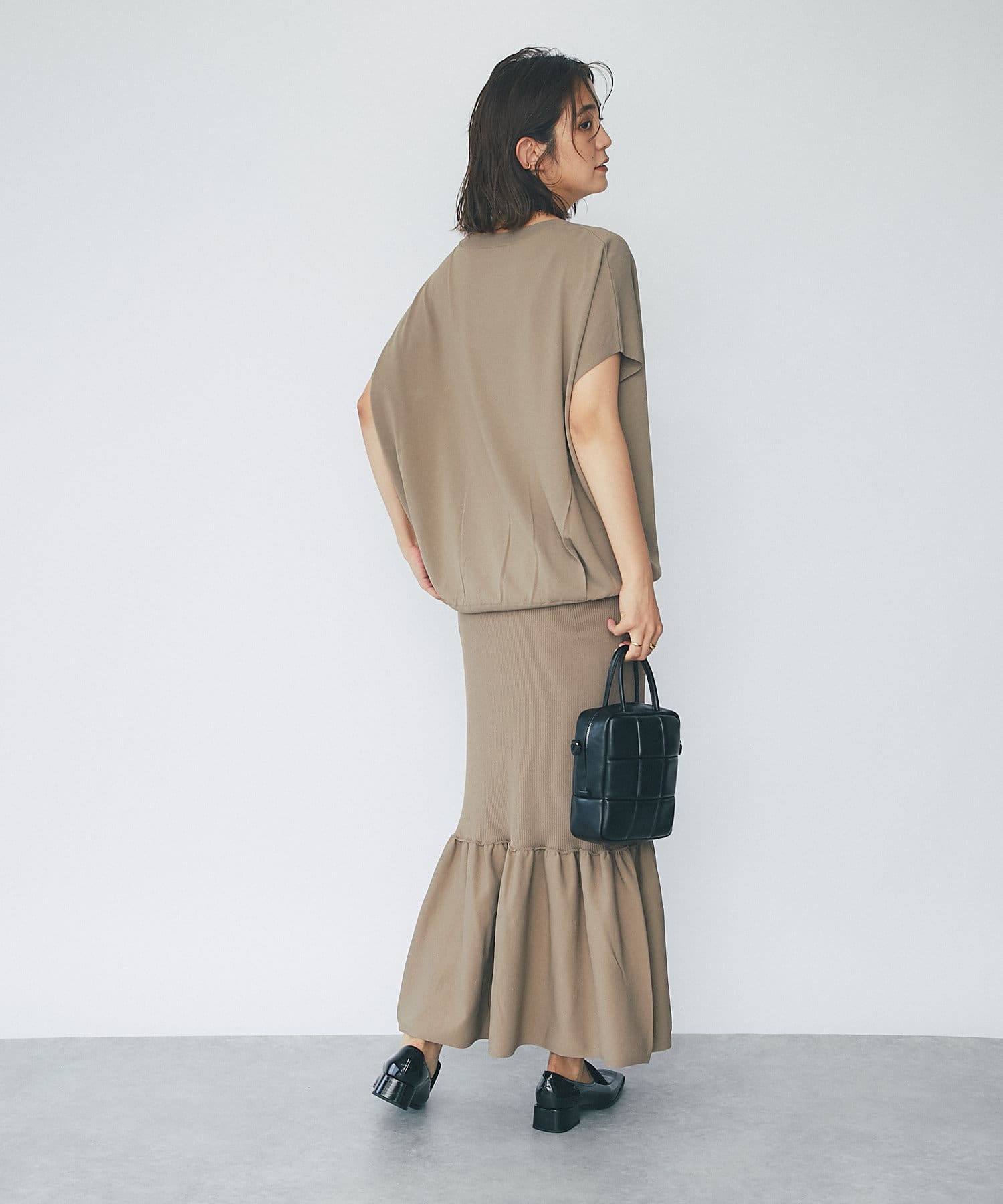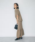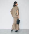 同素材のリブマーメイドスカートとのセットアップコーデも可能。