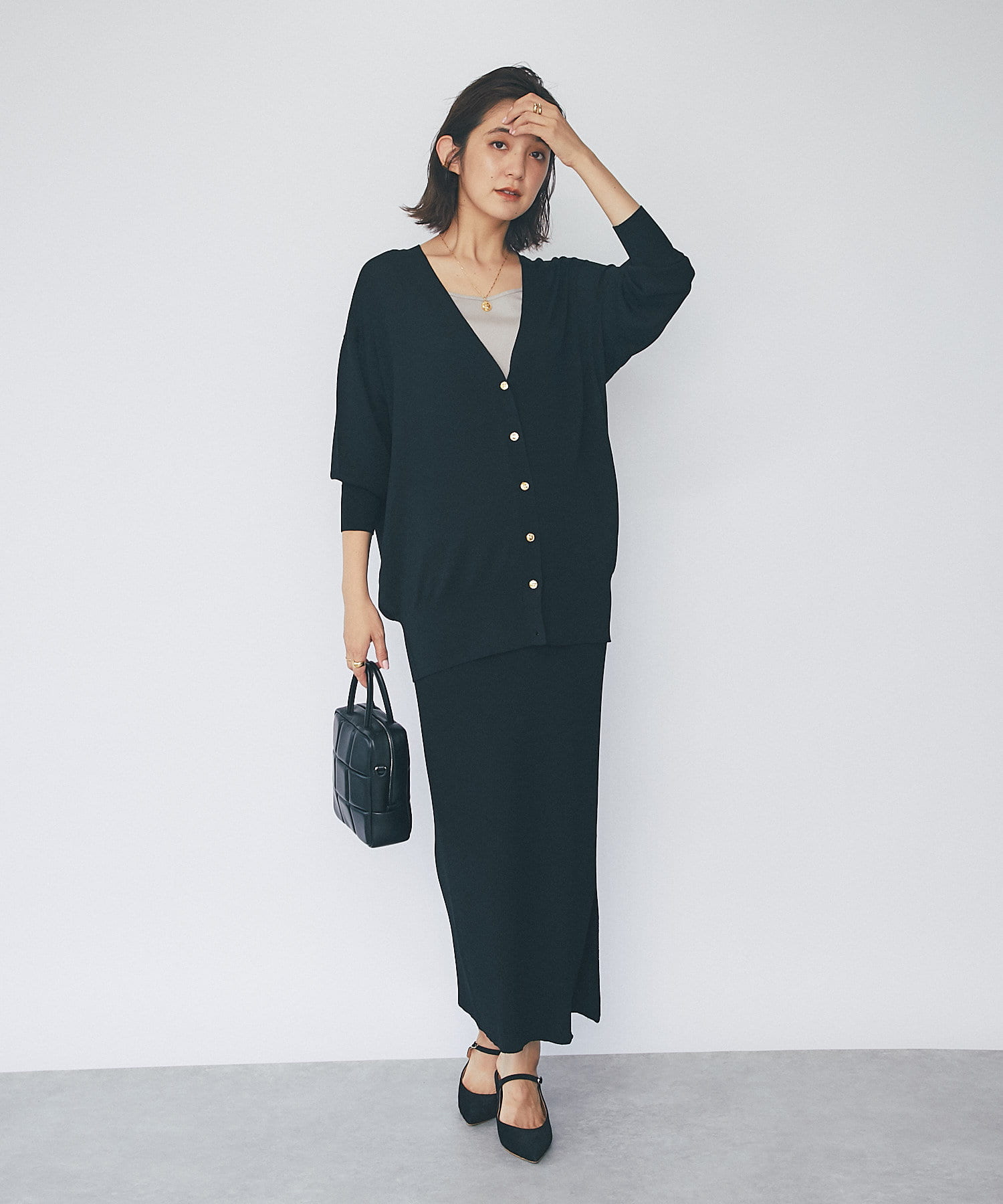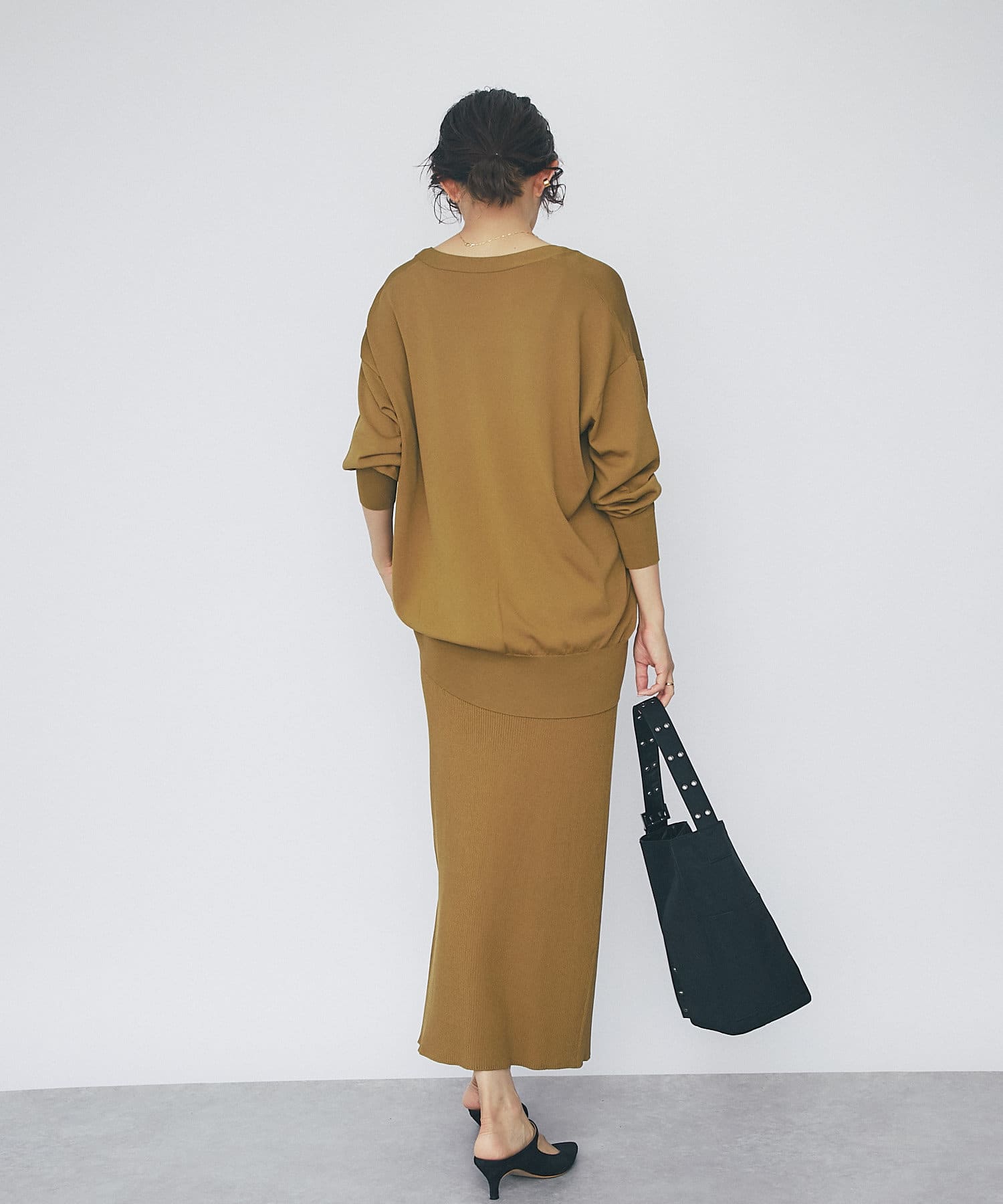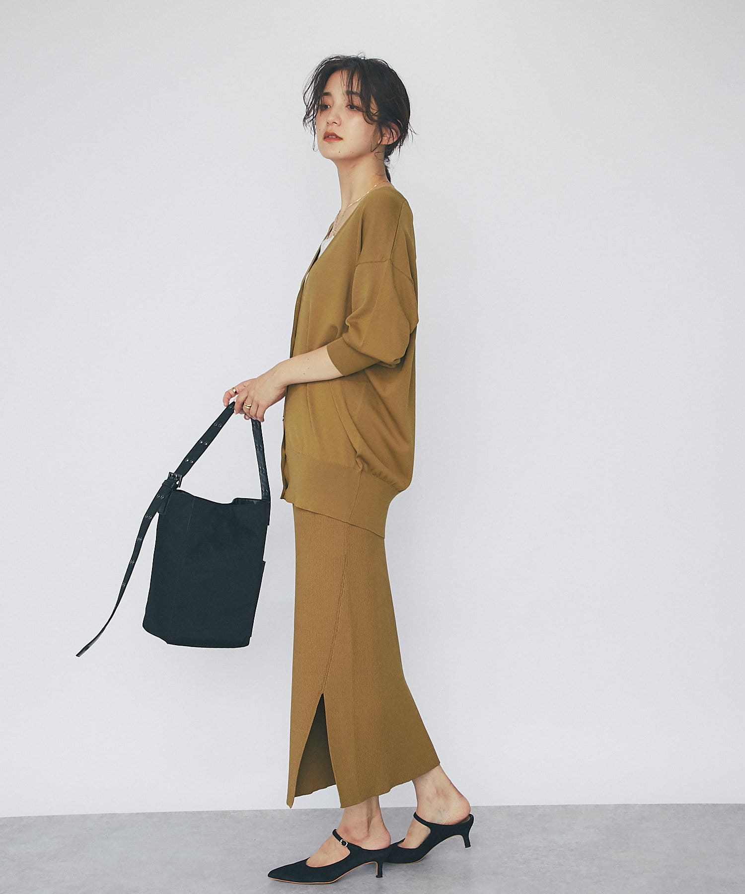 同素材のVIS/NYサイドスリットスカートとのレディライクなセットアップのコーディネートも素敵に着用して頂けます。